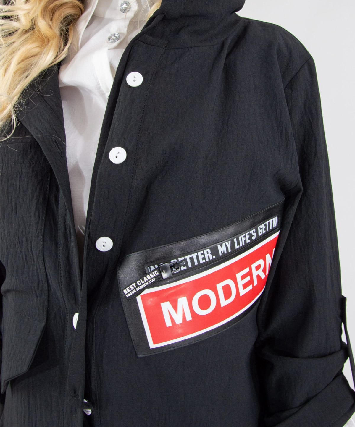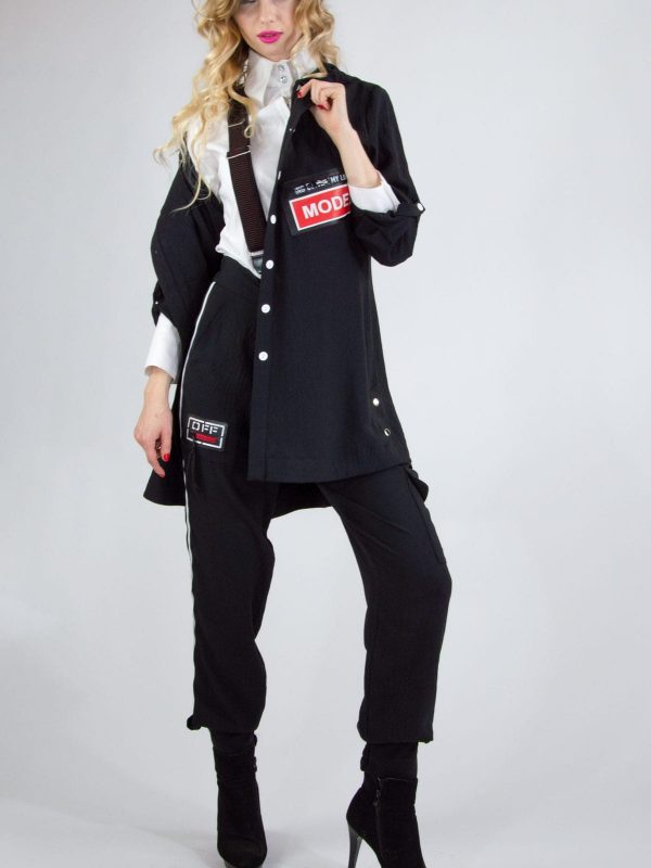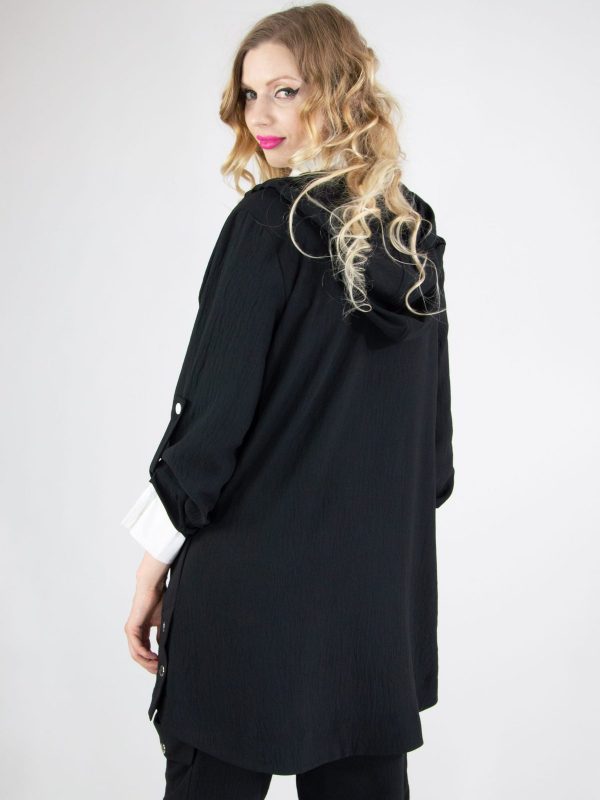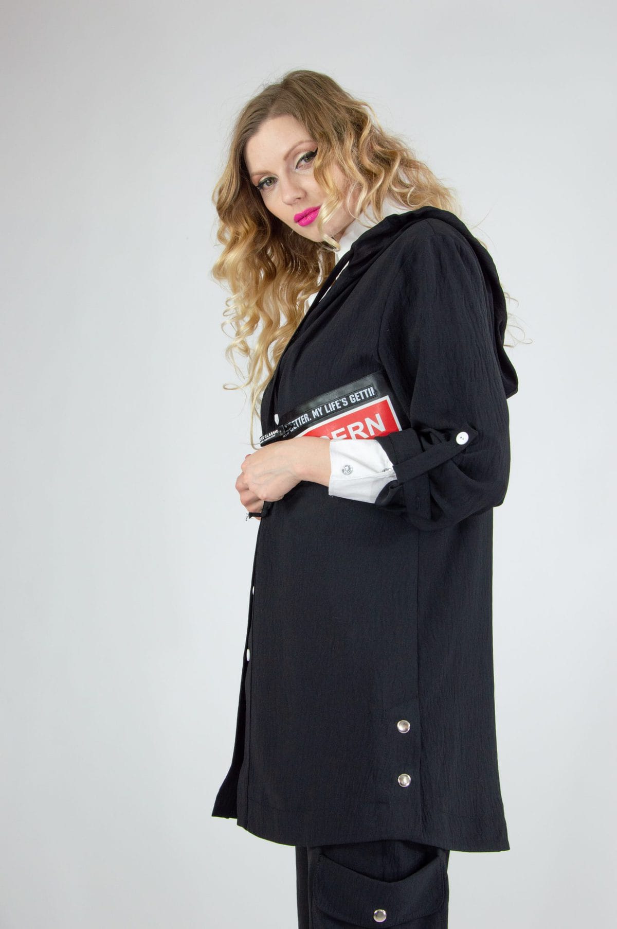 Plášť navrhnutý v pohodlnom oversize strihu. Vďaka áčkovej siluete skvele sedí na každú postavu. Plášť ma funkčnú kapucňu. Navrhnutý v nadčasovej čiernej farbe s výraznou nášivkou oživí každý jarný šatník.