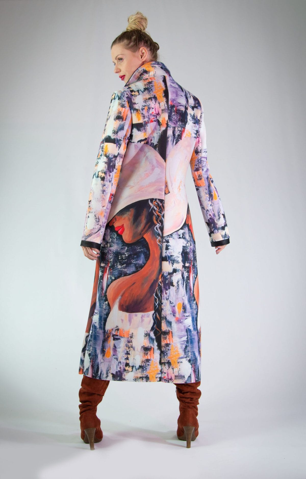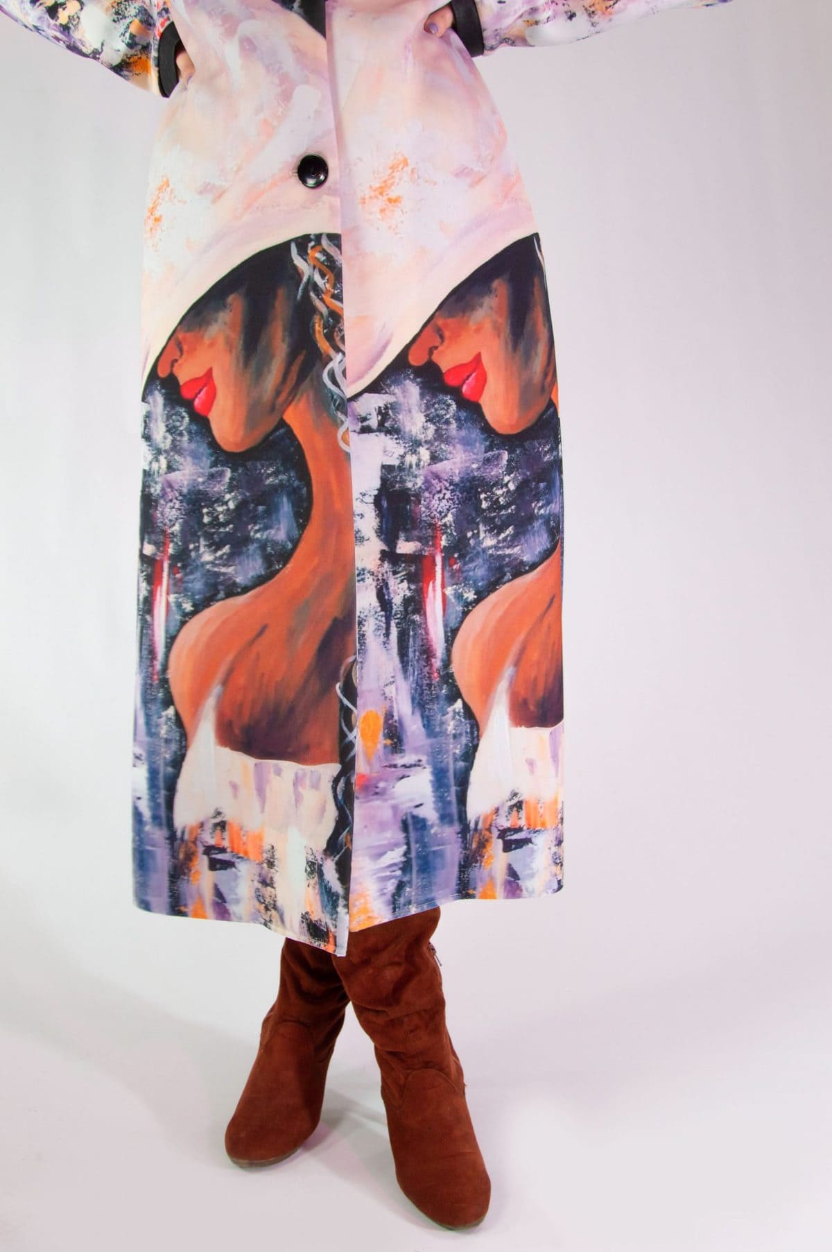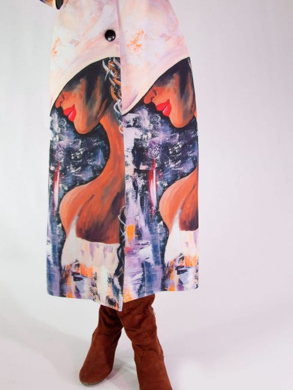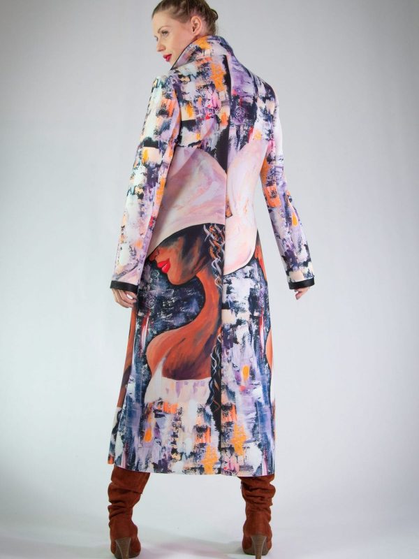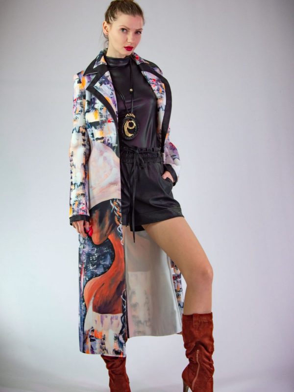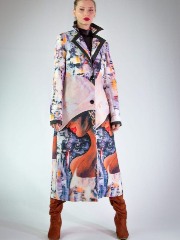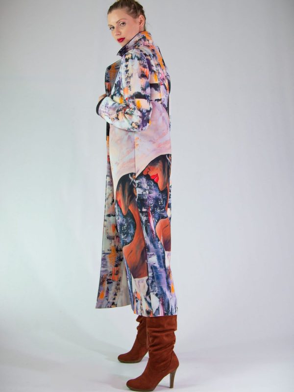 Plášť vytvorený z originálnej potlače pre našu značku. Plášť je ušitý v klasickej fazóne, aby nechal vyniknúť potlači. Plášť svojím spracovaním pripomína obraz namaľovaný olejovými farbami, dominujú jemné pastelové farby. Plášť sa minimalisticky zapína na jeden gombík. Zaujímavým detailom je spracovanie fazóny, ktorá je lemovaná čiernym materiálom rovnakého zloženia. Výnimočný kúsok, ktorý rozžiari každý Váš outfit.