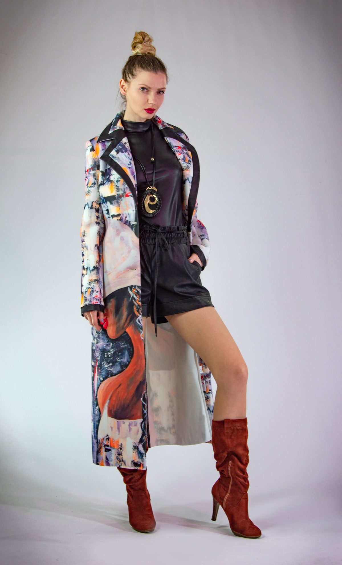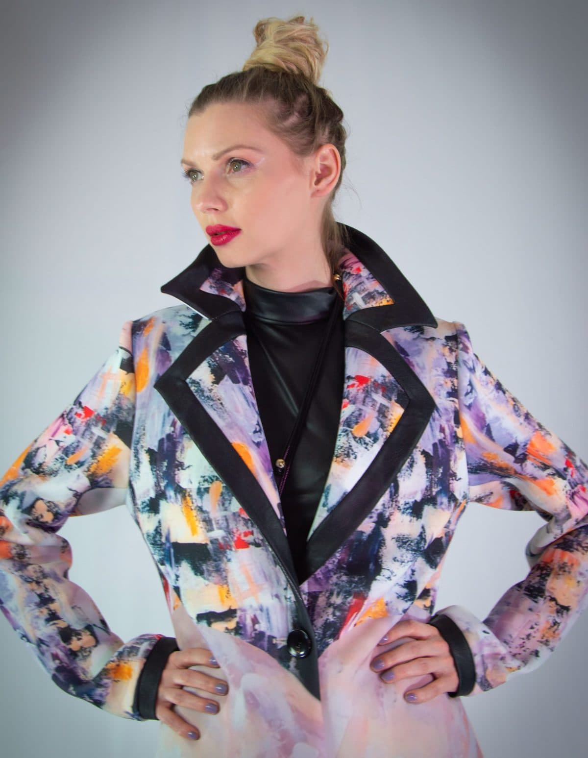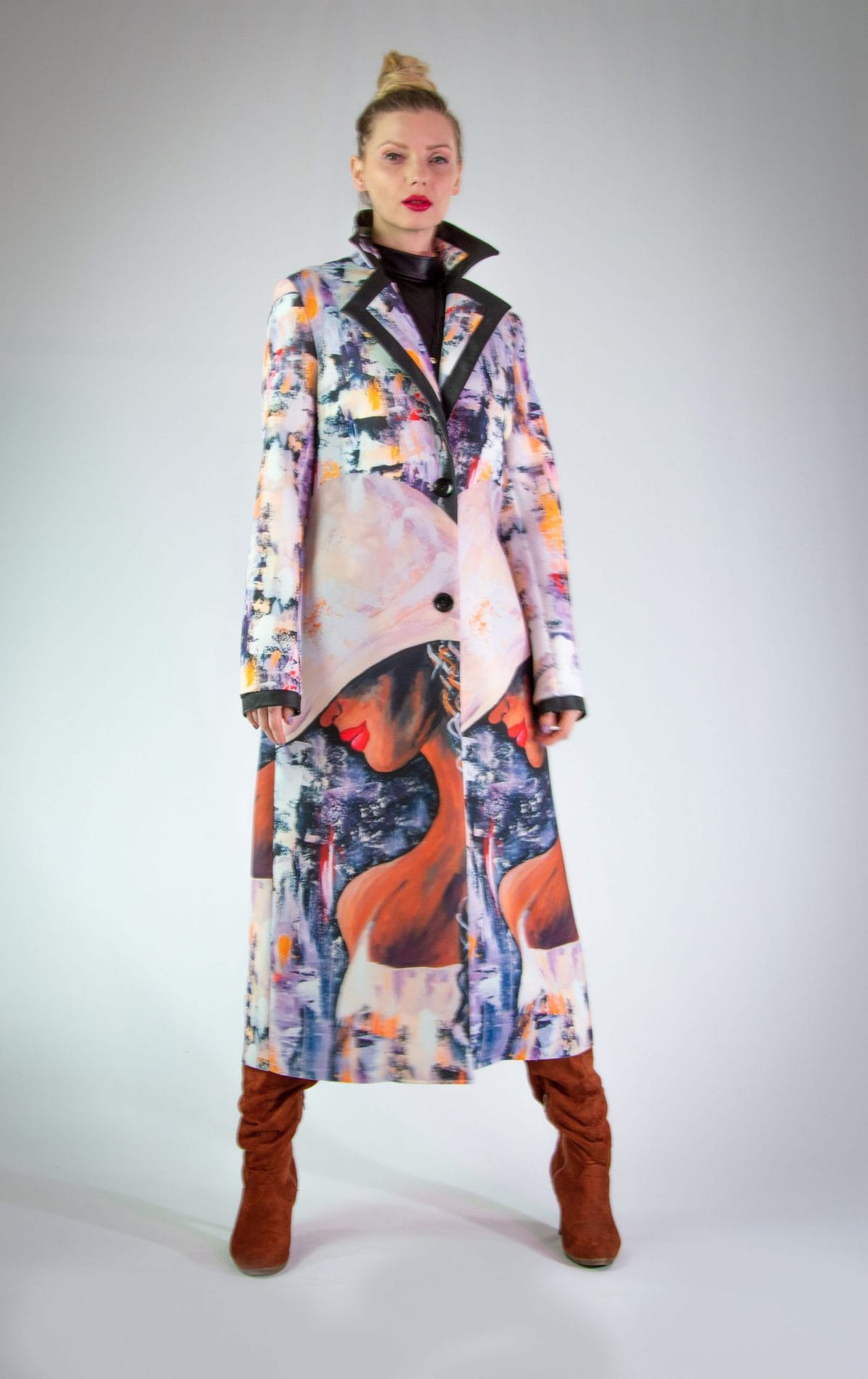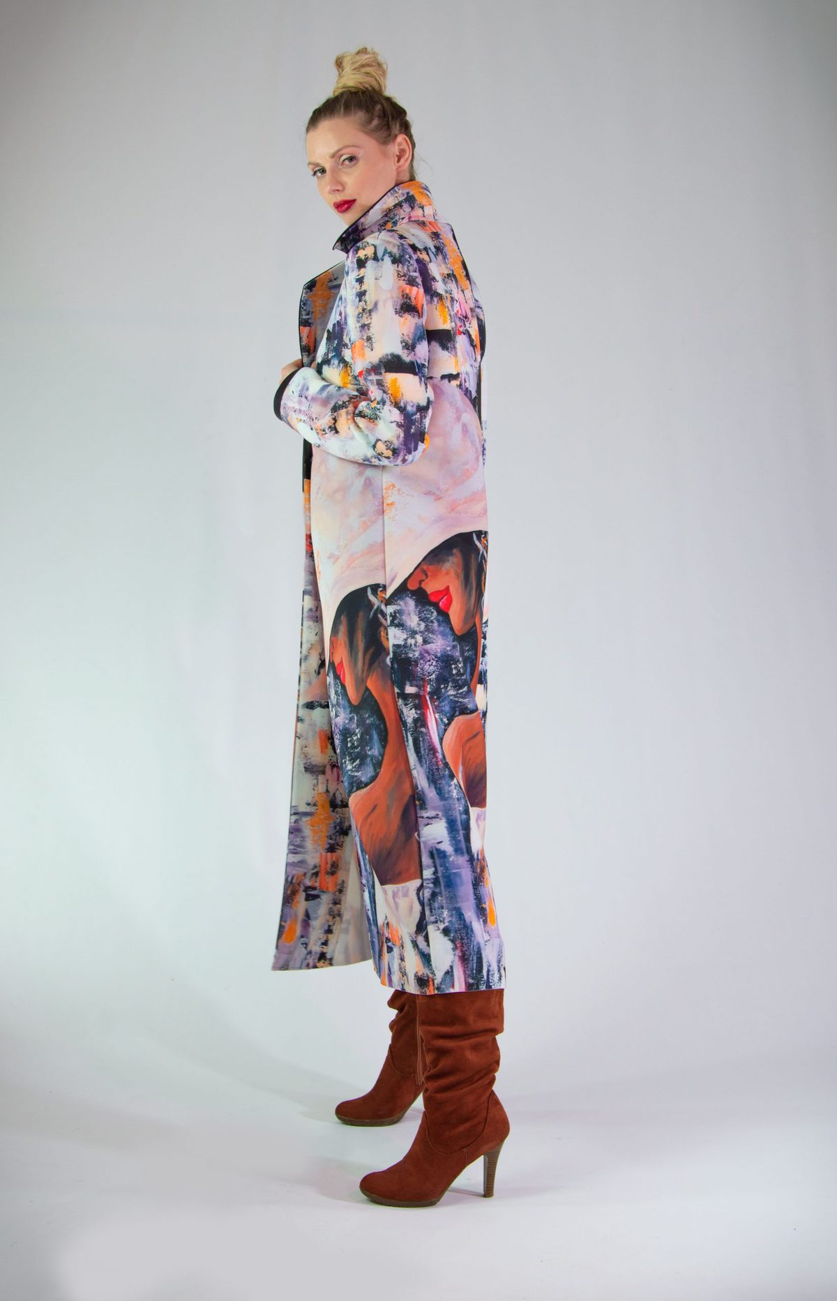Plášť vytvorený z originálnej potlače pre našu značku. Plášť je ušitý v klasickej fazóne, aby nechal vyniknúť potlači. Plášť svojím spracovaním pripomína obraz namaľovaný olejovými farbami, dominujú jemné pastelové farby. Plášť sa minimalisticky zapína na jeden gombík. Zaujímavým detailom je spracovanie fazóny, ktorá je lemovaná čiernym materiálom rovnakého zloženia. Výnimočný kúsok, ktorý rozžiari každý Váš outfit.