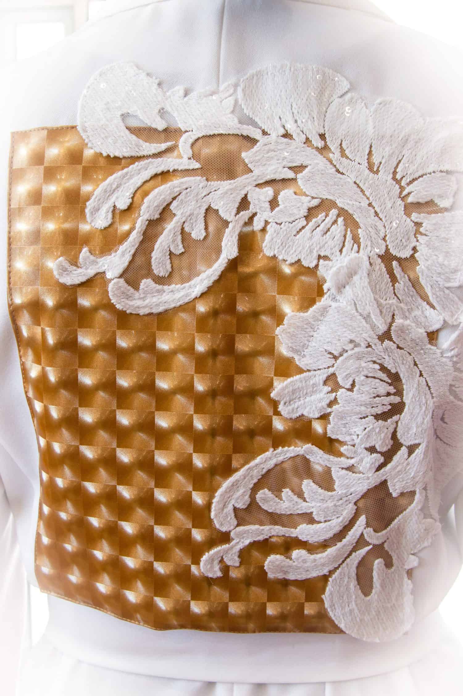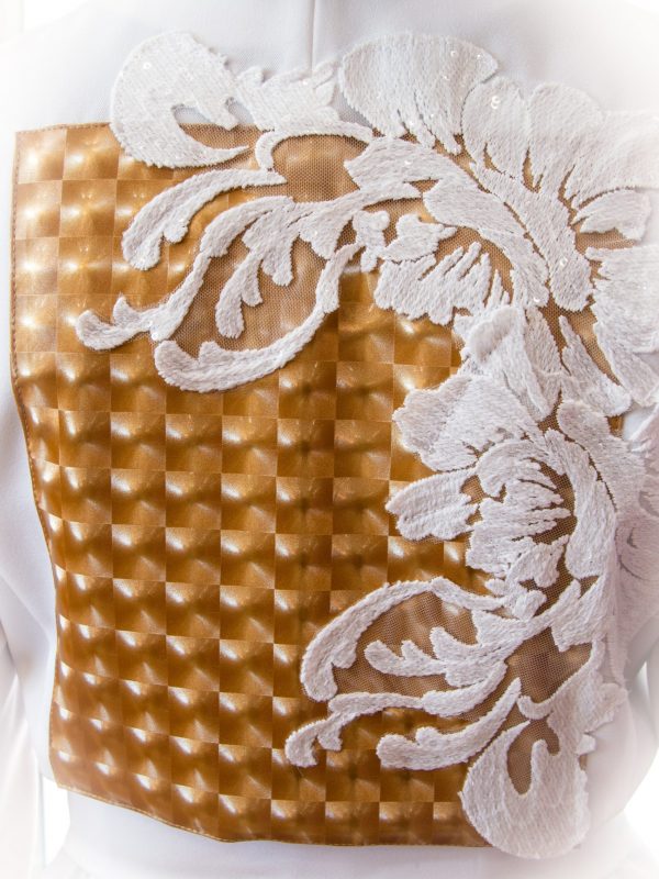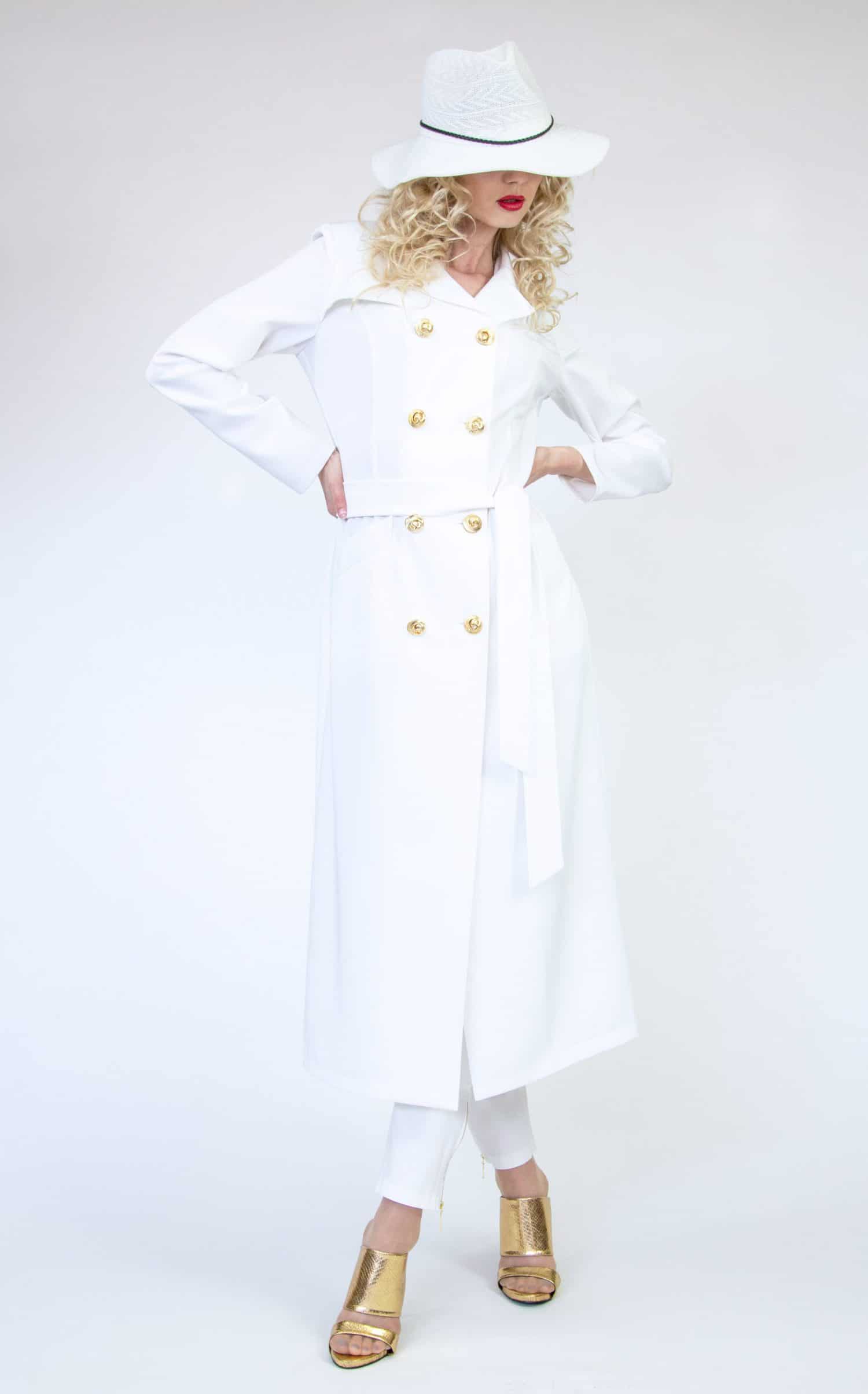 Nič tak nevynikne v teplé jarné dni a cez horúce letné noci ako biela, hlavne na opálenej pokožke. Biela v kombinácii so zlatou je stelesneným luxusom. Plášť je rovného strihu a je nepodšitý, takže pre tie odvážne z Vás môže poslúžiť aj ako šaty. Vzadu je na plášť našitá zlatá 3d potlač a biela krajka. Ako vidíte naša stylistka sa vyhrala práve so zlatými doplnkami a odev vyletnila klobúkom. Dvojradové zapínanie zužuje strih a krásne vynikne ženská silueta