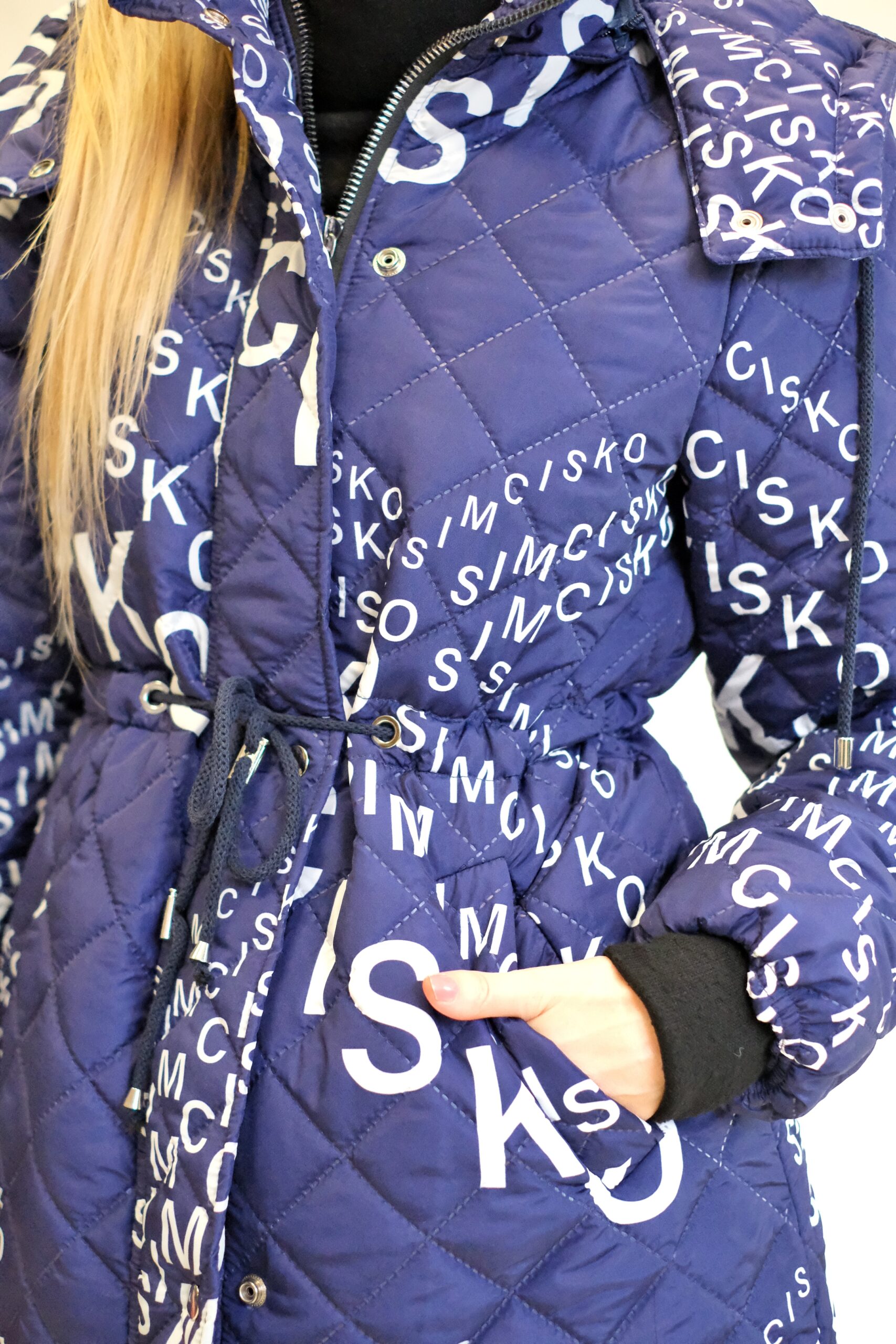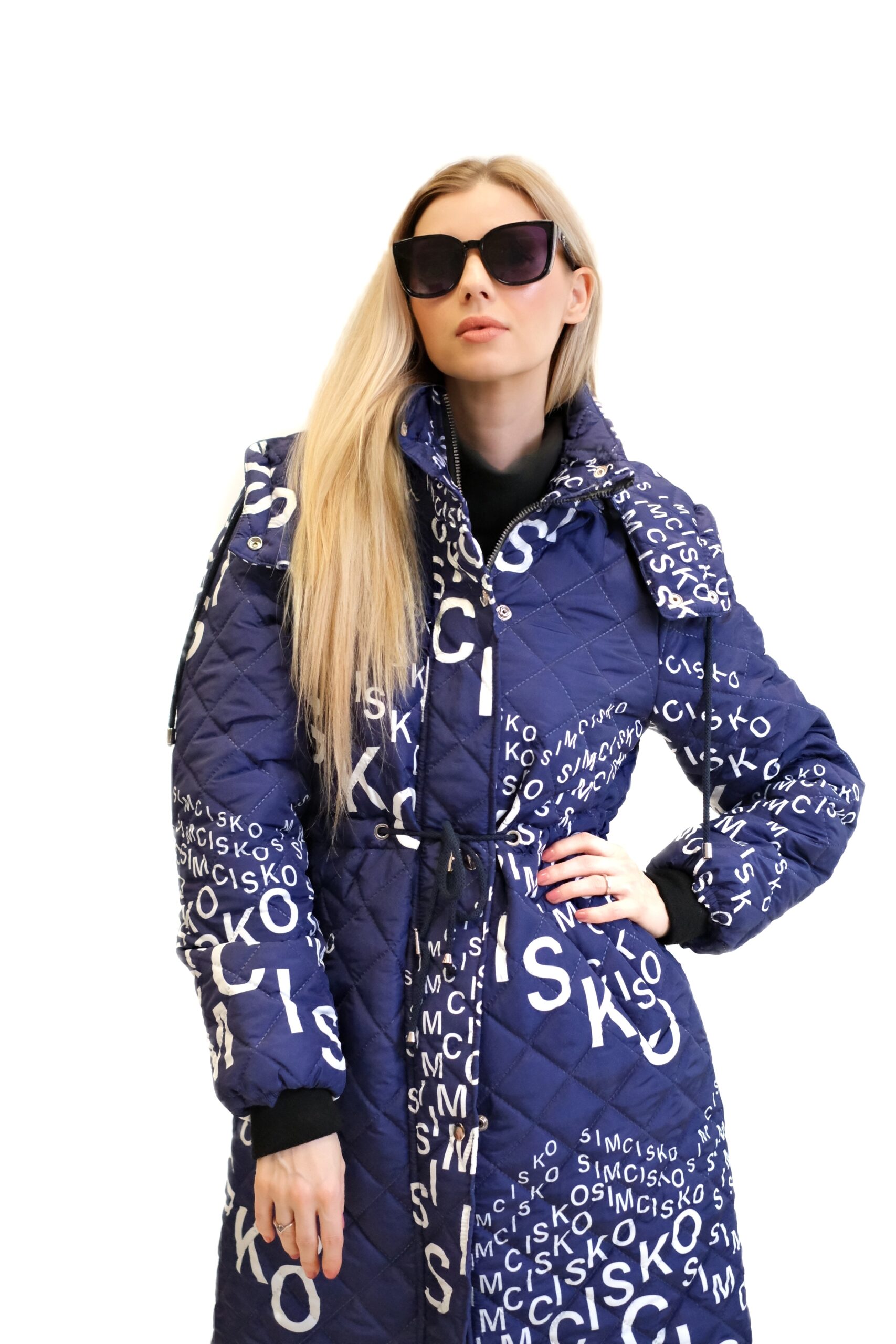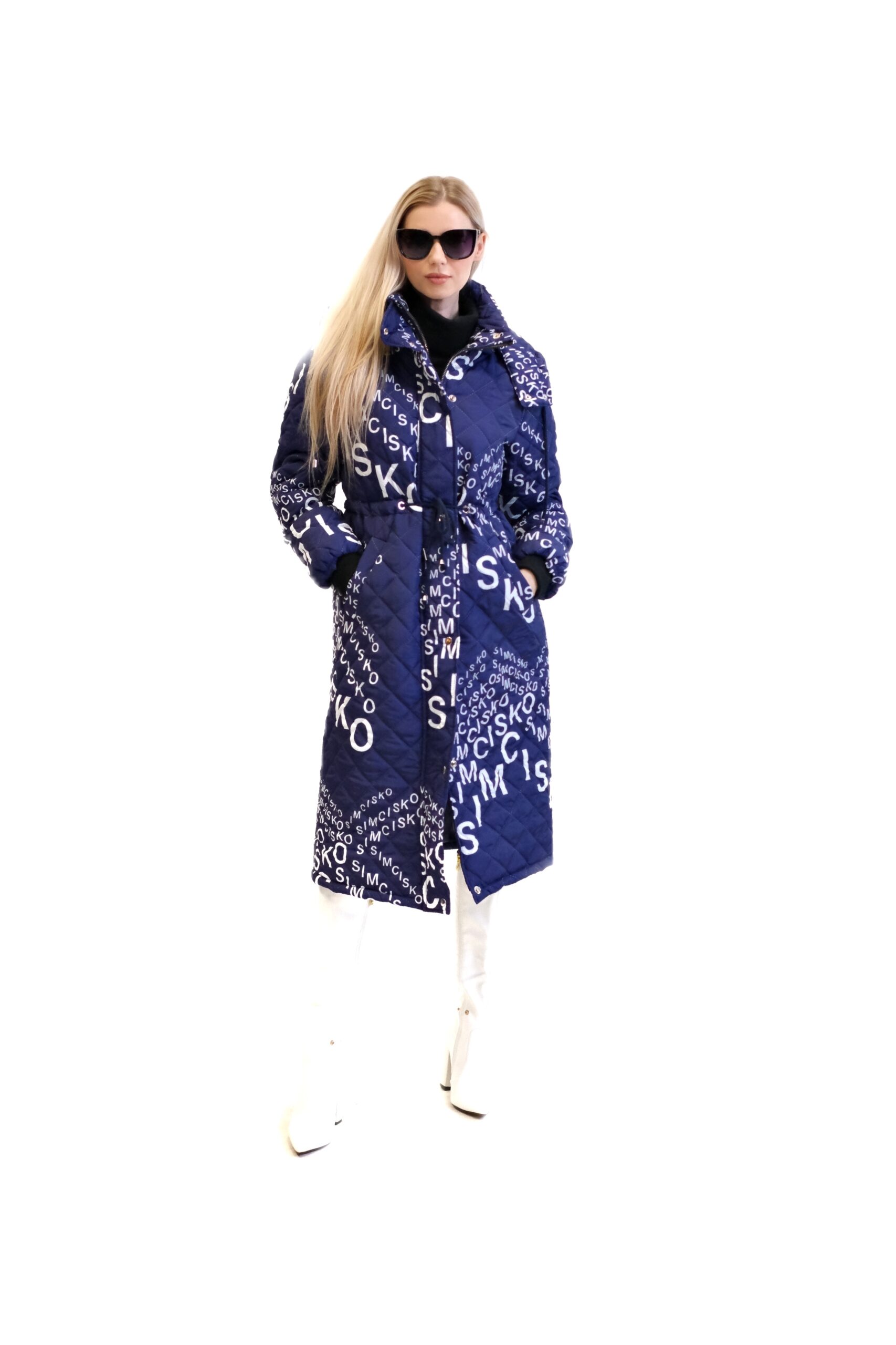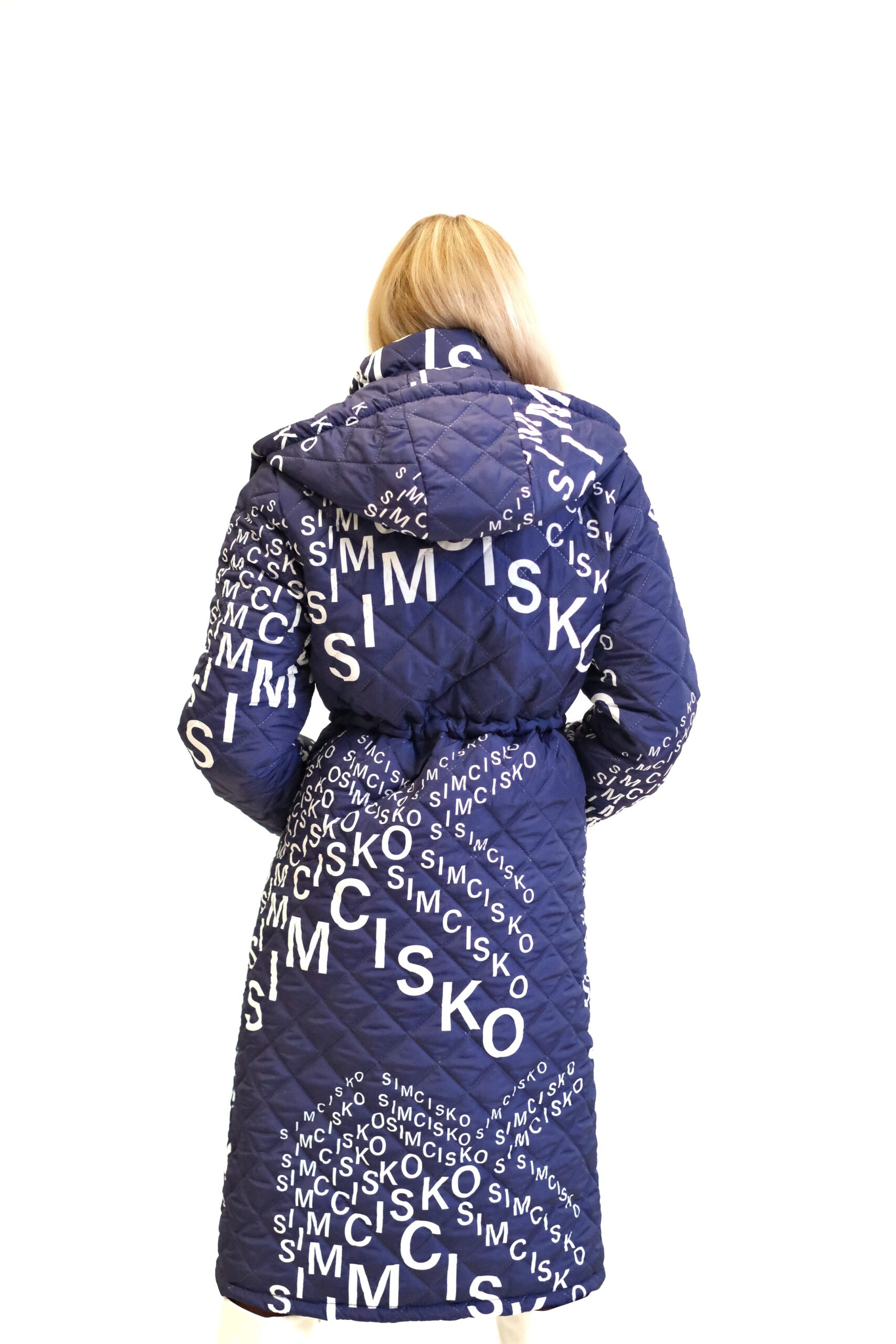 Modrá prešívaná bunda je dlhý, oversized dámsky strih s výrazným vzorom bielych nápisov a log, vrátane nápisu „SIMCISKO“. Je navrhnutá s kapucňou a zapína sa pomocou strieborných patentiek.