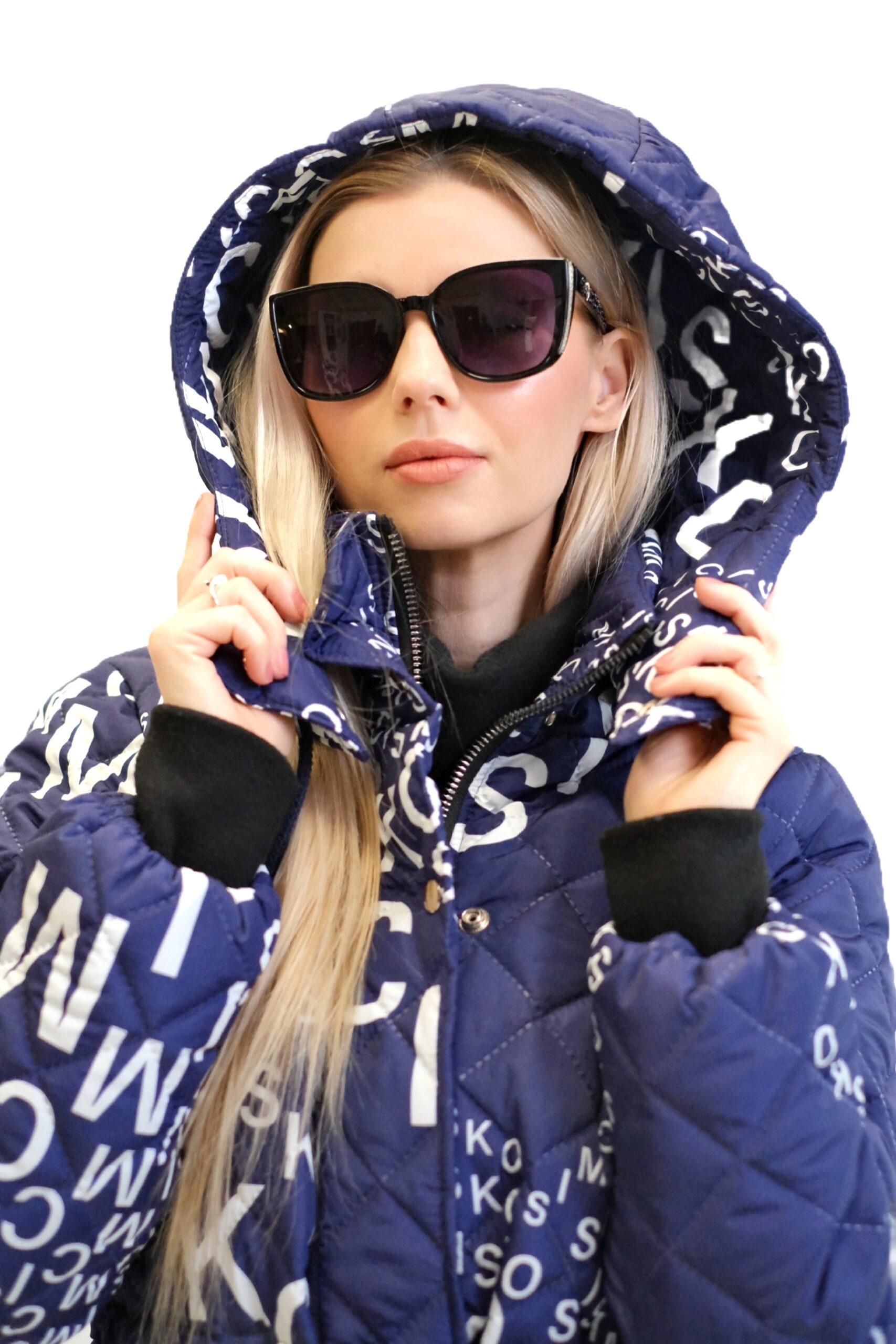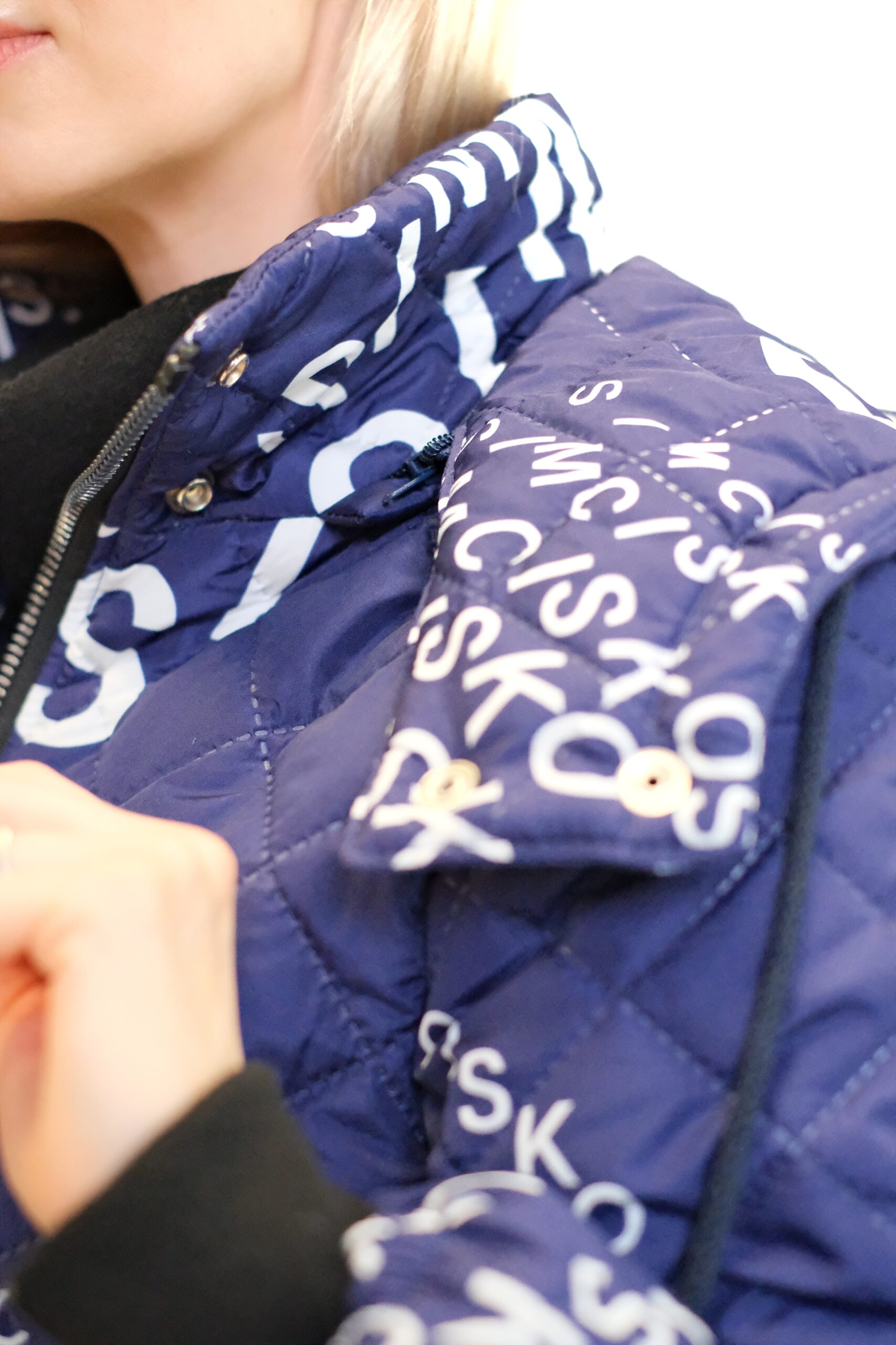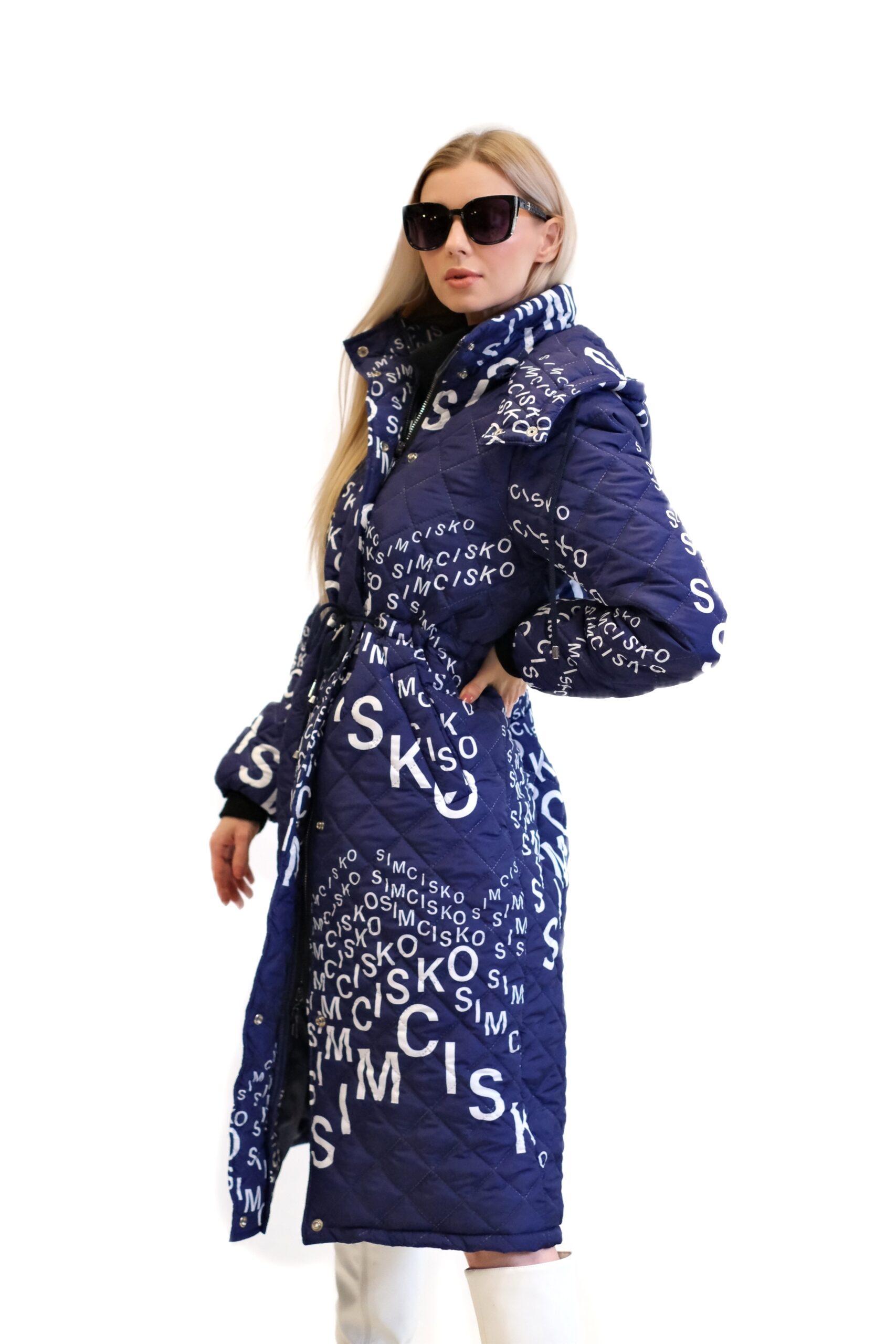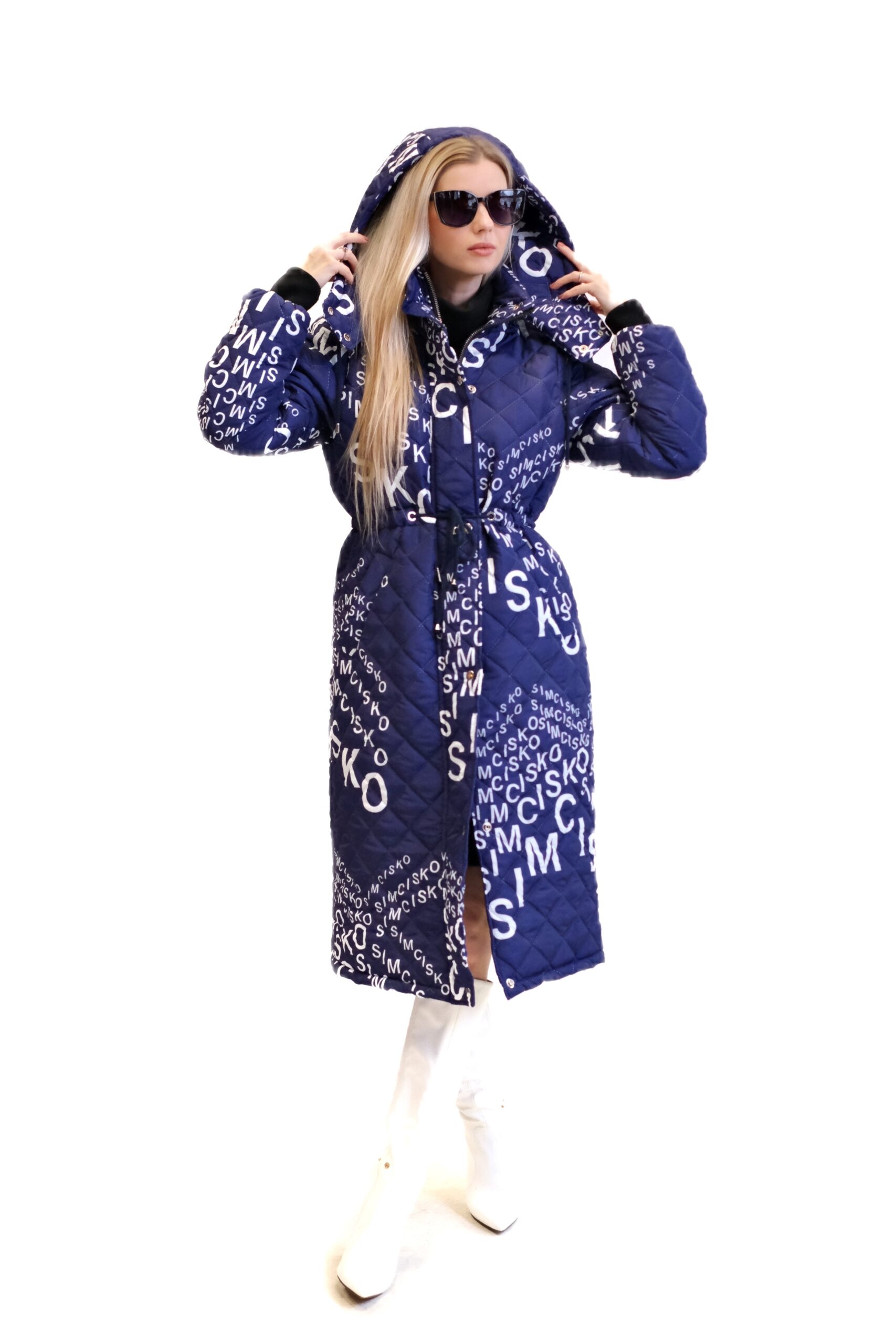 Modrá prešívaná bunda je dlhý, oversized dámsky strih s výrazným vzorom bielych nápisov a log, vrátane nápisu „SIMCISKO“. Je navrhnutá s kapucňou a zapína sa pomocou strieborných patentiek.
