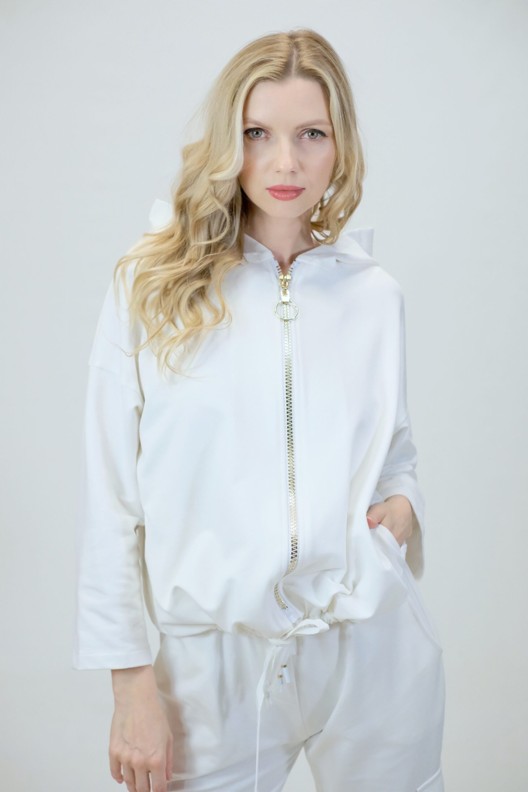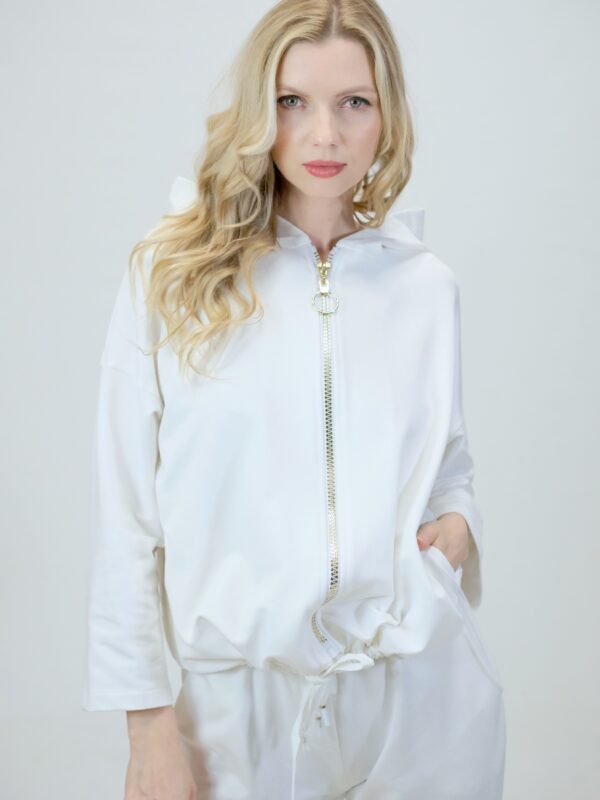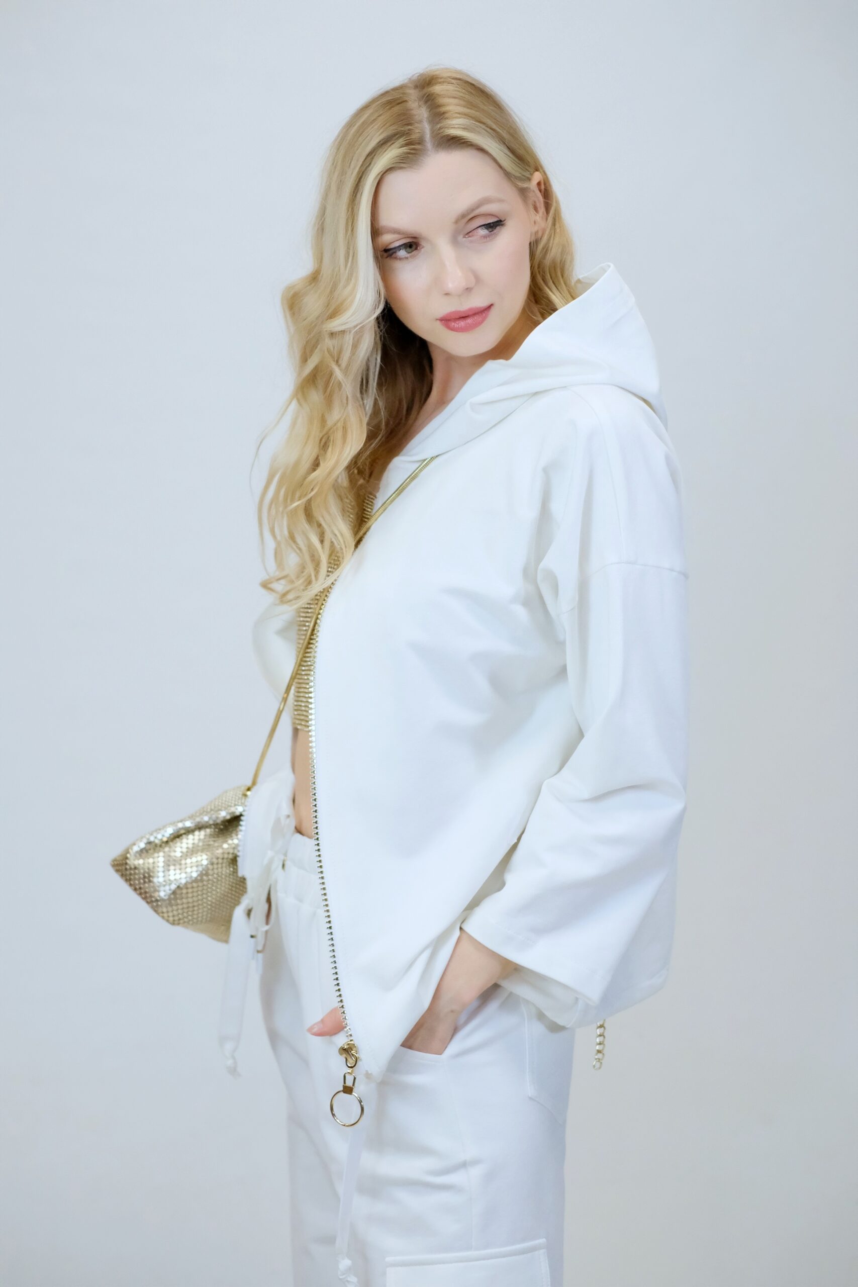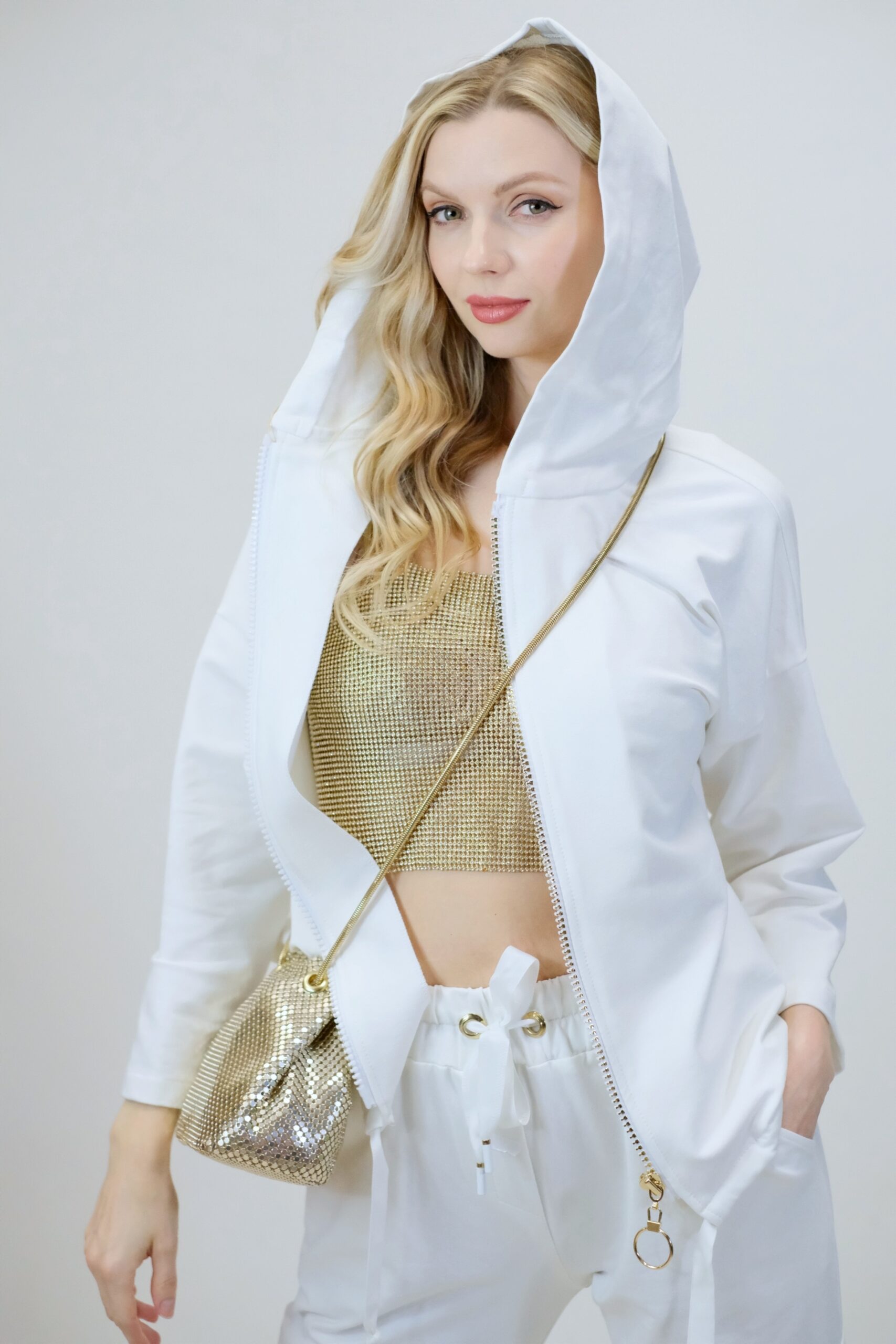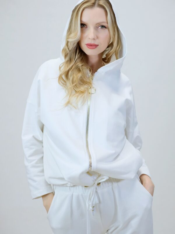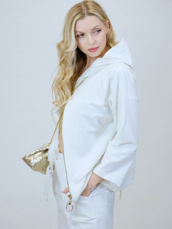Mikina je navrhnutá z pohodlnej bavlnenej látky, v ktorej sa budete cítiť výborne aj počas náročných dní. Mikina je navrhnutá vo voľnom strihu a výborne sadne na každý typ postavy. Mikina má funkčnú kapucne. Zaujímavým detailom je nášivka na zadnej časti, ktorá svojou zlatou farbou výborne mladý k ozdobnému zlatému zipsu. Pre ucelený look kombinujte s nohavicami Simplicity. Pre výnimočný efekt kombinujte so zlatými doplnkami ako naša aranžérka.