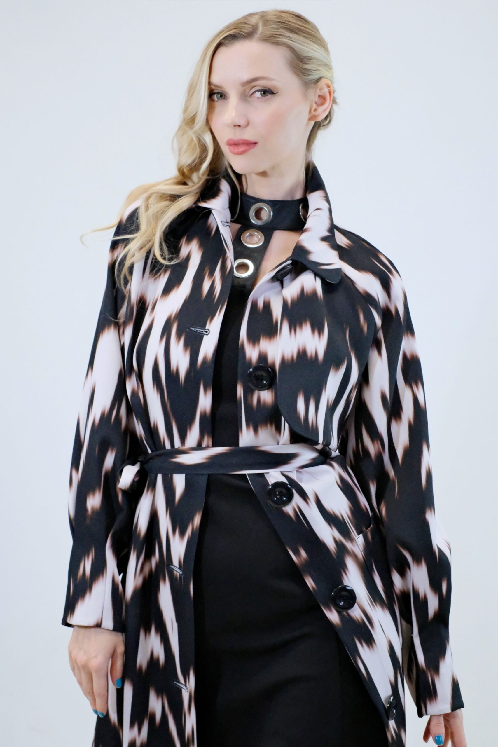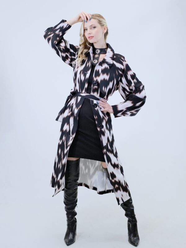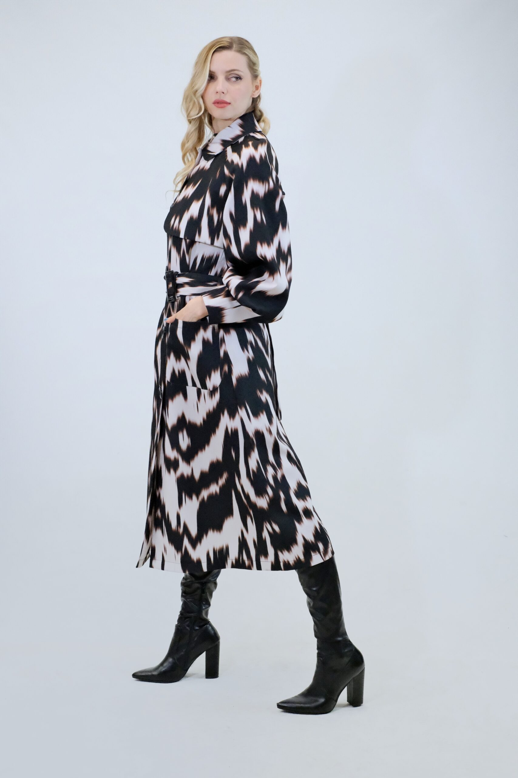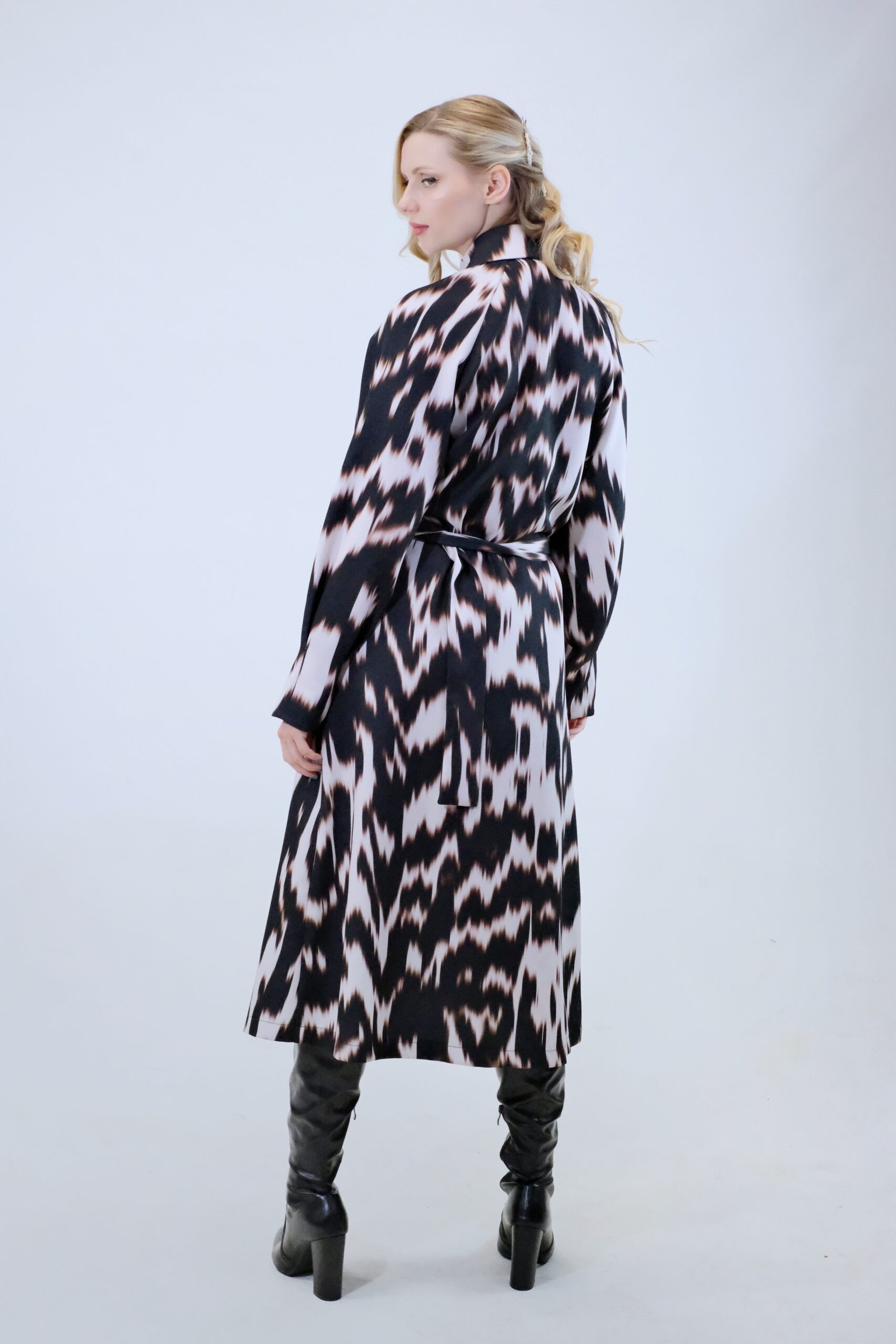 Plášť je navrhnutý v prepracovanom strihu, v ktorom vynikne každý detail. Plášť je nepodšitý a má funkčný opasok s putkami z rovnakého materiálu. Opasok sa sťahuje na ozdobnú čiernu sponu. Plášť je navrhnutý z minimalistického abstraktného vzoru, ktorý je ušitý v neutrálnych farbách béžovej a čiernej. Plášť ma funkčné vrecká a vďaka tomu, že nie je podšitý je ideálny spoločník aj na chladnejšie jarné alebo letné dni. Vďaka jeho neutrálnej farebnej škále ho ľahko skombinujete s čímkoľvek vo Vašom šatníku.