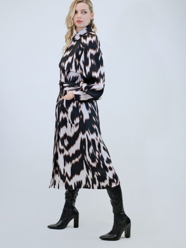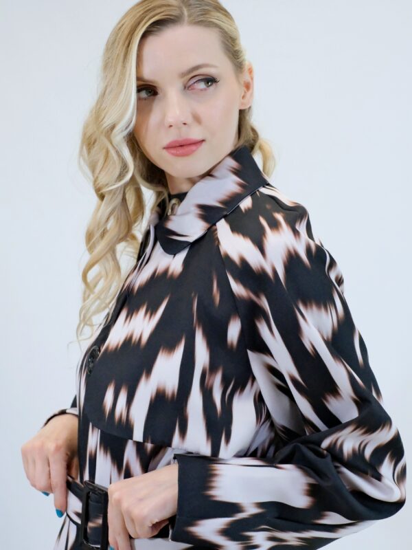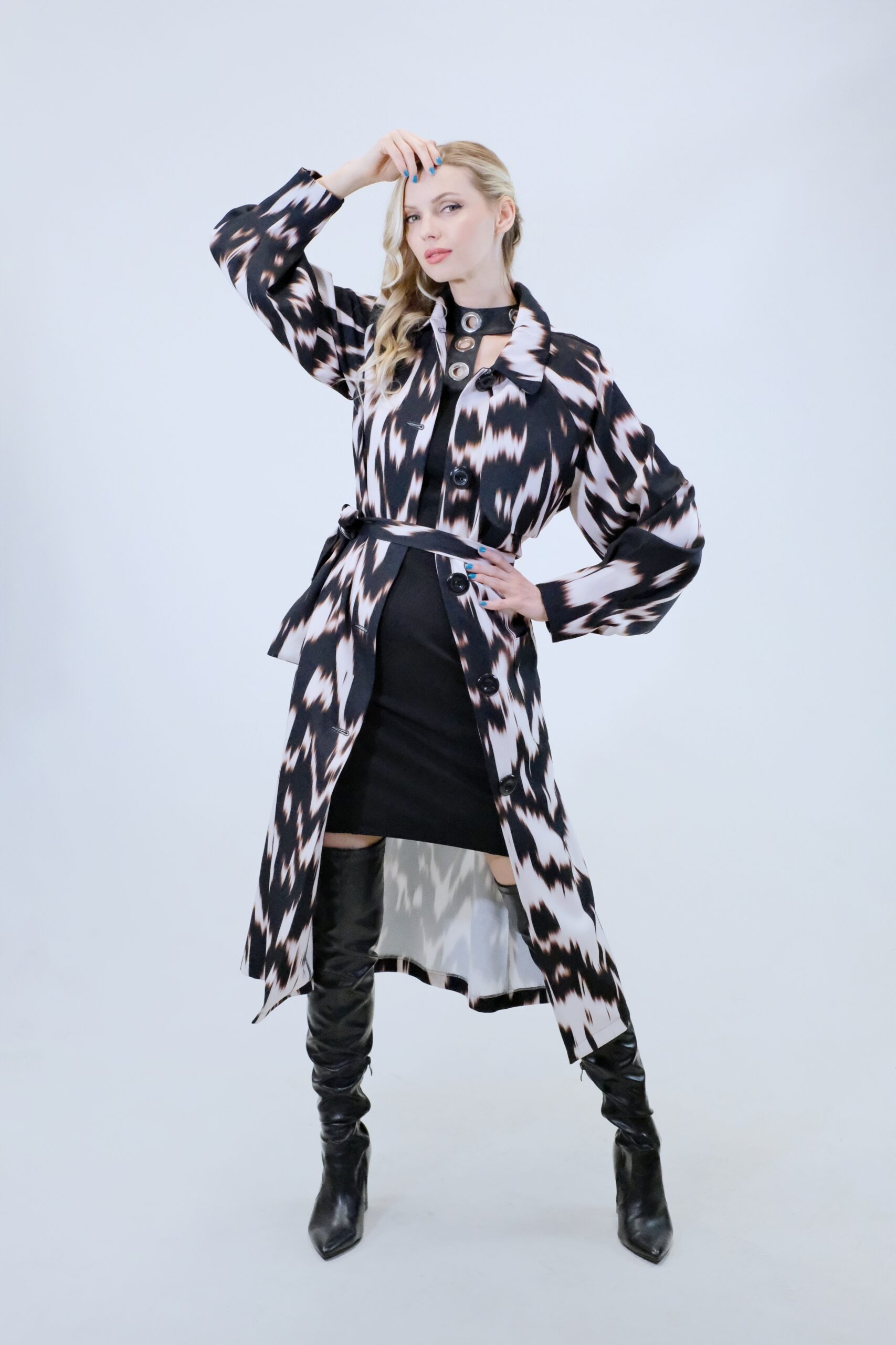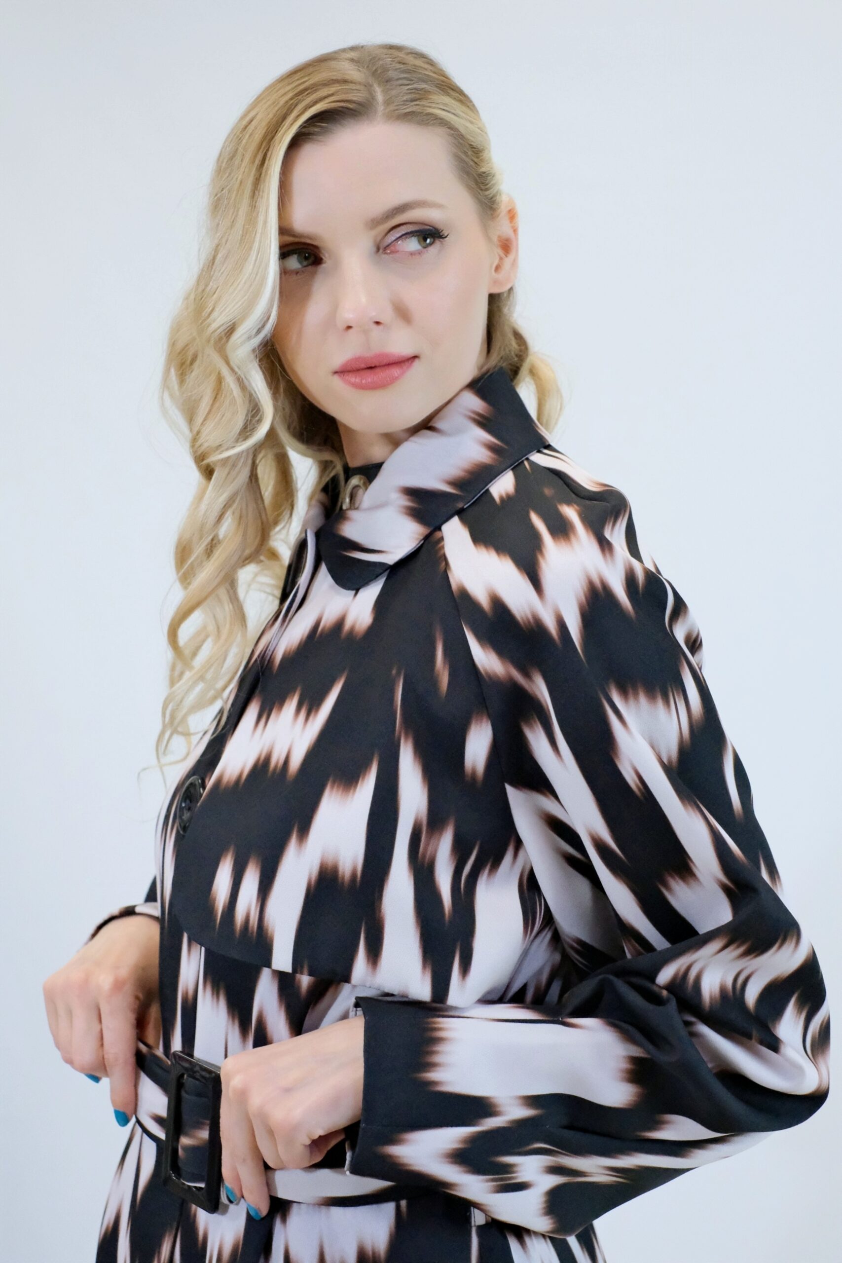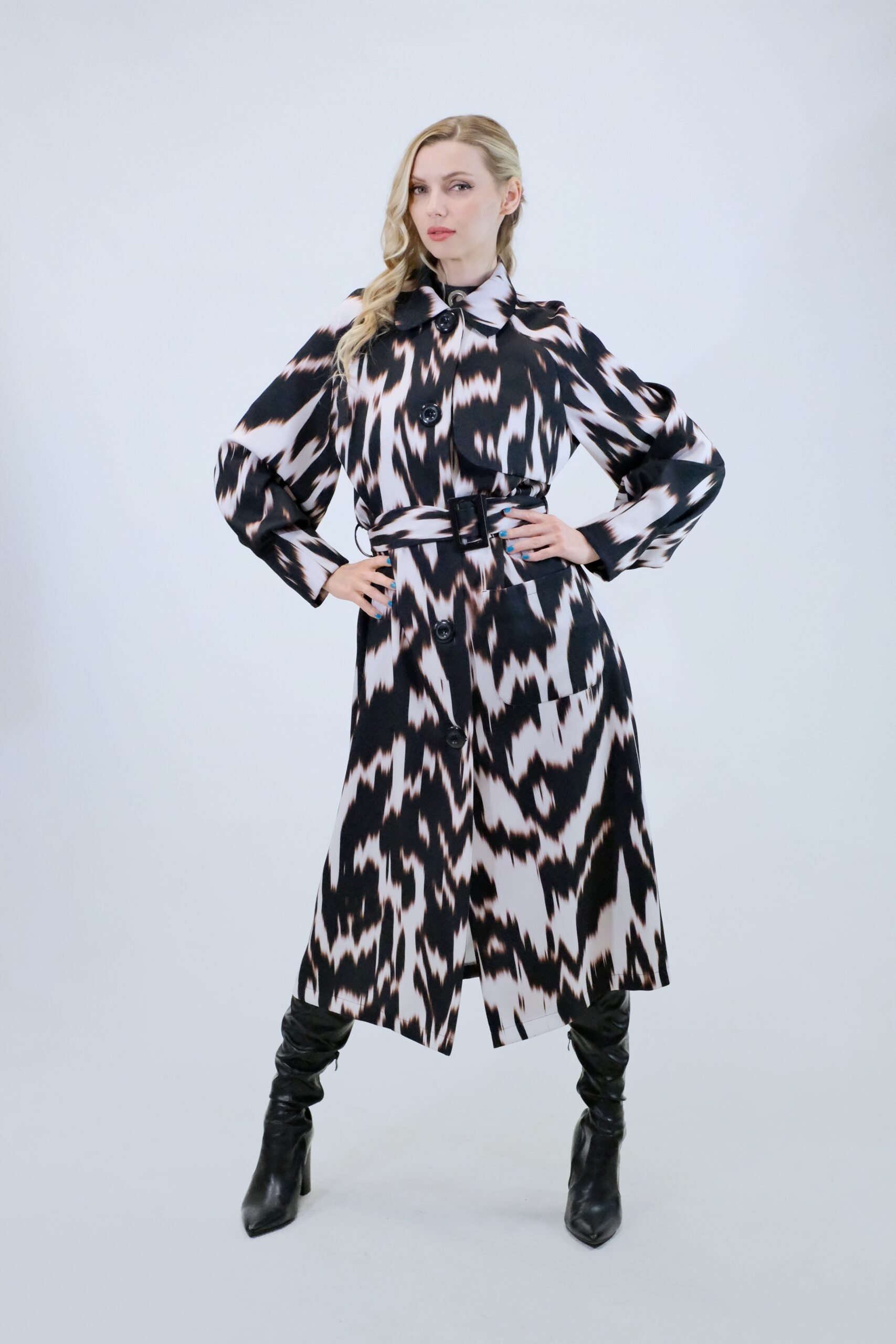 Plášť je navrhnutý v prepracovanom strihu, v ktorom vynikne každý detail. Plášť je nepodšitý a má funkčný opasok s putkami z rovnakého materiálu. Opasok sa sťahuje na ozdobnú čiernu sponu. Plášť je navrhnutý z minimalistického abstraktného vzoru, ktorý je ušitý v neutrálnych farbách béžovej a čiernej. Plášť ma funkčné vrecká a vďaka tomu, že nie je podšitý je ideálny spoločník aj na chladnejšie jarné alebo letné dni. Vďaka jeho neutrálnej farebnej škále ho ľahko skombinujete s čímkoľvek vo Vašom šatníku.