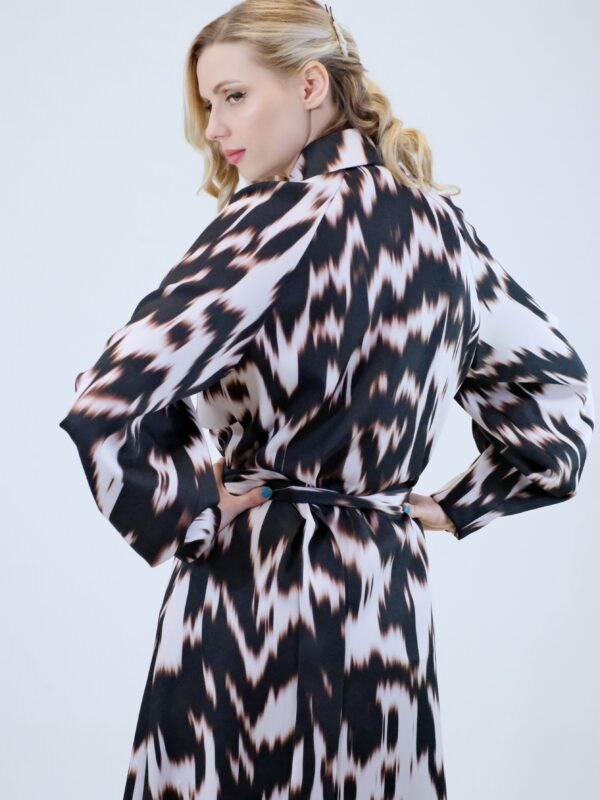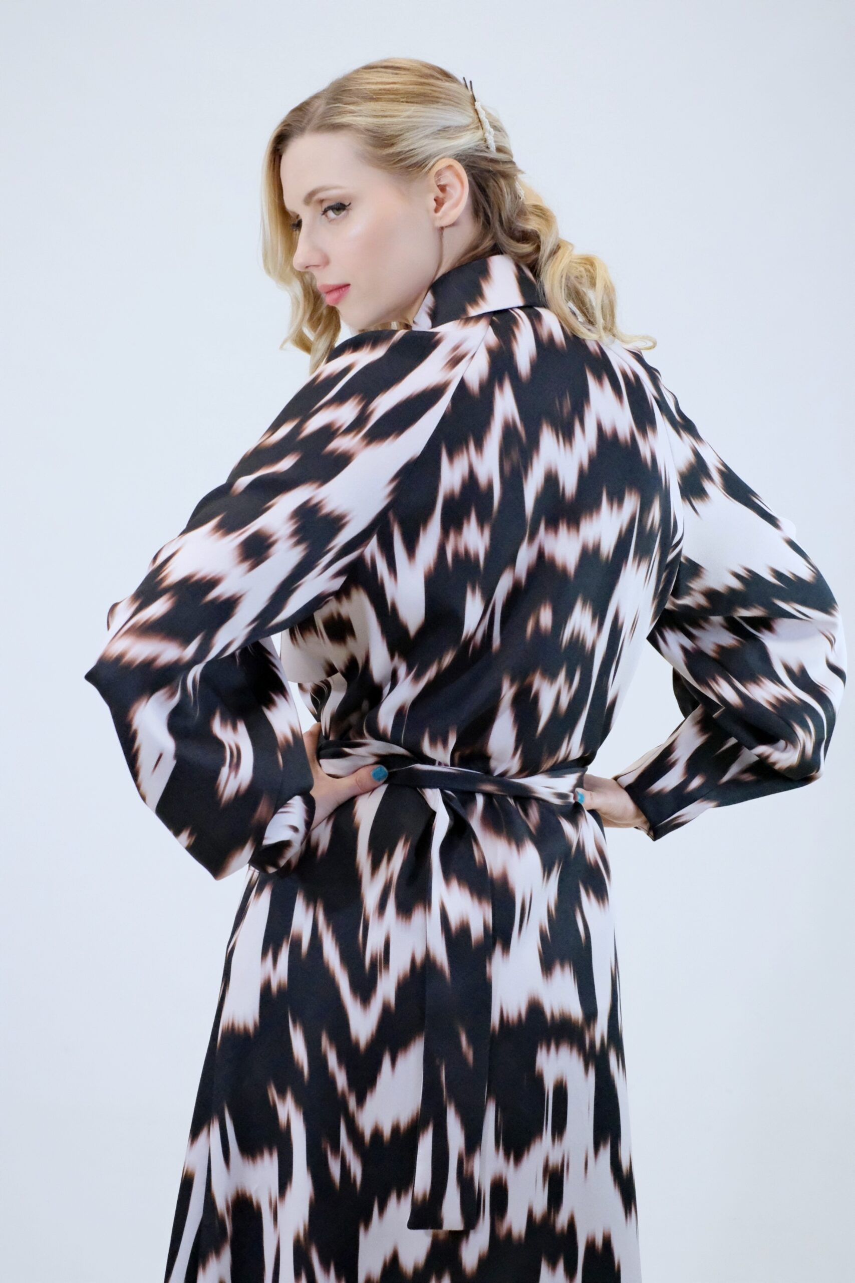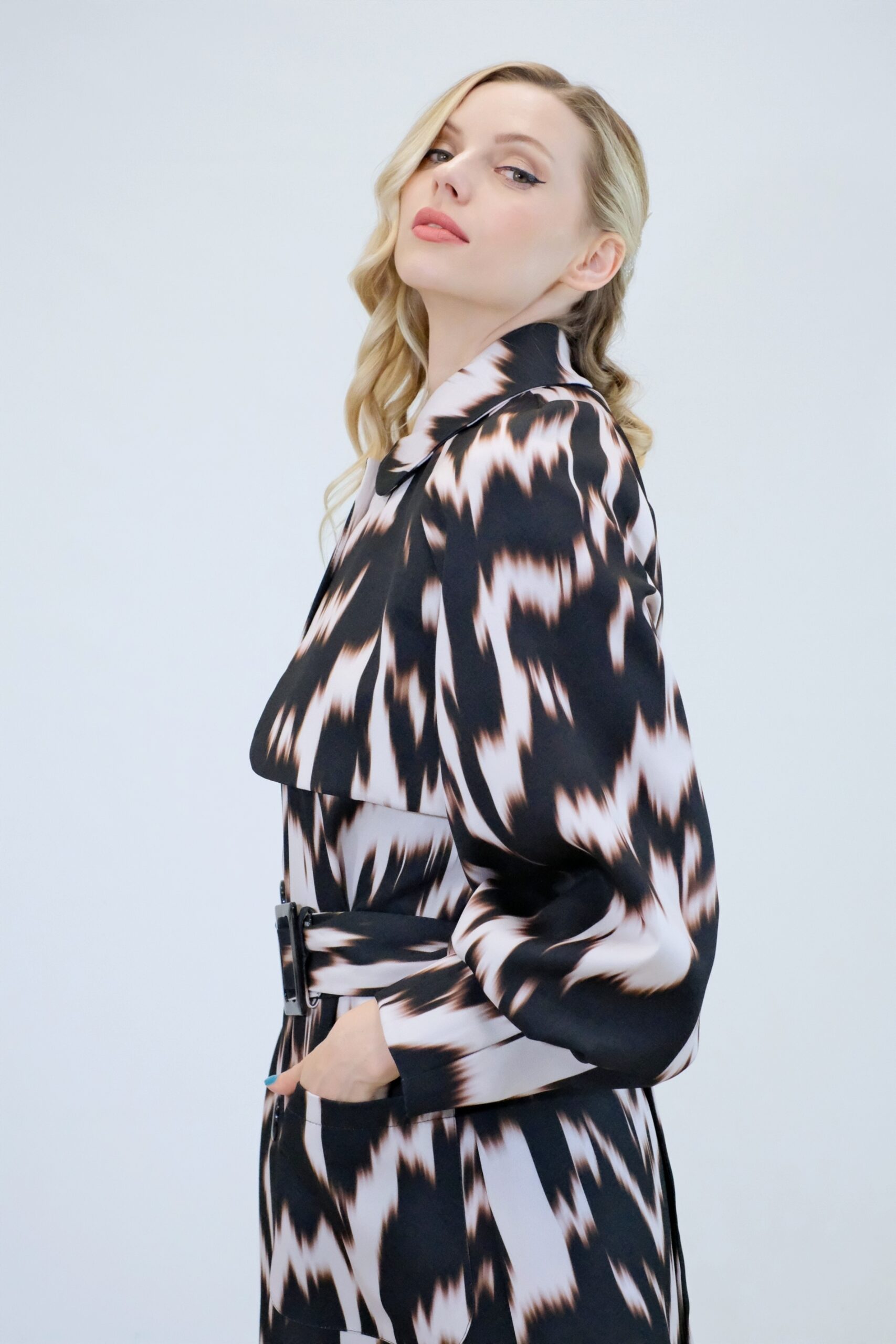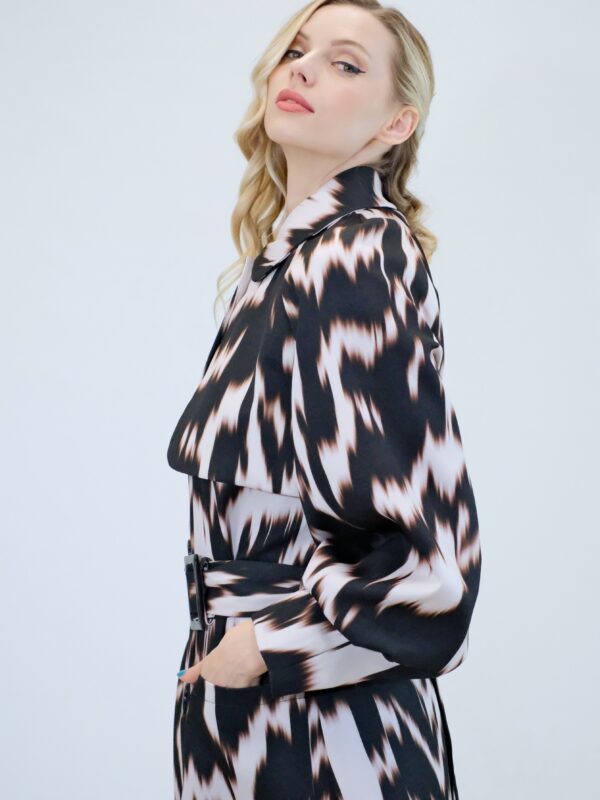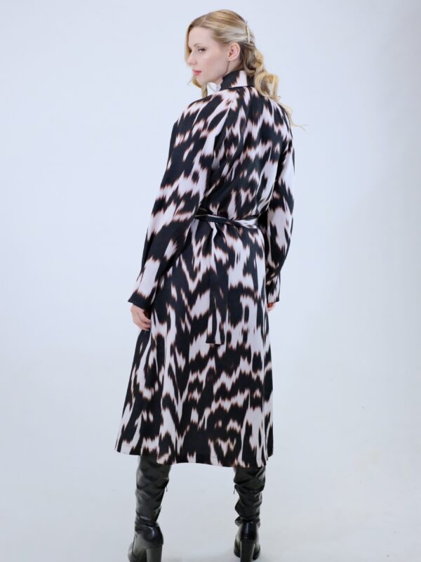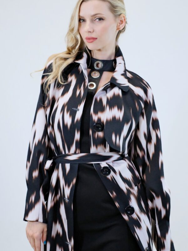 Plášť je navrhnutý v prepracovanom strihu, v ktorom vynikne každý detail. Plášť je nepodšitý a má funkčný opasok s putkami z rovnakého materiálu. Opasok sa sťahuje na ozdobnú čiernu sponu. Plášť je navrhnutý z minimalistického abstraktného vzoru, ktorý je ušitý v neutrálnych farbách béžovej a čiernej. Plášť ma funkčné vrecká a vďaka tomu, že nie je podšitý je ideálny spoločník aj na chladnejšie jarné alebo letné dni. Vďaka jeho neutrálnej farebnej škále ho ľahko skombinujete s čímkoľvek vo Vašom šatníku.
