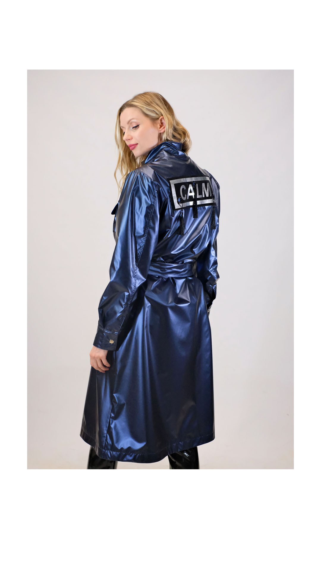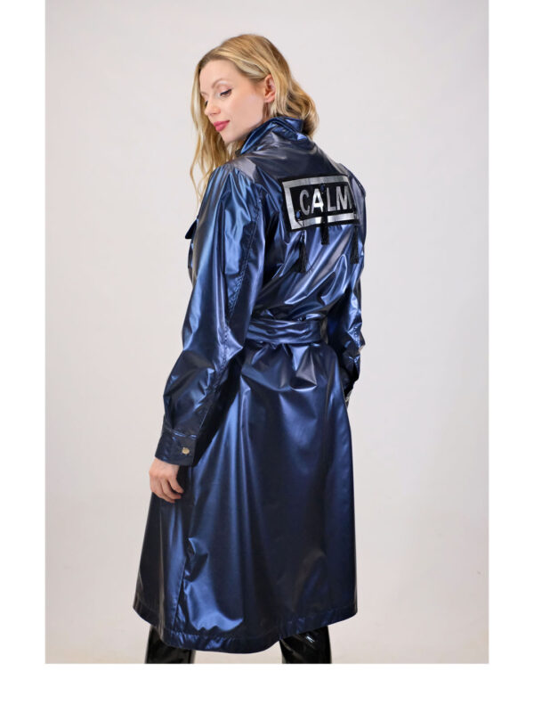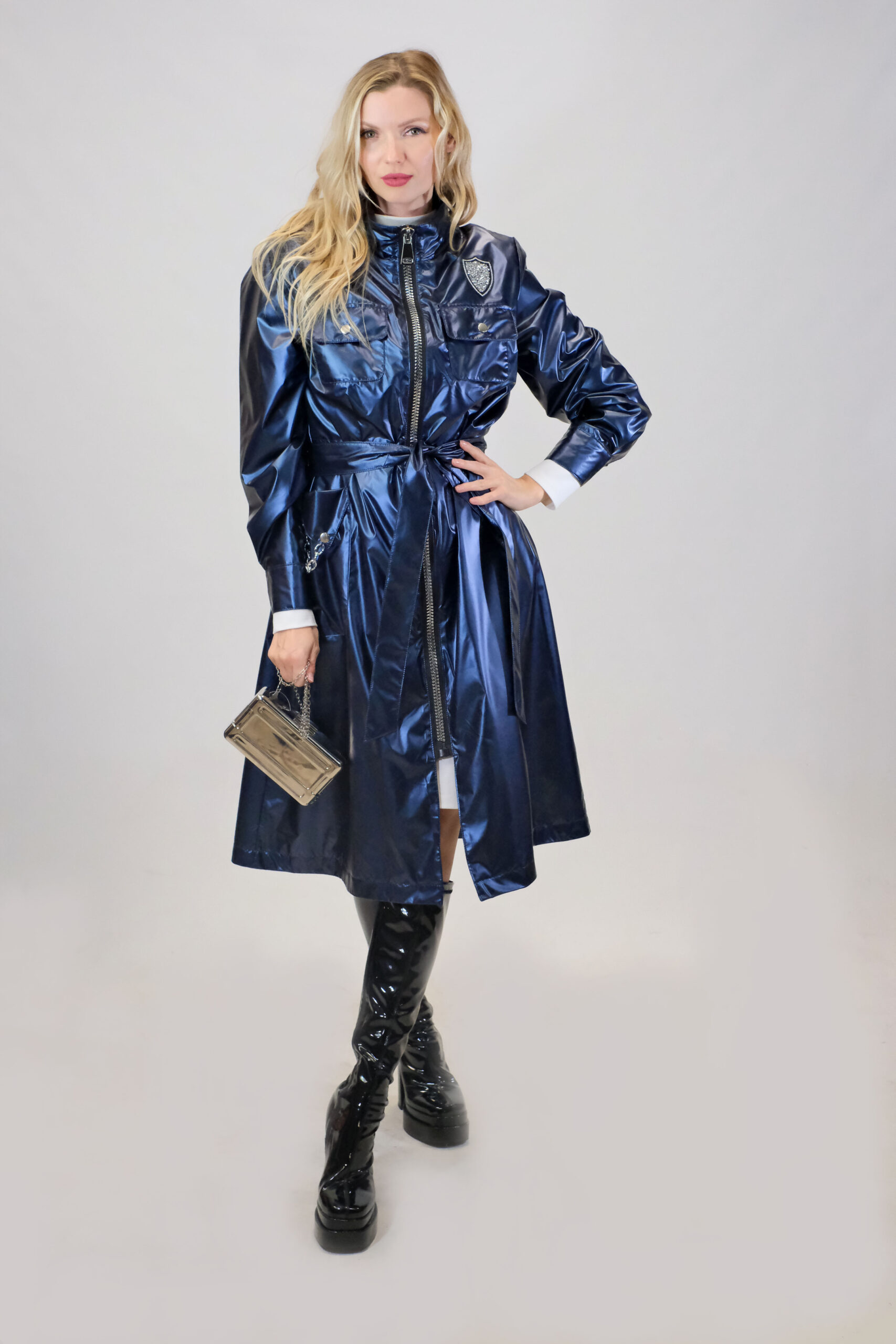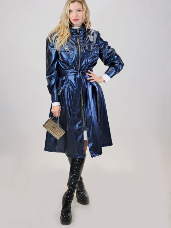Plášť je ušitý v prekrásnom v strihu prepracovanom do najmenších detailov. Plášť je navrhnutý so zipsom po celej dĺžke, čo mu dodáva ležérny nádych. Plášť má funkčné vrecká, ktoré sú ozdobené lesklou retiazkou. Plášte je navrhnutý v rozširujúcom sa strihu, ktorý si však môžete stiahnuť priložením opaskom z rovnakého materiálu. Plášt má zvýšený golier, ktorý vás výborne ochráni pred veterným počasím. Plášť je ušitý v nádhernej metalickej modrej farbe, ktorá sa leskne na svetle. Kombinujte ho ako naša aranžérka s čiernymi alebo striebornými doplnkami.