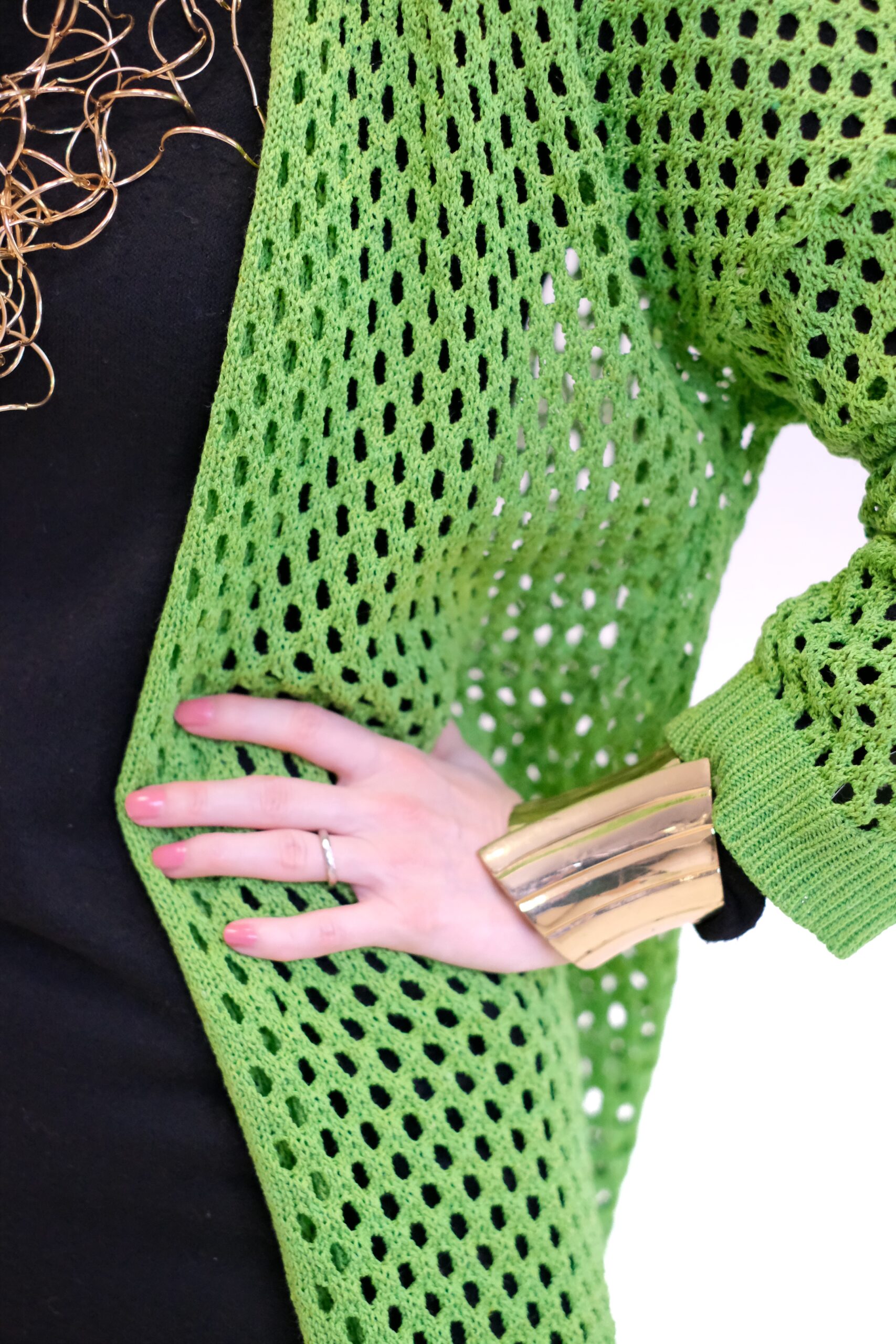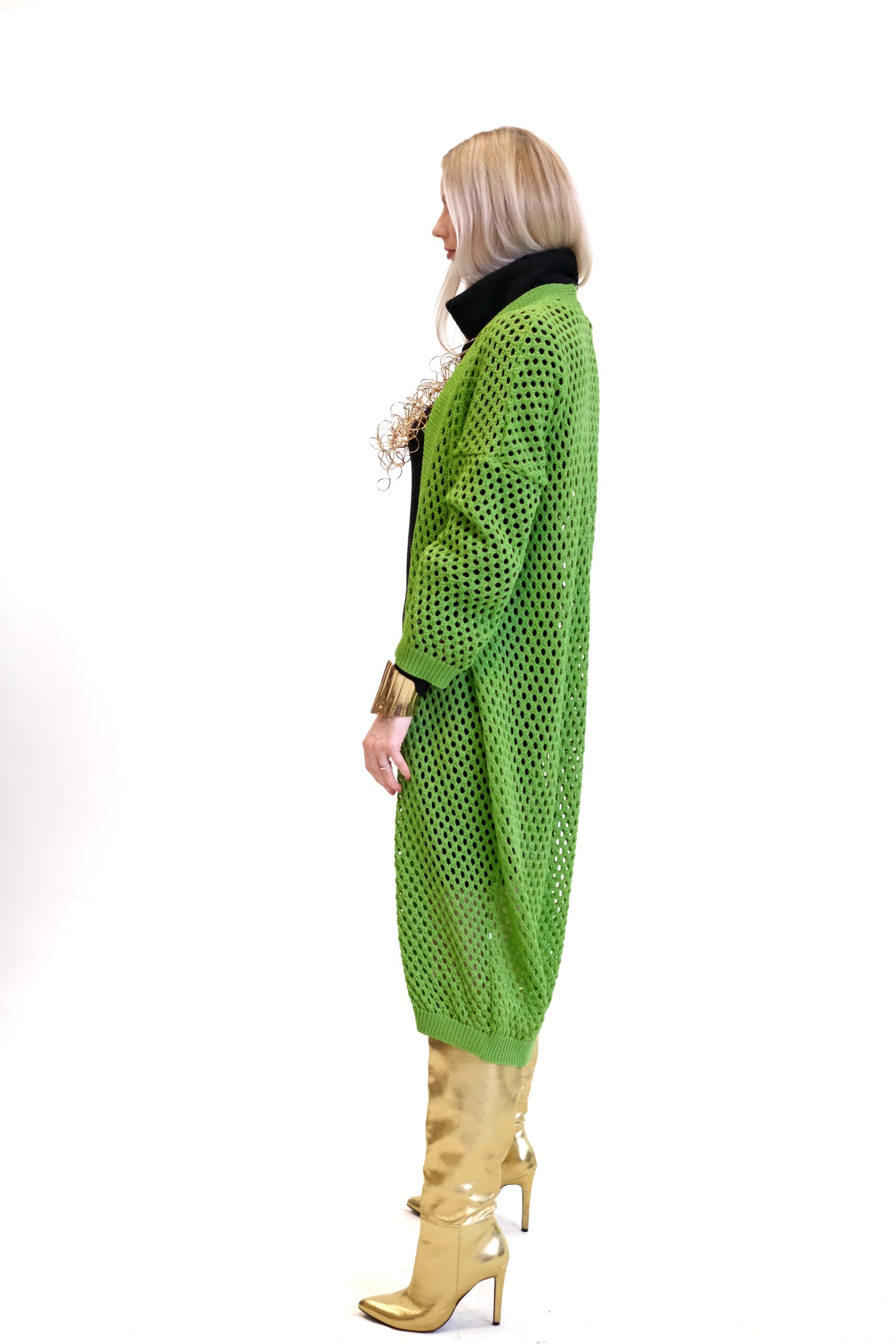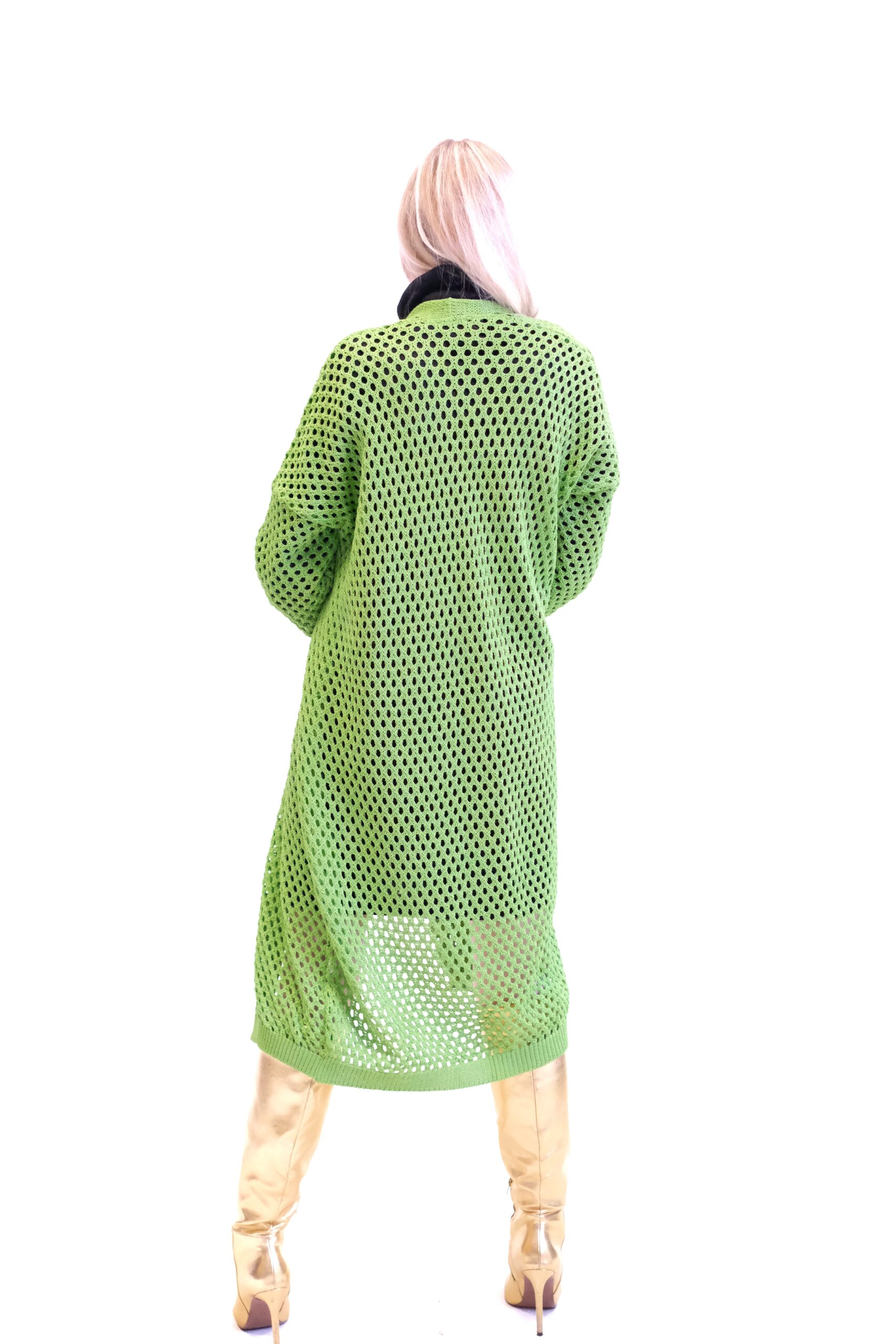 Zelený pletený sveter je dlhý, oversized kardigán, ktorý sa vyznačuje výrazným dierovaným alebo sieťovaným vzorom po celej ploche. Je navrhnutý ako otvorený (bez zapínania), čo z neho robí ideálny kúsok na vrstvenie cez iné oblečenie.