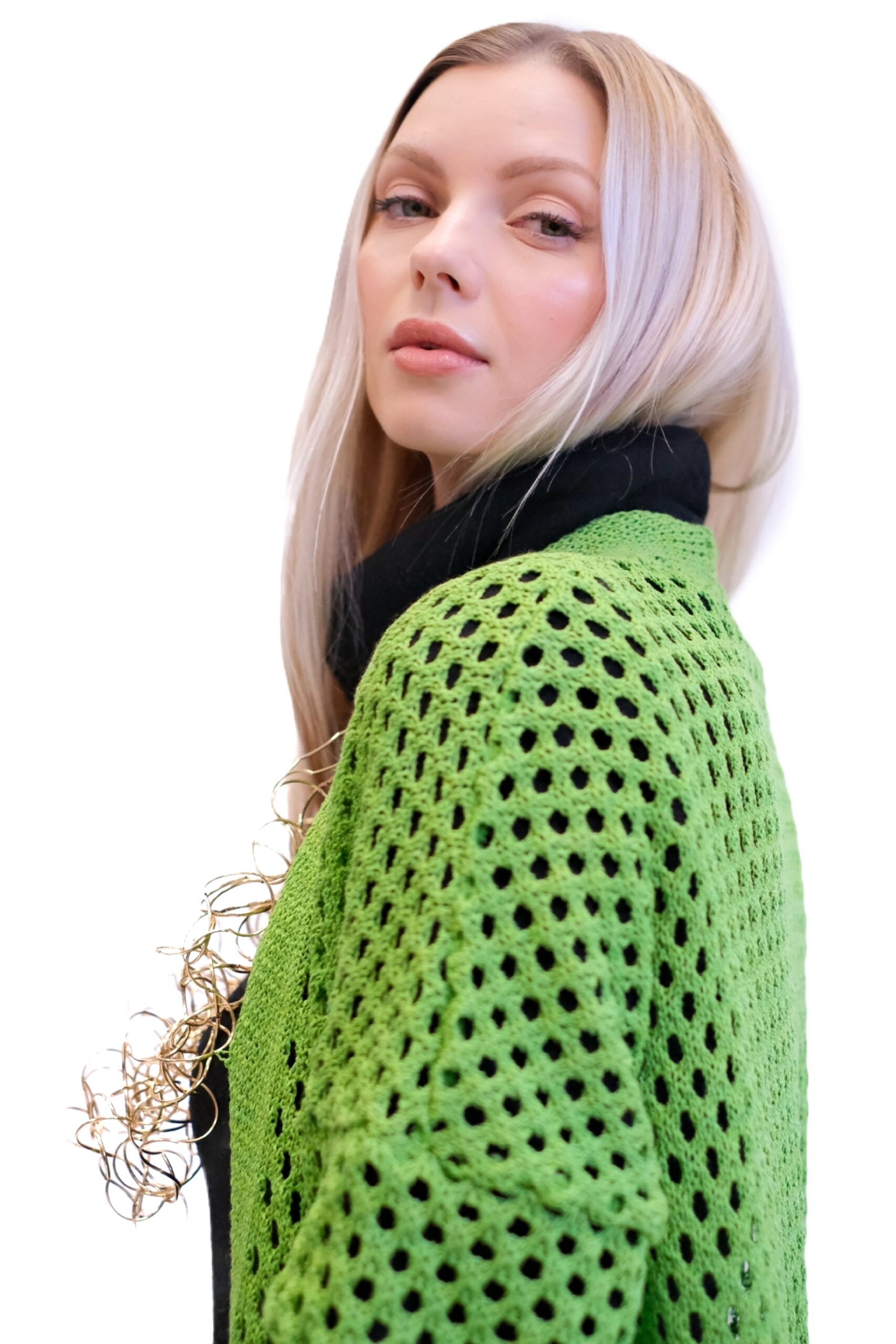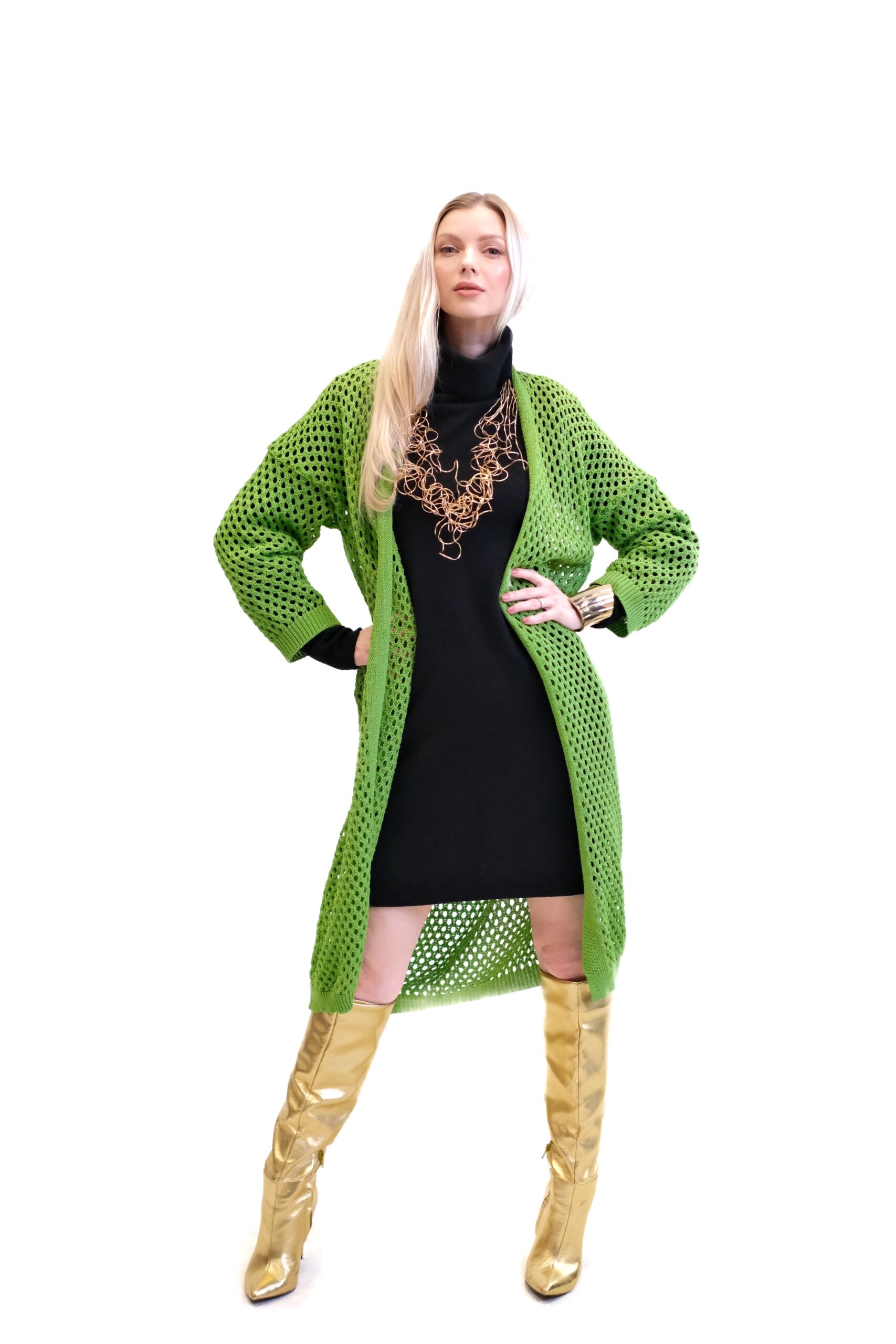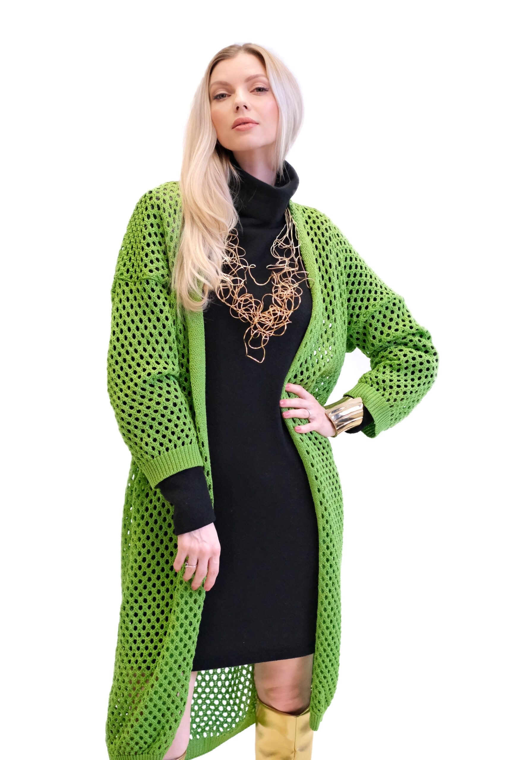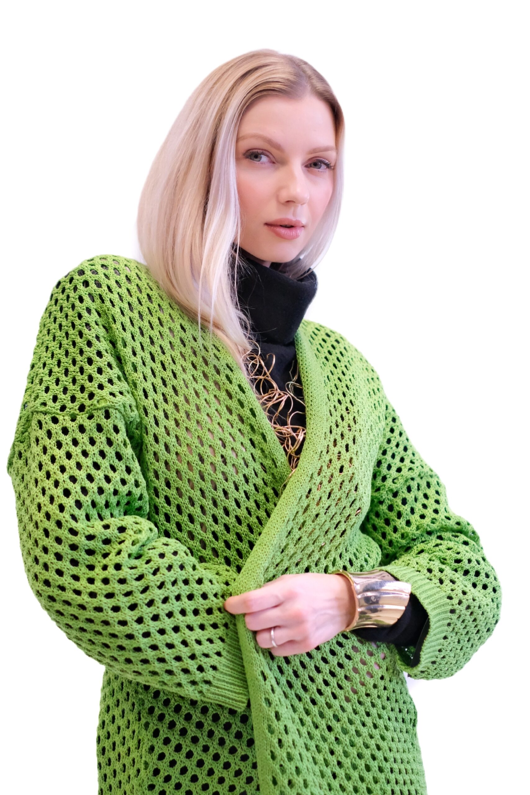 Zelený pletený sveter je dlhý, oversized kardigán, ktorý sa vyznačuje výrazným dierovaným alebo sieťovaným vzorom po celej ploche. Je navrhnutý ako otvorený (bez zapínania), čo z neho robí ideálny kúsok na vrstvenie cez iné oblečenie.