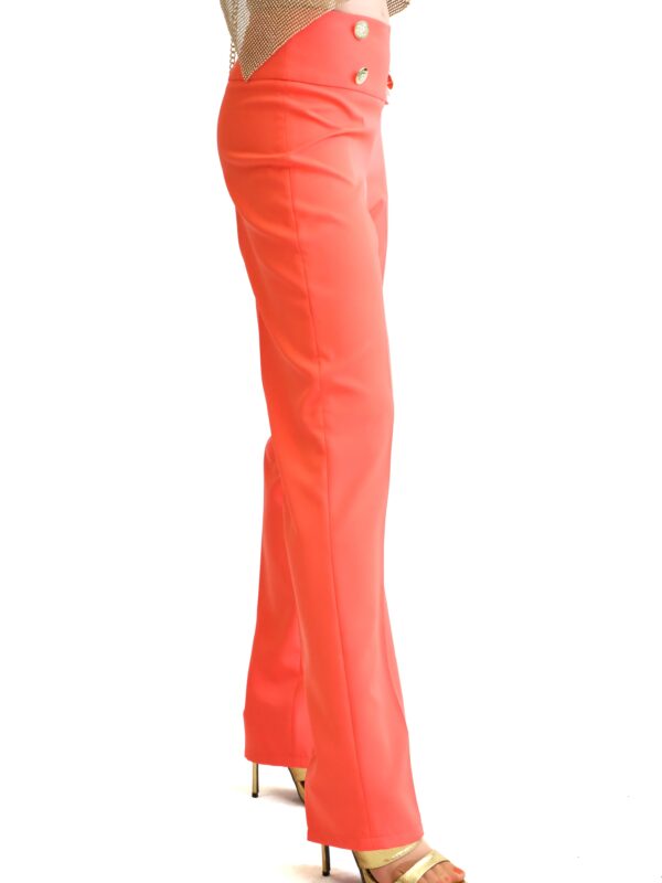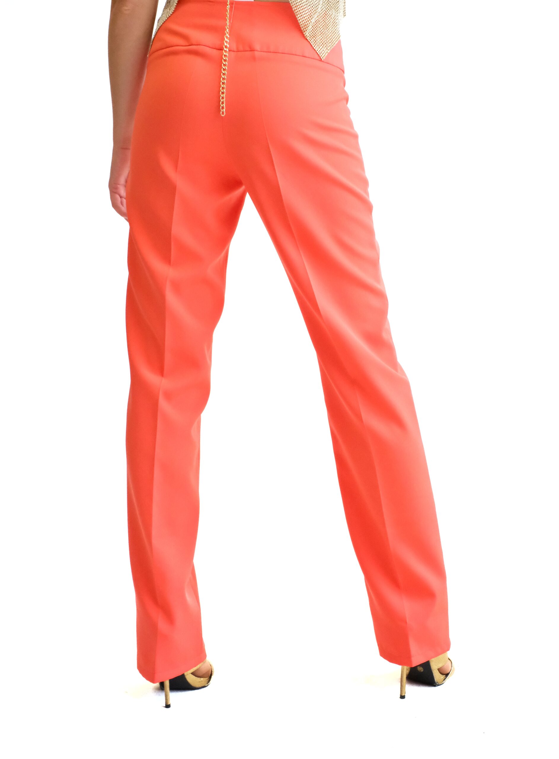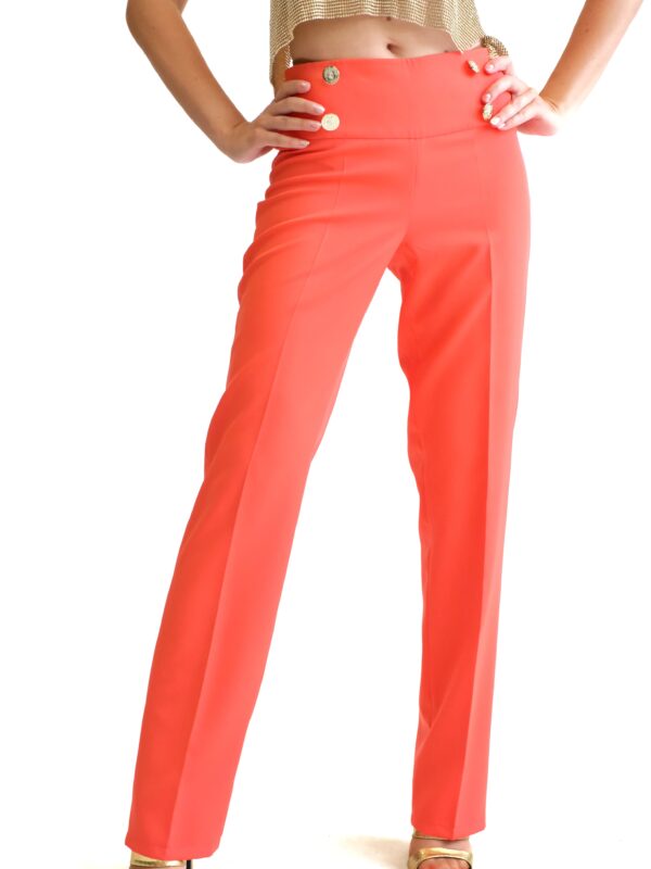 Nohavice sú navrhnuté v klasickom užsom strihu so širokým pásom, ktorý tvaruje oblasť bokov. Nohavice sú ušité v letnej farbe roka 2019 “Žijúci Korál” ,ktorá skvele doplní aj tmavé farby ako čierna alebo tmavomodrá. Pre wau efekt kombinujte so sakom Elisty a vytvorte ucelený look.