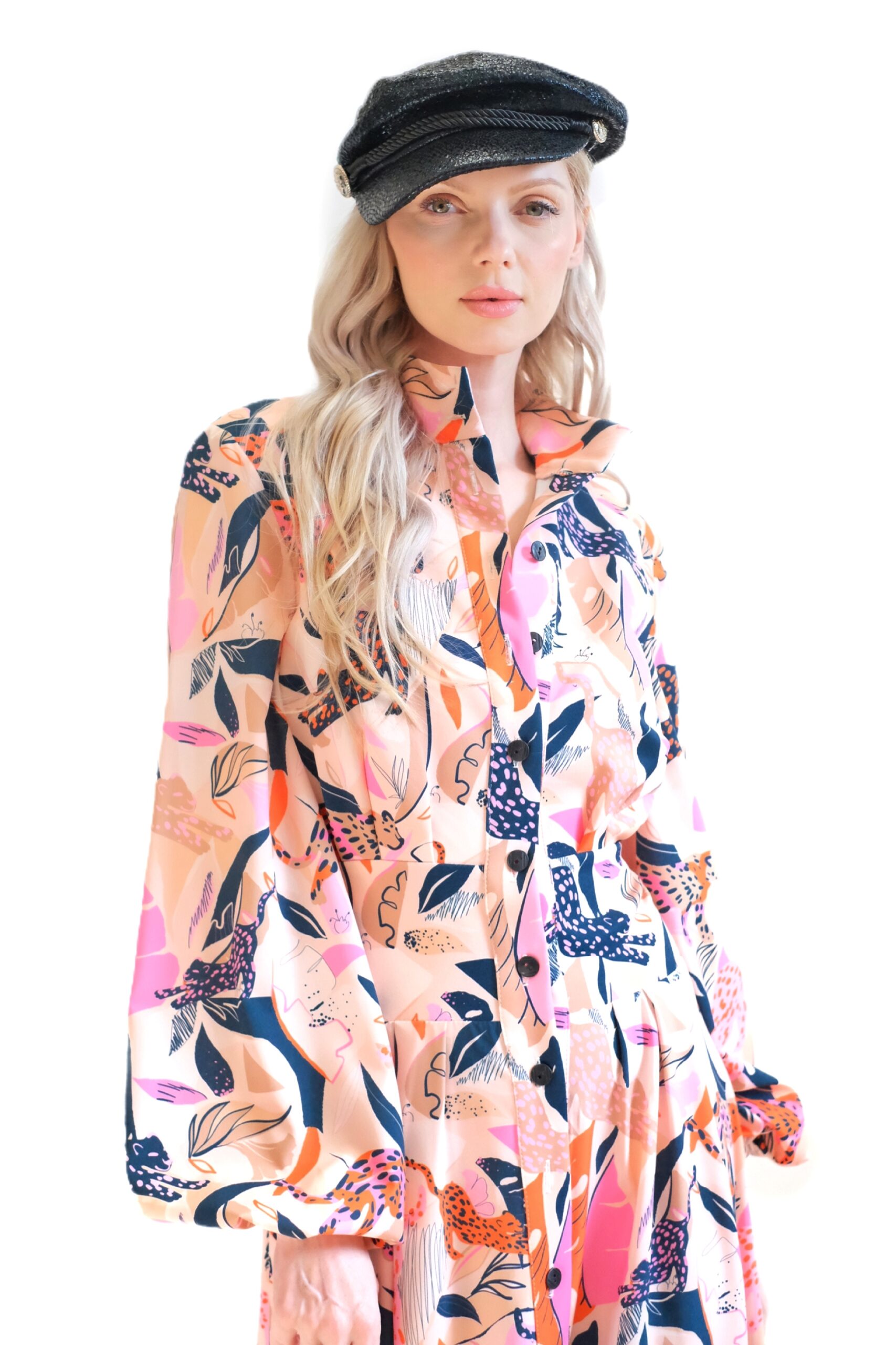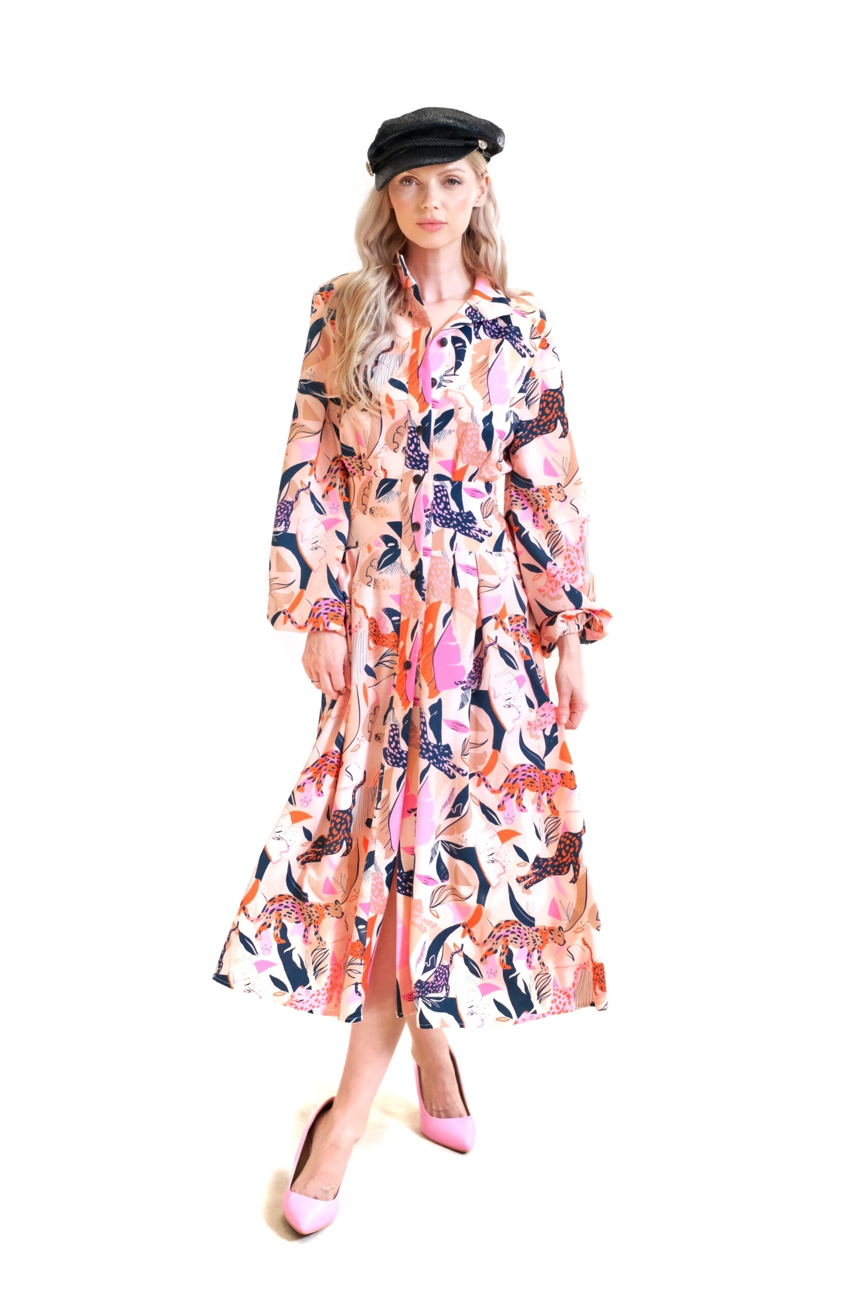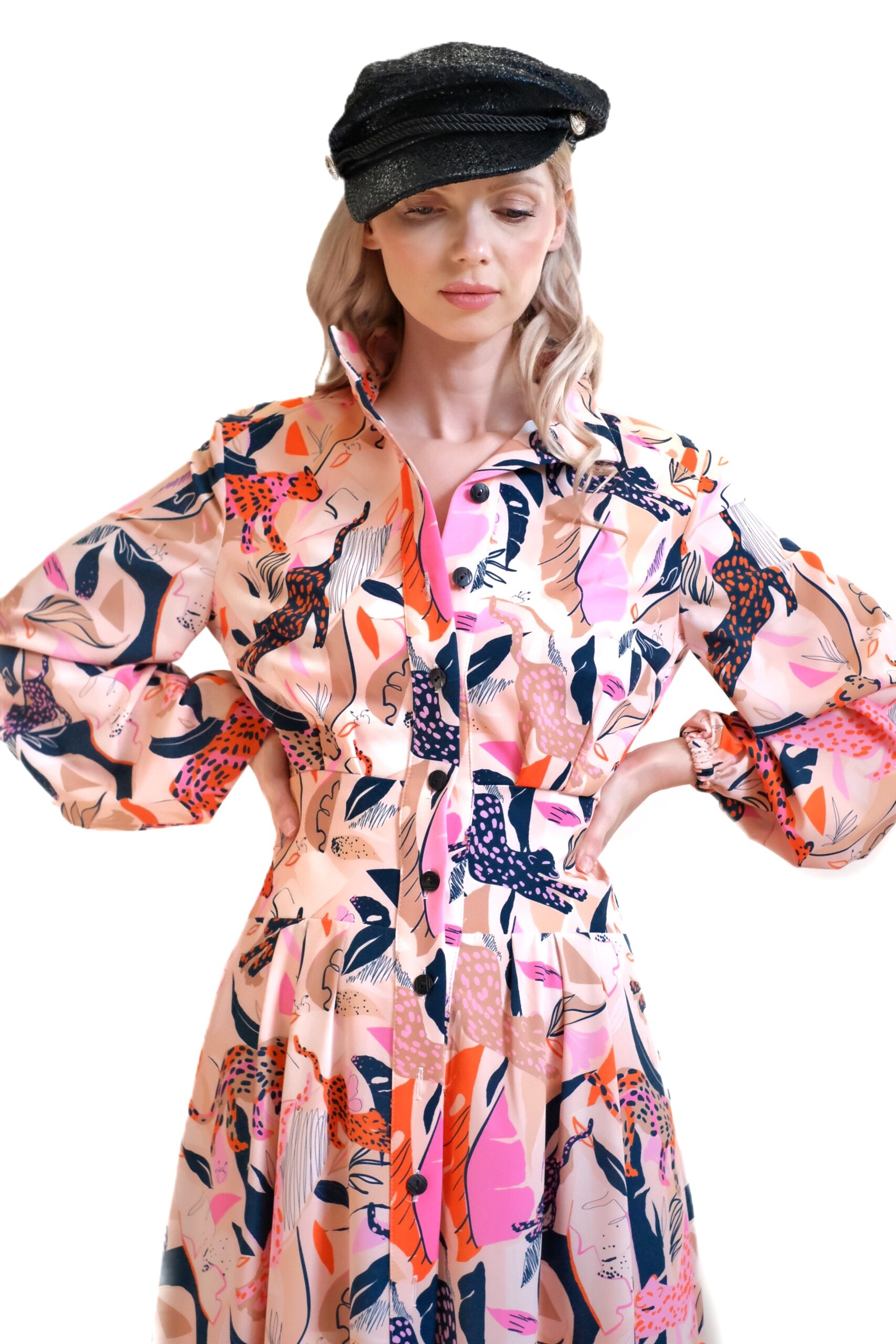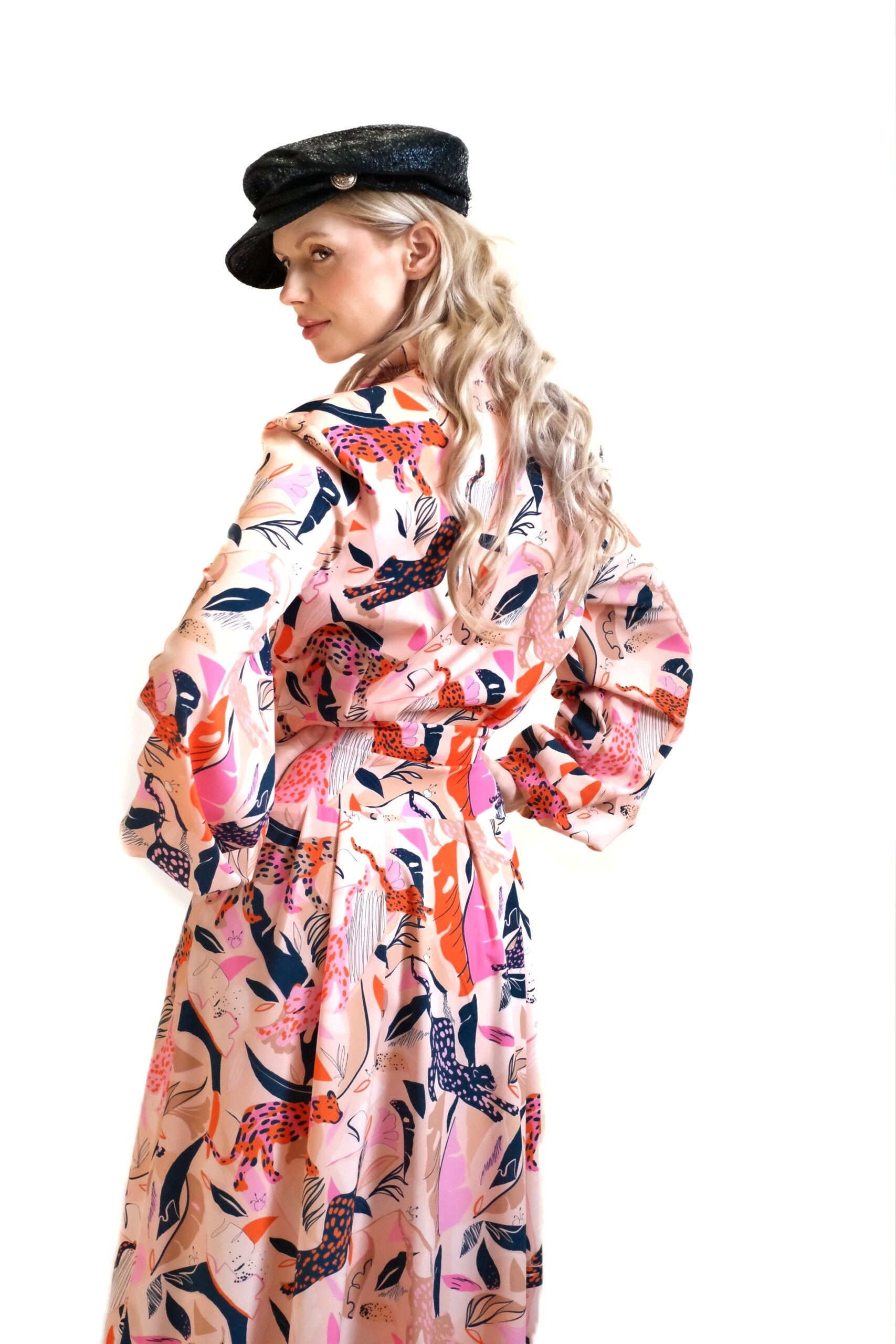 Dominantným prvkom modelu je výrazná celoplošná potlač s motívom divokých šeliem a farebných listov na jemnom krémovo-ružovom podklade, čo šatám dodáva neprehliadnuteľný „statement“ charakter a dávku nespútanej energie.