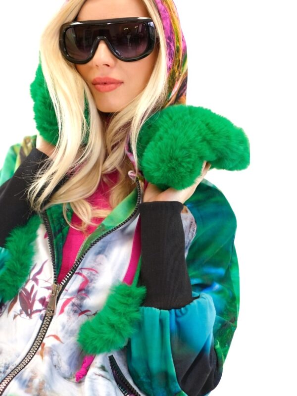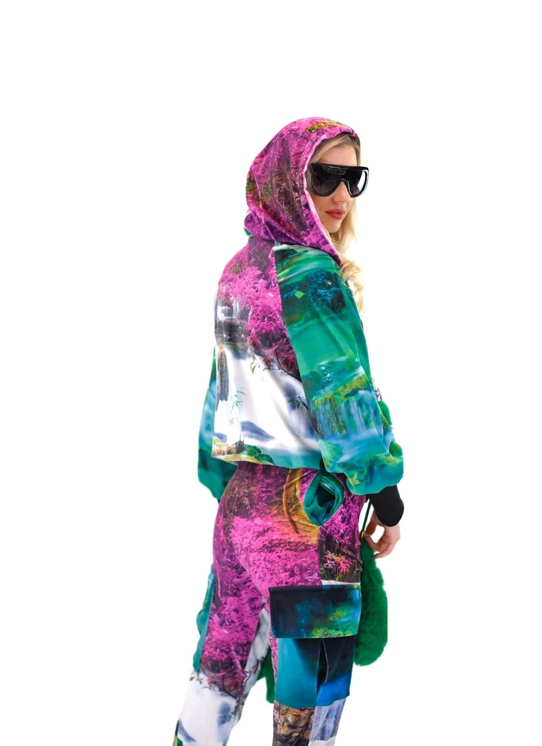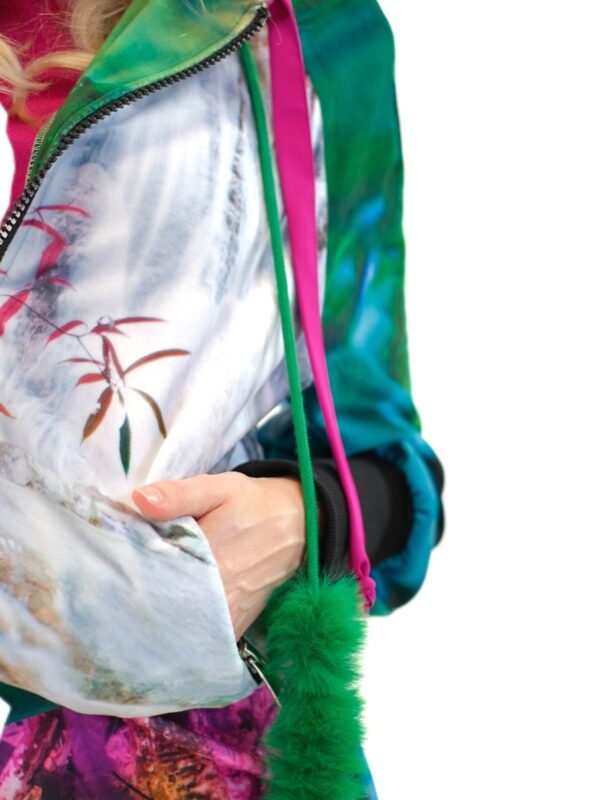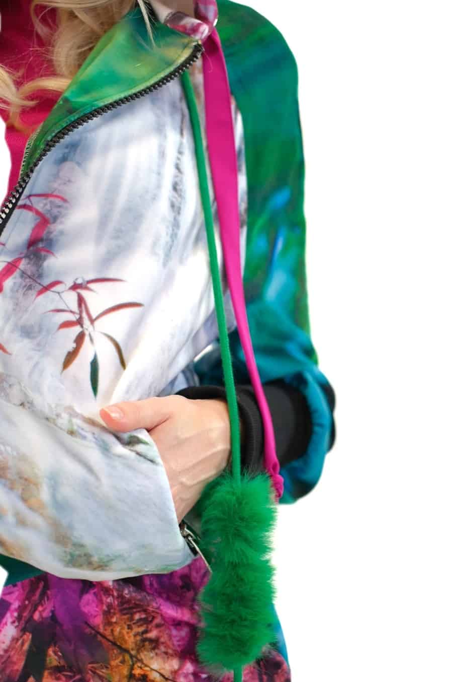 Bombera je ušitá v pohodlnom strihu, ktorý výborne sadne na každú postavu. Bombera má našitý patent, ktorý Vám opticky zúži pás a zároveň dodá na komforte. Bombera je navrhnutá s kapucňou, čo jej dodáva ležérny nádych. Bombera je ušitá v teplom a pohodlnom materiáli, v ktorom sa budete cítiť skvele aj počas chladných dní. Bombera má výnimočný vzor, ktorý kombinuje dve farby tejto sezóny cyklámenovú a zelenú v unikátnom spojení. Vzor má orientálny nádych a zachytáva vodopád počas kvitnutia sakury.
