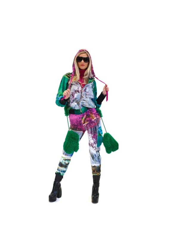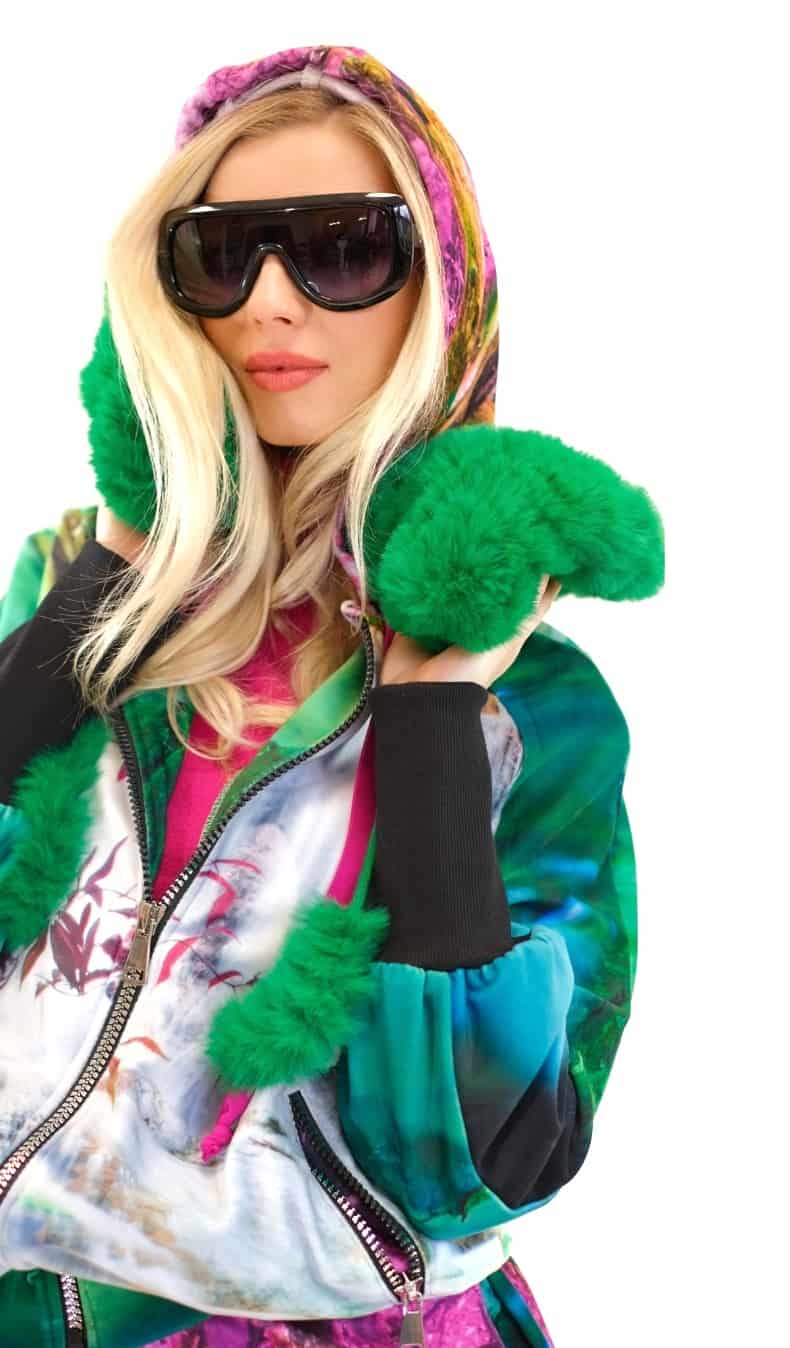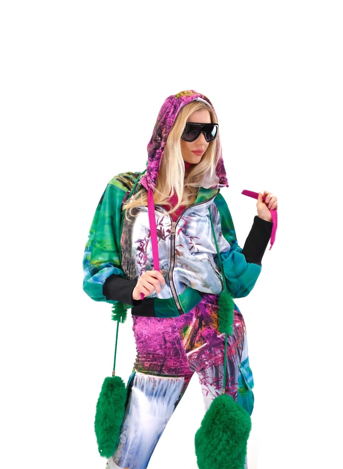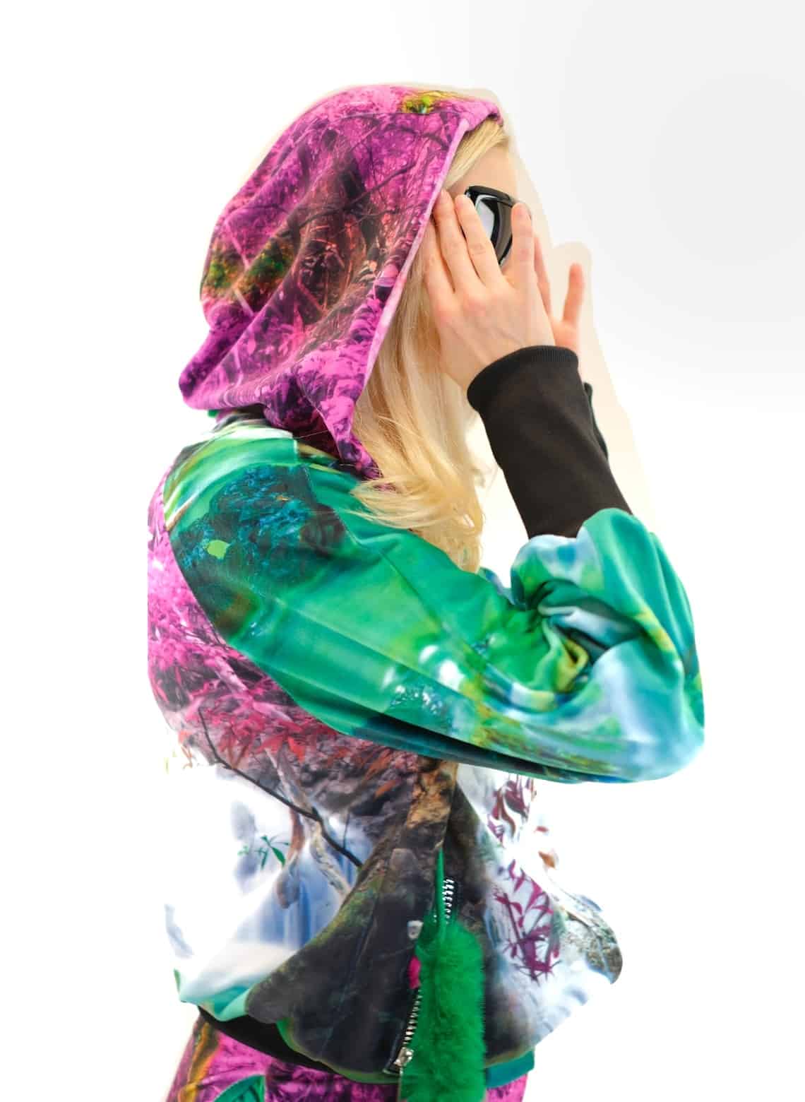 Bombera je ušitá v pohodlnom strihu, ktorý výborne sadne na každú postavu. Bombera má našitý patent, ktorý Vám opticky zúži pás a zároveň dodá na komforte. Bombera je navrhnutá s kapucňou, čo jej dodáva ležérny nádych. Bombera je ušitá v teplom a pohodlnom materiáli, v ktorom sa budete cítiť skvele aj počas chladných dní. Bombera má výnimočný vzor, ktorý kombinuje dve farby tejto sezóny cyklámenovú a zelenú v unikátnom spojení. Vzor má orientálny nádych a zachytáva vodopád počas kvitnutia sakury.