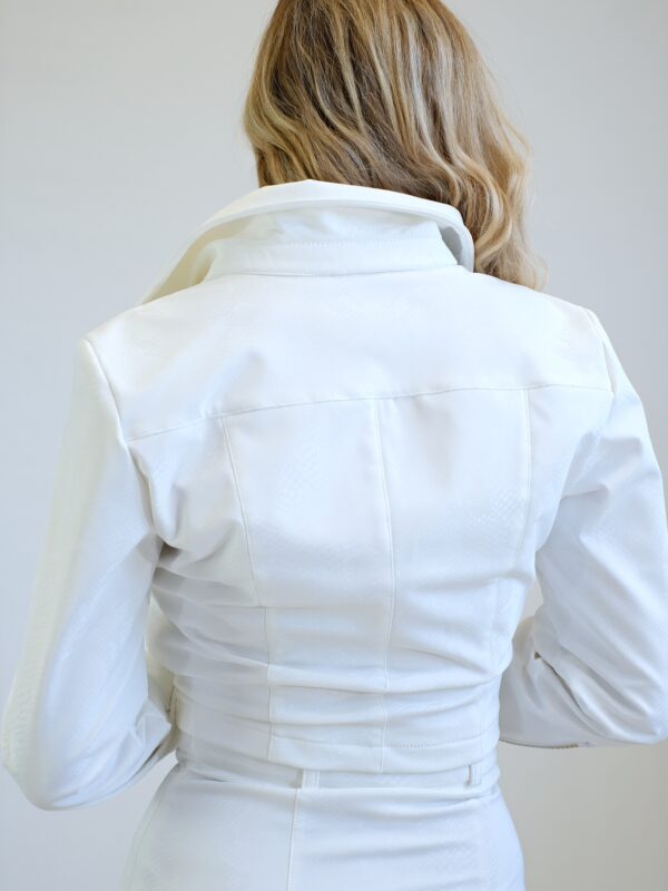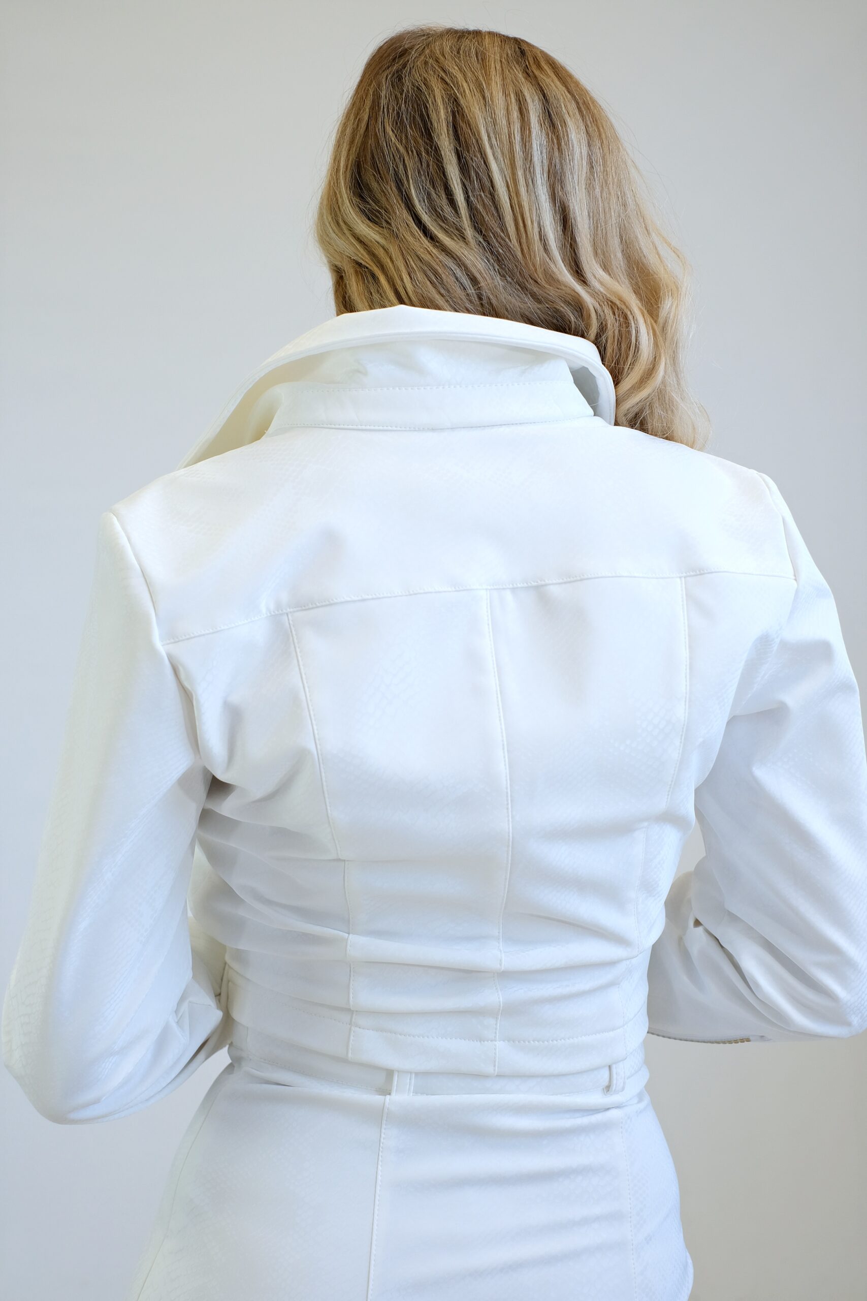 Bunda je navrhnutá s príjemné ho koženkové ho materiálu, ktorý sa prispôsobí postave. Bunda je ušitá v dokonale prepracovanom strihu do najmenších detailov. Na Bunde vás zaujme nielen precízne spracovanie, ale aj výrazné ozdobné zipsy. Bunda vám výborne sadne na postavu a každý váš outfit bude vďaka nej vyzerať sofistikovane a výnimočne. Aj obyčajné čierne šaty alebo top s úzkymi nohavicami budem mať vďaka tejto bunde šmrnc. Pre wow efekt môžete kombinovať so sukňou Alexis.