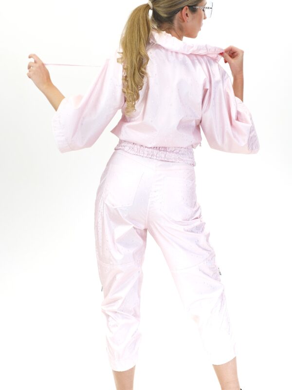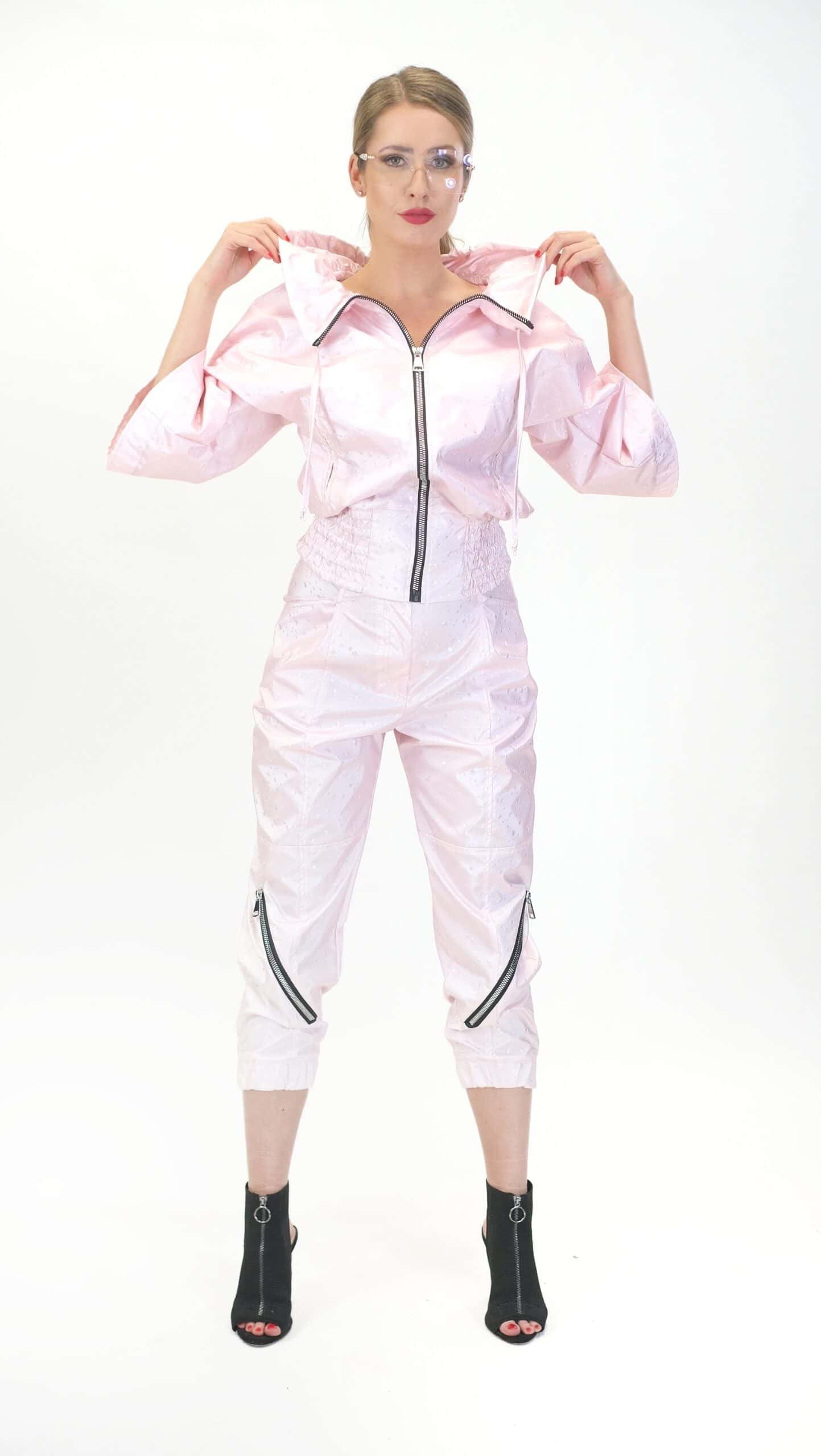 Bunda je navrhnutá v strihu prepracovanom do posledného detailu. Mnohé z Vás na nej ocenia hlavne široký štepovaný pás, ktorý krásne opticky zužuje krivky a vytvára zaujímavý kontrast napríklad v kombinácii so širokými nohavicami. Výnimočným je aj spracovanie goliera, ktorý viete nosiť roztvorený ale aj zapnutý až po vrch a vznikajú Vám dva veľmi odlišné stylingy. Bunda je navrhnutá vo výnimočnom pastelovo rúžovom materiáli, ktorý má na sebe potlač dažďových kvapiek, čo mu dodáva lesklý efekt na svetle. Materiál pripomína nepremokavý šusták.