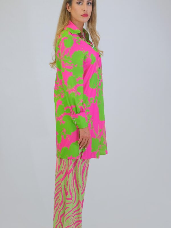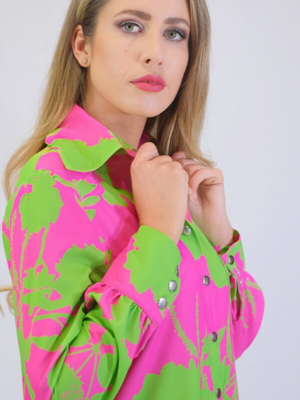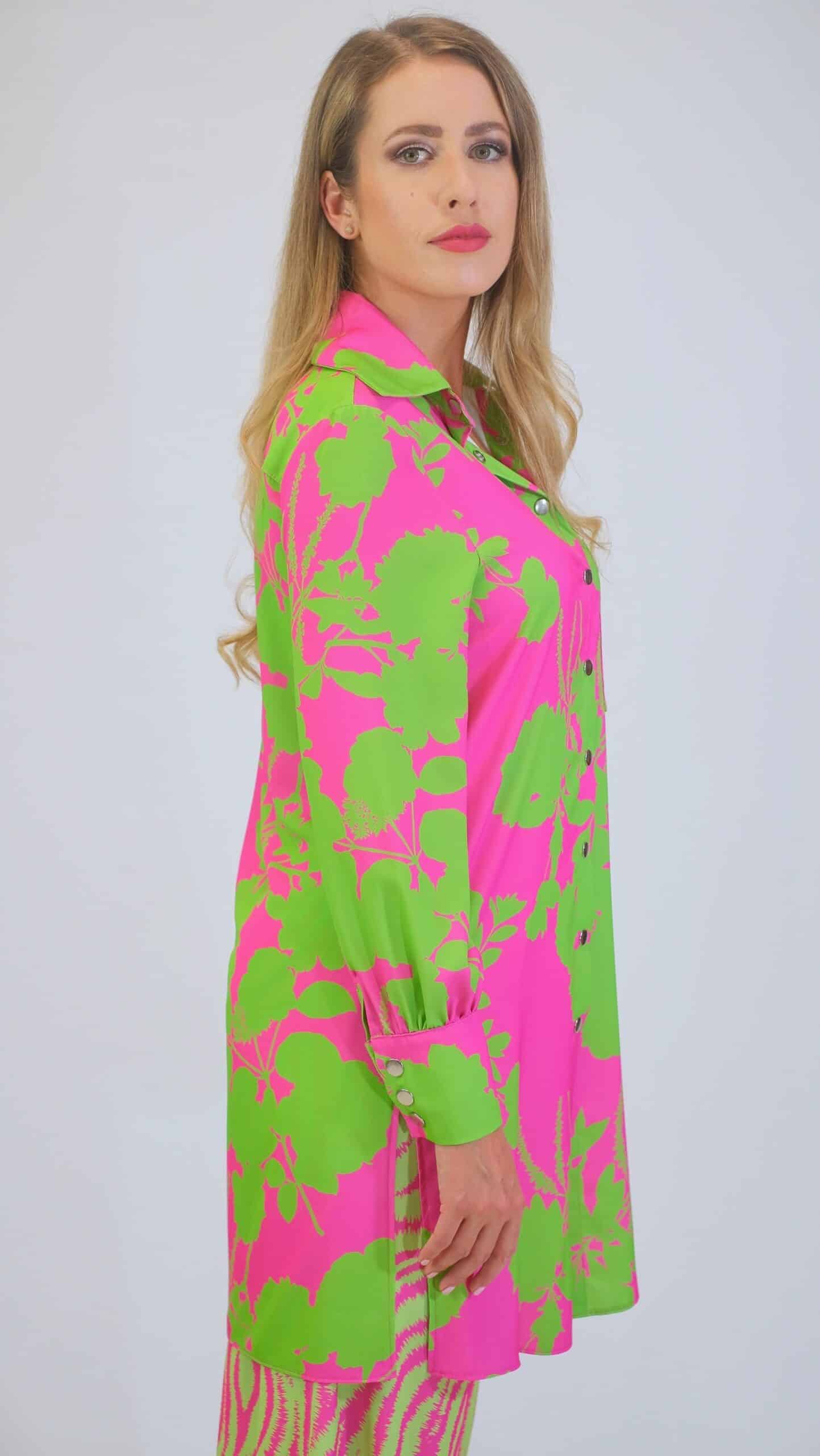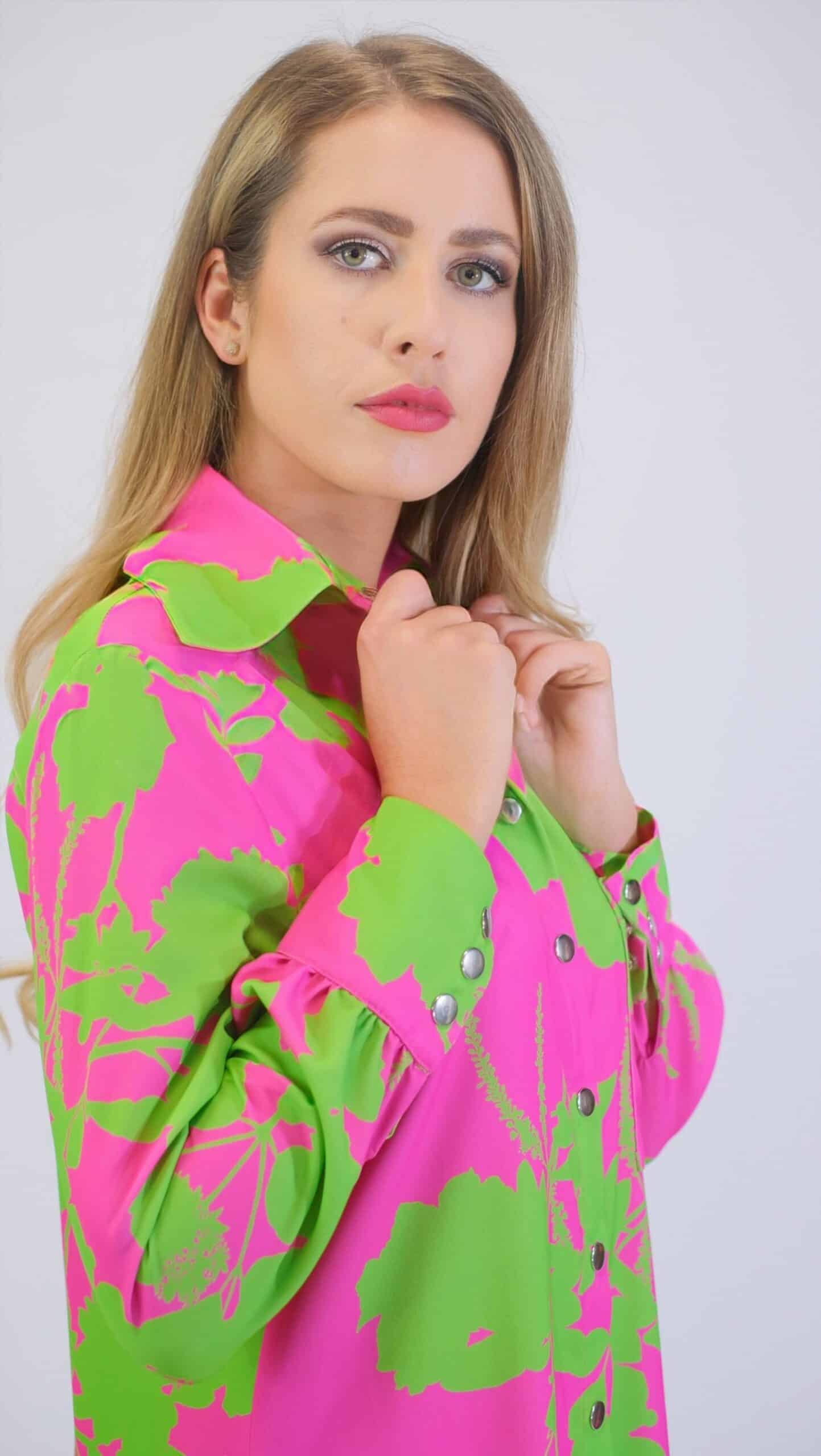 Košeľa je navrhnutá v pohodlnom predĺženom strihu, ktorý výborne sadne na každý typ postavy. Vďaka predĺženému strihu môžete košeľu nosiť aj na nohaviciach alebo šortkách. Košeľa je ušitá vo výraznej kombinácii farieb cyklaménovej a zelenej . Zaujímavým detailom na košeli sú ozdobné zlaté gombíky, ktoré jej dodávajú punc elegancie. Košeľa má prestrihnuté boky, ktoré dodávajú strihu vzdušnosť.