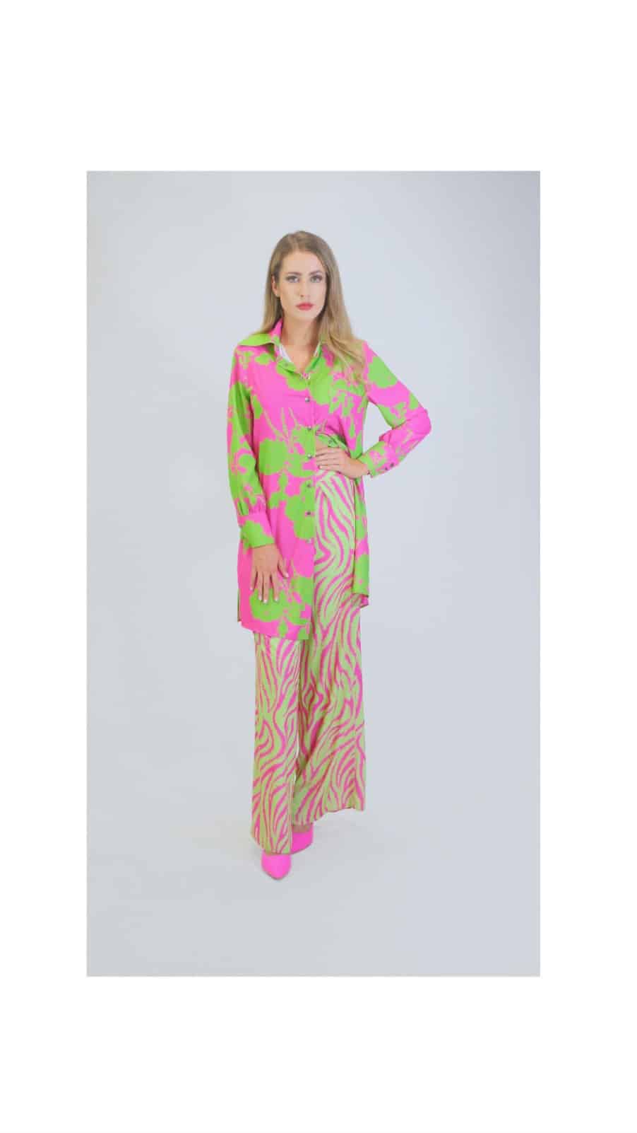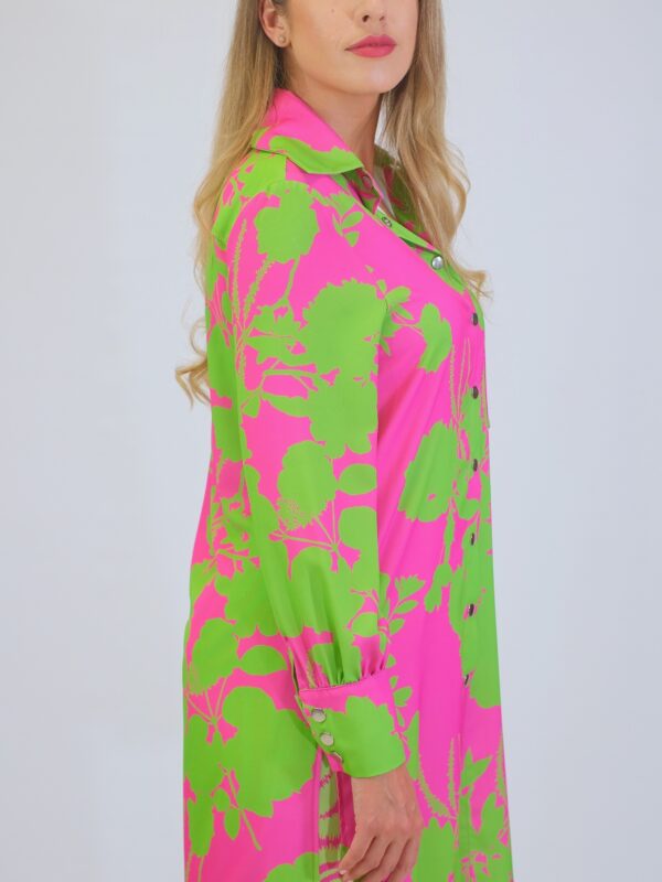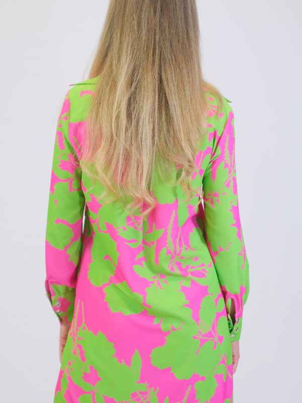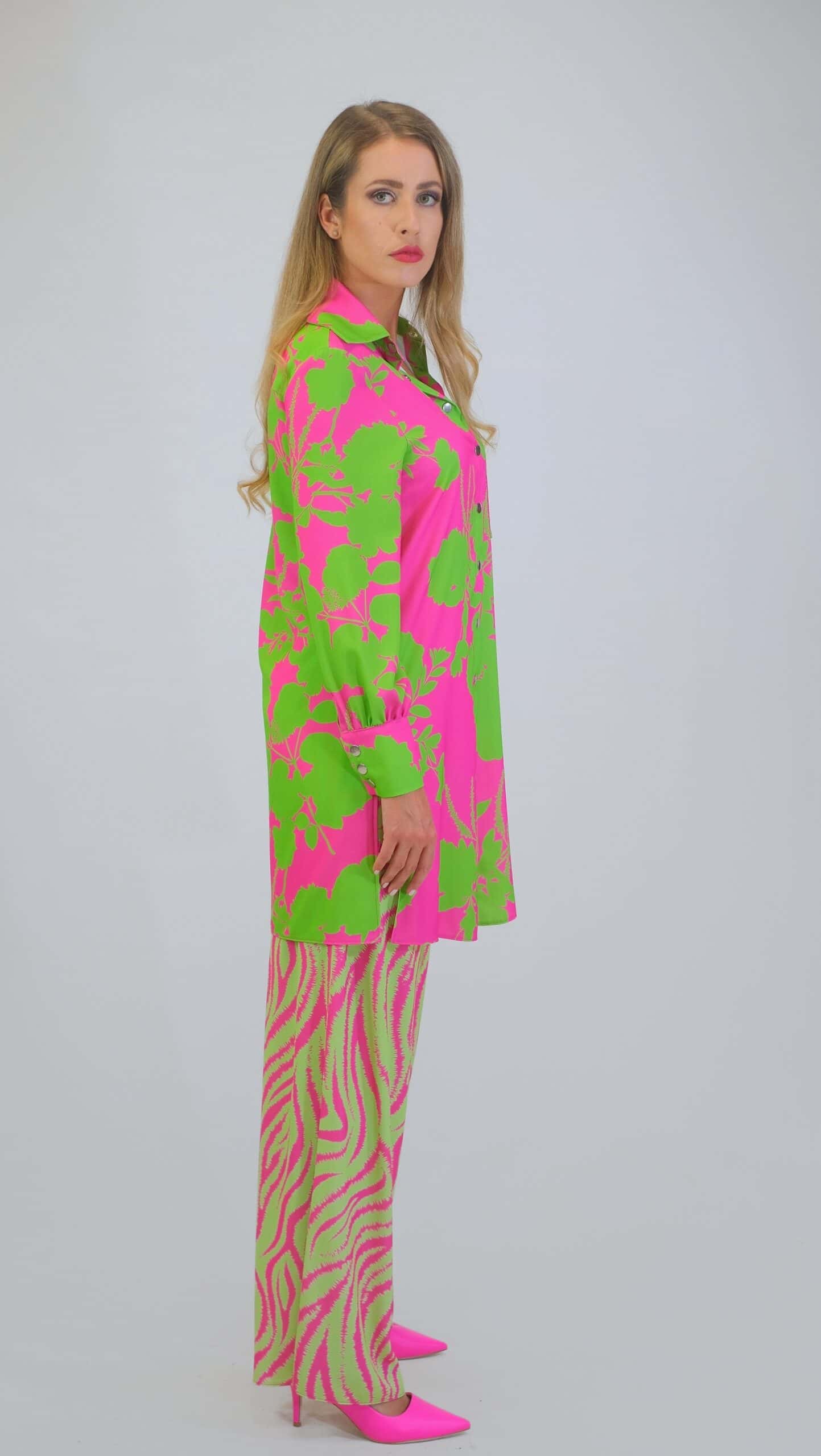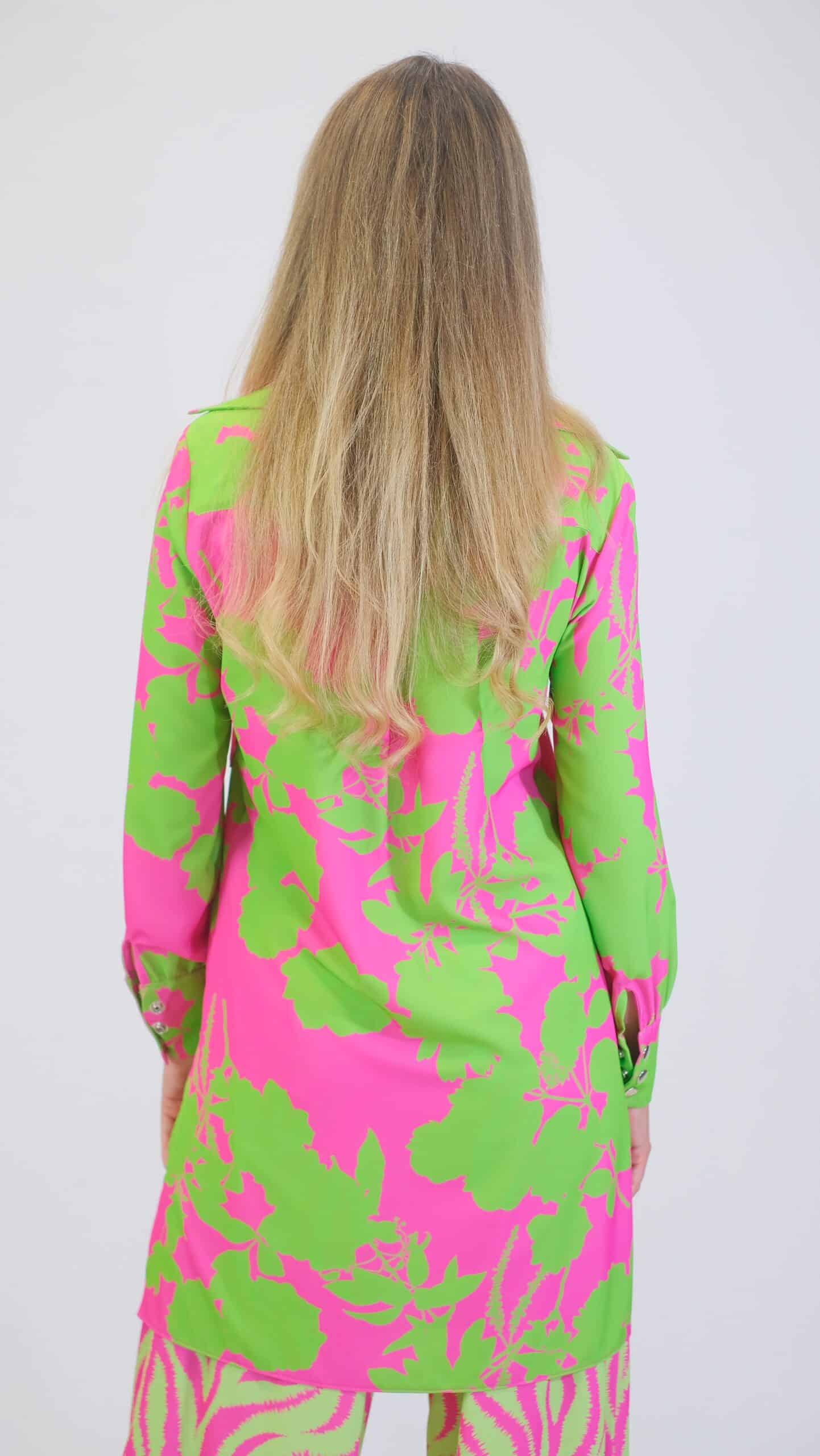 Košeľa je navrhnutá v pohodlnom predĺženom strihu, ktorý výborne sadne na každý typ postavy. Vďaka predĺženému strihu môžete košeľu nosiť aj na nohaviciach alebo šortkách. Košeľa je ušitá vo výraznej kombinácii farieb cyklaménovej a zelenej . Zaujímavým detailom na košeli sú ozdobné zlaté gombíky, ktoré jej dodávajú punc elegancie. Košeľa má prestrihnuté boky, ktoré dodávajú strihu vzdušnosť.