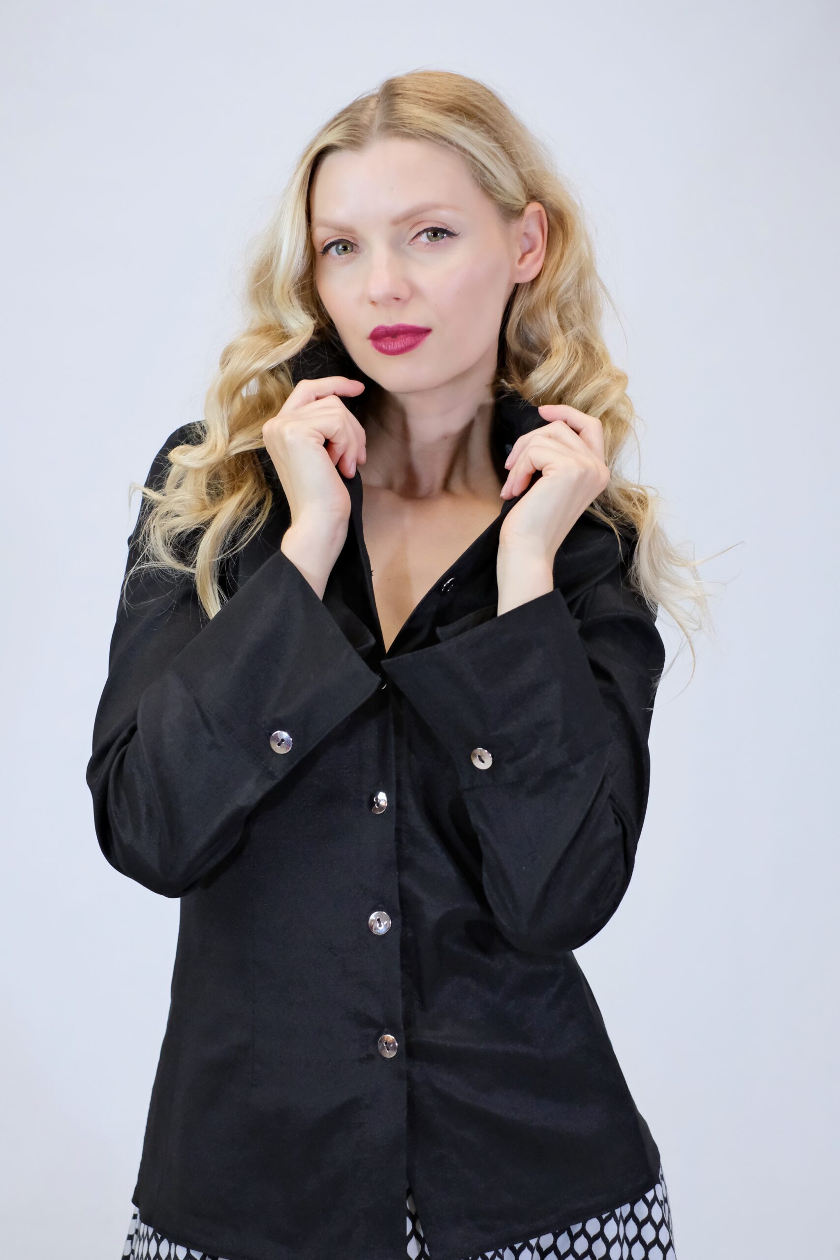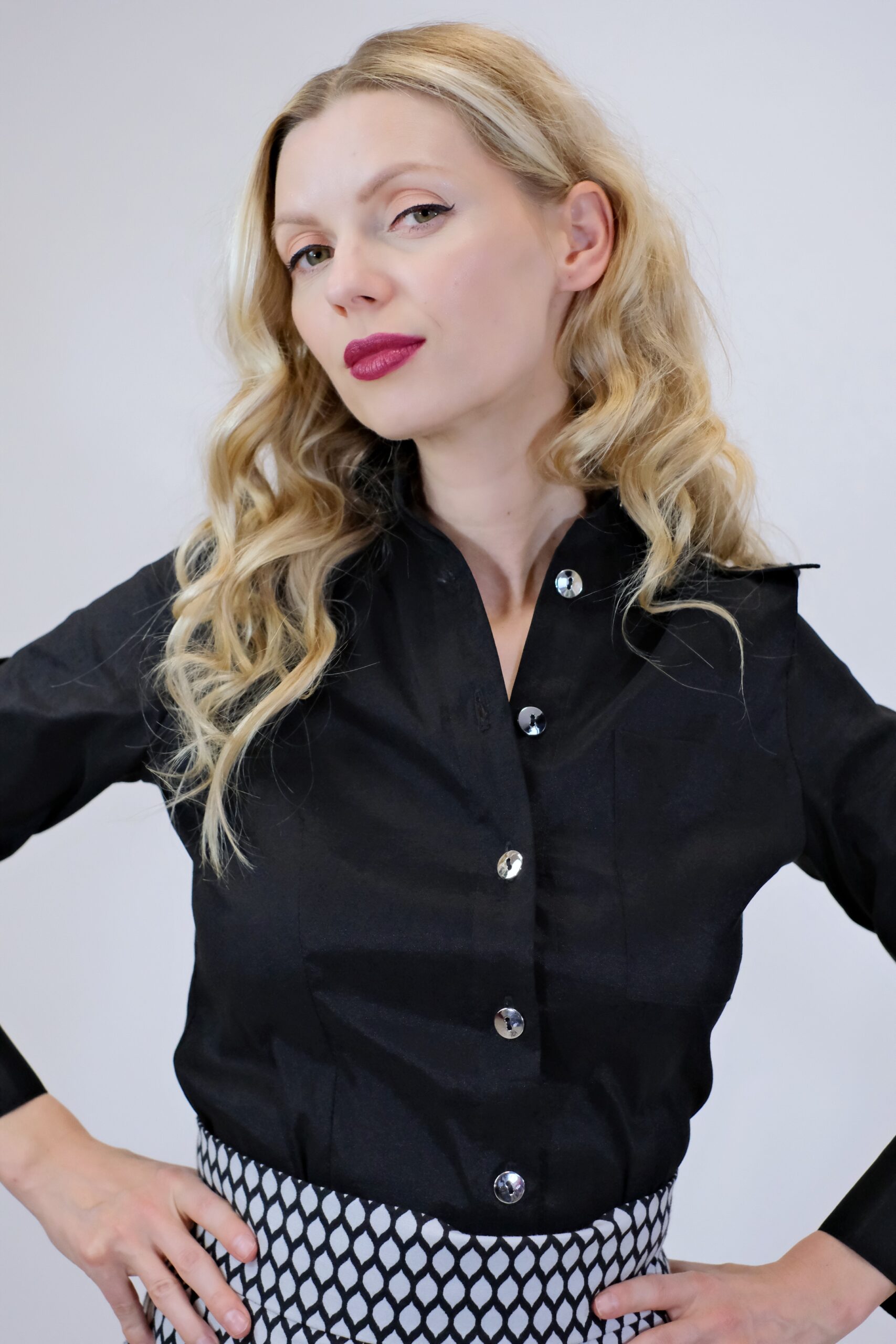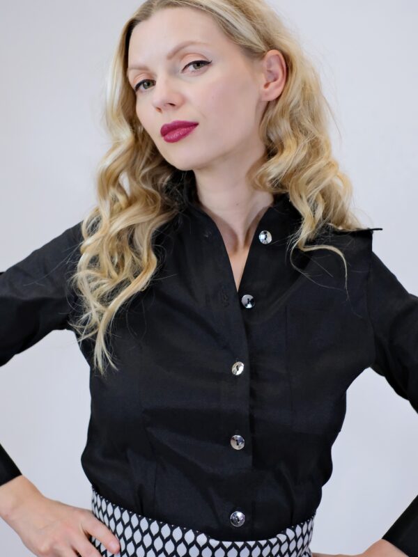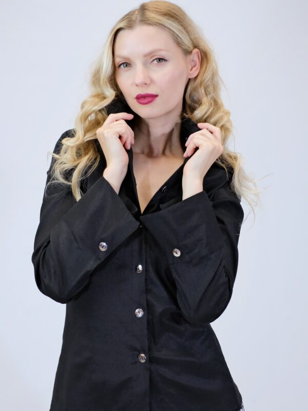 Košeľa je navrhnutá v úzkom strihu s prispôsobivého materiálu, ktorý vám sadne ako druhá koža. Košeľa je ušitá s dôrazom na detaily, čo vidieť na spracovaní manžety, ktorá je inšpirovaná pánskou košeľou. Zaujímavým detailom sú ozdobné strieborné gombíky. Čierna košeľa je základom každého šatníka, aj vďaka jej prispôsobivosti. Môžete ju kombinovať sa úzkymi nohavicami alebo aj ako naša aranžérka s dlhými spoločenskými sukňami.