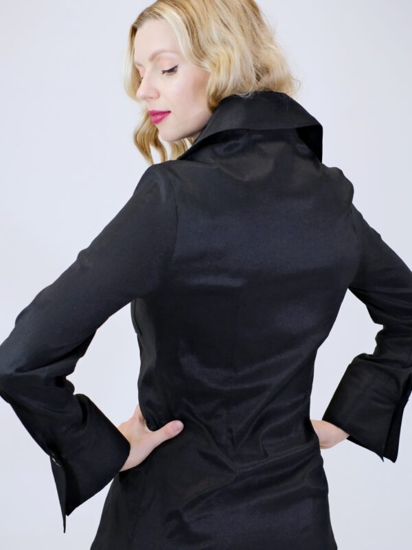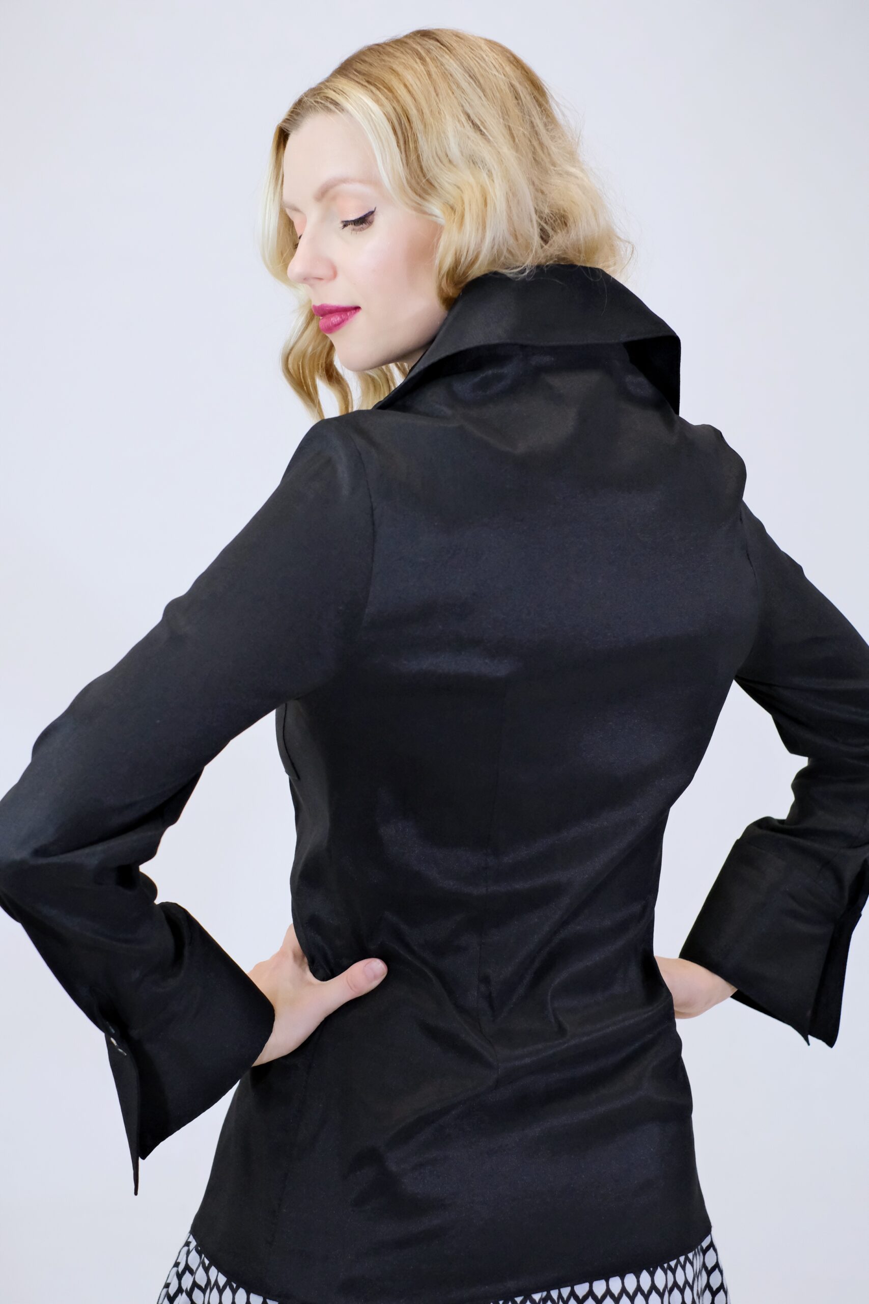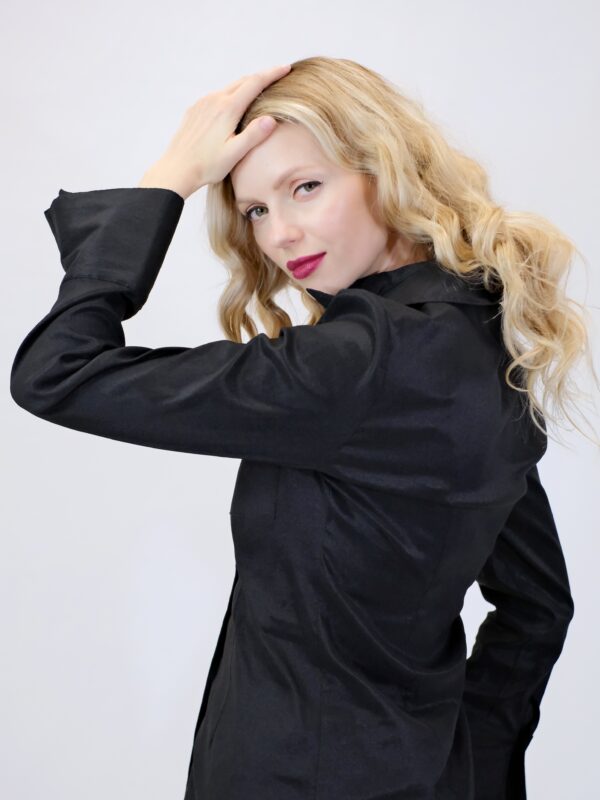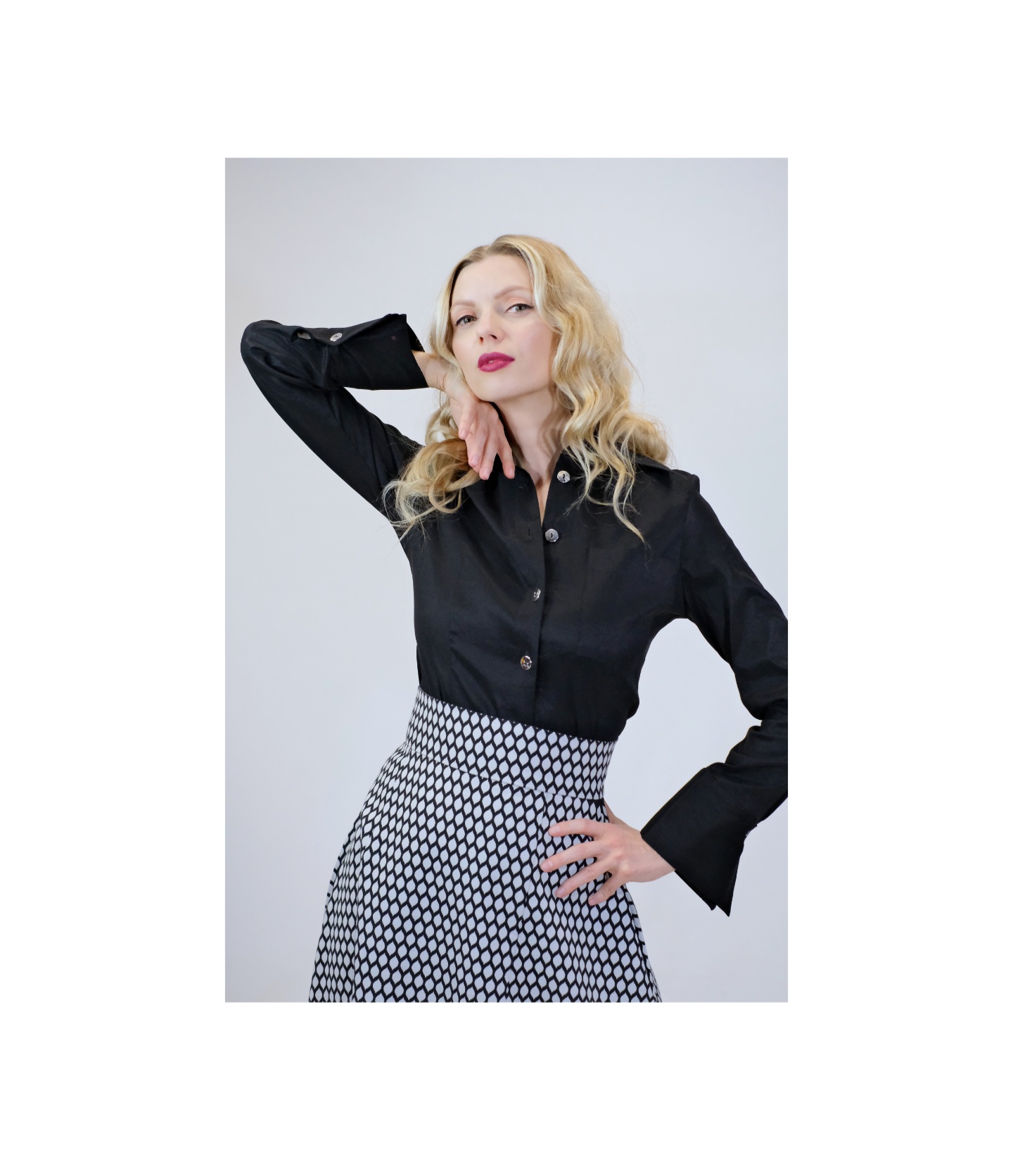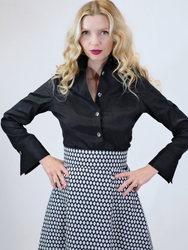 Košeľa je navrhnutá v úzkom strihu s prispôsobivého materiálu, ktorý vám sadne ako druhá koža. Košeľa je ušitá s dôrazom na detaily, čo vidieť na spracovaní manžety, ktorá je inšpirovaná pánskou košeľou. Zaujímavým detailom sú ozdobné strieborné gombíky. Čierna košeľa je základom každého šatníka, aj vďaka jej prispôsobivosti. Môžete ju kombinovať sa úzkymi nohavicami alebo aj ako naša aranžérka s dlhými spoločenskými sukňami.