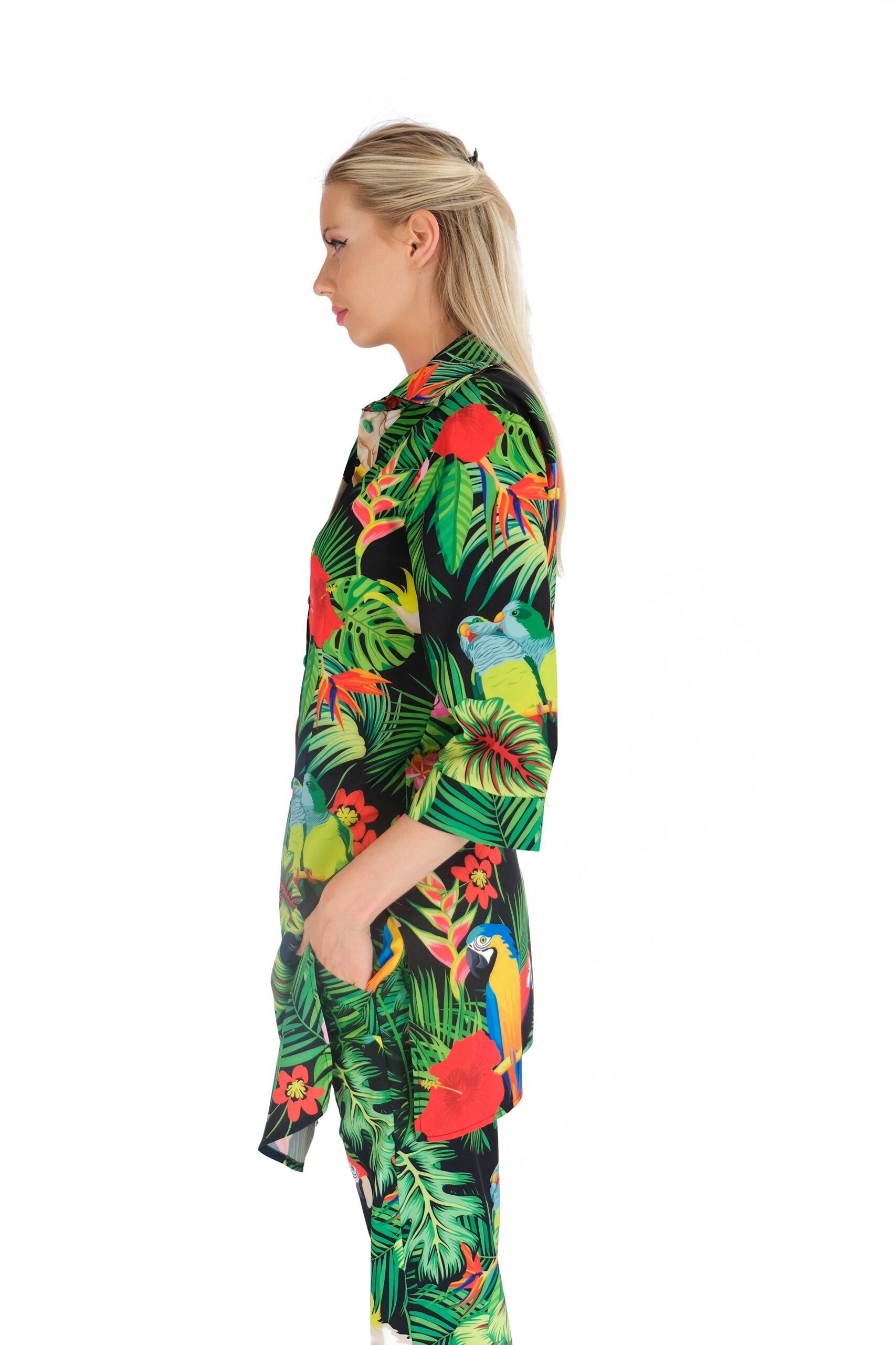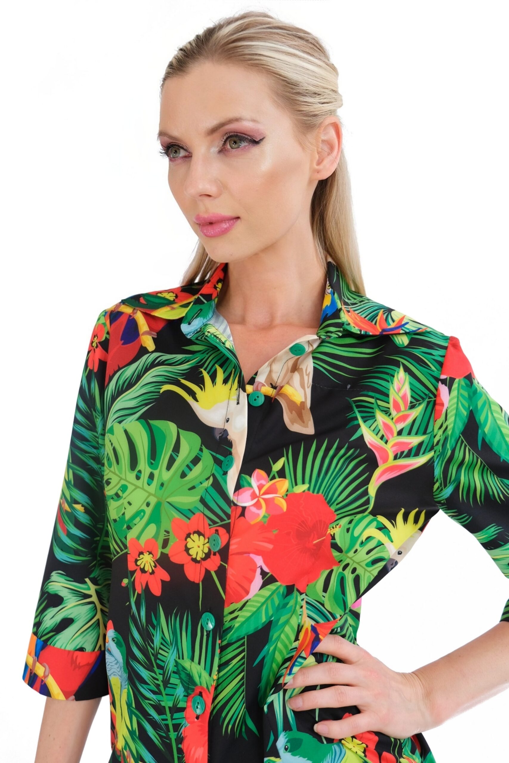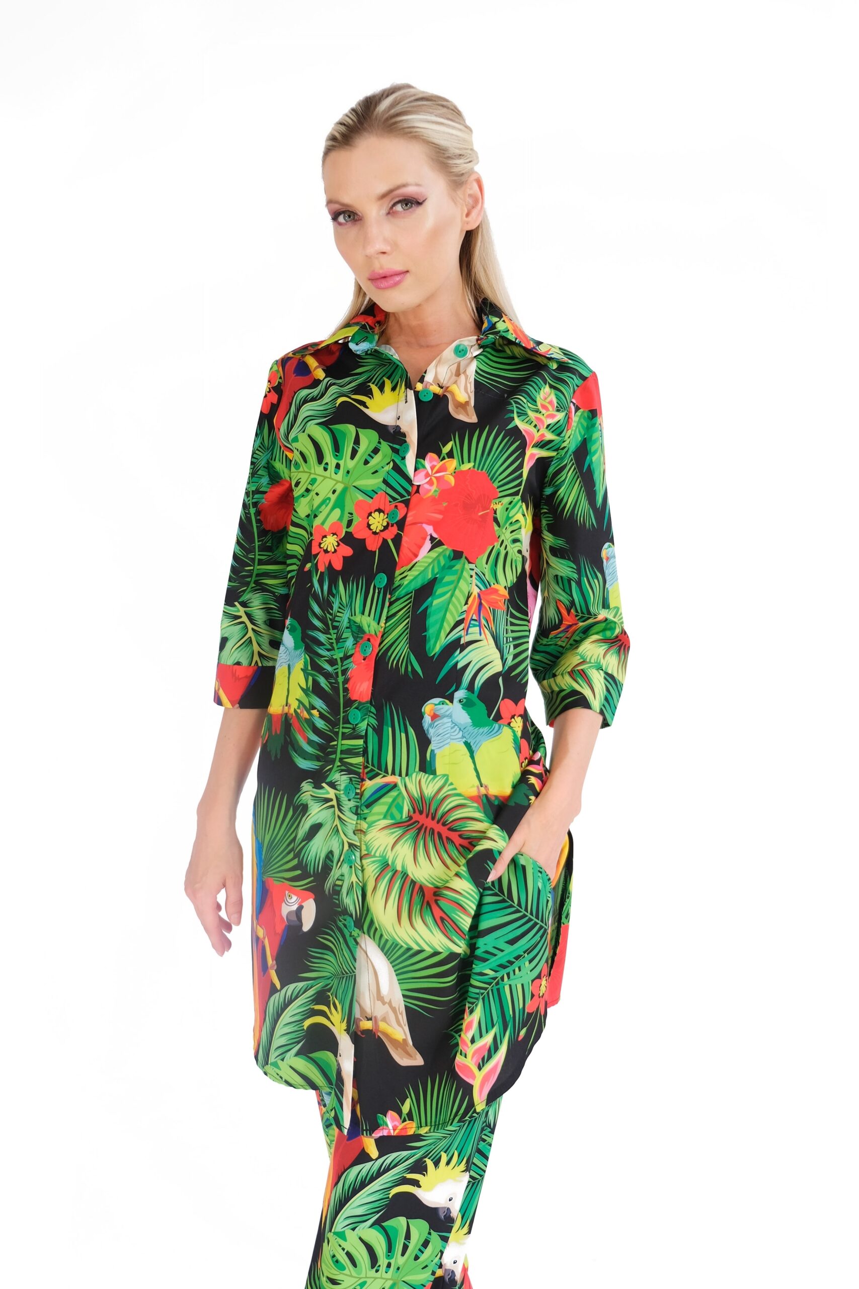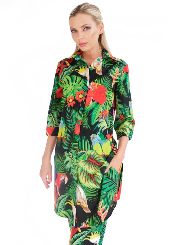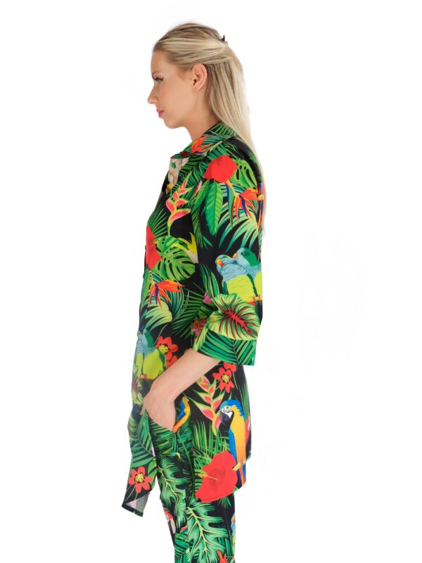 Košeľa je navrhnutá v pohodlnom áčkovom strihu, ktorý výborne sadne na každú postavu. Košeľa má predlžený strih a preto sa výborne kombinuje práve vtedy keď nie je zastrčená ale necháte naplno vyniknúť jej nádhernému vzoru buď na nohaviciach alebo šortkách. Košeľa má veľmi zaujímavý letný vzor v netradičnom prevedení na tmavom podklade. Vzor je inšpirovaný tropickým rajom a dominujú mu papagáji , ktorý hrajú farbami leta ako zelená , modrá, žltá alebo oranžová. Pre wau effekt skombinujte s nohavicami Wild Parrots.