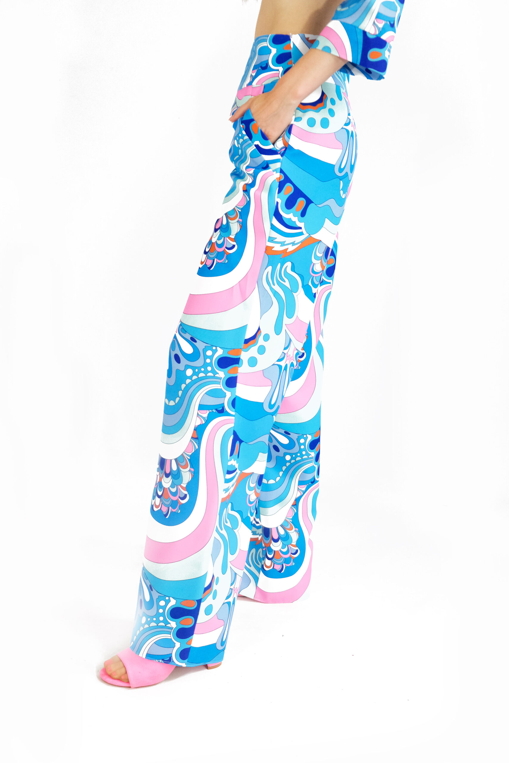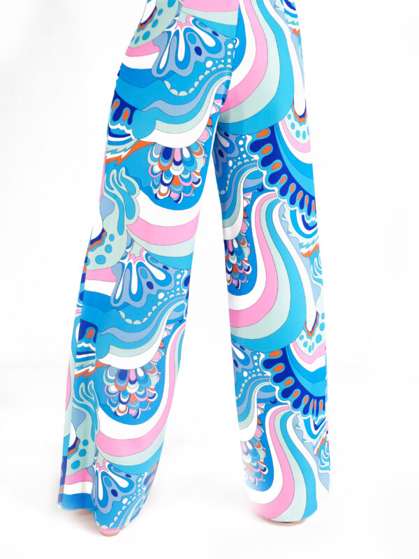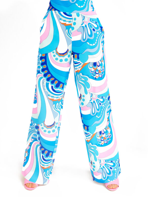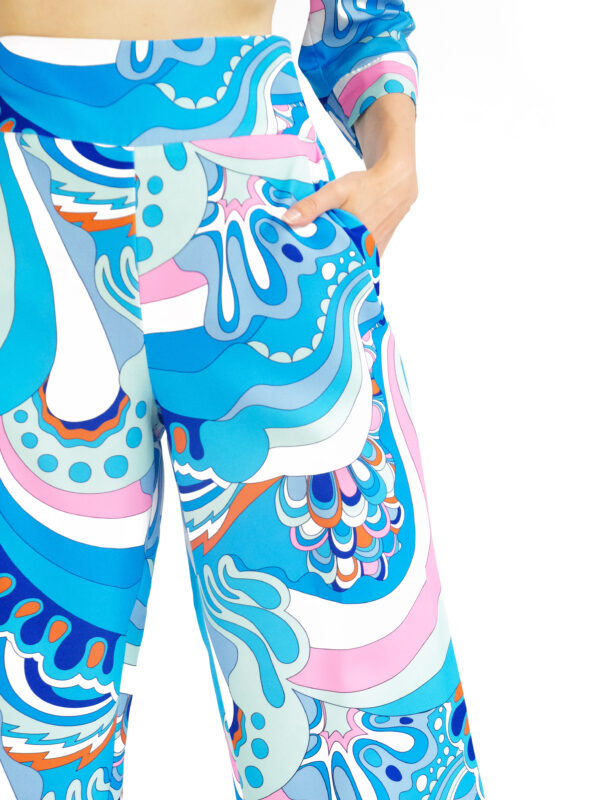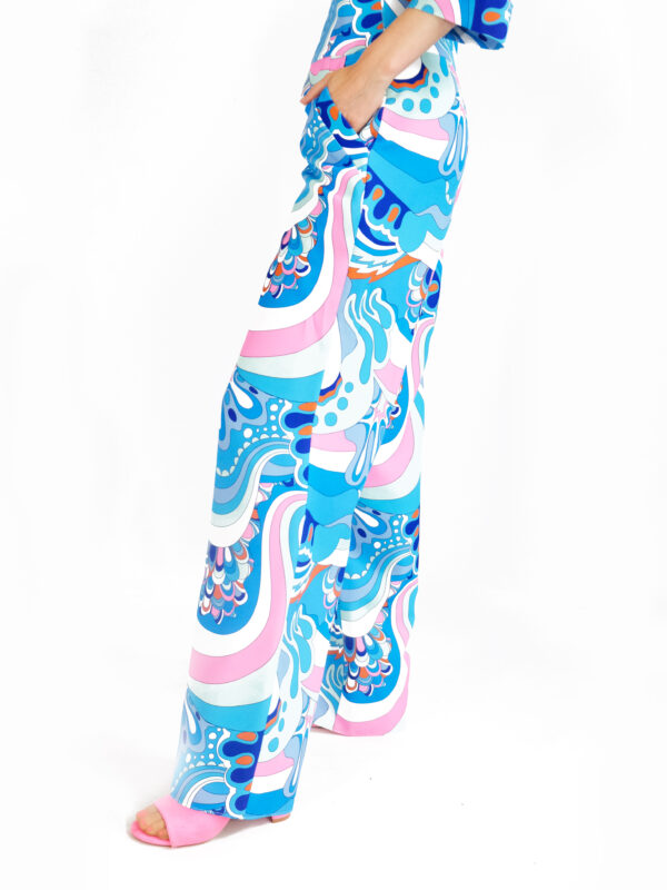 Nohavice sú navrhnuté v pohodlnom širokom strihu, ktorý sa skvele hodí na horúce letné dni. Nohavice majú zvýšený pás, ktorý Vás opticky zúži a pohodlné vrecká. Jednoduchý strih nohavíc necháva naplno vyniknúť krásnemu letnému vzoru , ktorý pripomína rozprávkové nebo, ktoré žiari všetkými letnými farbami. Vzor je kombináciou nebesky modrej, bielej a púdrovo ružovej a ľahko ho doladíte s doplnkami rovnakých farieb. Pre wau effekt skombinujte s košeľou Cloudy Swirls