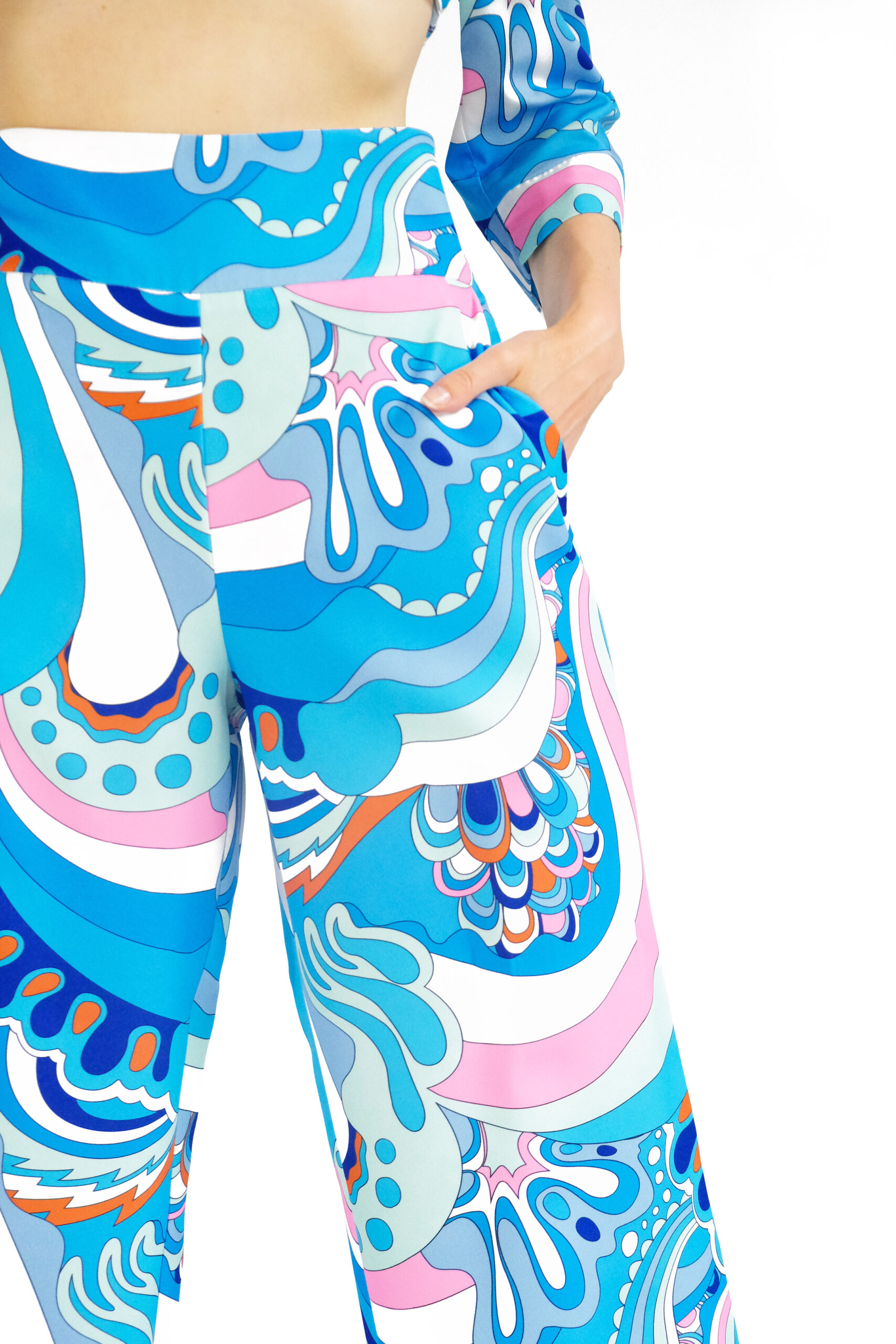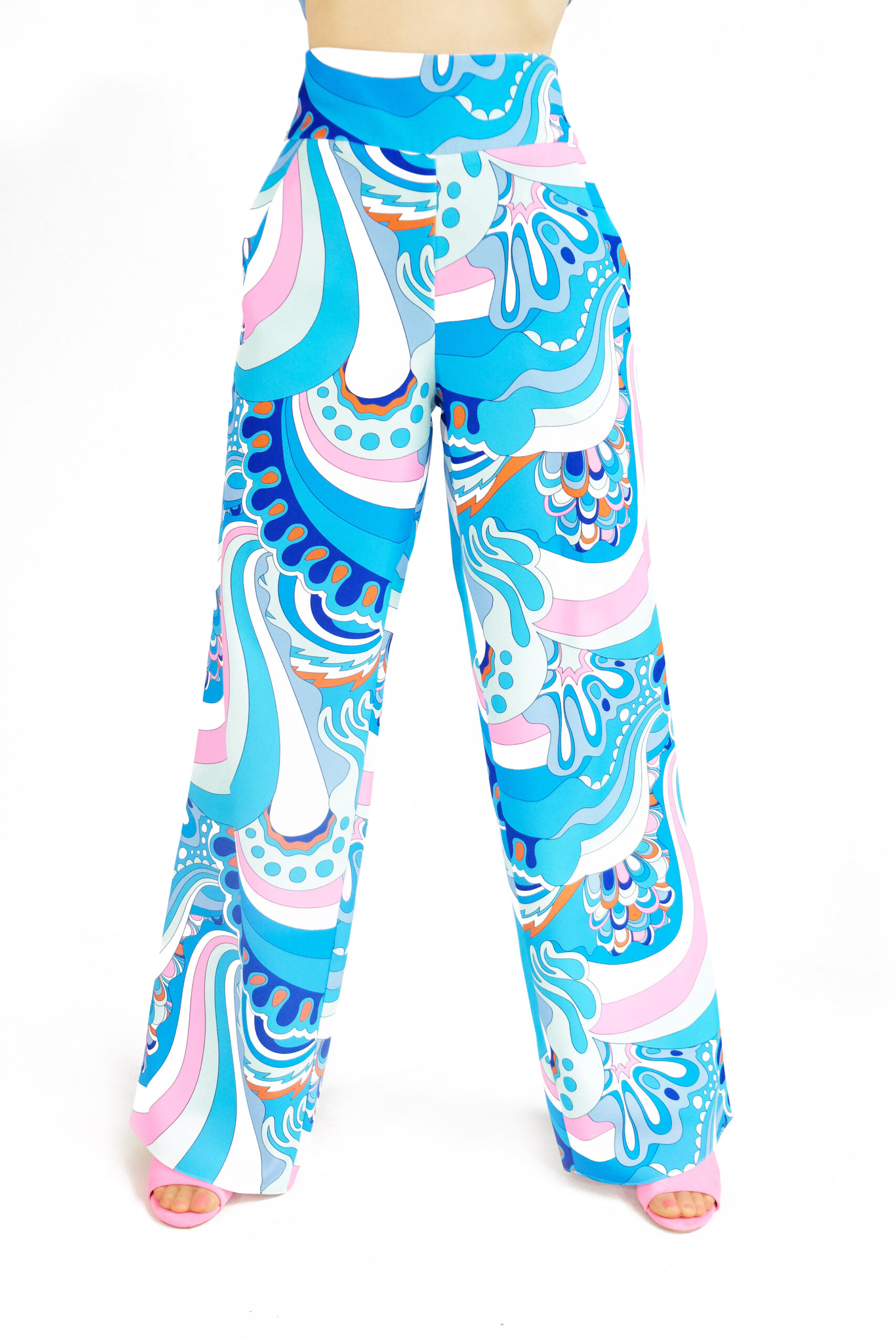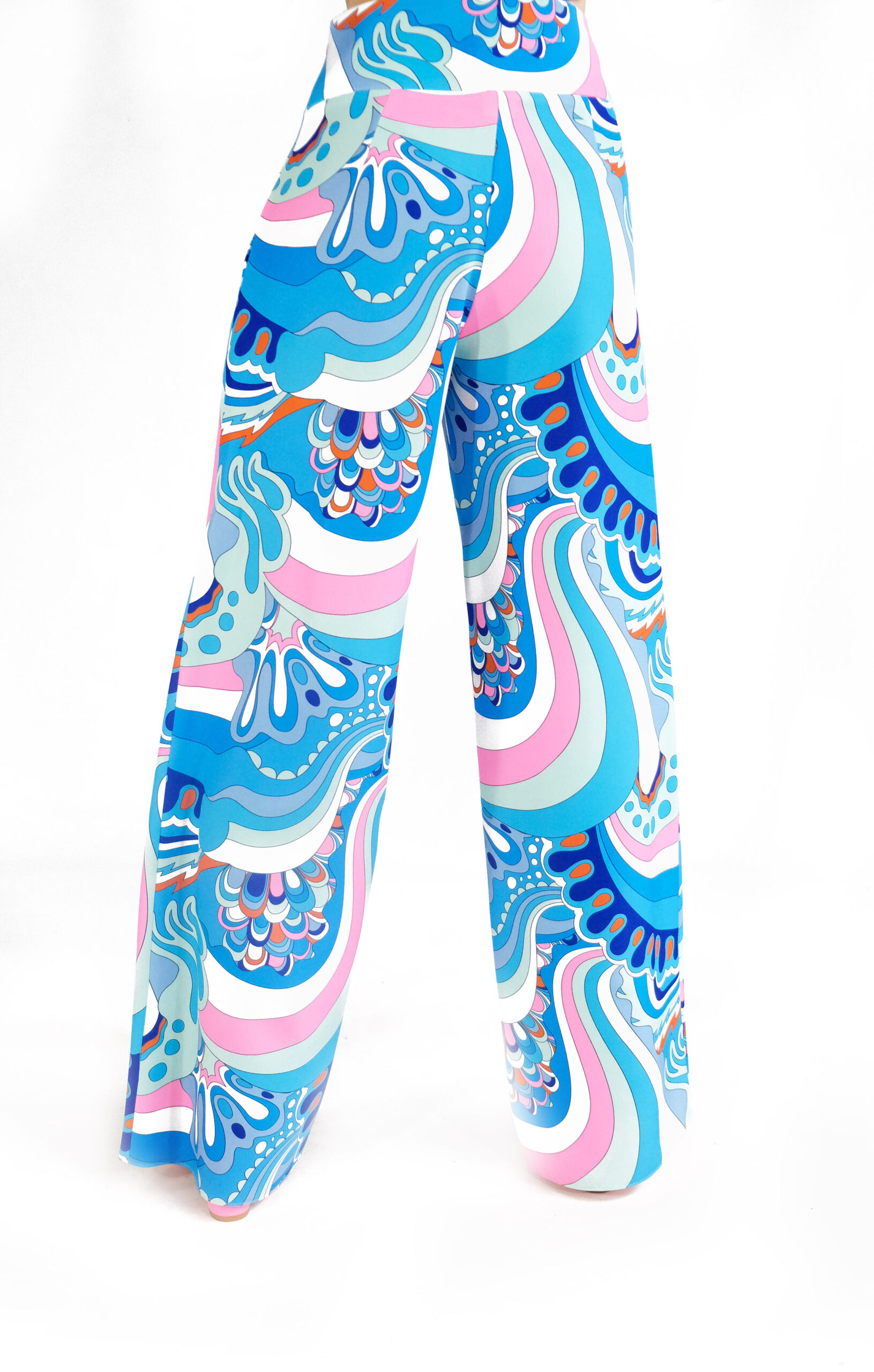 Nohavice sú navrhnuté v pohodlnom širokom strihu, ktorý sa skvele hodí na horúce letné dni. Nohavice majú zvýšený pás, ktorý Vás opticky zúži a pohodlné vrecká. Jednoduchý strih nohavíc necháva naplno vyniknúť krásnemu letnému vzoru , ktorý pripomína rozprávkové nebo, ktoré žiari všetkými letnými farbami. Vzor je kombináciou nebesky modrej, bielej a púdrovo ružovej a ľahko ho doladíte s doplnkami rovnakých farieb. Pre wau effekt skombinujte s košeľou Cloudy Swirls