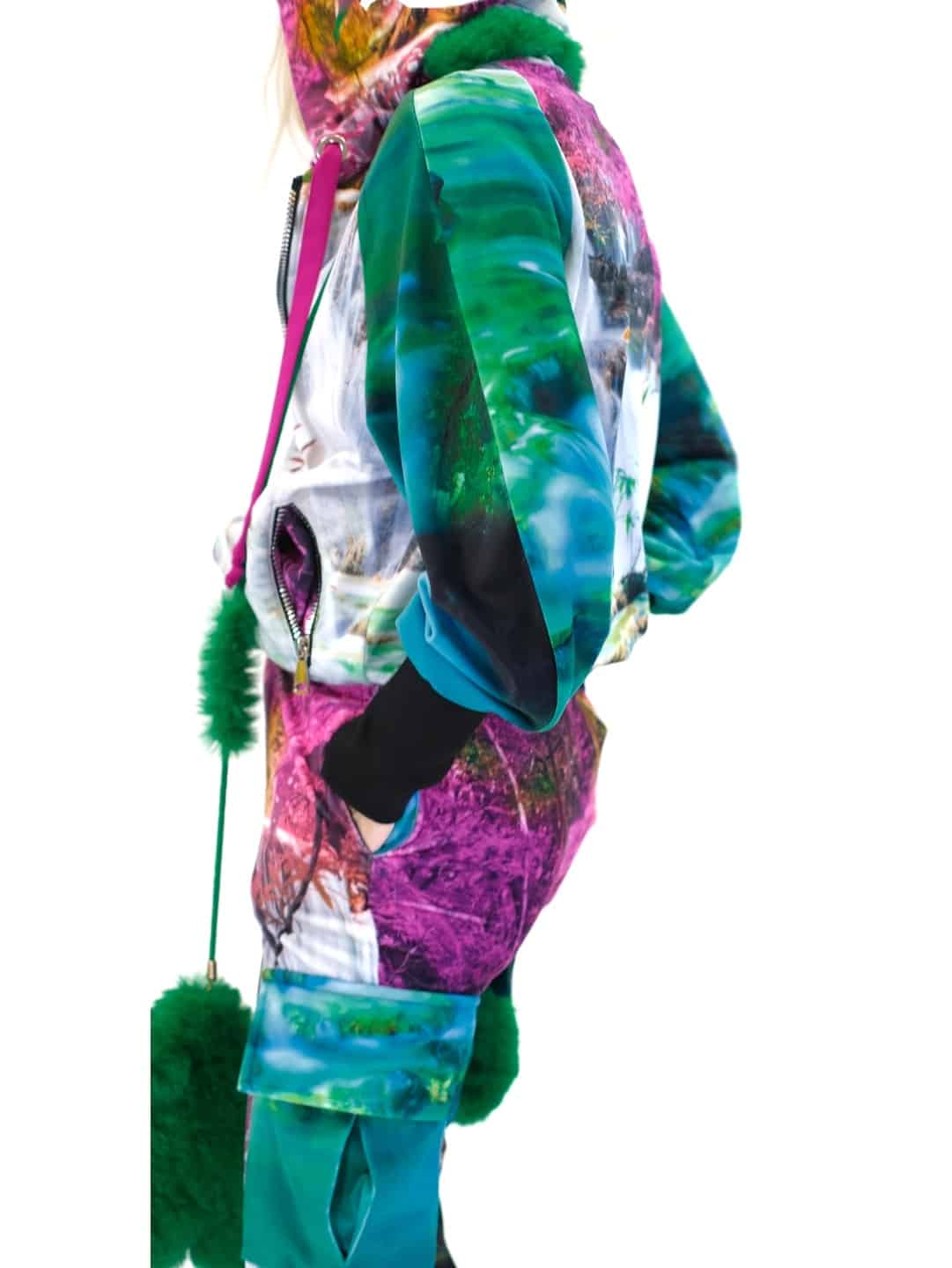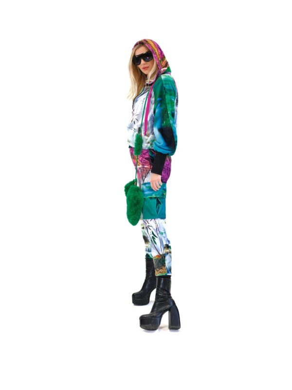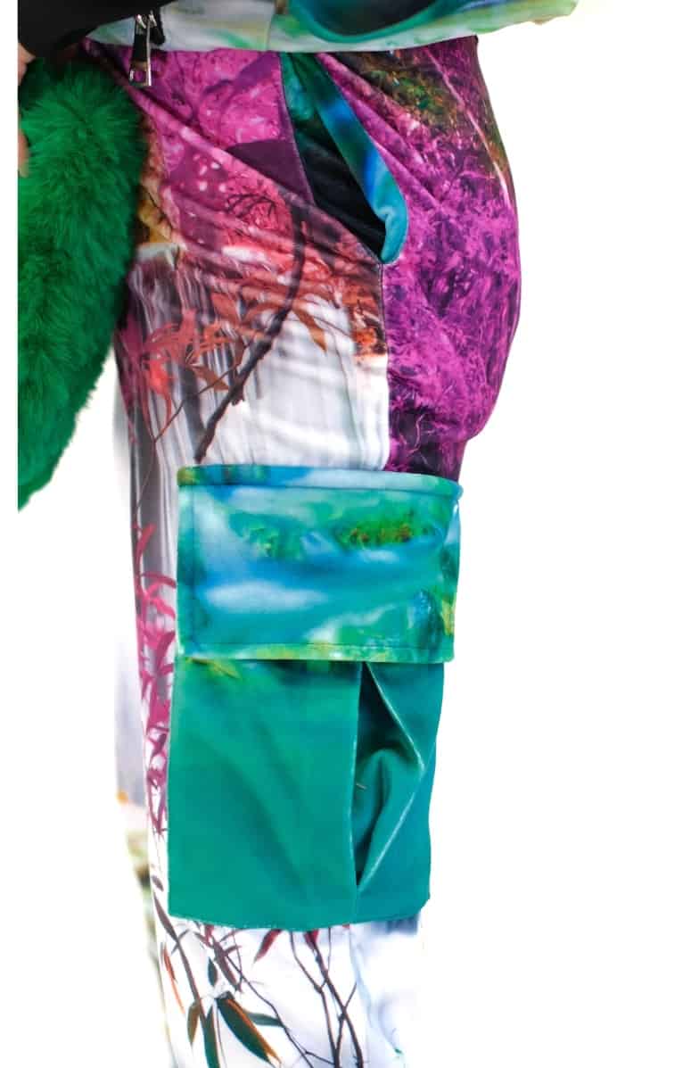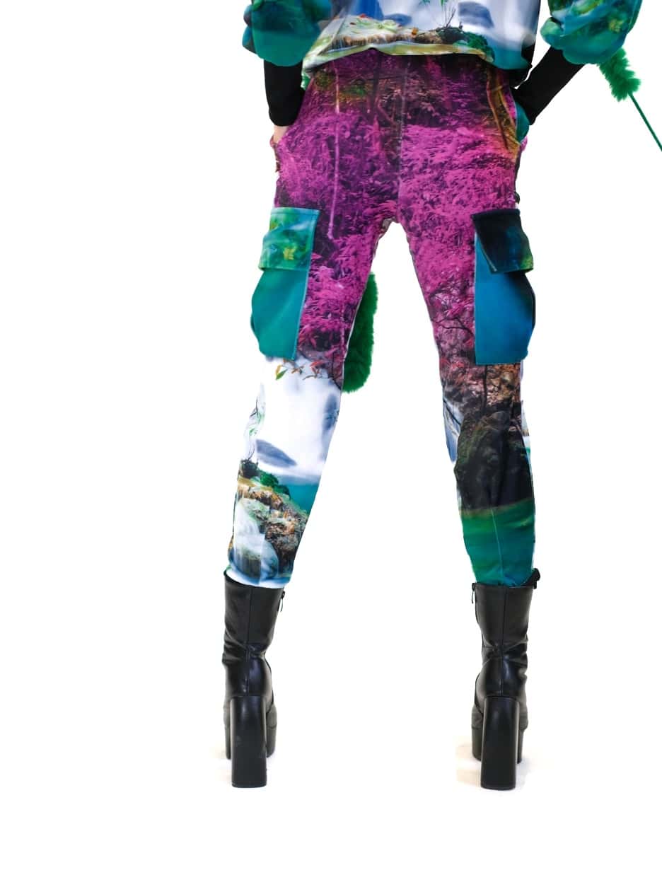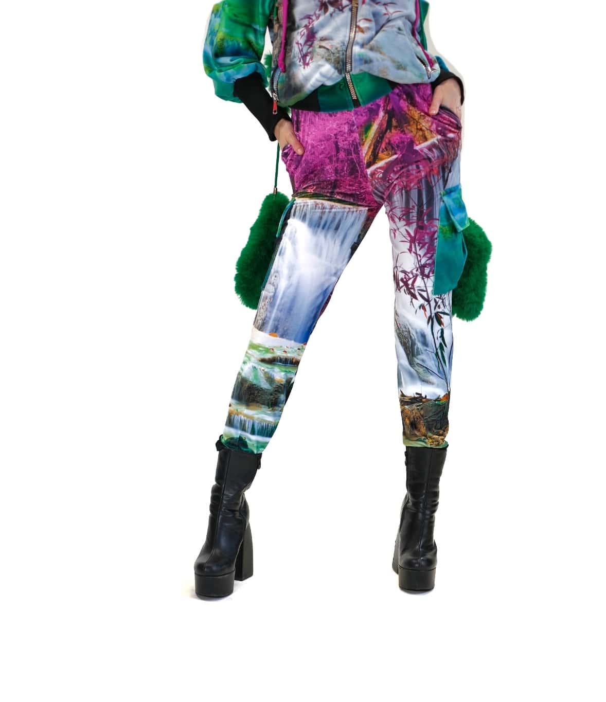 Nohavice sú ušité v pohodlnom strihu, ktorý výborne sadne na každý typ postavy. Nohavice sú navrhnuté s ležérnosťou a komfortom v mysli, a preto majú zvýšený pás a sú ušité z teplého a príjemného materiálu, ktorý Vás zahreje počas chladných dní. Nohaviciam dodáva športový nádych výrazné vrecko na boku. Nohavice majú výnimočný vzor, ktorý kombinuje dve farby tejto sezóny cyklámenovú a zelenú v unikátnom spojení. Vzor má orientálny nádych a zachytáva vodopád počas kvitnutia sakury. Skombinujte s bomberou waterfall pre kompletný look.
