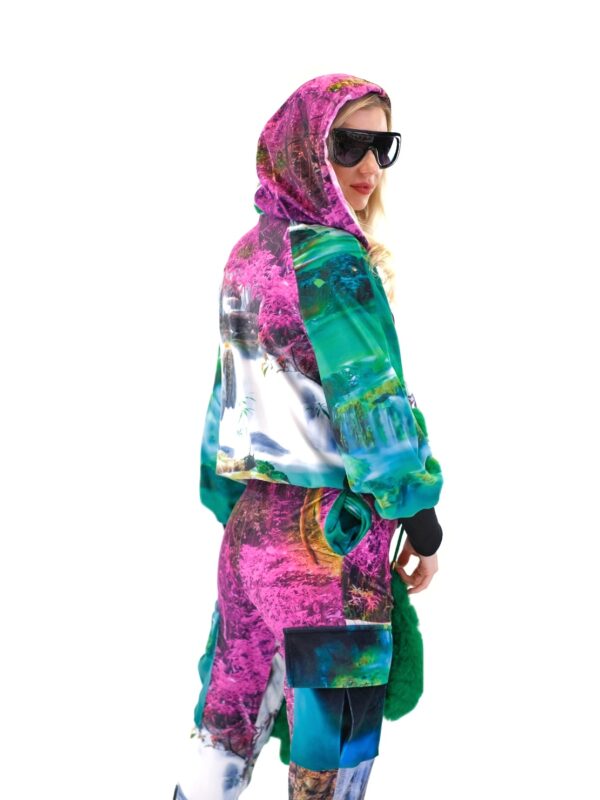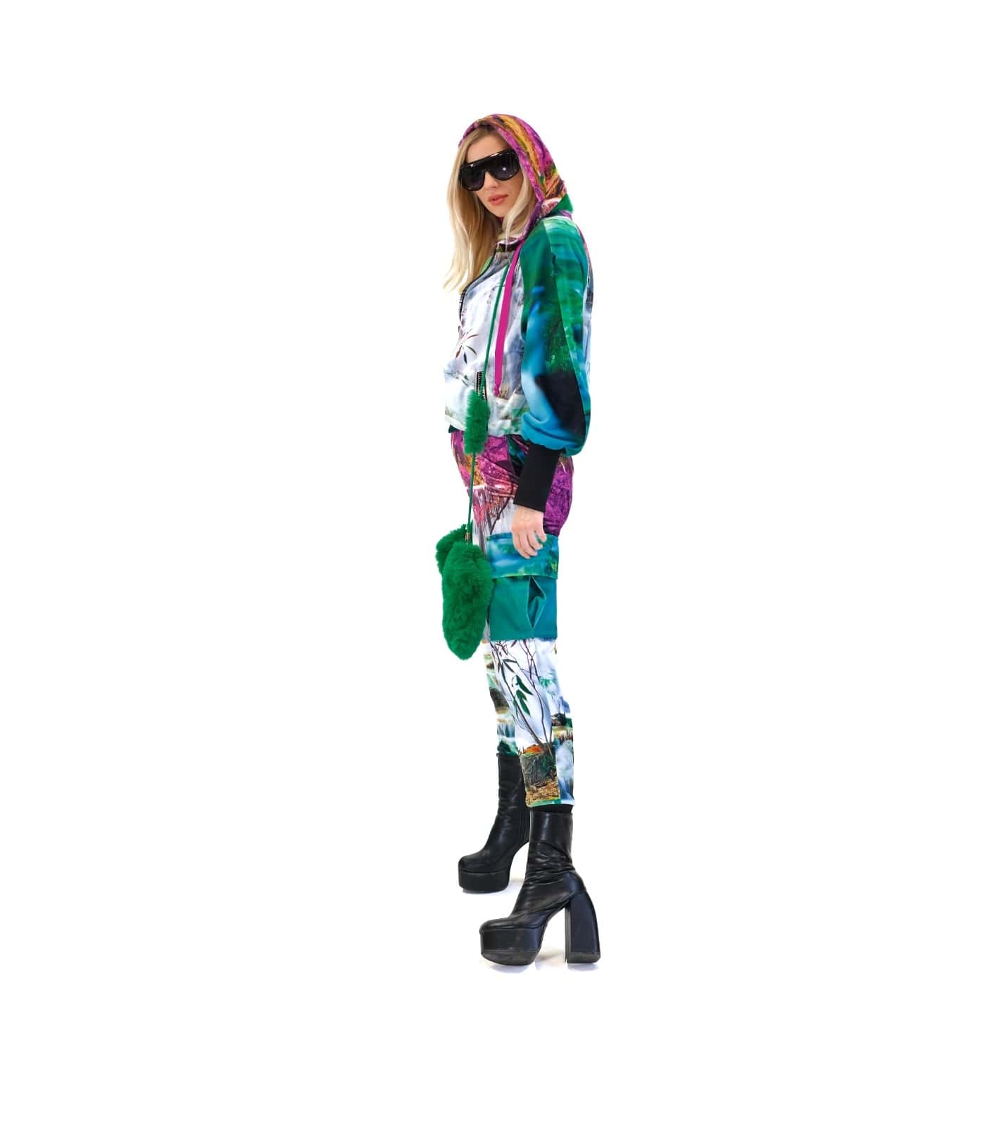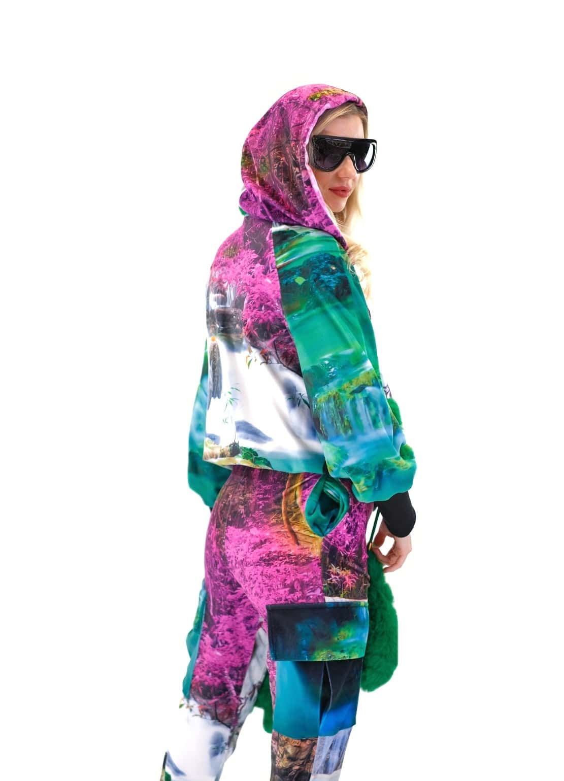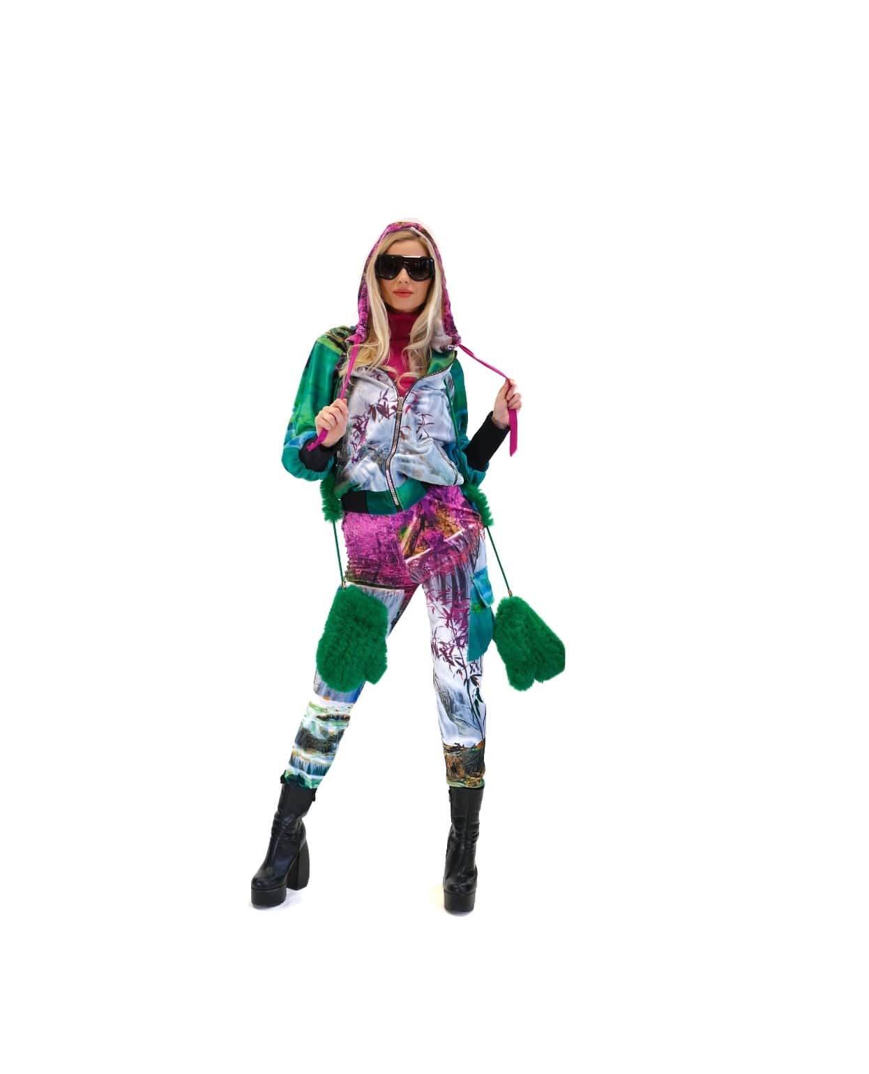 Nohavice sú ušité v pohodlnom strihu, ktorý výborne sadne na každý typ postavy. Nohavice sú navrhnuté s ležérnosťou a komfortom v mysli, a preto majú zvýšený pás a sú ušité z teplého a príjemného materiálu, ktorý Vás zahreje počas chladných dní. Nohaviciam dodáva športový nádych výrazné vrecko na boku. Nohavice majú výnimočný vzor, ktorý kombinuje dve farby tejto sezóny cyklámenovú a zelenú v unikátnom spojení. Vzor má orientálny nádych a zachytáva vodopád počas kvitnutia sakury. Skombinujte s bomberou waterfall pre kompletný look.