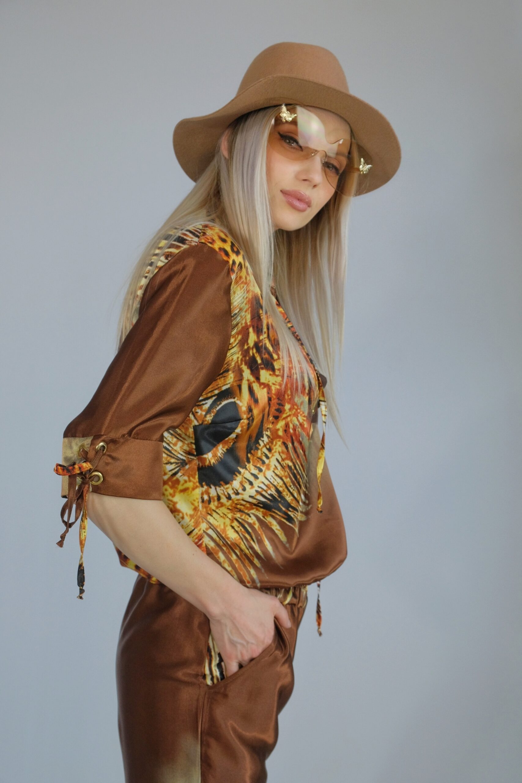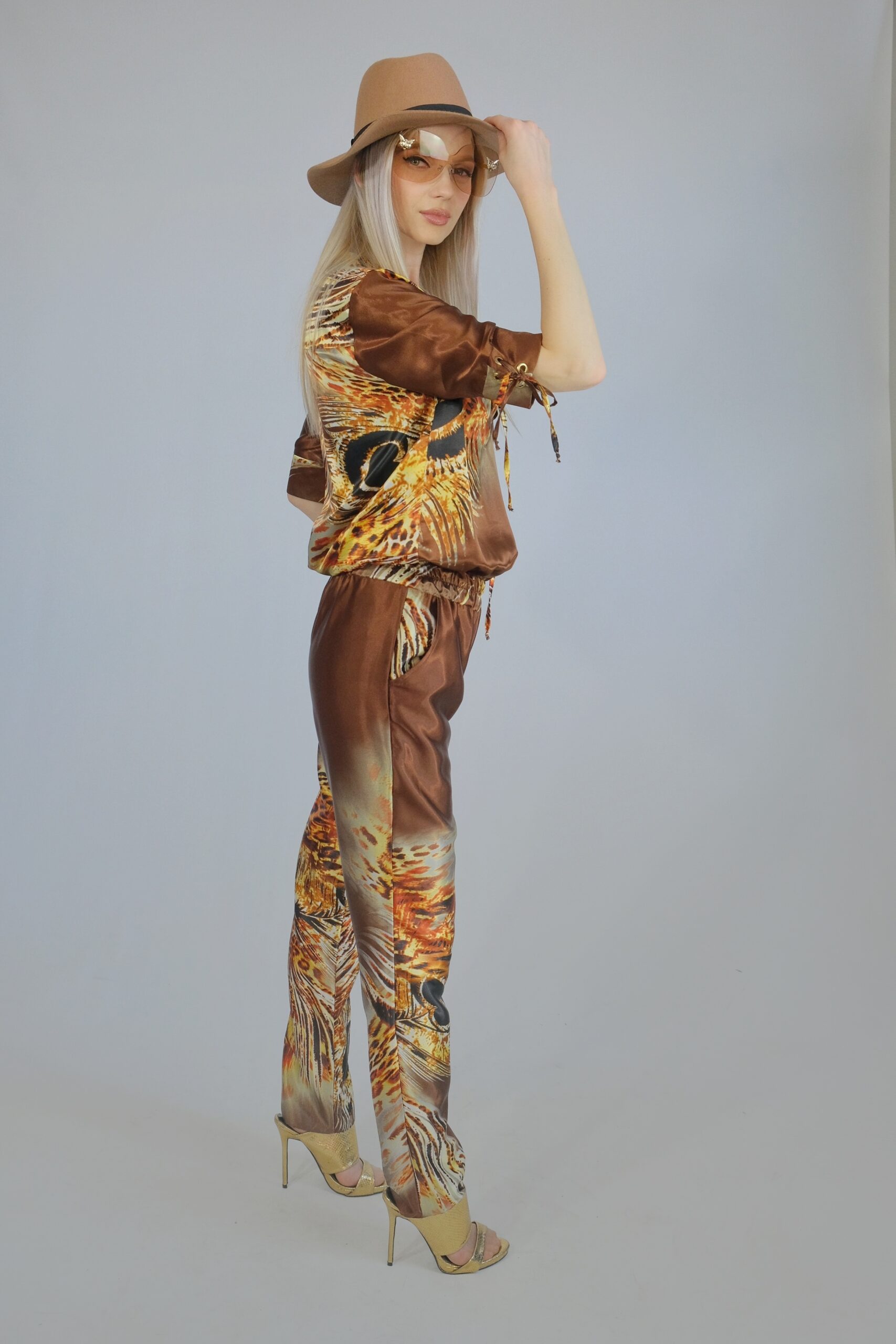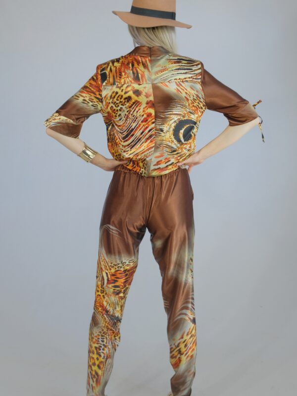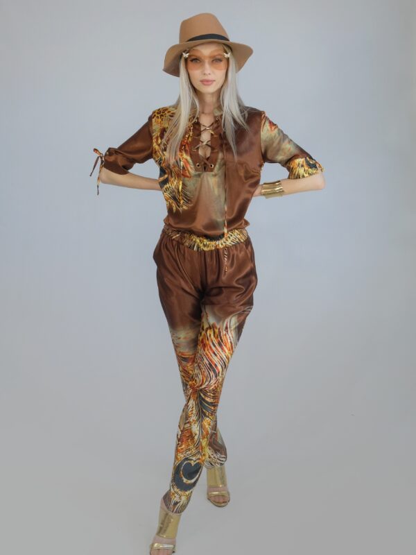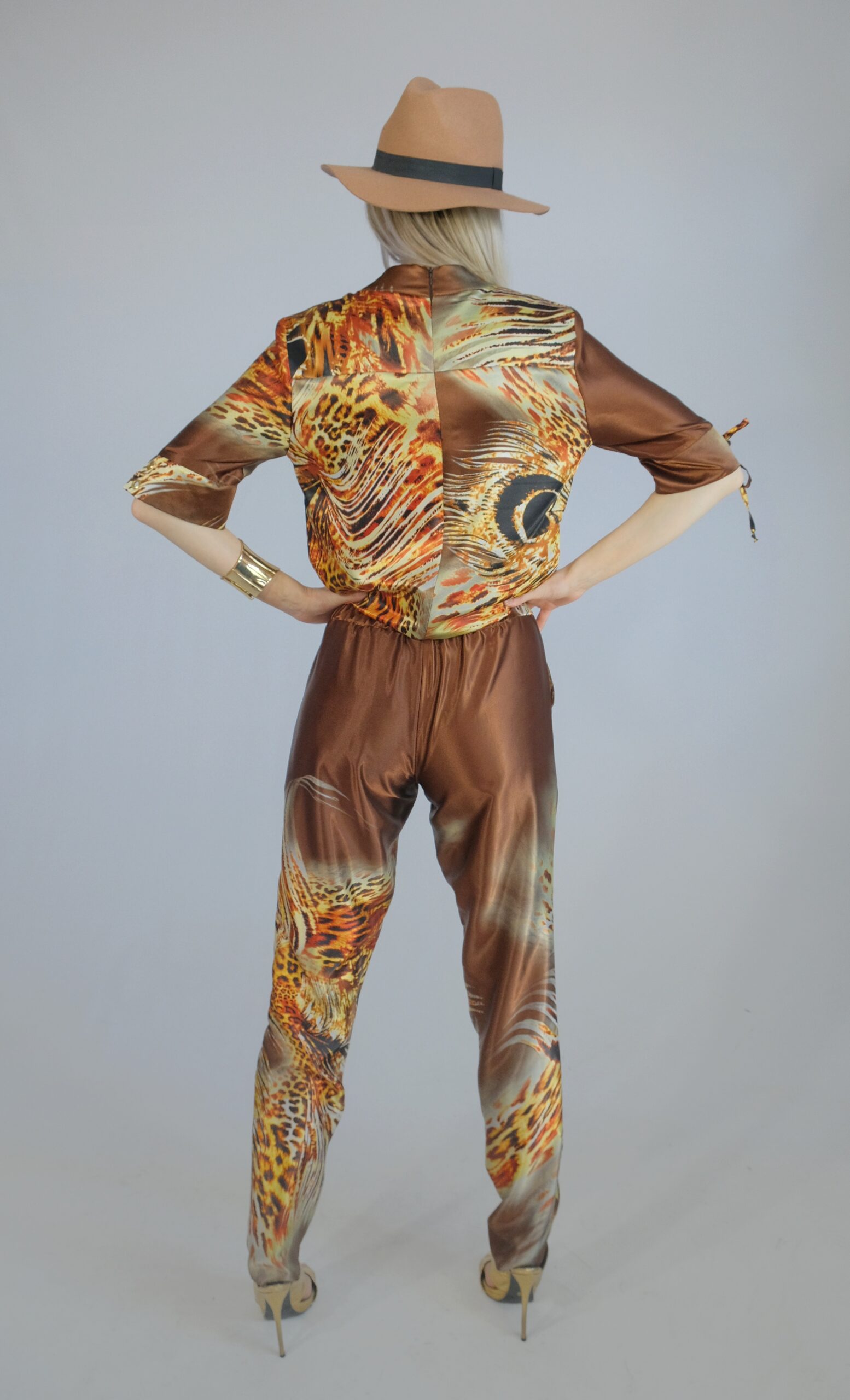 Overal ušitý v lesklom kĺzavom a veľmi pohodlnom saténe. Overal je navrhnutý v zemitých tónoch, ktoré skvele vyniknú v kombinácii s výrazným zvieracím motívom. Overal je stelesnením pohodlia a keď si ho raz dáte na seba, tak už sa s ním nerozlúčite.