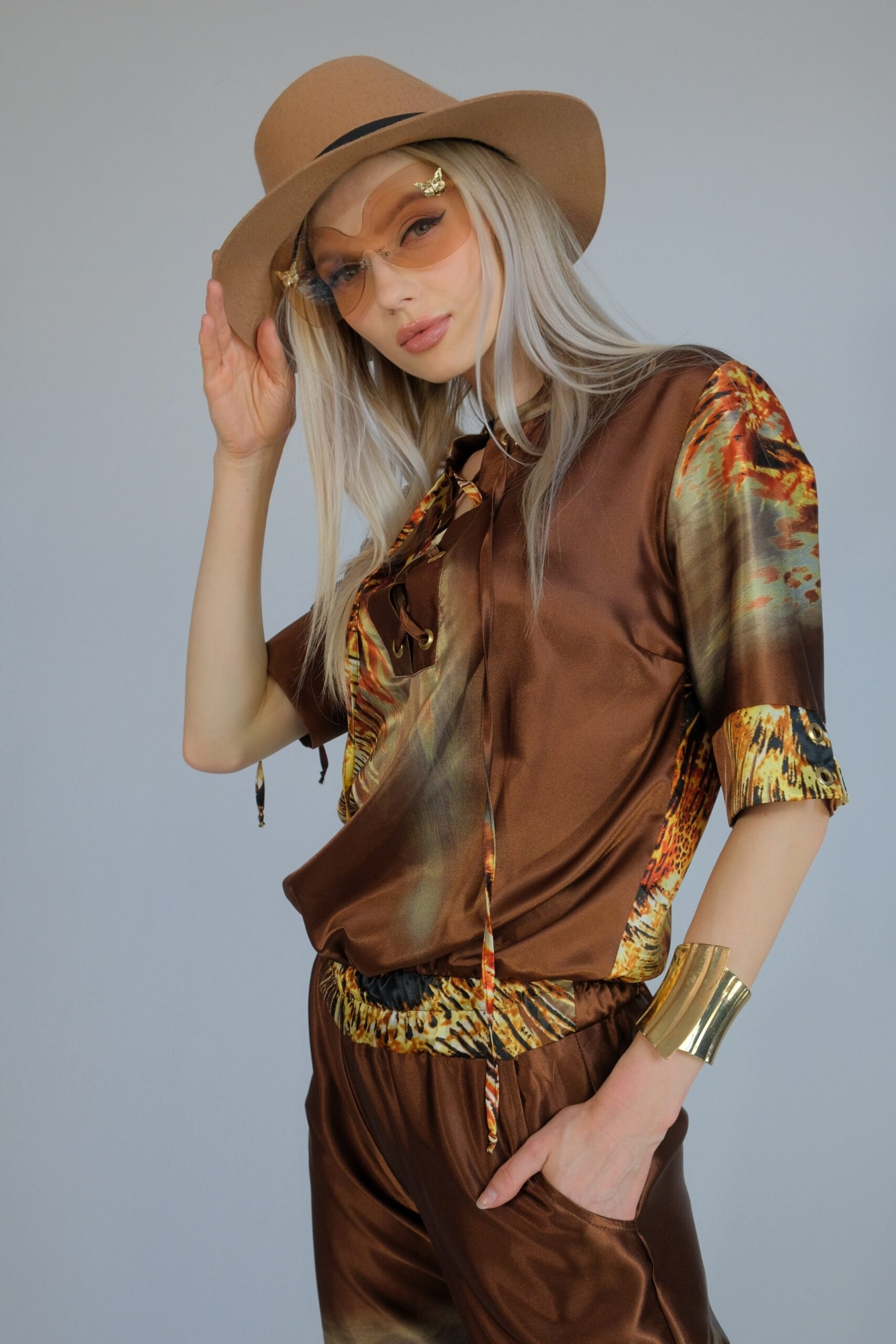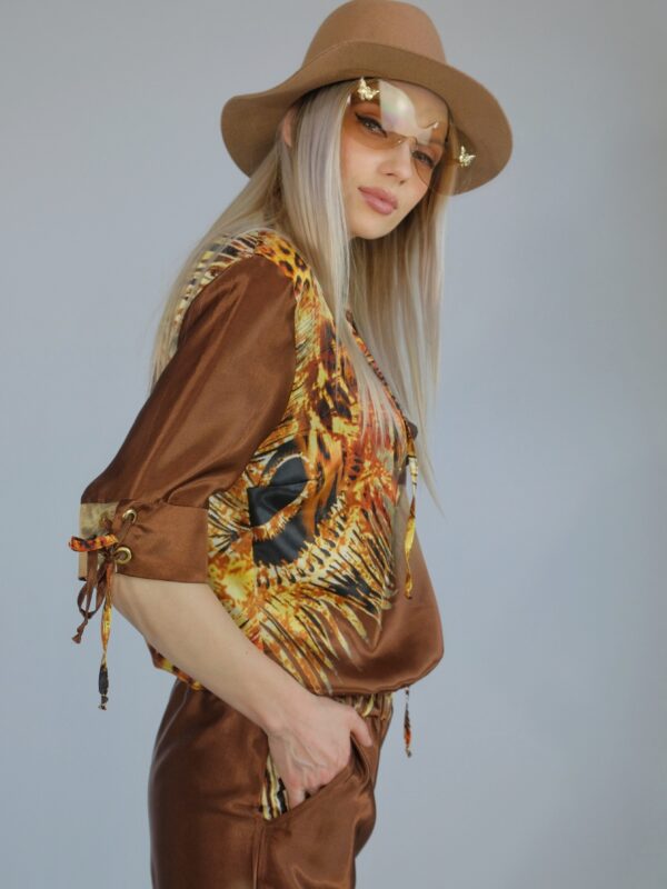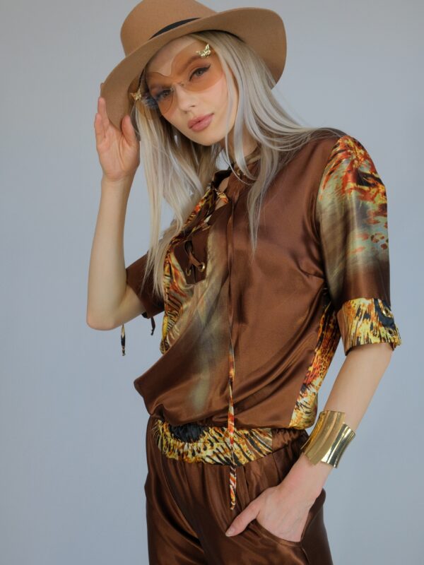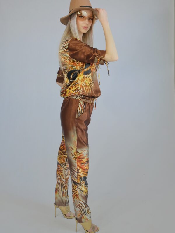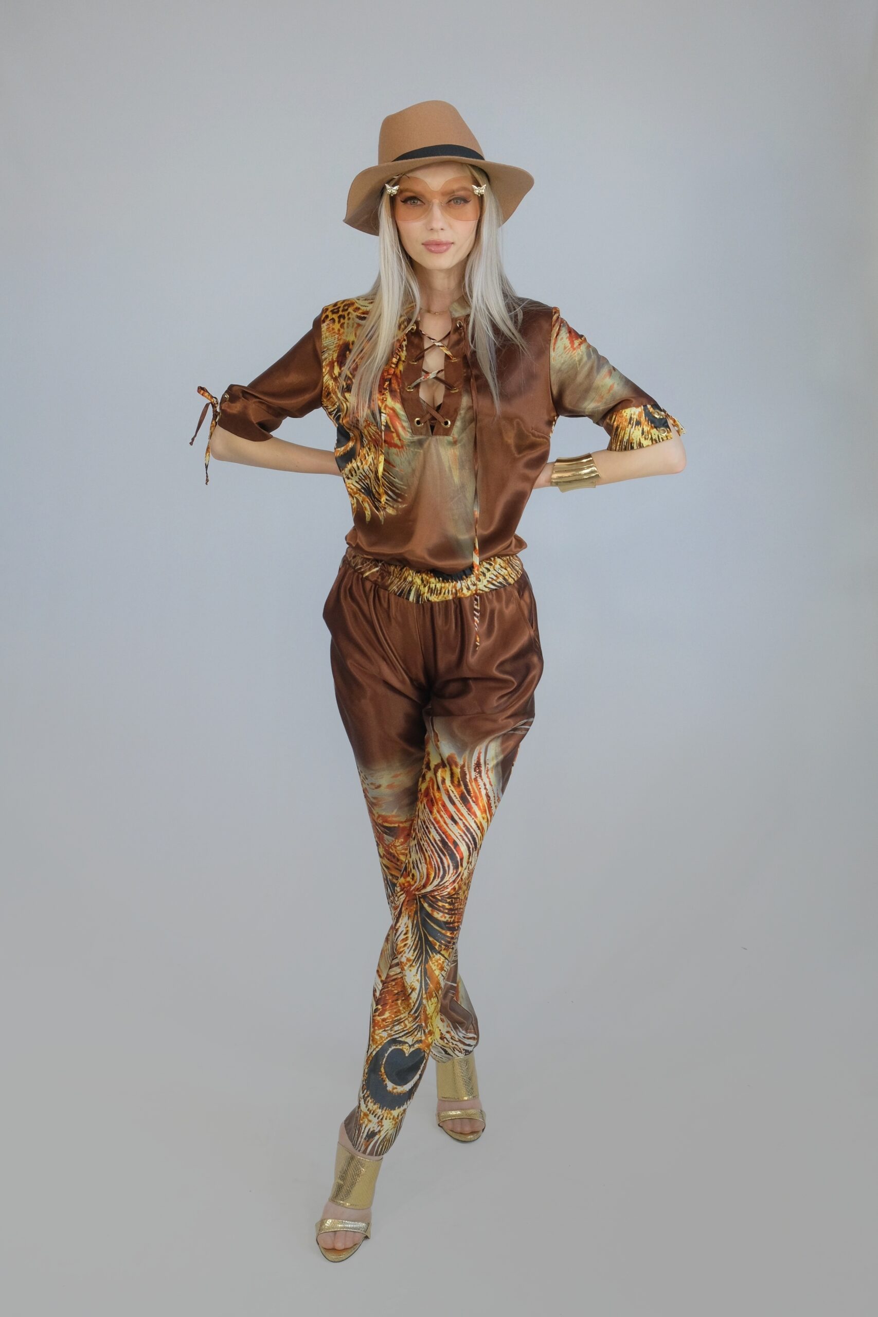Overal ušitý v lesklom kĺzavom a veľmi pohodlnom saténe. Overal je navrhnutý v zemitých tónoch, ktoré skvele vyniknú v kombinácii s výrazným zvieracím motívom. Overal je stelesnením pohodlia a keď si ho raz dáte na seba, tak už sa s ním nerozlúčite.
