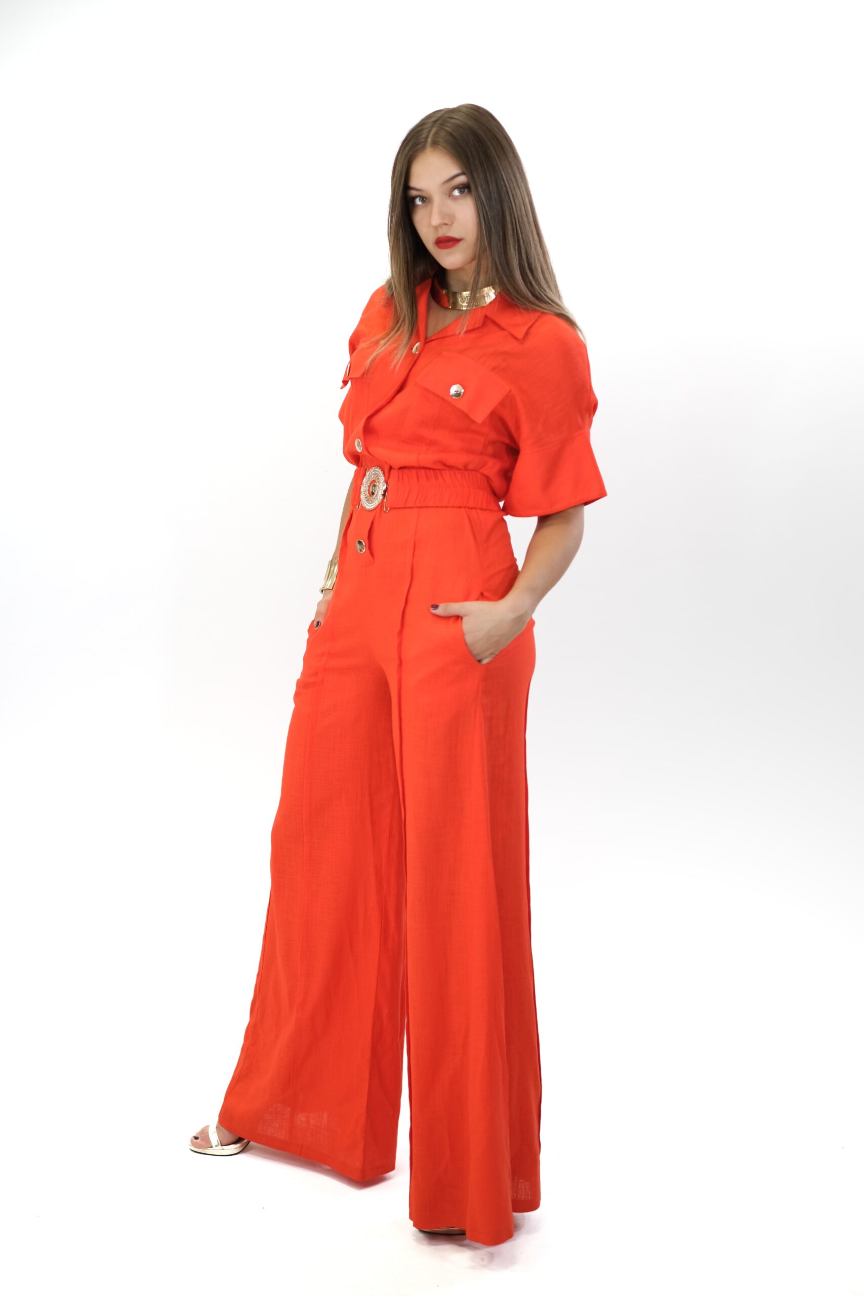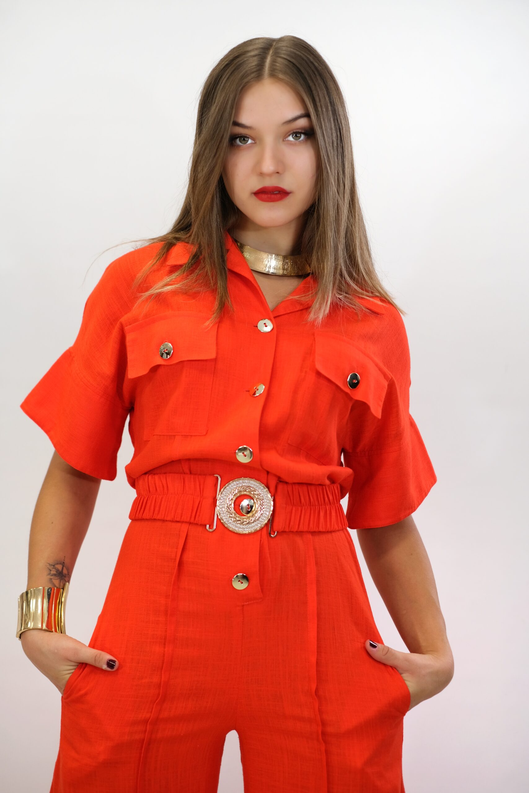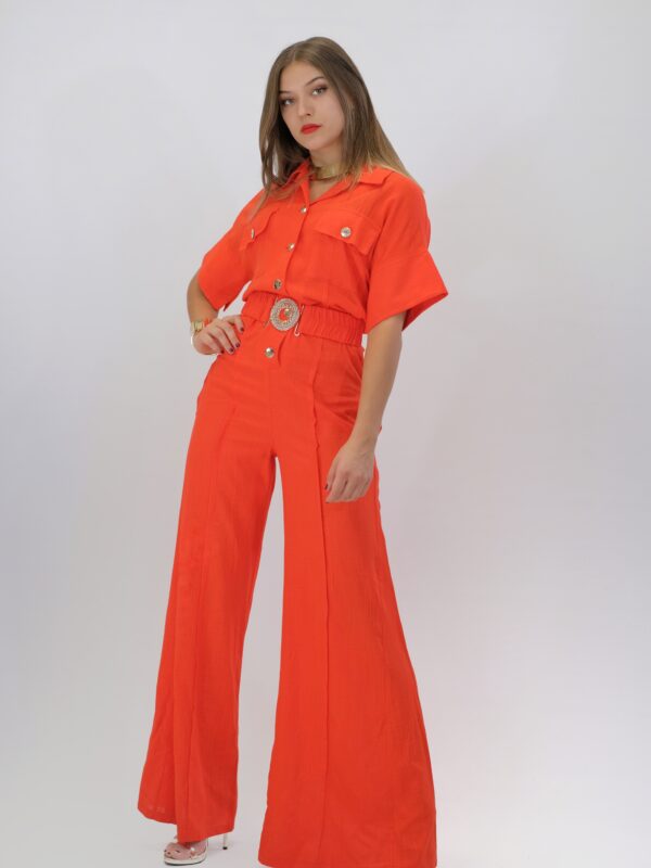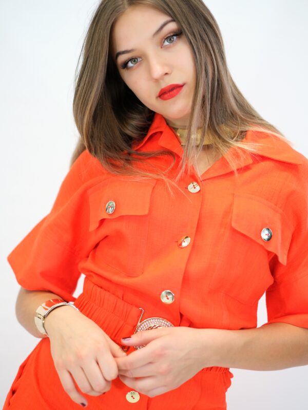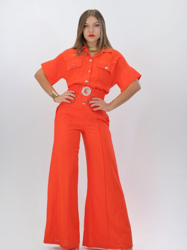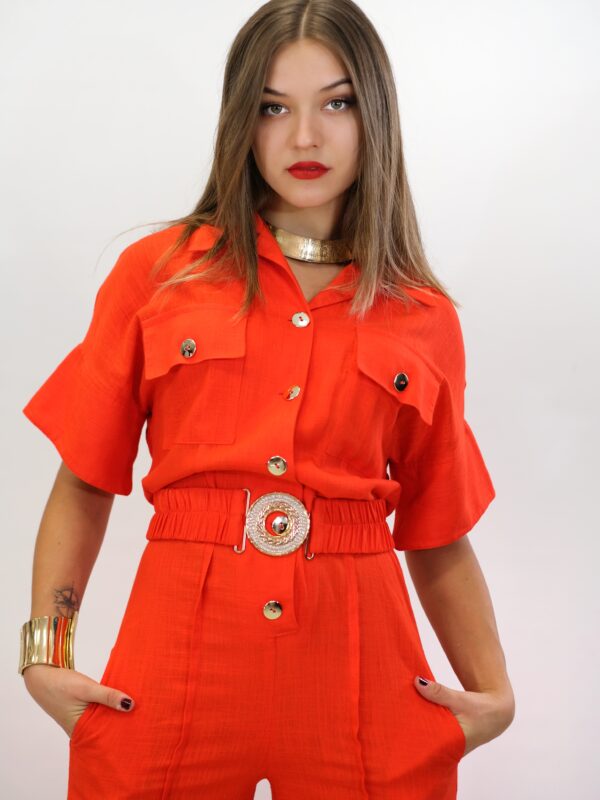 Overal navrhnutý pre Váš maximálny komfort z pohodlnej dýchateľnej látky, ktorá Vám zaručí komfort aj počas náročného dňa. Vrchná čast overálu si berie inšpiráciu z pánskeho šatníka, keďže je spracovaná na košeľový štýl . Ležérnosť podčiarkujú vrecká našité v oblasti hrudníka. Overal má aj opasok z rovnakej látky s ozdobnou sponou. Overál ma funkčné vrecká. Overal je ušitý vo výraznej oranžovej a skvele zapadne do Vášho šatníka, keď budte chcieť vyzerať chic, ale ležérne.