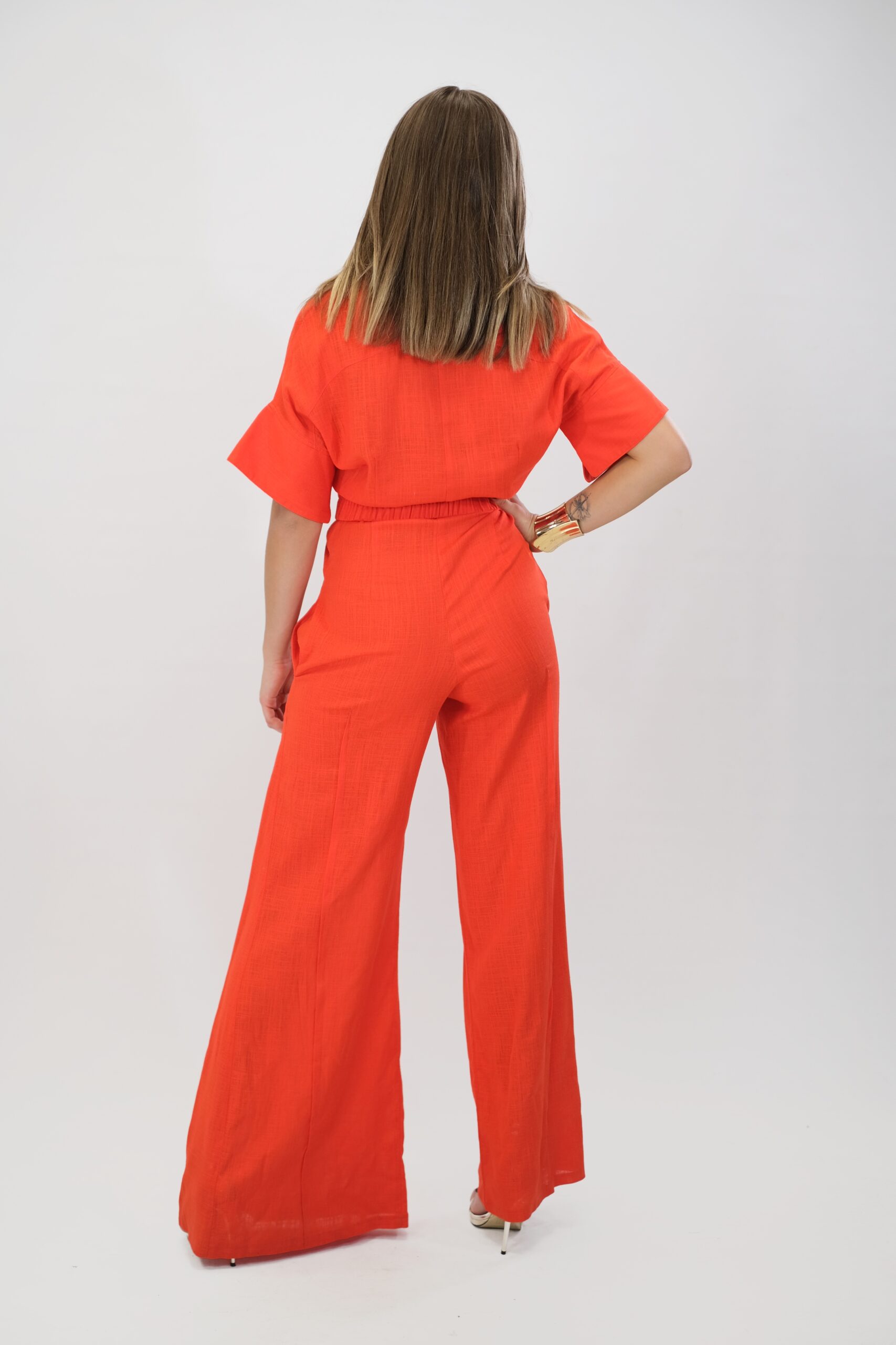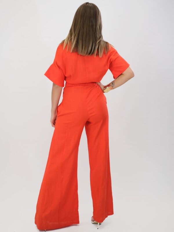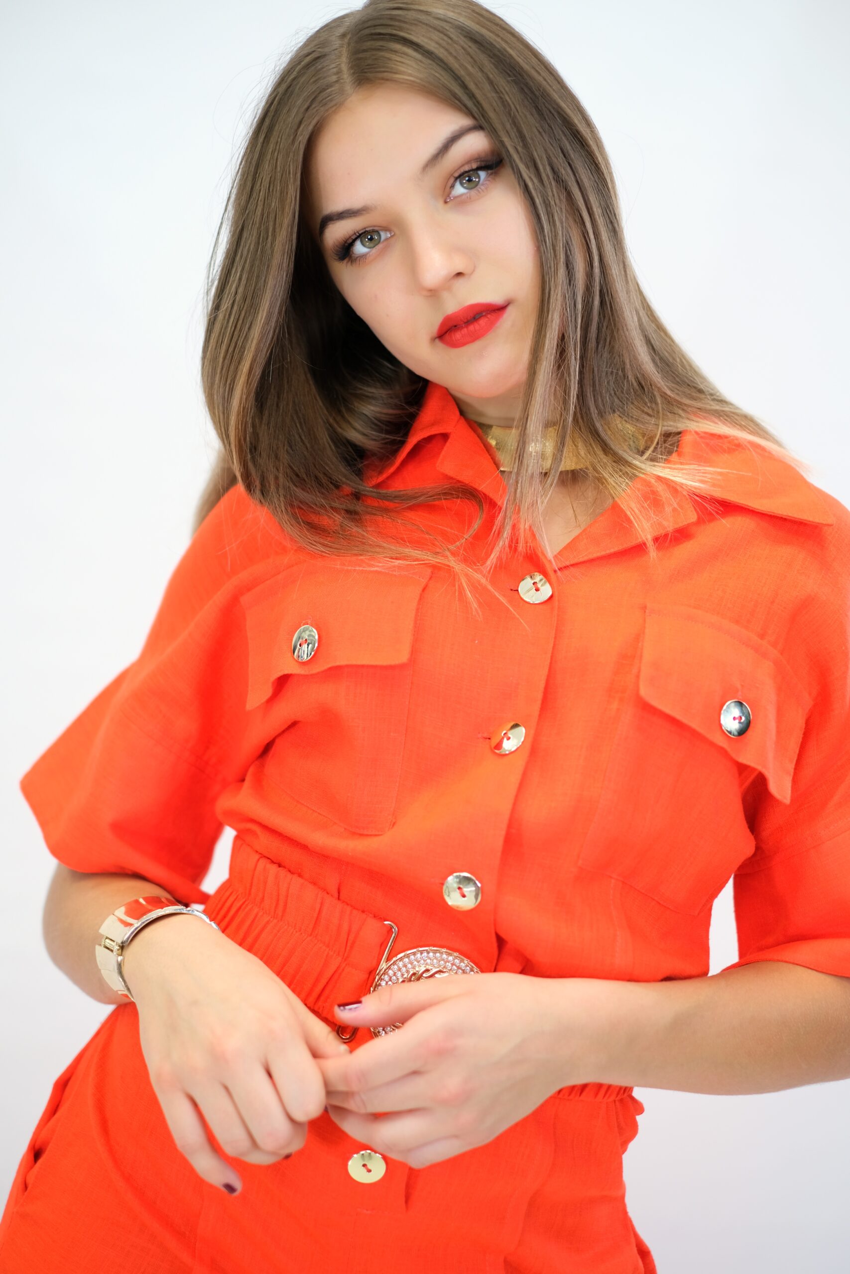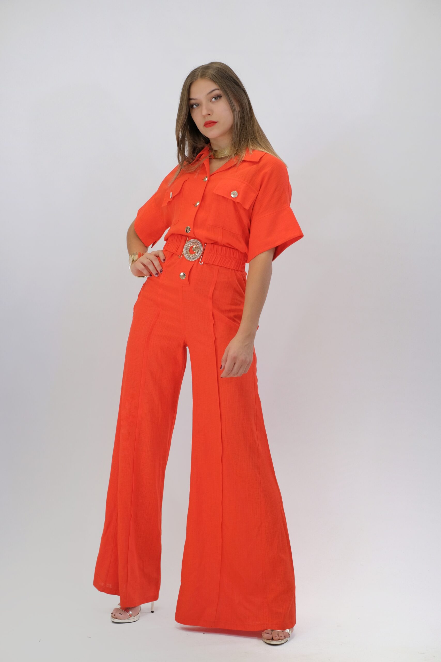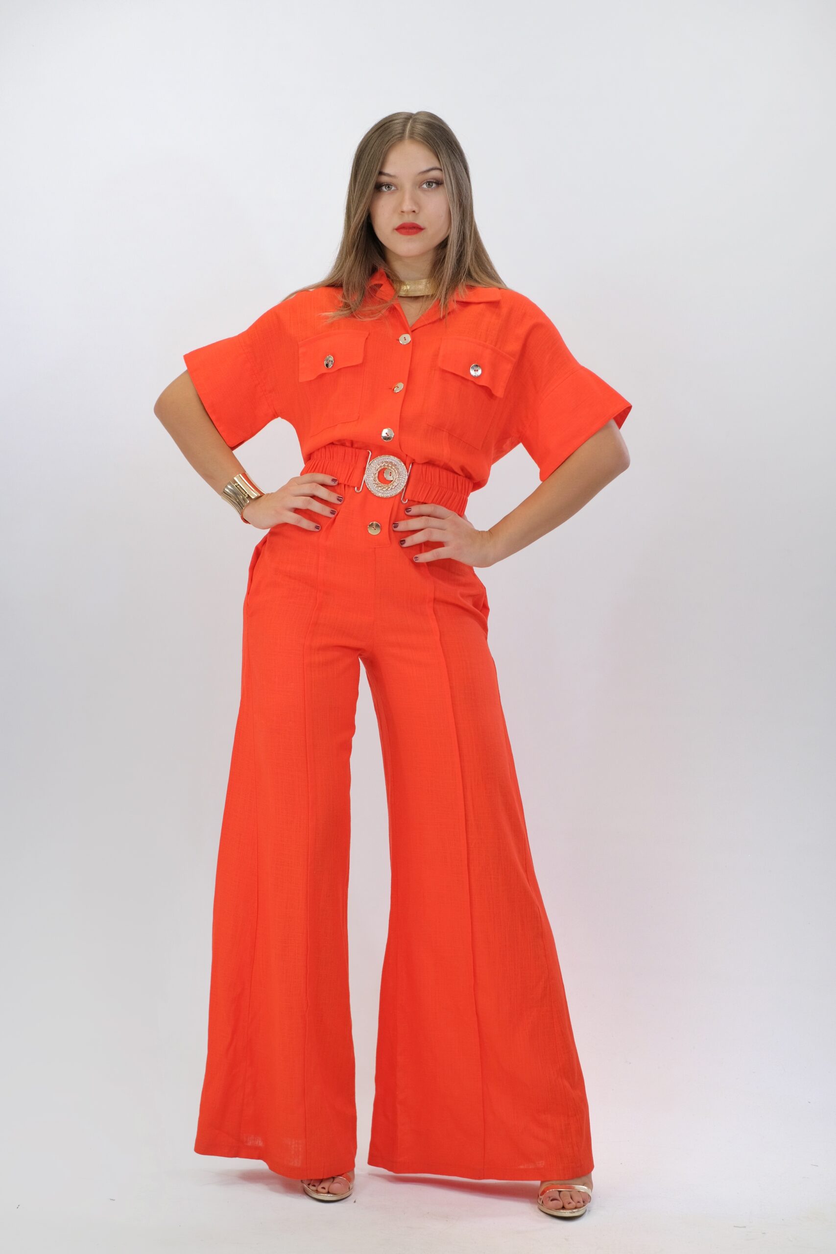 Overal navrhnutý pre Váš maximálny komfort z pohodlnej dýchateľnej látky, ktorá Vám zaručí komfort aj počas náročného dňa. Vrchná čast overálu si berie inšpiráciu z pánskeho šatníka, keďže je spracovaná na košeľový štýl . Ležérnosť podčiarkujú vrecká našité v oblasti hrudníka. Overal má aj opasok z rovnakej látky s ozdobnou sponou. Overál ma funkčné vrecká. Overal je ušitý vo výraznej oranžovej a skvele zapadne do Vášho šatníka, keď budte chcieť vyzerať chic, ale ležérne.