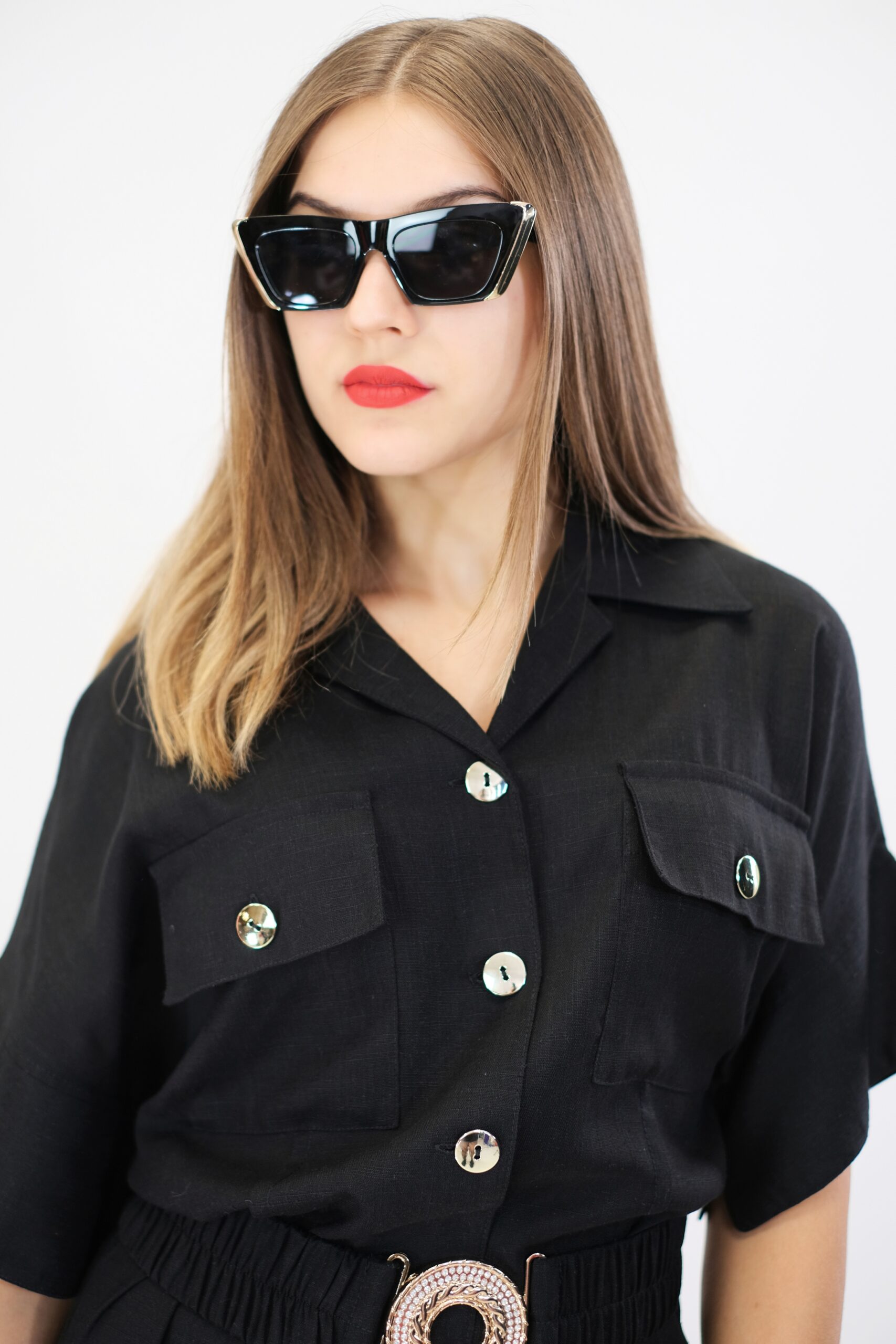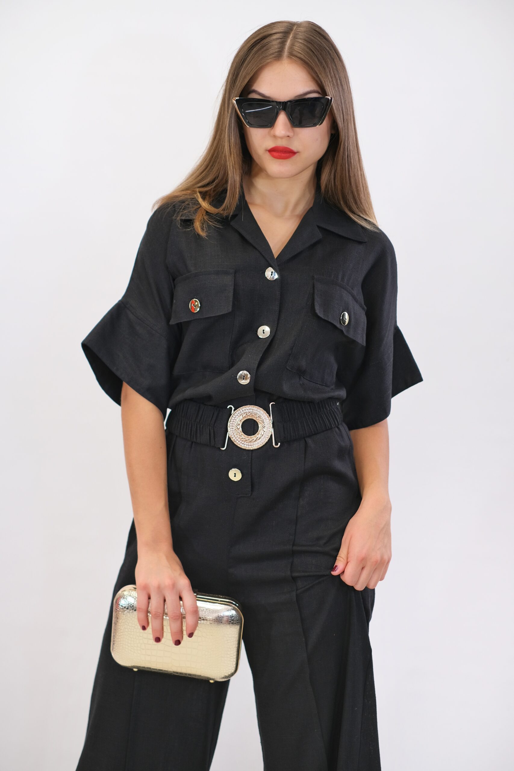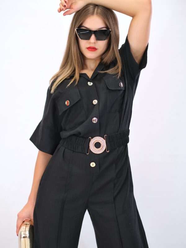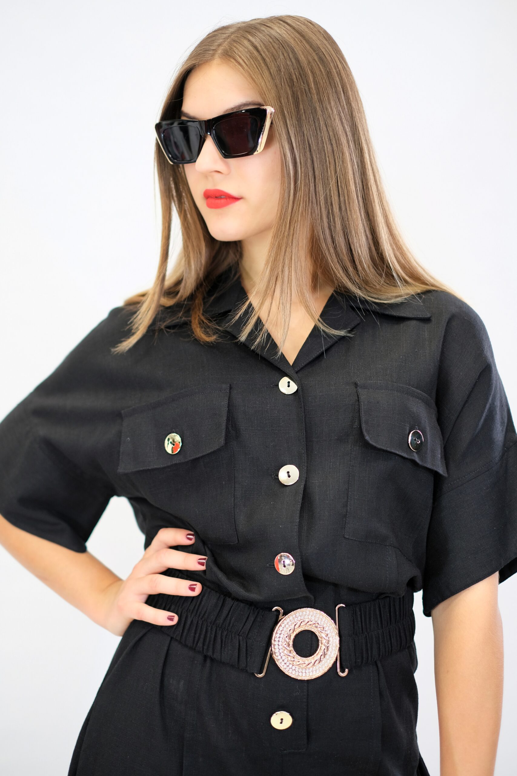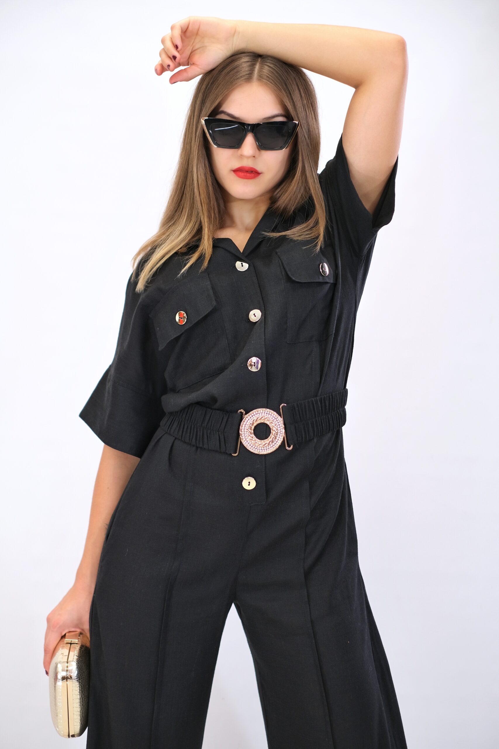 Overal navrhnutý pre Váš maximálny komfort z pohodlnej dýchateľnej látky, ktorá Vám zaručí komfort aj počas náročného dňa. Vrchná čast overálu si berie inšpiráciu z pánskeho šatníka, keďže je spracovaná na košeľový štýl . Ležérnosť podčiarkujú vrecká našité v oblasti hrudníka. Overal má aj opasok z rovnakej látky s ozdobnou sponou. Overál ma funkčné vrecká. Overal je ušitý v nesmrteľnej čiernej a skvele zapadne do Vášho šatníka, keď budte chcieť vyzerať chic, ale ležérne.