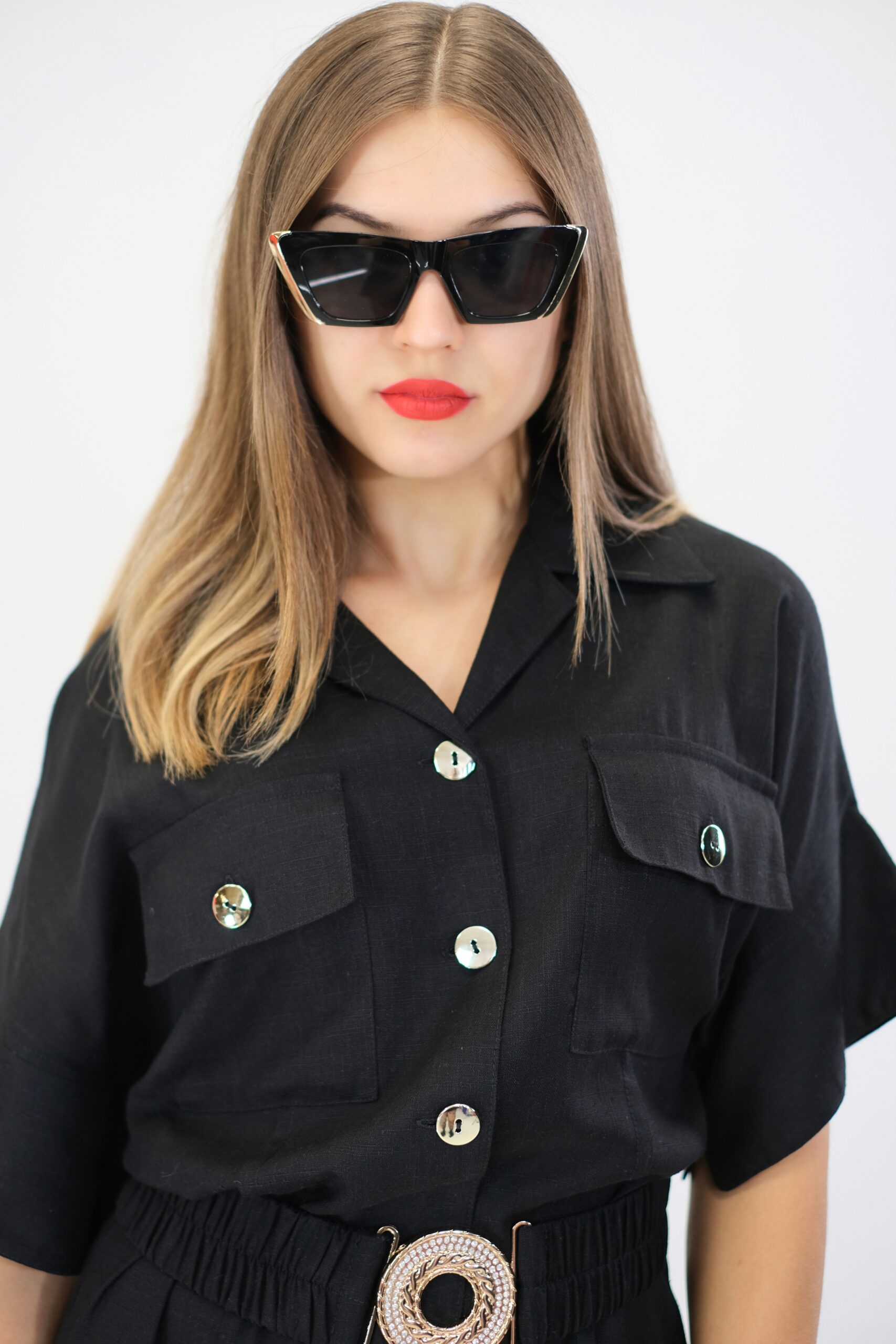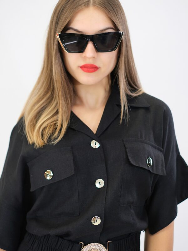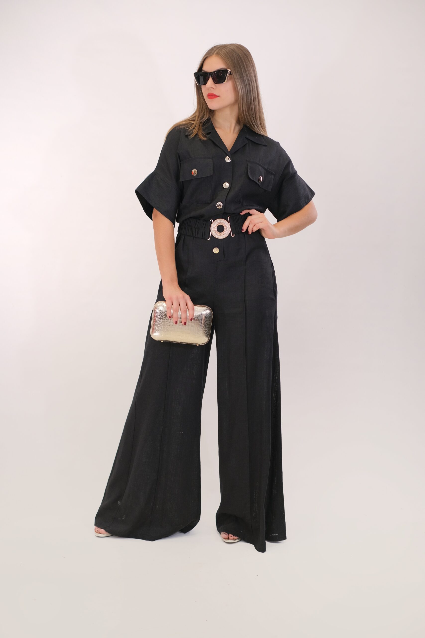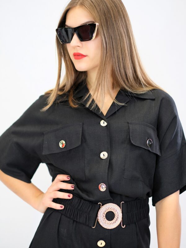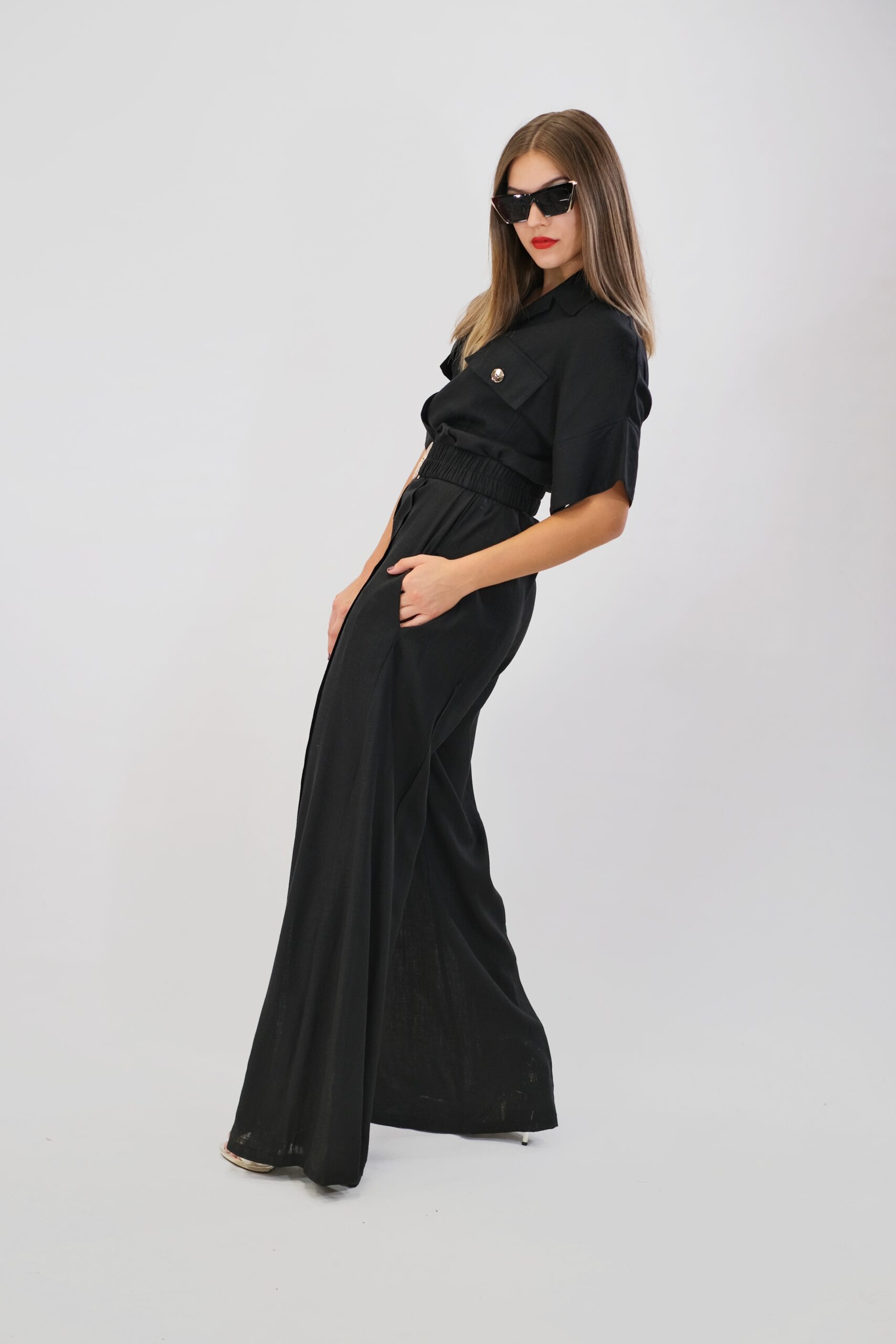 Overal navrhnutý pre Váš maximálny komfort z pohodlnej dýchateľnej látky, ktorá Vám zaručí komfort aj počas náročného dňa. Vrchná čast overálu si berie inšpiráciu z pánskeho šatníka, keďže je spracovaná na košeľový štýl . Ležérnosť podčiarkujú vrecká našité v oblasti hrudníka. Overal má aj opasok z rovnakej látky s ozdobnou sponou. Overál ma funkčné vrecká. Overal je ušitý v nesmrteľnej čiernej a skvele zapadne do Vášho šatníka, keď budte chcieť vyzerať chic, ale ležérne.