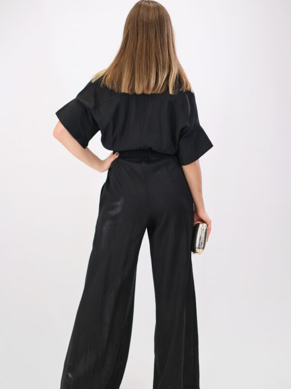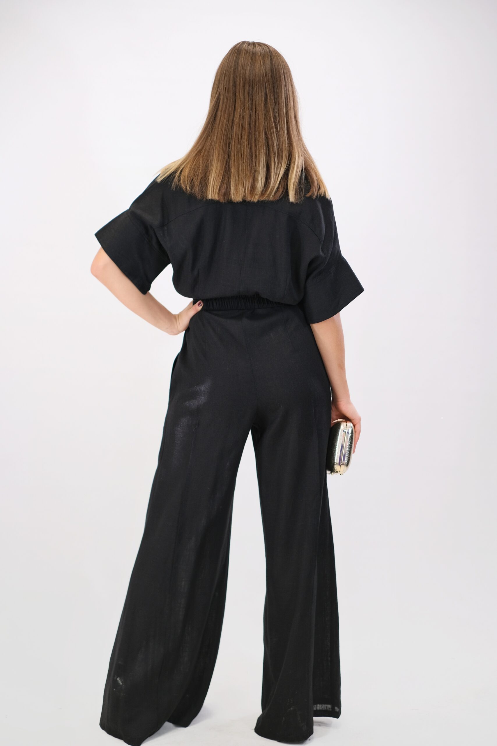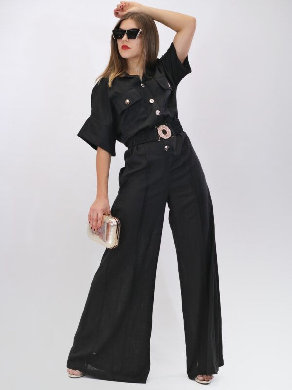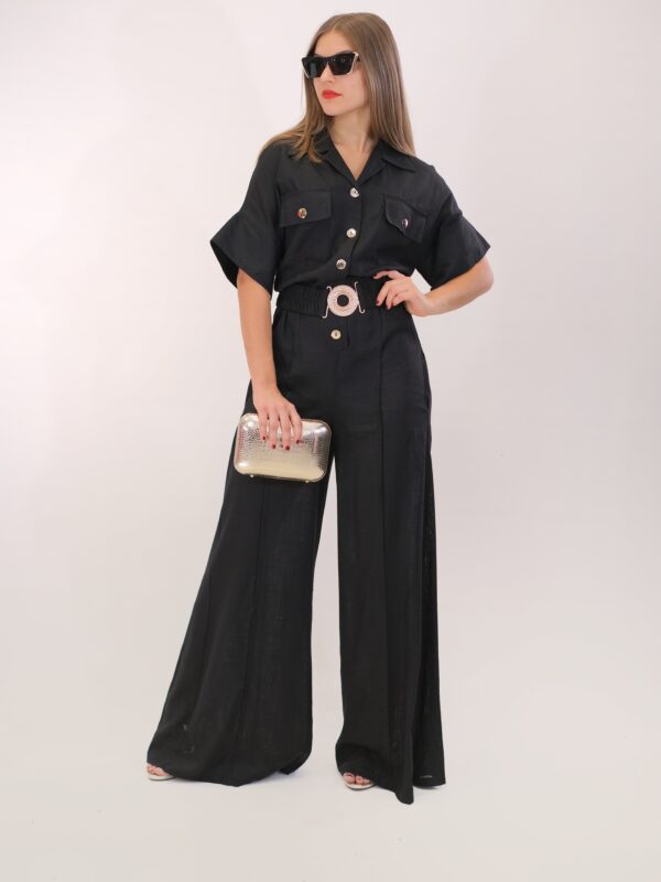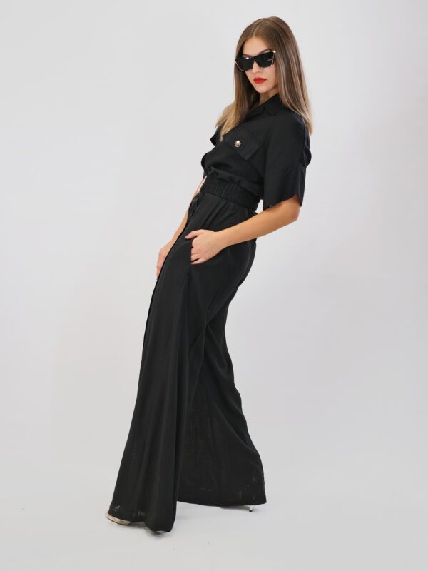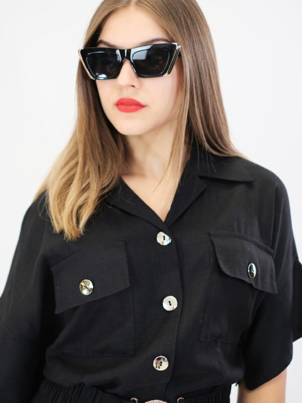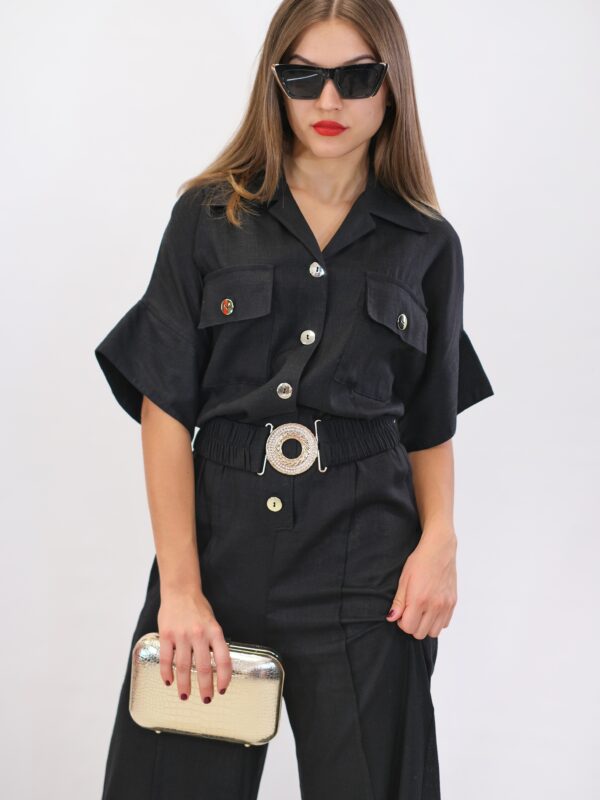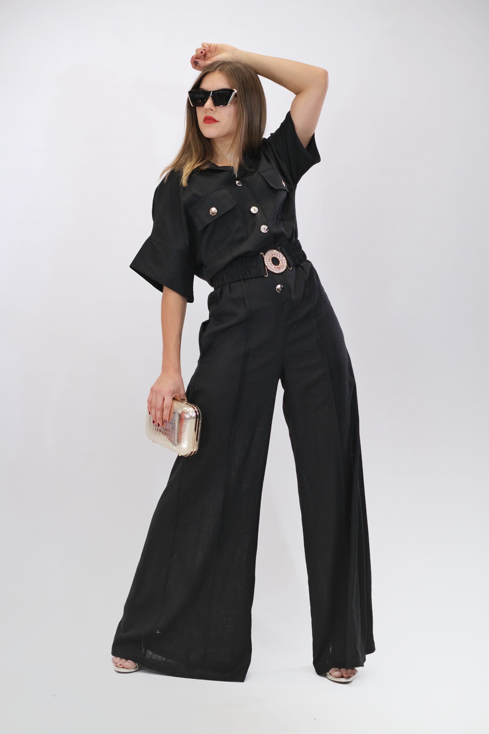 Overal navrhnutý pre Váš maximálny komfort z pohodlnej dýchateľnej látky, ktorá Vám zaručí komfort aj počas náročného dňa. Vrchná čast overálu si berie inšpiráciu z pánskeho šatníka, keďže je spracovaná na košeľový štýl . Ležérnosť podčiarkujú vrecká našité v oblasti hrudníka. Overal má aj opasok z rovnakej látky s ozdobnou sponou. Overál ma funkčné vrecká. Overal je ušitý v nesmrteľnej čiernej a skvele zapadne do Vášho šatníka, keď budte chcieť vyzerať chic, ale ležérne.