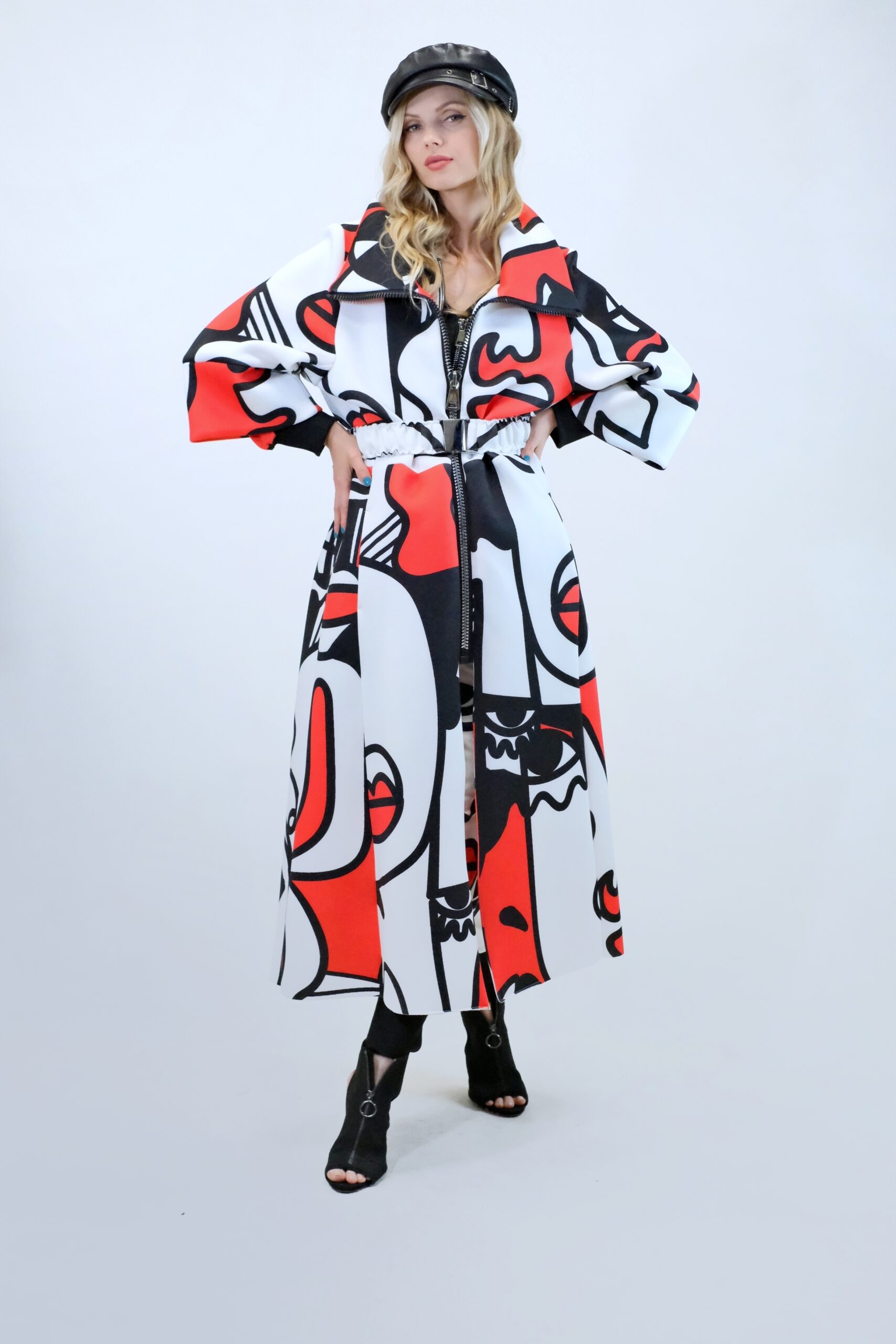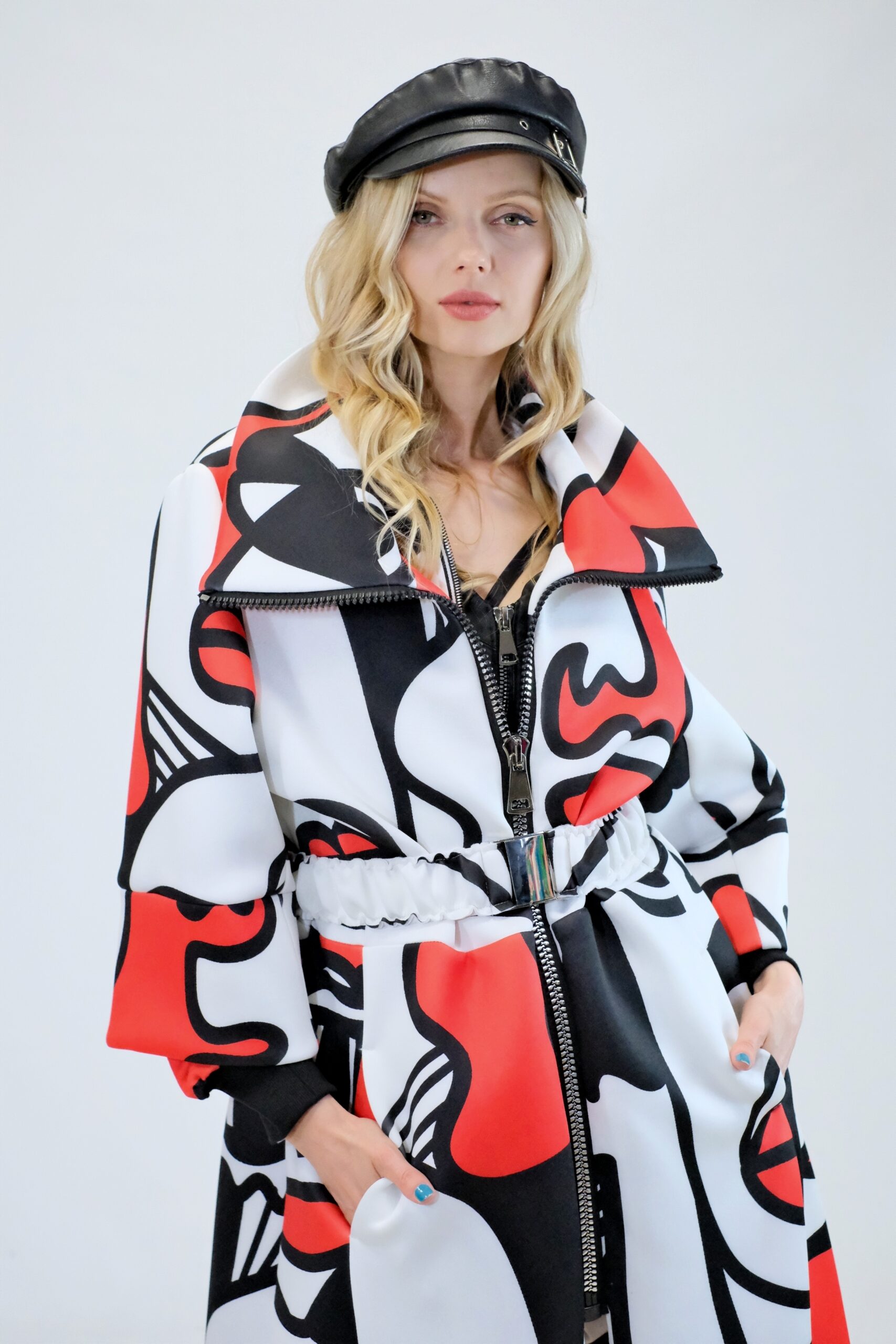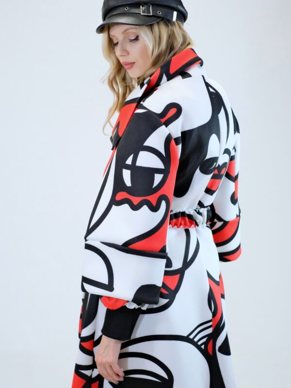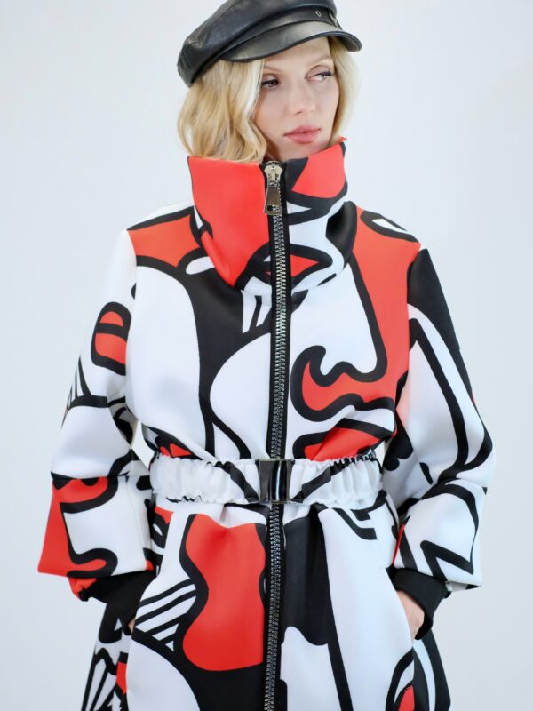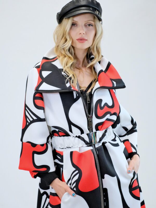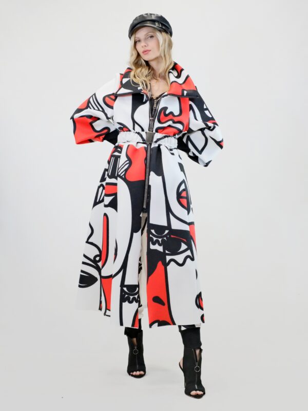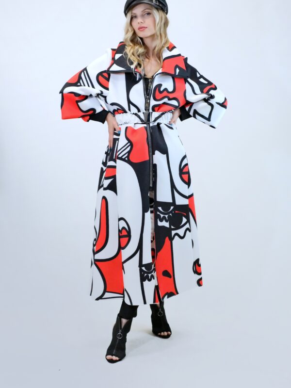 Plášť je navrhnutý v prepracovanom strihu, kde sa myslelo na každý detail. Plášť ma výrazný voliér a je ušitý z ľahkého materiálu pripomínajúceho neoprén. Plášť sa dá nosiť s rozopnutým golierom tvoriacim výraznú fazónu alebo so zapnutým golierom, vtedy môžete aj počas veterných dní odložiť šál. Zaujímavými detailami na plášti je ozdobný zips a hodinové široké rukávy, ktoré môžete skvele využiť na vrstvenie alebo nechať otvorené a užívať si vzdušnosť strihu. Plášť ma priložený opasok . Výrazným prvkom odevu je potlač pripomínajúca umelecké obdobie kubizmu výraznými črtami a geometrickými uhlami. Vzor je zastupení v jednej z najrozširenejších farebných kombinácii čiernej, bielej a červenej a ľahko ho skombinujete s celým Vašim šatníkom. Doplnky môžete zvoliť v čiernej , bielej alebo aj červenej farbe pre kompletný look.