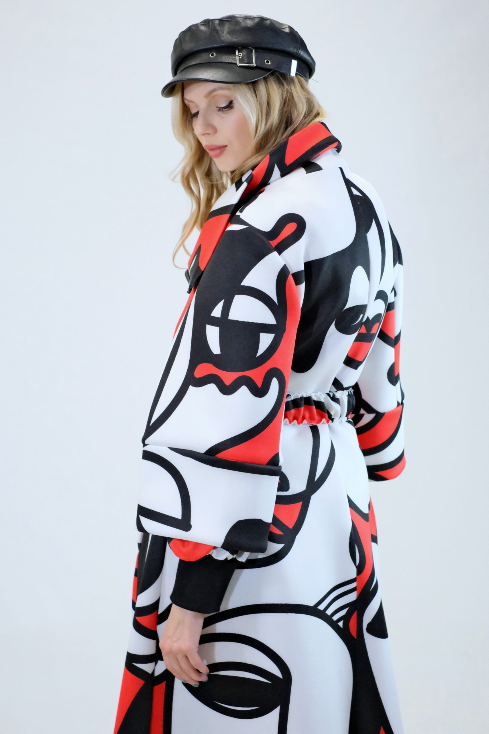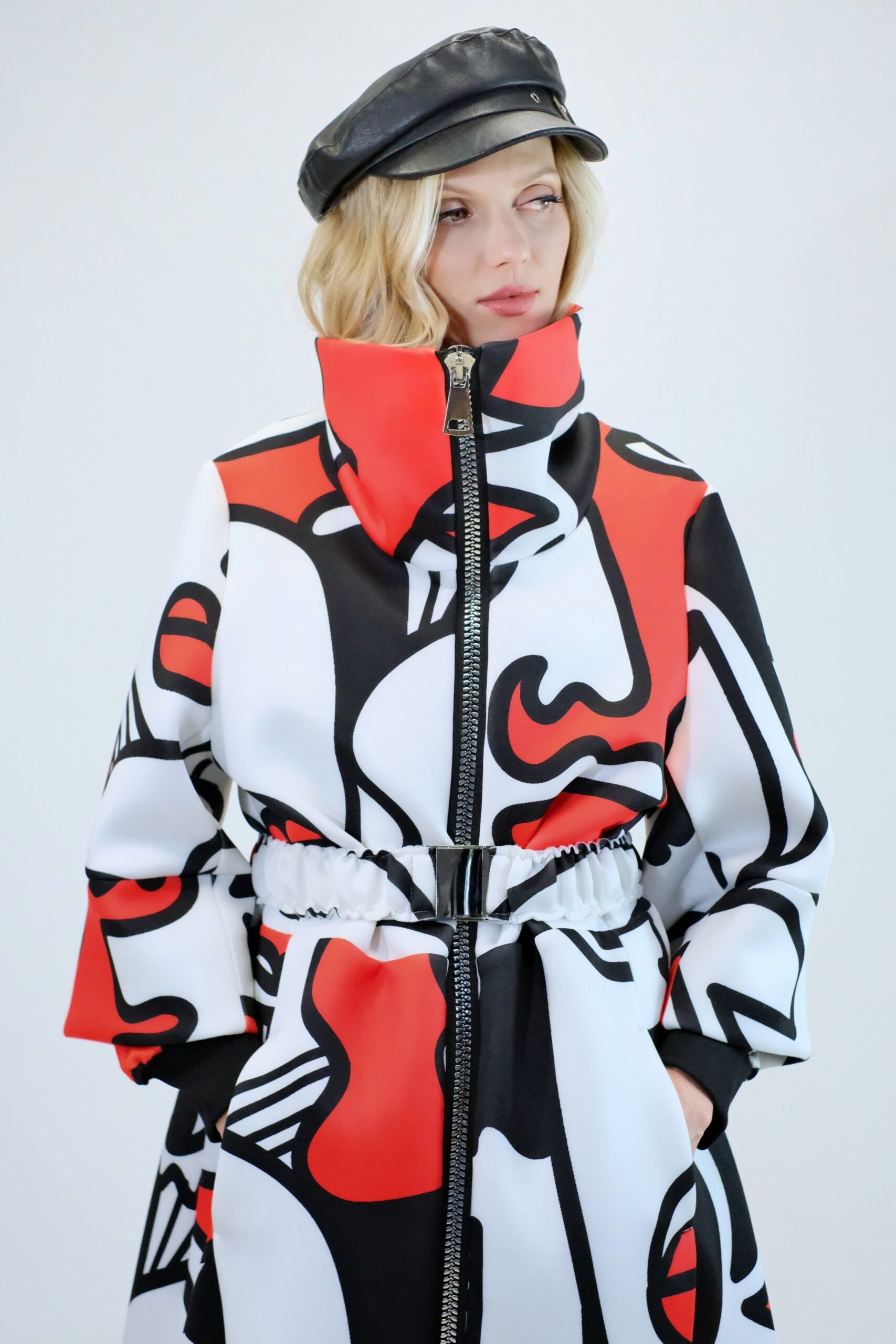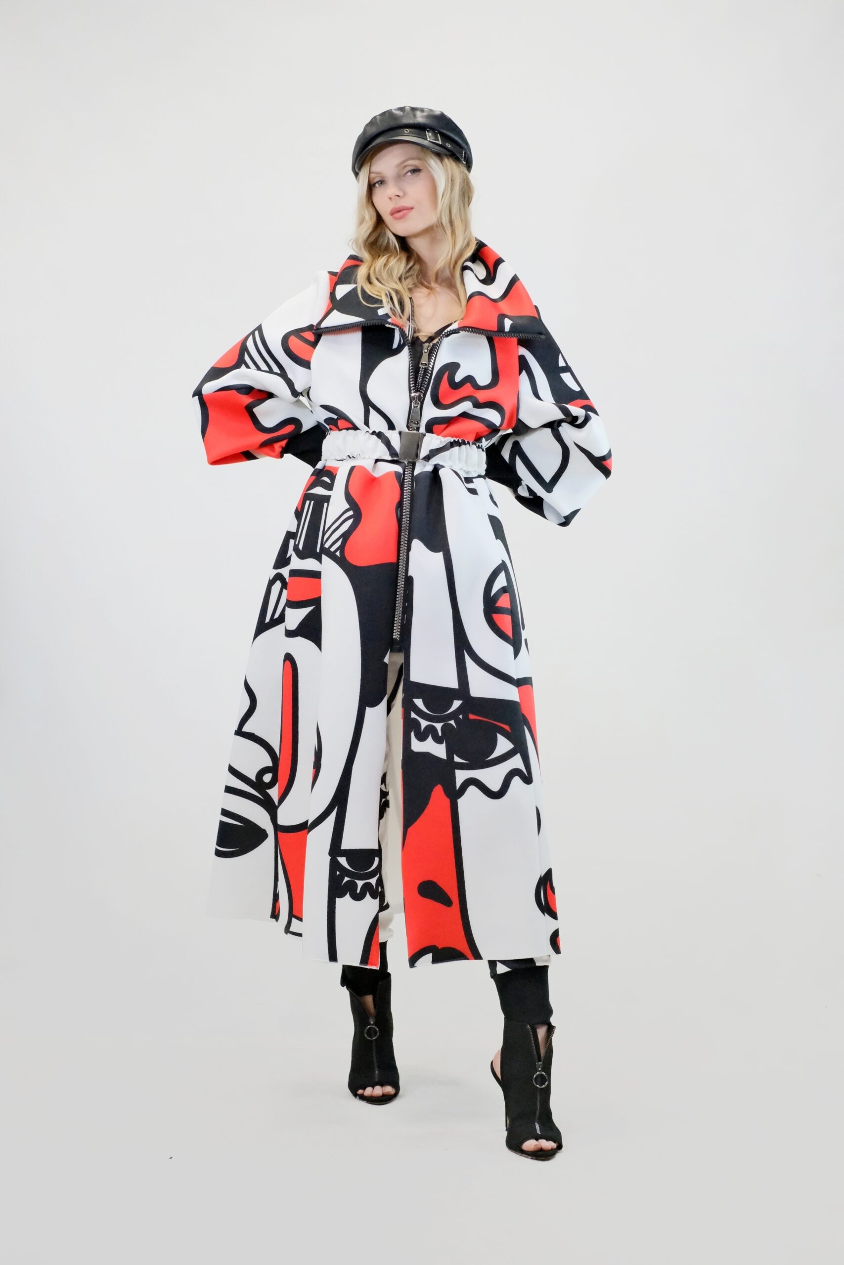 Plášť je navrhnutý v prepracovanom strihu, kde sa myslelo na každý detail. Plášť ma výrazný voliér a je ušitý z ľahkého materiálu pripomínajúceho neoprén. Plášť sa dá nosiť s rozopnutým golierom tvoriacim výraznú fazónu alebo so zapnutým golierom, vtedy môžete aj počas veterných dní odložiť šál. Zaujímavými detailami na plášti je ozdobný zips a hodinové široké rukávy, ktoré môžete skvele využiť na vrstvenie alebo nechať otvorené a užívať si vzdušnosť strihu. Plášť ma priložený opasok . Výrazným prvkom odevu je potlač pripomínajúca umelecké obdobie kubizmu výraznými črtami a geometrickými uhlami. Vzor je zastupení v jednej z najrozširenejších farebných kombinácii čiernej, bielej a červenej a ľahko ho skombinujete s celým Vašim šatníkom. Doplnky môžete zvoliť v čiernej , bielej alebo aj červenej farbe pre kompletný look.