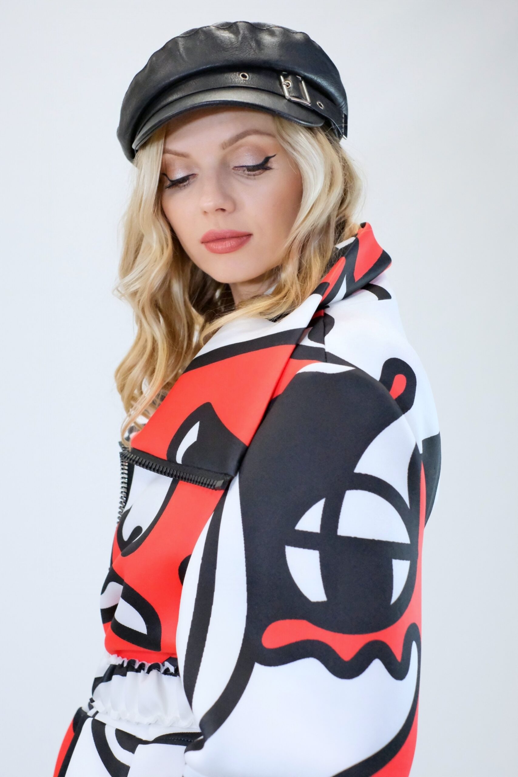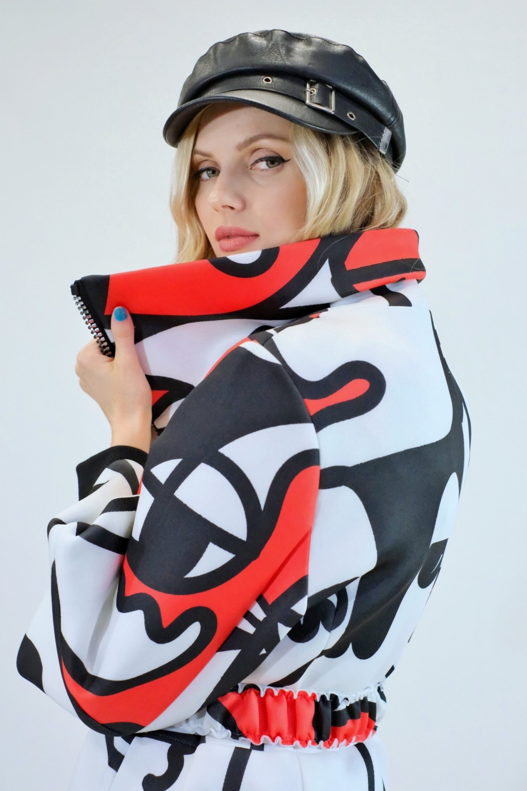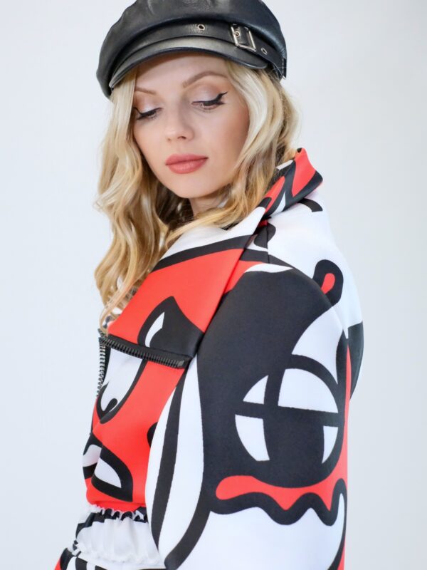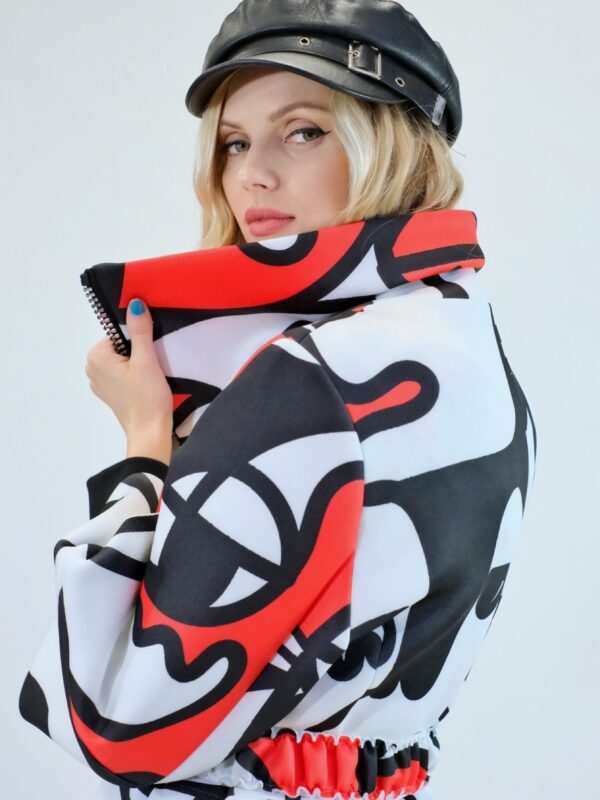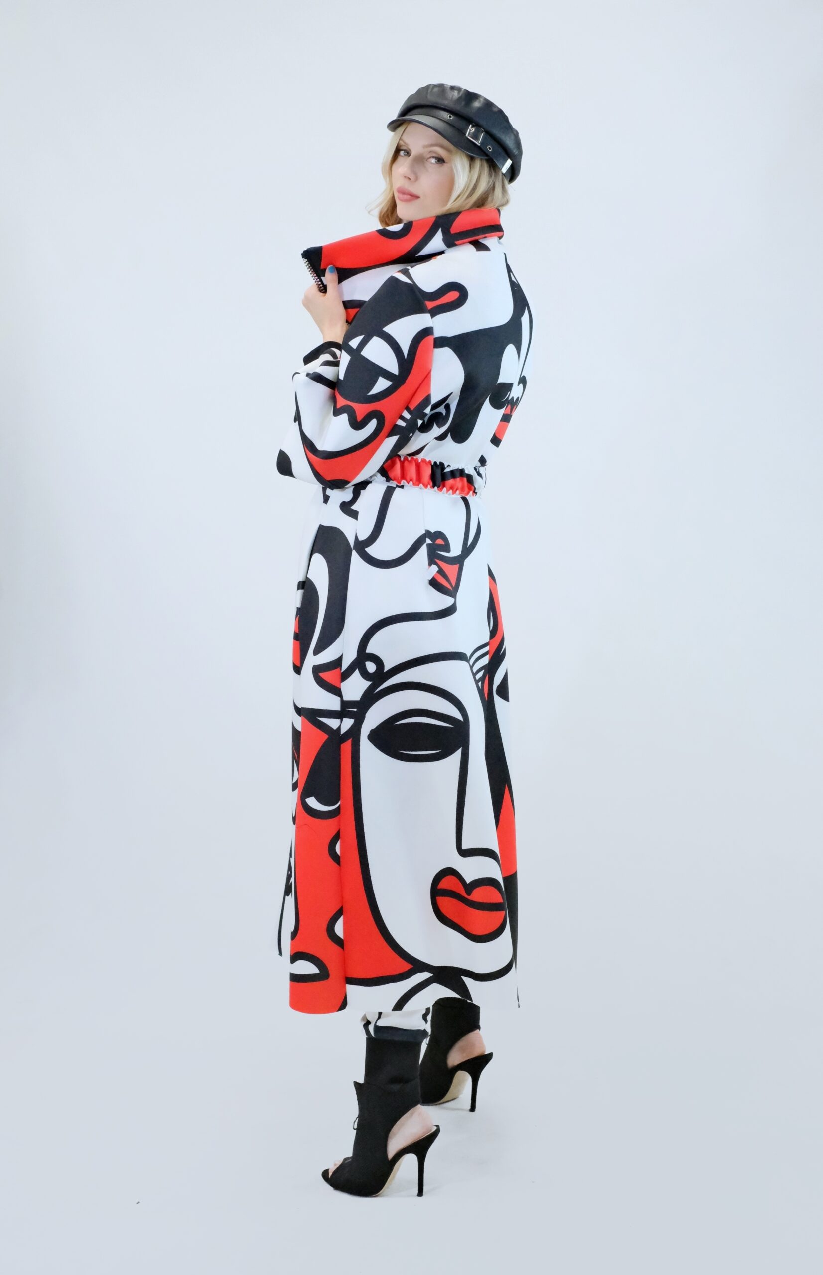 Plášť je navrhnutý v prepracovanom strihu, kde sa myslelo na každý detail. Plášť ma výrazný voliér a je ušitý z ľahkého materiálu pripomínajúceho neoprén. Plášť sa dá nosiť s rozopnutým golierom tvoriacim výraznú fazónu alebo so zapnutým golierom, vtedy môžete aj počas veterných dní odložiť šál. Zaujímavými detailami na plášti je ozdobný zips a hodinové široké rukávy, ktoré môžete skvele využiť na vrstvenie alebo nechať otvorené a užívať si vzdušnosť strihu. Plášť ma priložený opasok . Výrazným prvkom odevu je potlač pripomínajúca umelecké obdobie kubizmu výraznými črtami a geometrickými uhlami. Vzor je zastupení v jednej z najrozširenejších farebných kombinácii čiernej, bielej a červenej a ľahko ho skombinujete s celým Vašim šatníkom. Doplnky môžete zvoliť v čiernej , bielej alebo aj červenej farbe pre kompletný look.