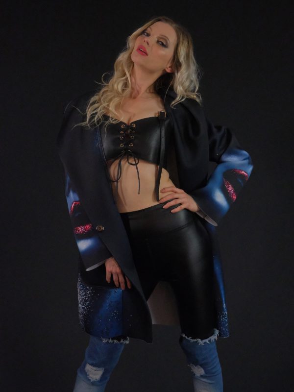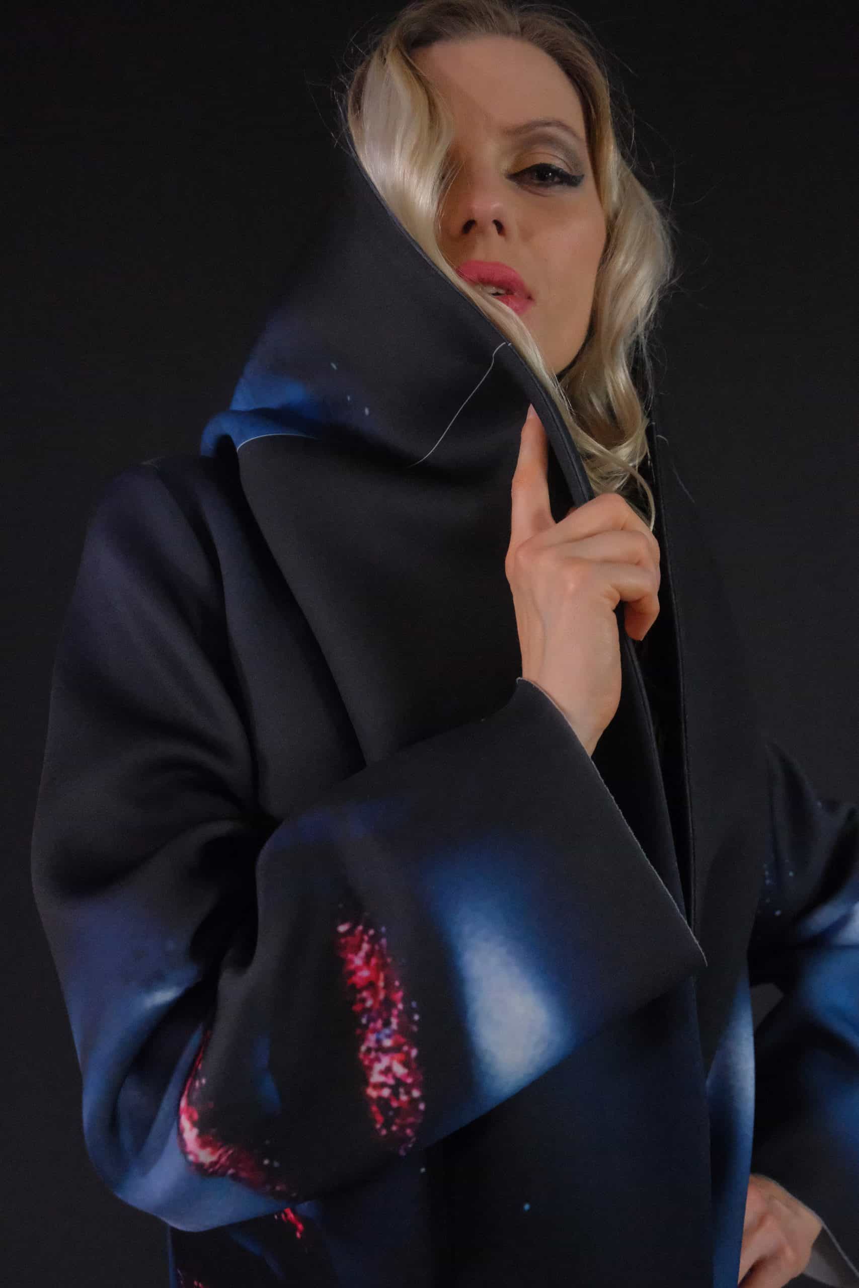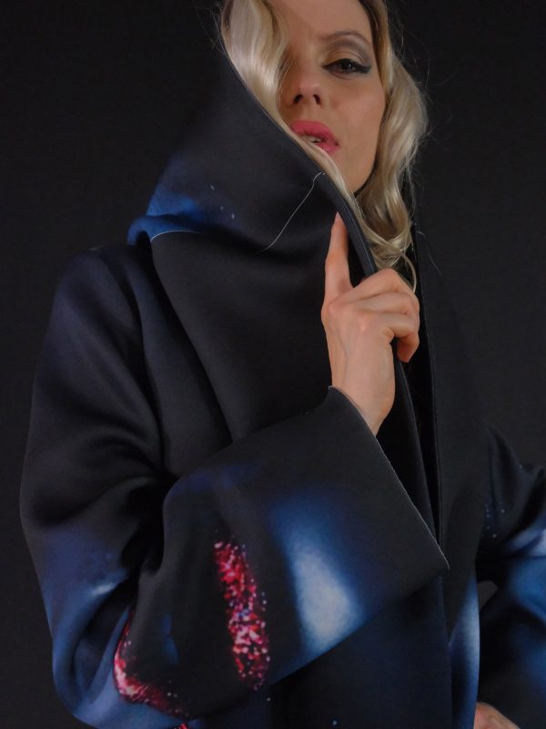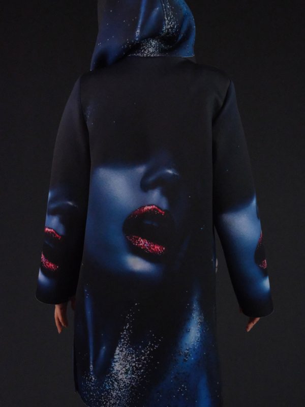 Plášť ušitý v jednoduchom oversize strihu s výraznou potlačou. Plášť je ušitý z hrejivého prechodného materiálu. Plášť je nepodšitý a zapína sa len na jeden gombík. Čistota strihu je zachovaná , aby naplno vynikla výrazná potlač, v ktorej dominuje grafika tváre s dôrazom na pery. Plášť je ušitý v tmavých tónoch a je skvelou voľbou na prechodné obdobie.
