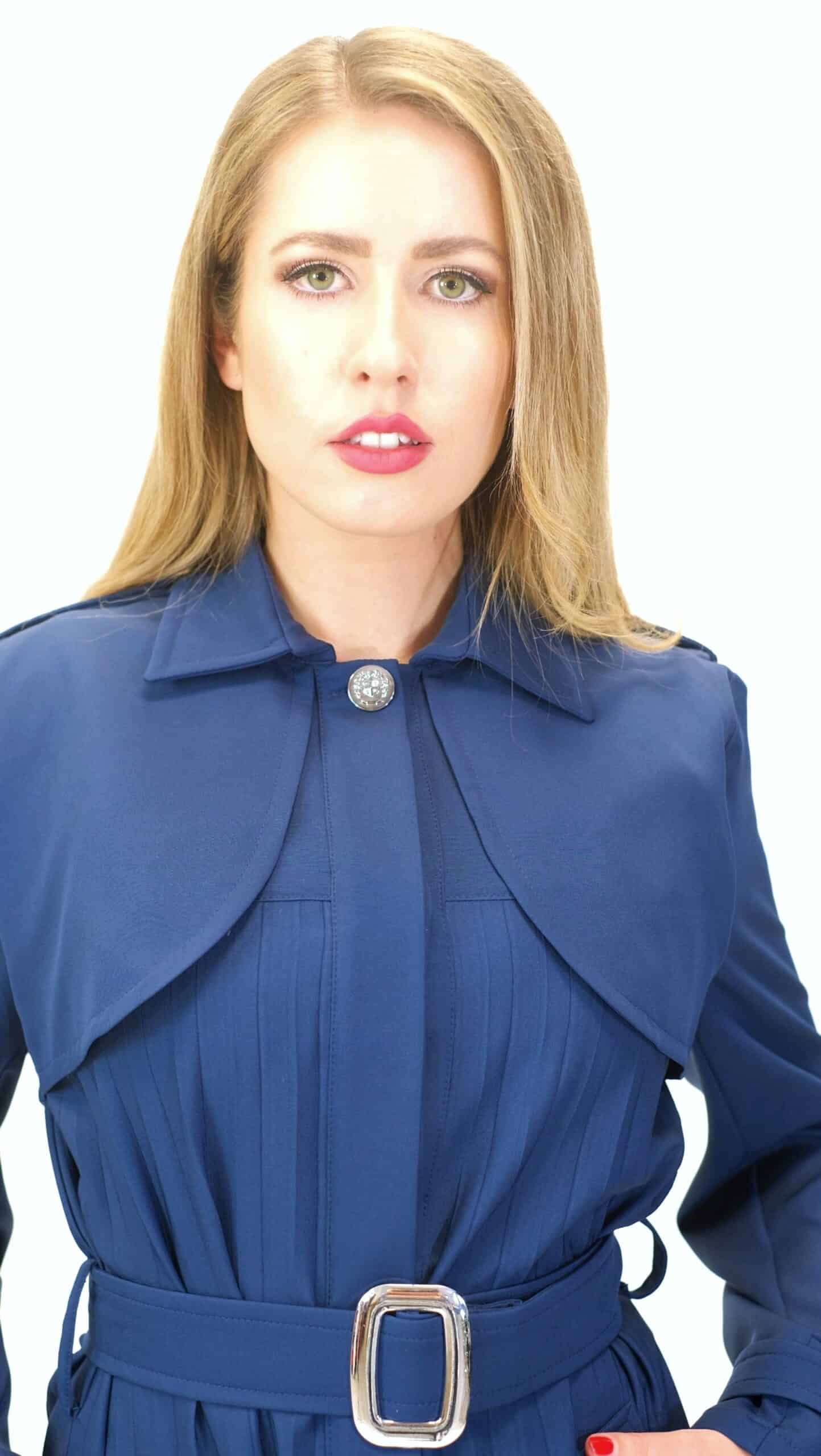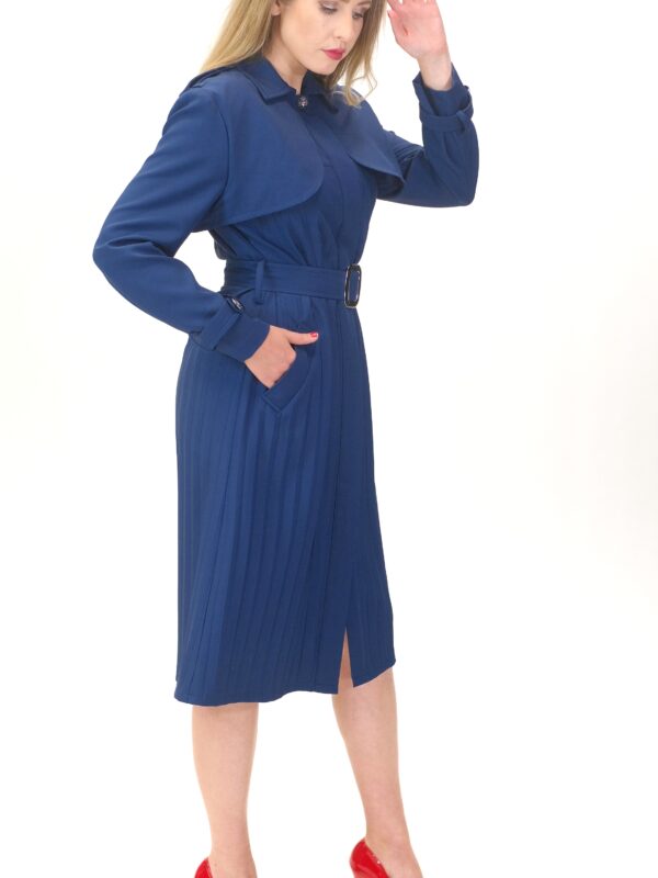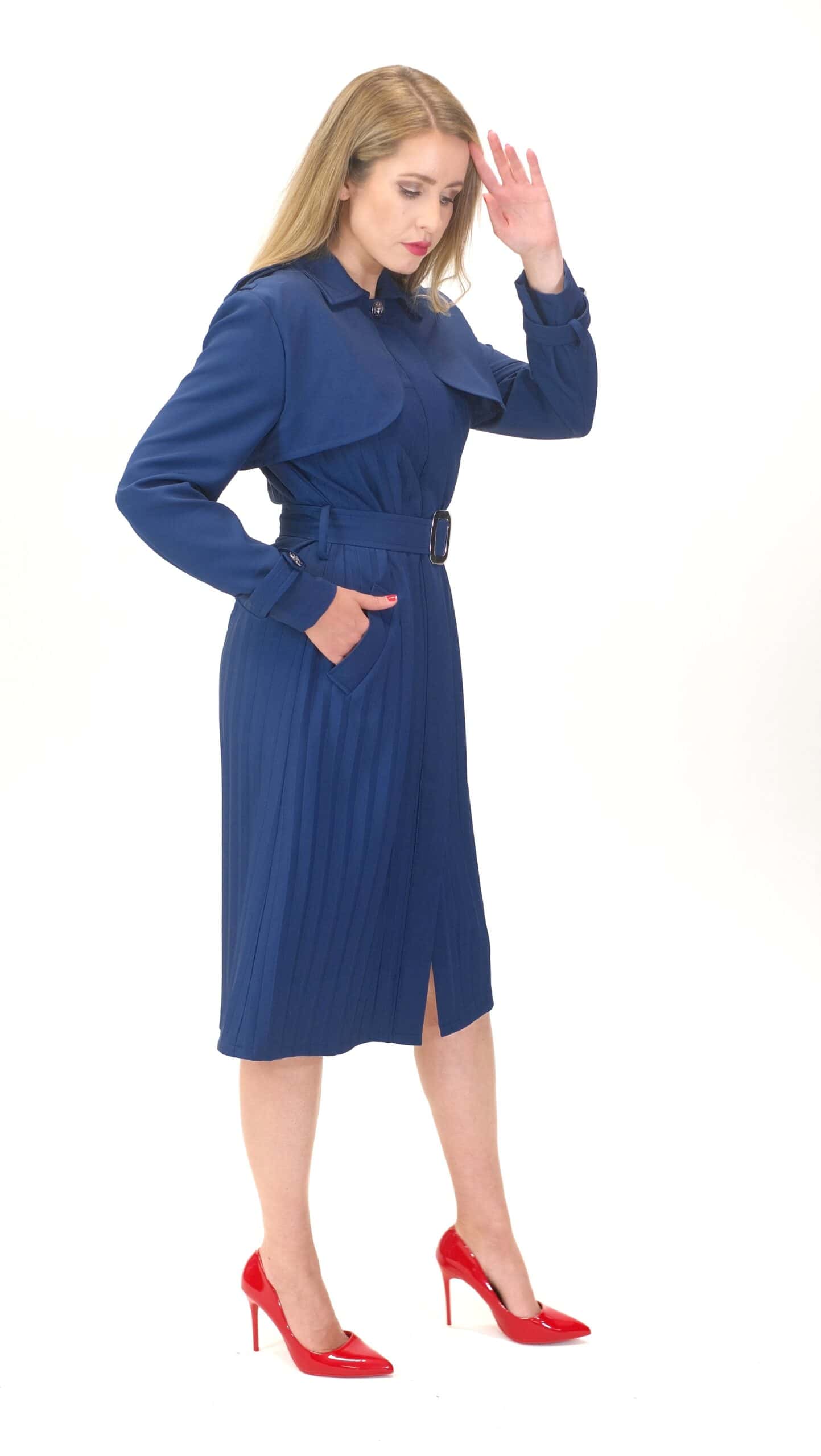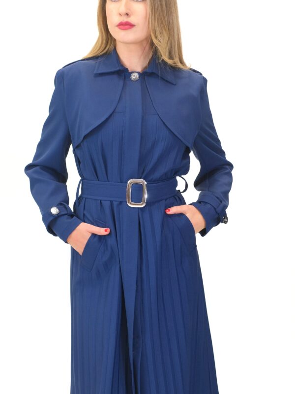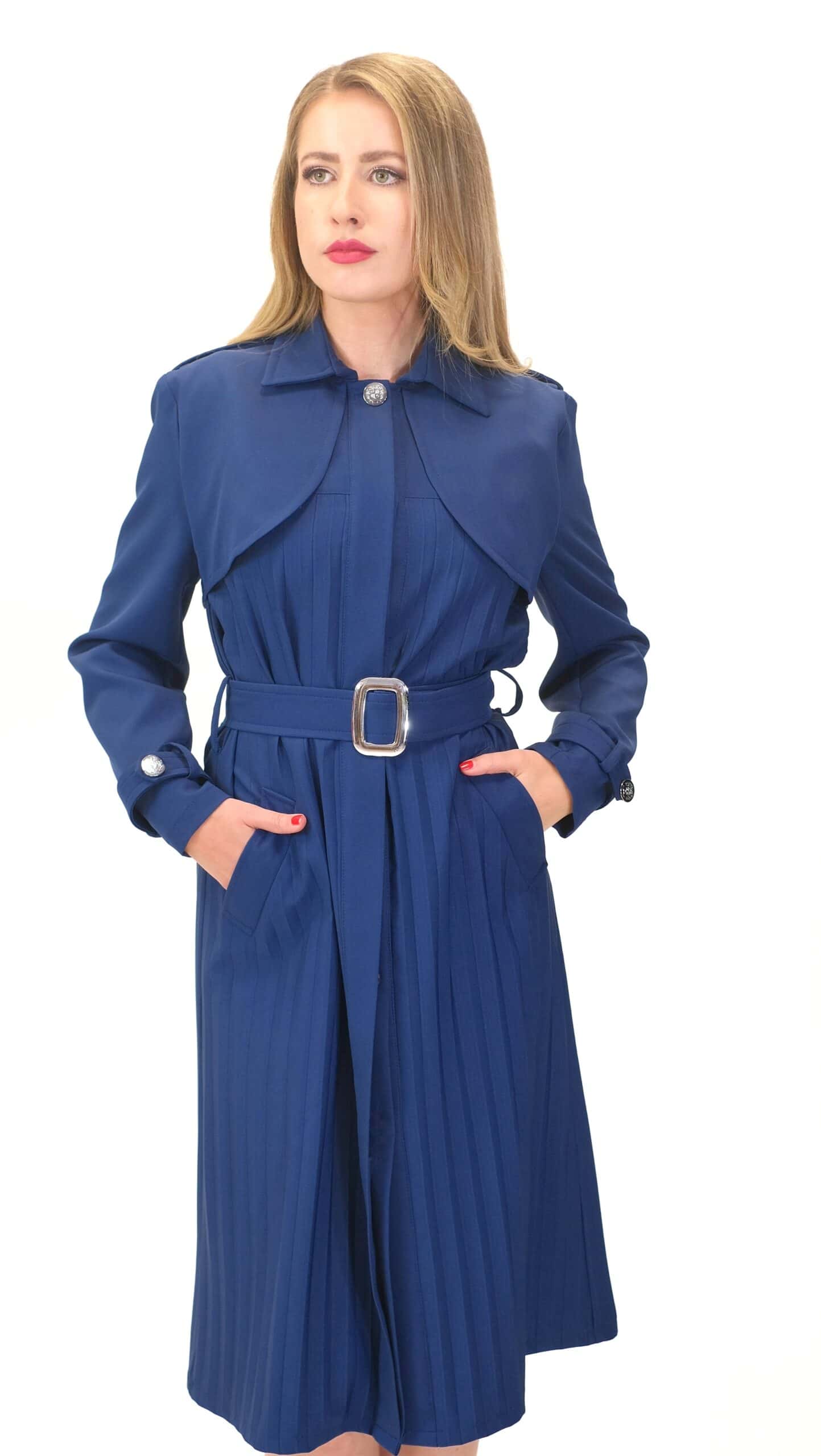 Plášť je navrhnutý v prepracovanom strihu do najmenších detailov. Plášť je ušitý ako klasický trenčkot so spodnou polovicou materiálu v spracovaní plissé, to mu dodáva na ľahkosti a vzdušnosti. Plášť je univerzálny kúsok, ktorý rovnako dobre vynosíte s teniskami , ako s opätkami.