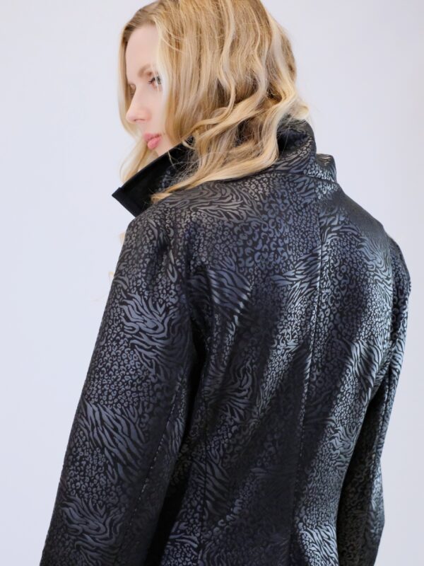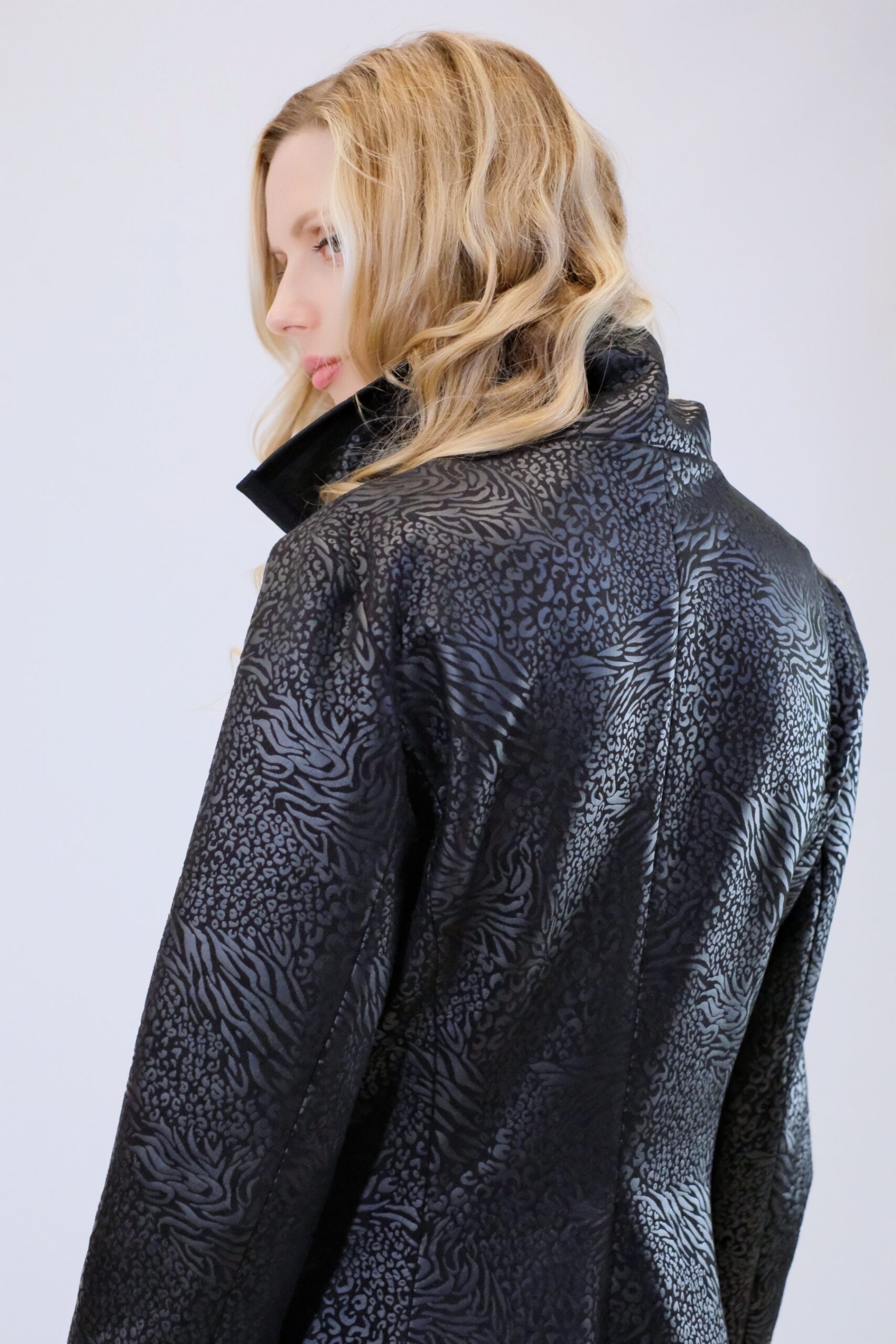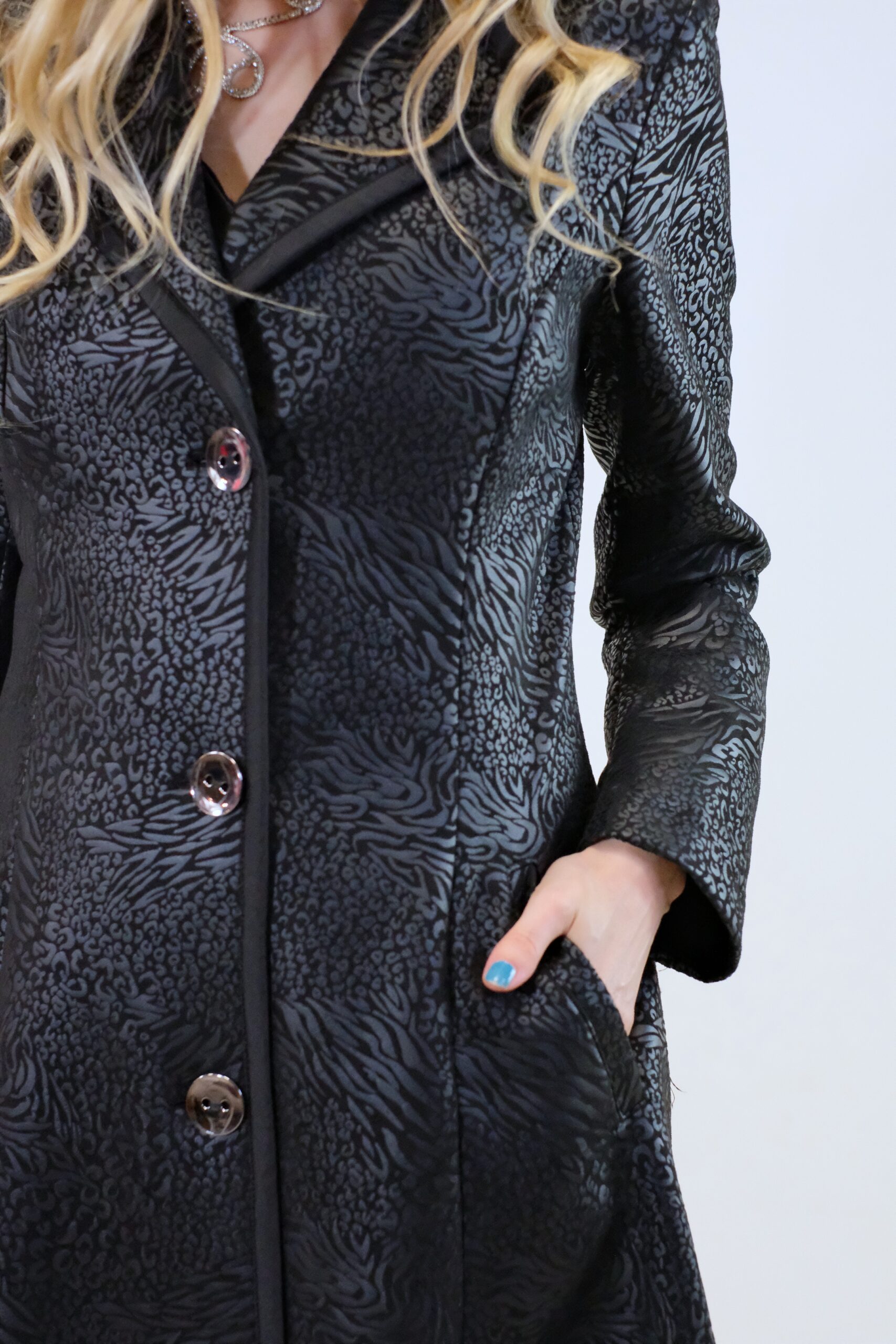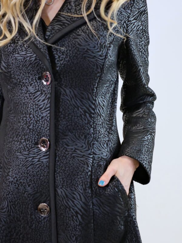 Plášť je ušitý v prepracovanom vzore, ktorý skvele zdôrazní Vašu postavu. Plášť je navrhnutý s protizáhybmi v spodnej časti, ktoré mu dodávajú punc elegancie. Plášť je ušitý vo vzorovanom čiernom materiáli, ktorý sa mierne leskne. Plášť má funkčné vrecká. Zaujímavým detailom je lemovanie fazóny plášťa a predného dielu. Plášť je podšitý a výborne sa hodí ku všetkému , čo vo svojom šatníku nájdete, keďže je ušitý vo versatilnej čiernej farbe.
