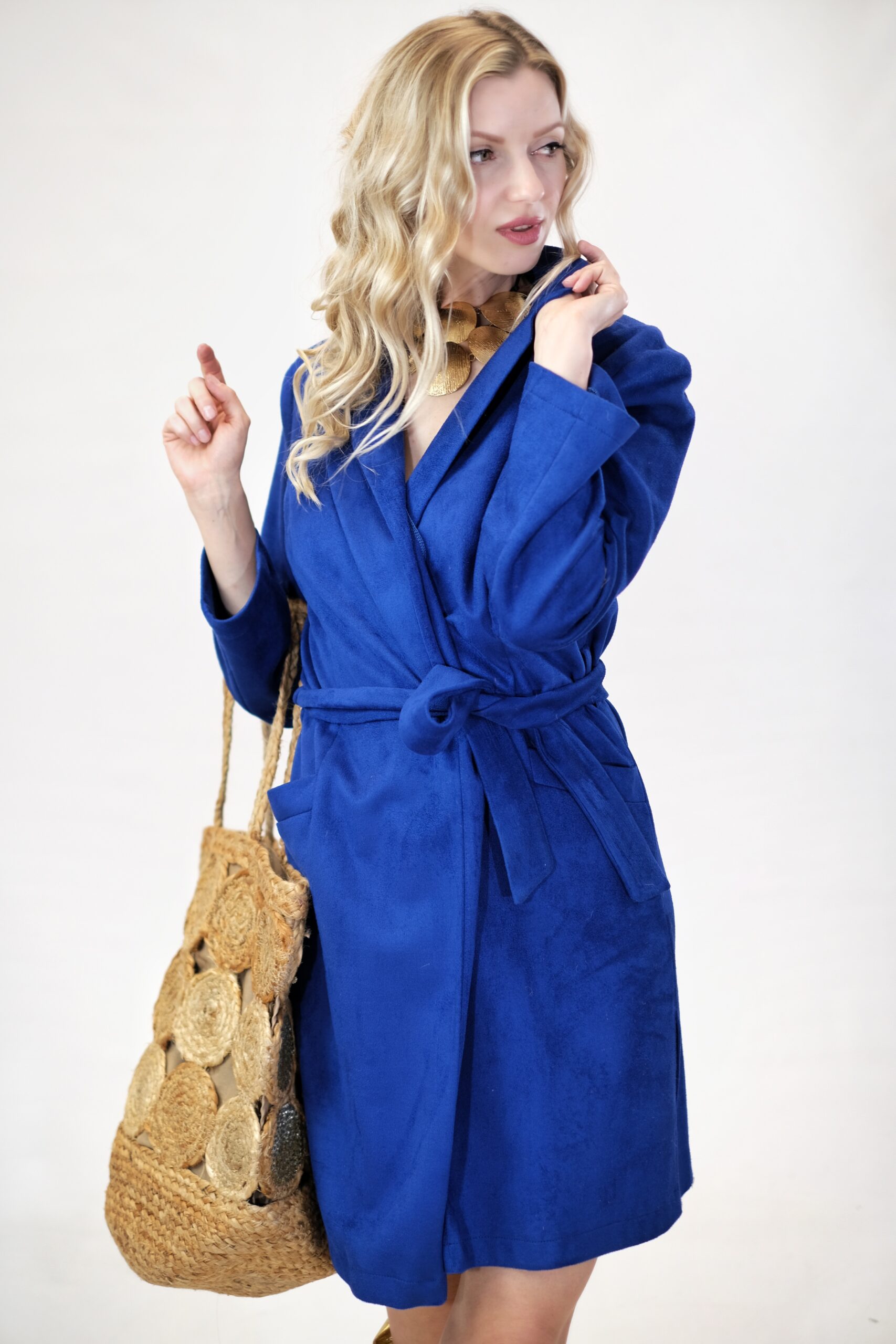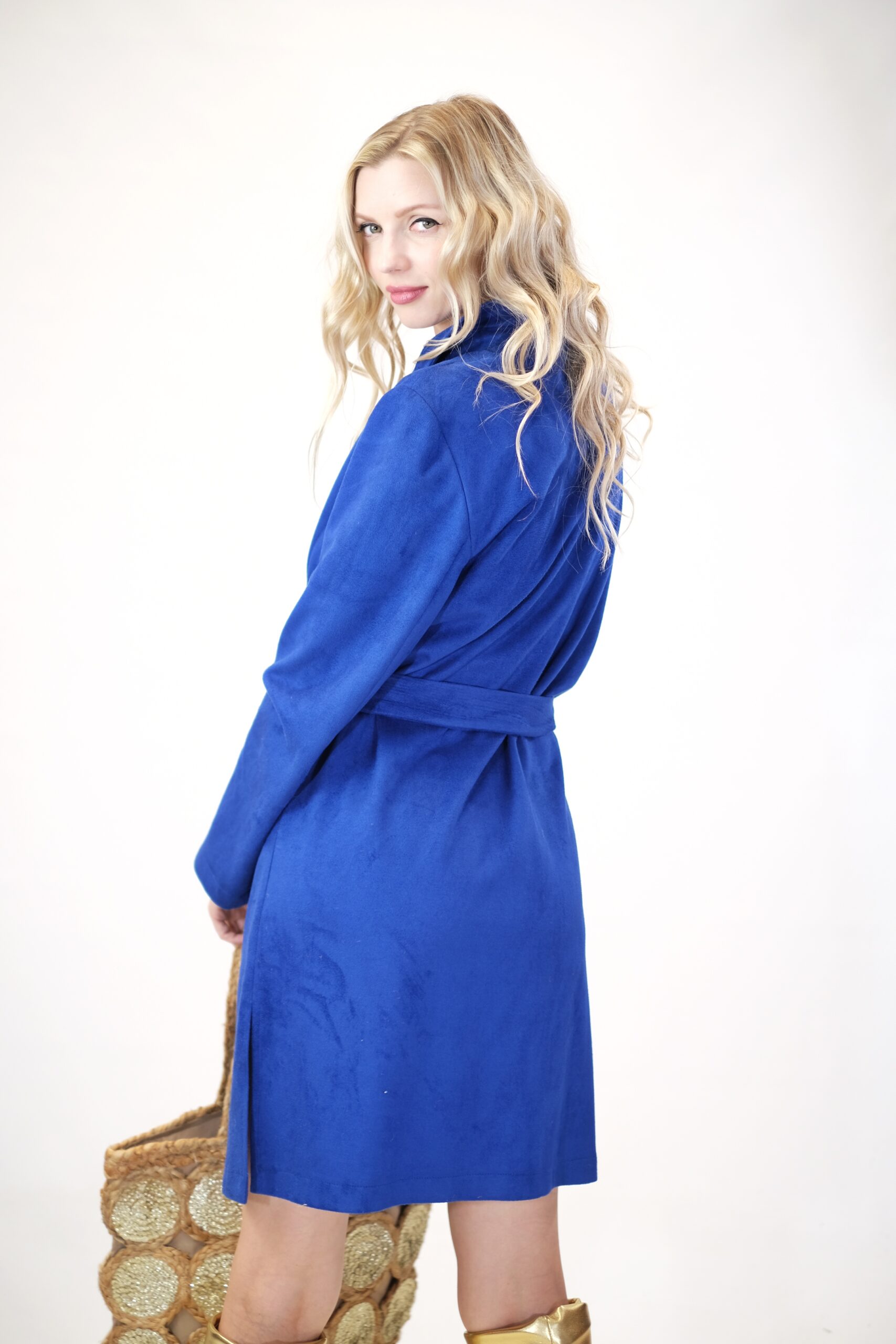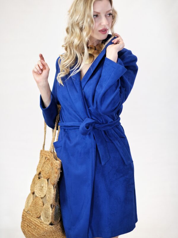Plášte ušitý v jednoduchom voľnom strihu, ktorý výborne sadne na každý typ postavy. Plášť je navrhnutý nepodšitý a tým pádom je poddajný a prispôsobí sa vašej postave. Plášť je navrhnutý bez gombíkov, len s jednoduchým opaskom na stiahnutie pásu. Plášť má funkčné vrecká a zaujímavým detailom sú roztrihy po bokoch. Plášť je navrhnutý v prenikavej kráľovskej modrej farbe, ktorá výborne sedí blondínam aj tmavovláskam. Kombinujte so zlatými doplnkami ako naša aranžérka pre wow efekt.