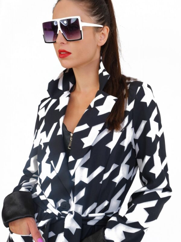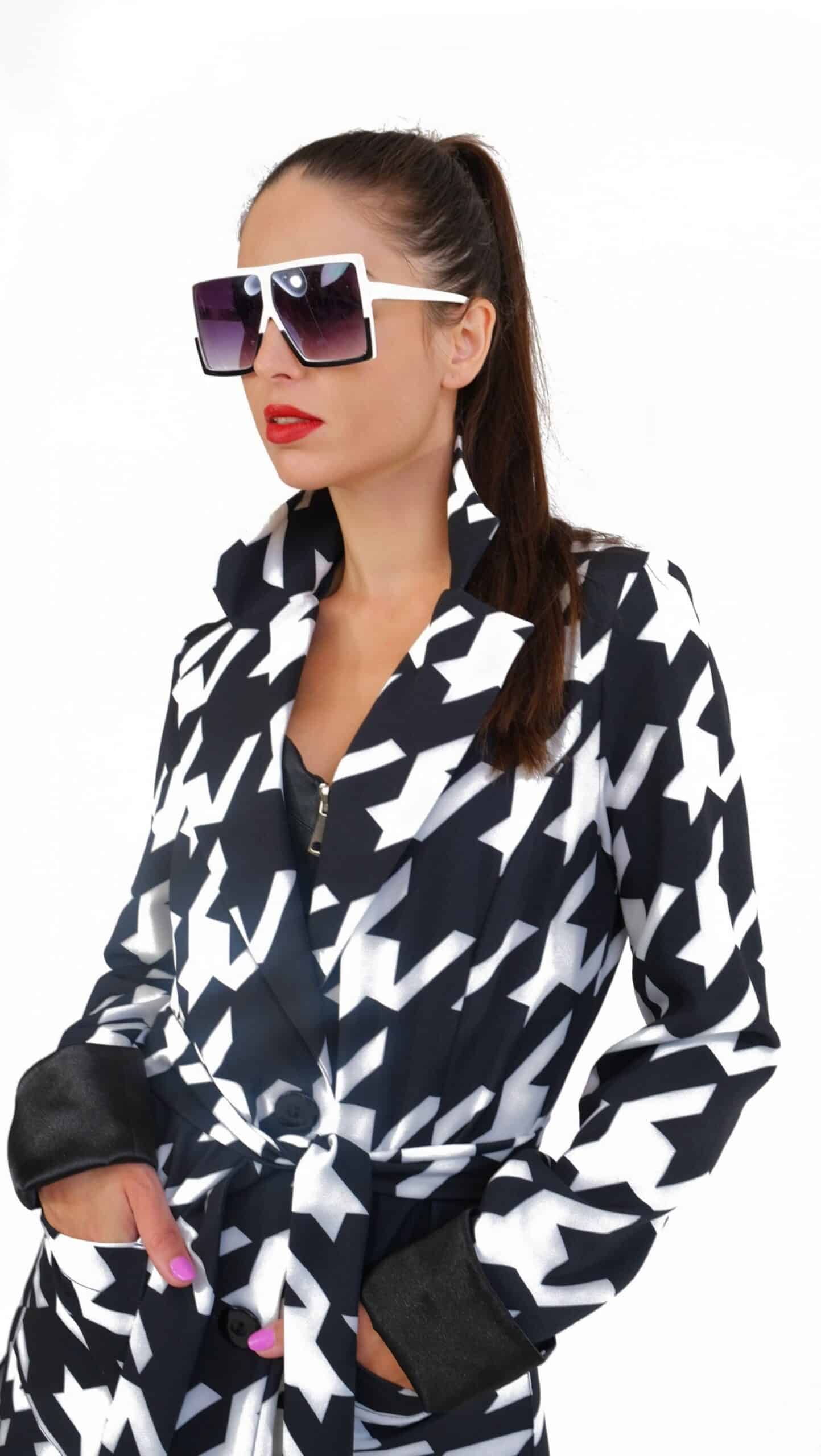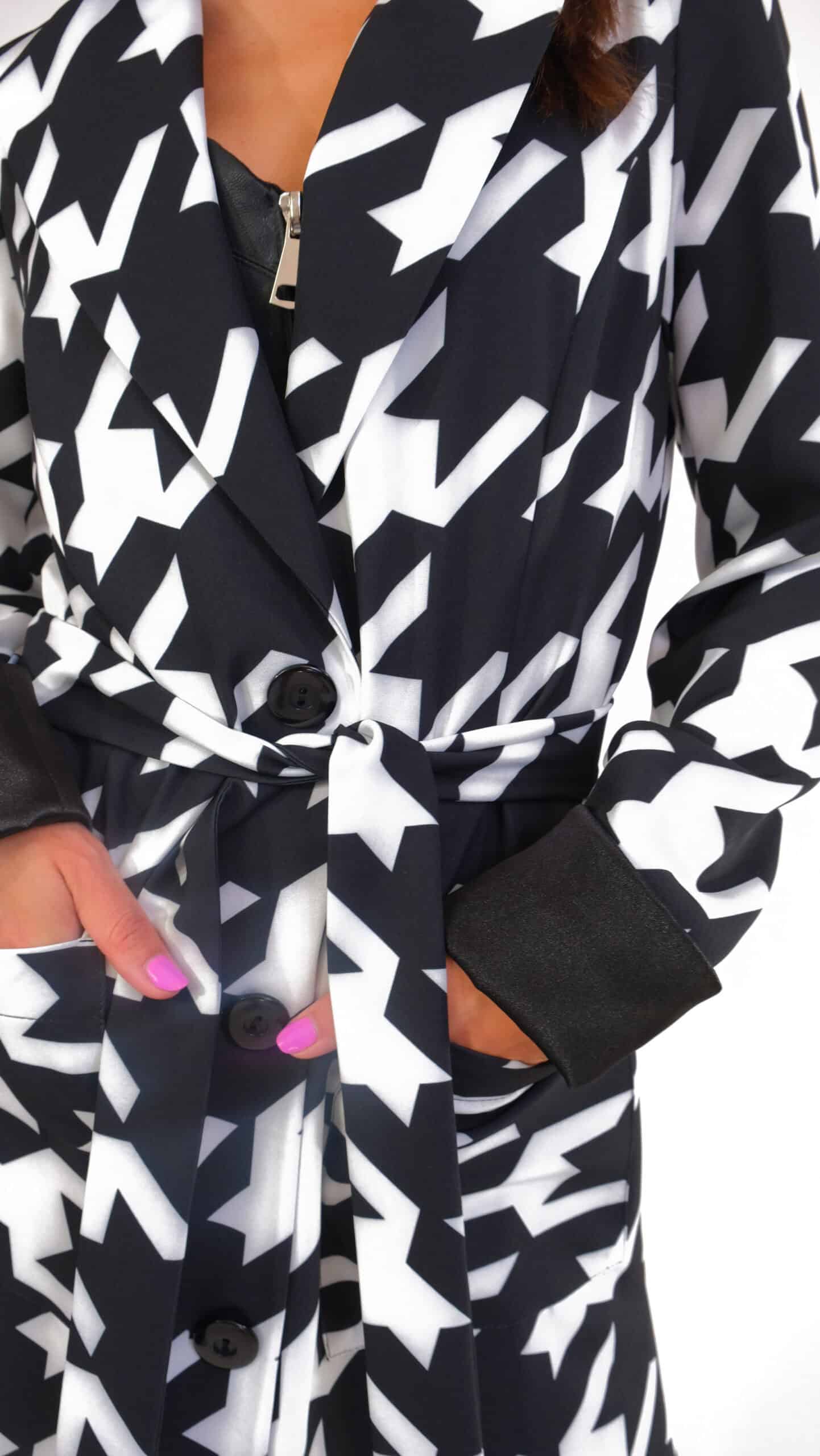 Plášť je ušitý vo výraznom nesmrteľnom vzore kohútej stopy, ktorá pravidelne zdobí módne móla svetových tvorcov. Plášť je inšpirovaný pánskym šatníkom, konkrétne trenčkotovým strihom s výraznou fazónou. Plášť má plne priznané vrecká a zaujímavým detailom je manžeta, ktorá sa dá vyhrnúť a je podšitá kontrastnou čiernou. Plášť je navrhnutý v nesmrteľnej čierno-bielej kombinácii, ktorá sa dá vynikajúco skombinovať s celým Vaším šatníkom.