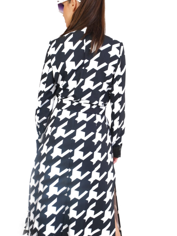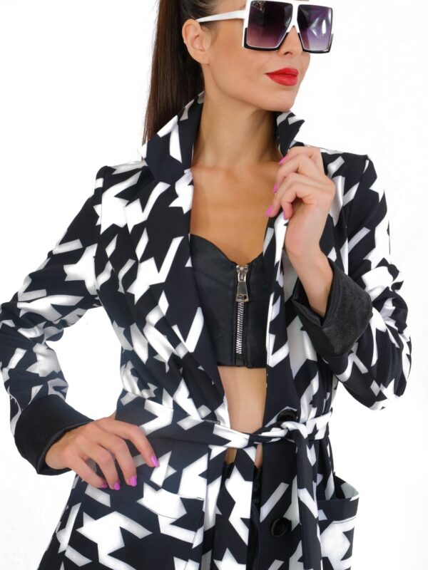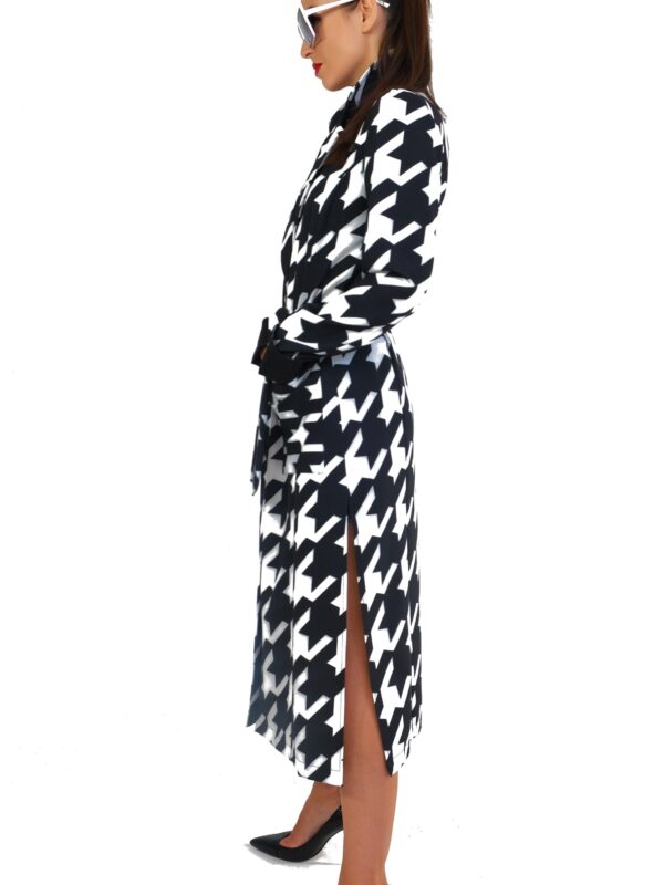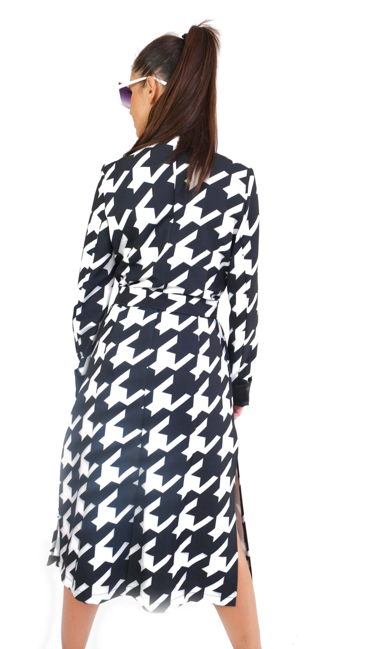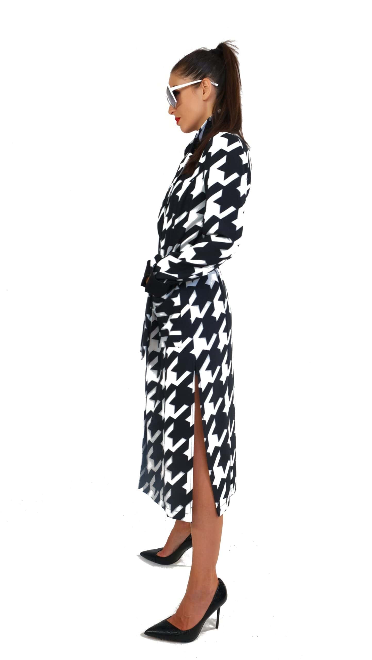Plášť je ušitý vo výraznom nesmrteľnom vzore kohútej stopy, ktorá pravidelne zdobí módne móla svetových tvorcov. Plášť je inšpirovaný pánskym šatníkom, konkrétne trenčkotovým strihom s výraznou fazónou. Plášť má plne priznané vrecká a zaujímavým detailom je manžeta, ktorá sa dá vyhrnúť a je podšitá kontrastnou čiernou. Plášť je navrhnutý v nesmrteľnej čierno-bielej kombinácii, ktorá sa dá vynikajúco skombinovať s celým Vaším šatníkom.