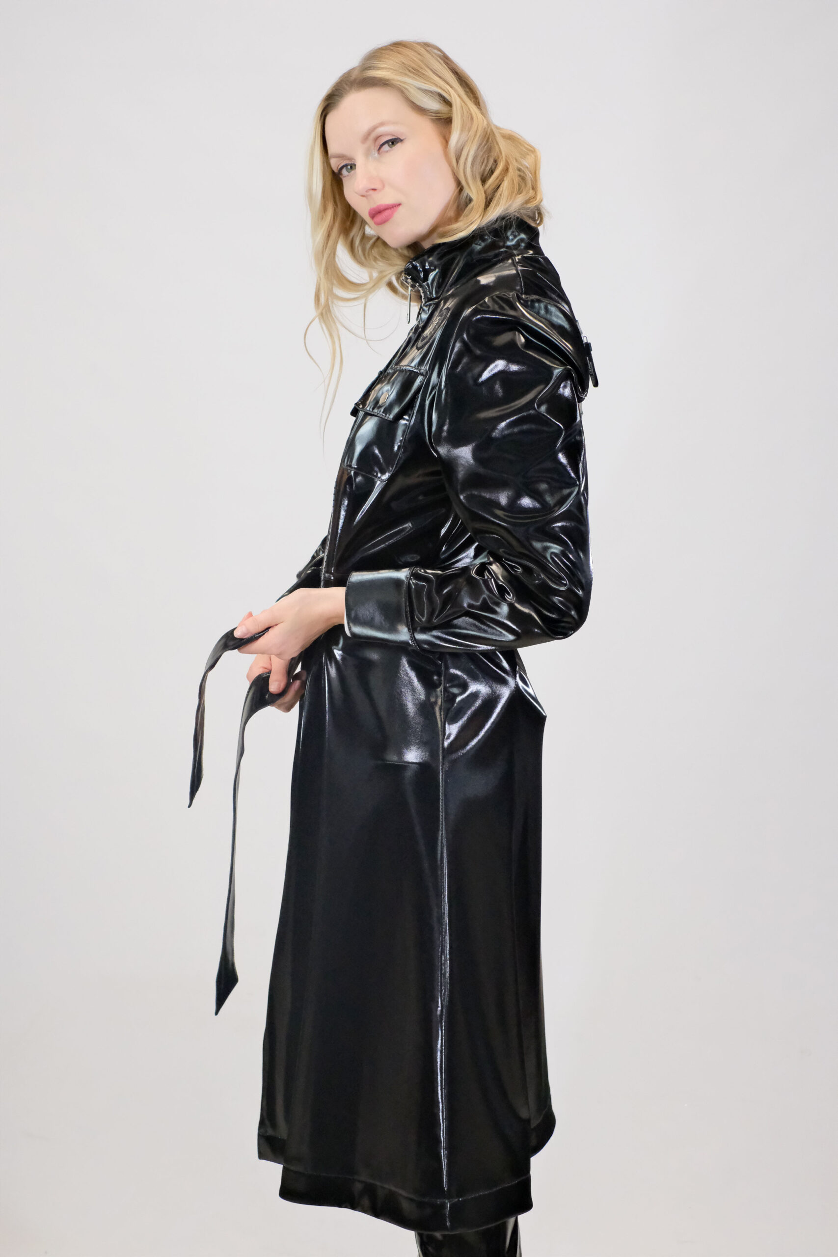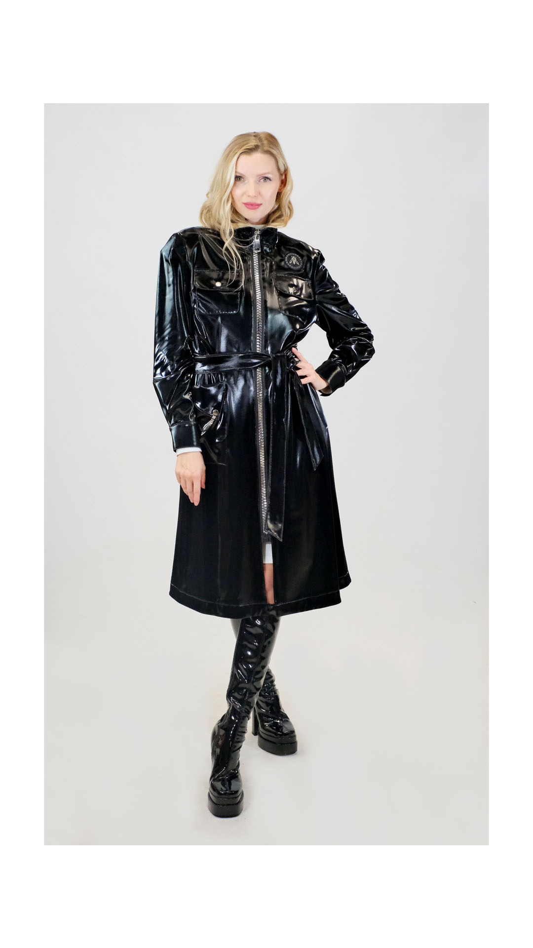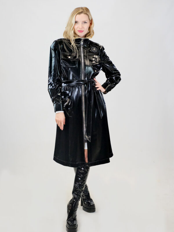 Plášť je ušitý v prekrásnom v strihu prepracovanom do najmenších detailov. Plášť je navrhnutý so zipsom po celej dĺžke, čo mu dodáva ležérny nádych. Plášť má funkčné vrecká, ktoré sú ozdobené lesklou retiazkou. Plášť je navrhnutý v rozširujúcom sa strihu, ktorý si však môžete stiahnuť priložením opaskom z rovnakého materiálu. Plášt má zvýšený golier, ktorý vás výborne ochráni pred veterným počasím. Plášť je ušitý v nesmrteľnej čiernej farbe, pripopominajúcej svojím leskom a štruktúrou latex. Pre ikonický look kombinujte s čiernymi a bielymi doplnkami.
