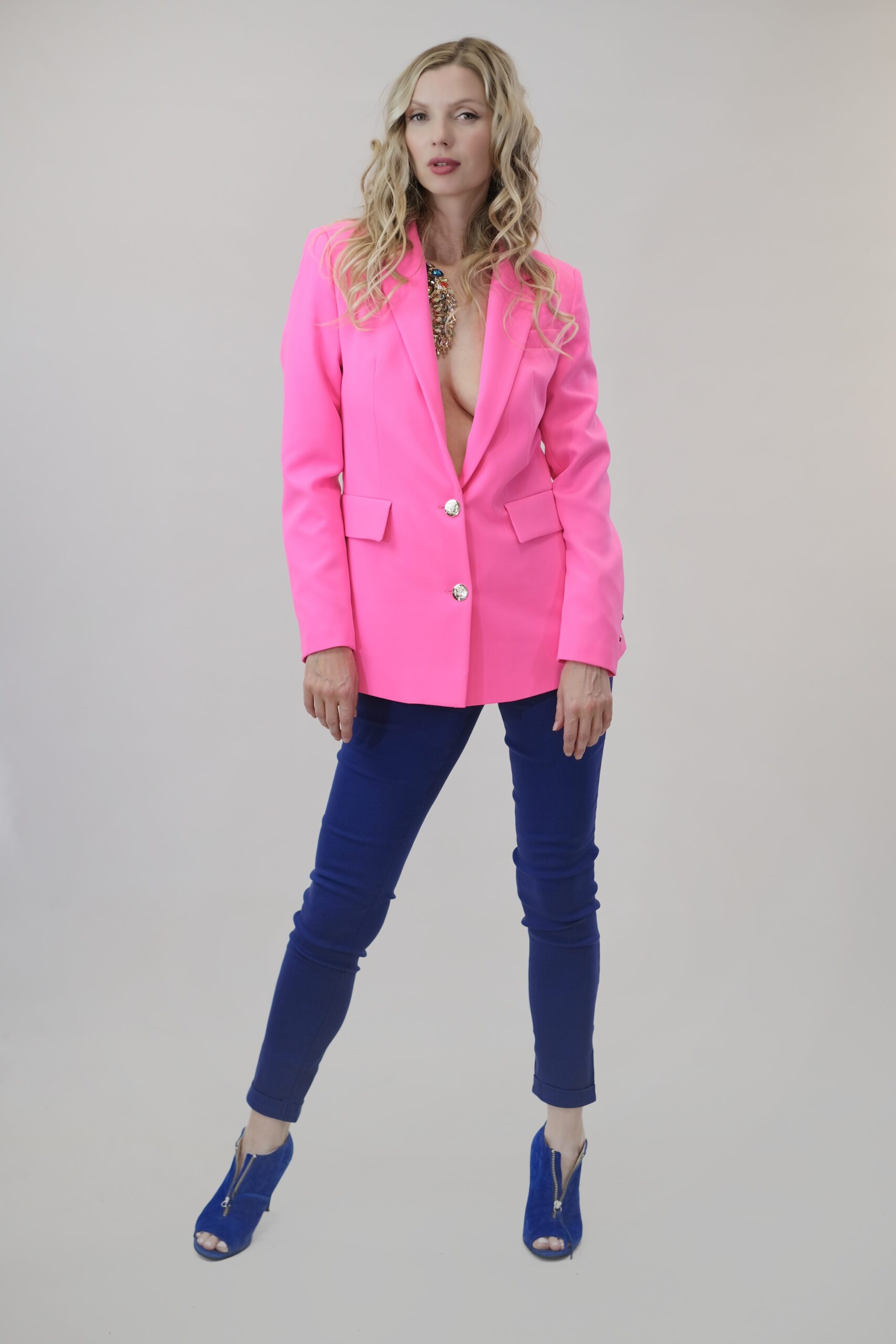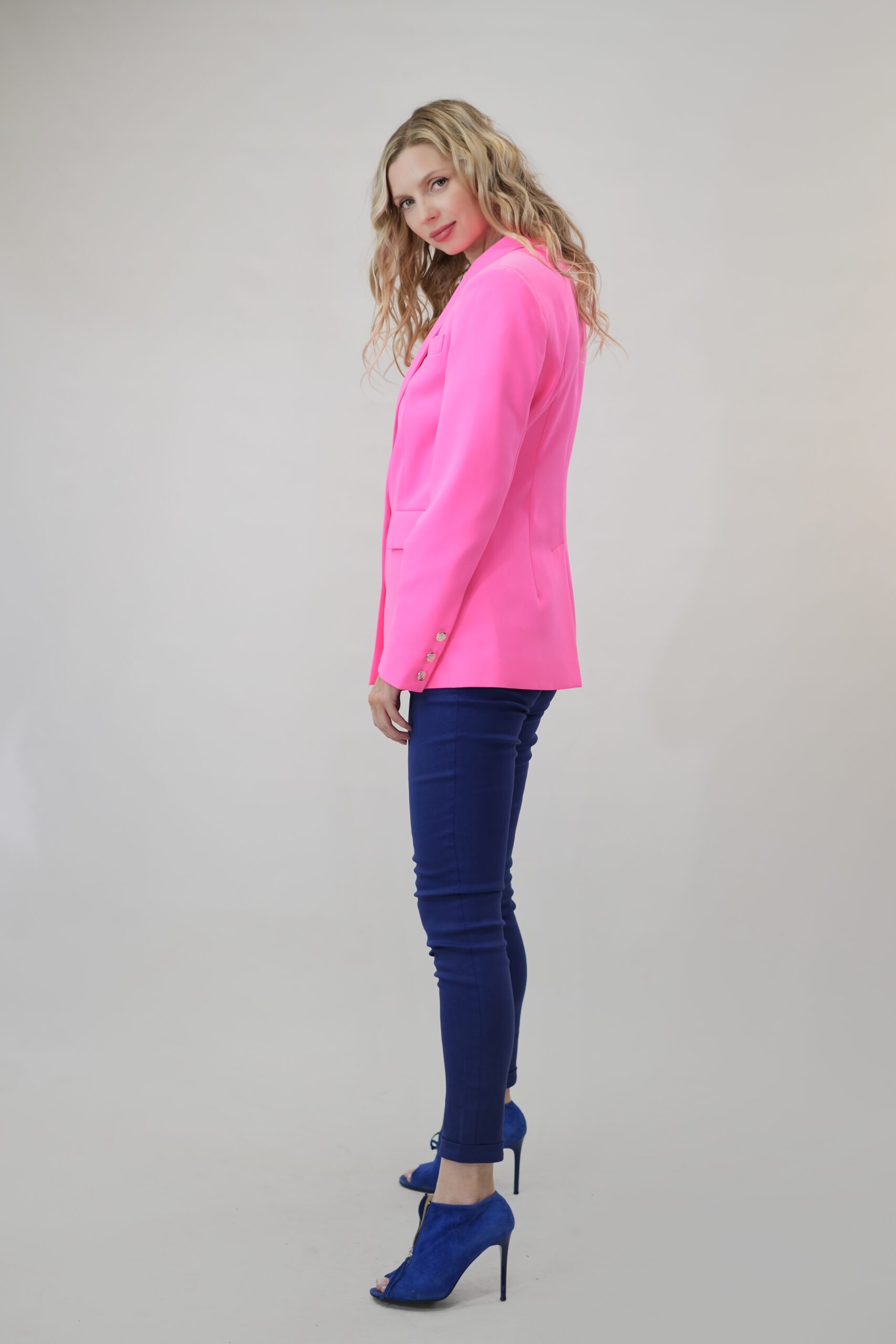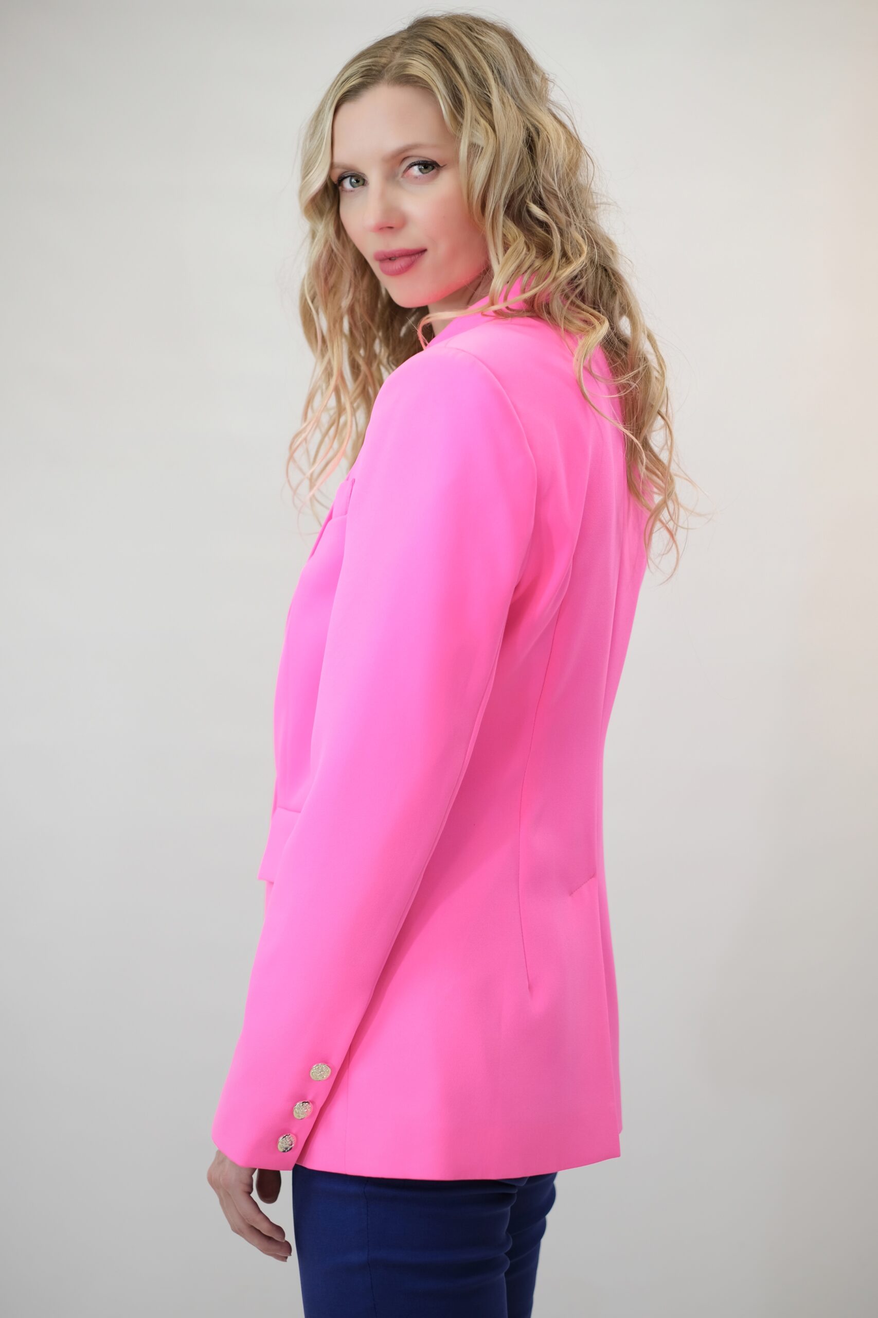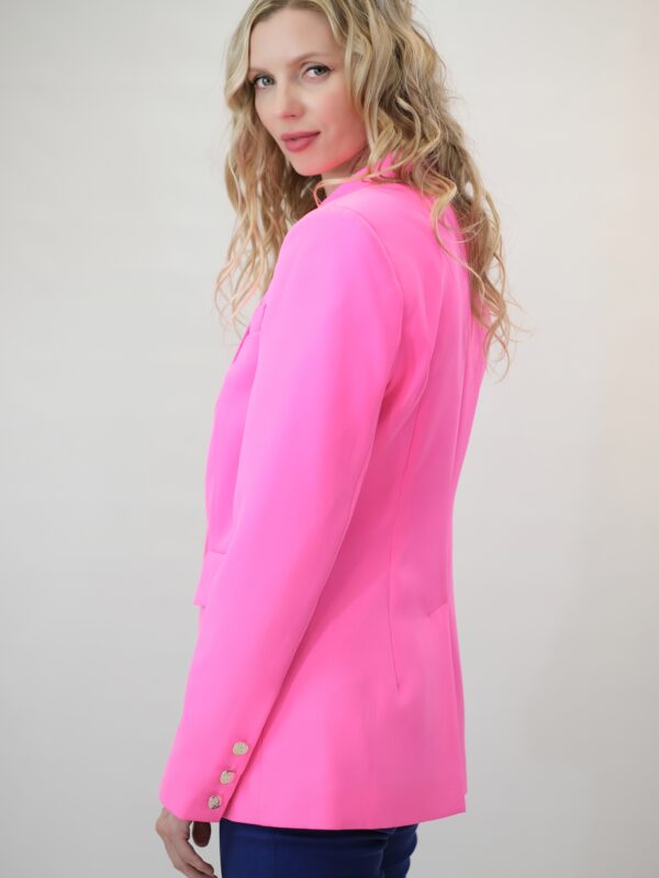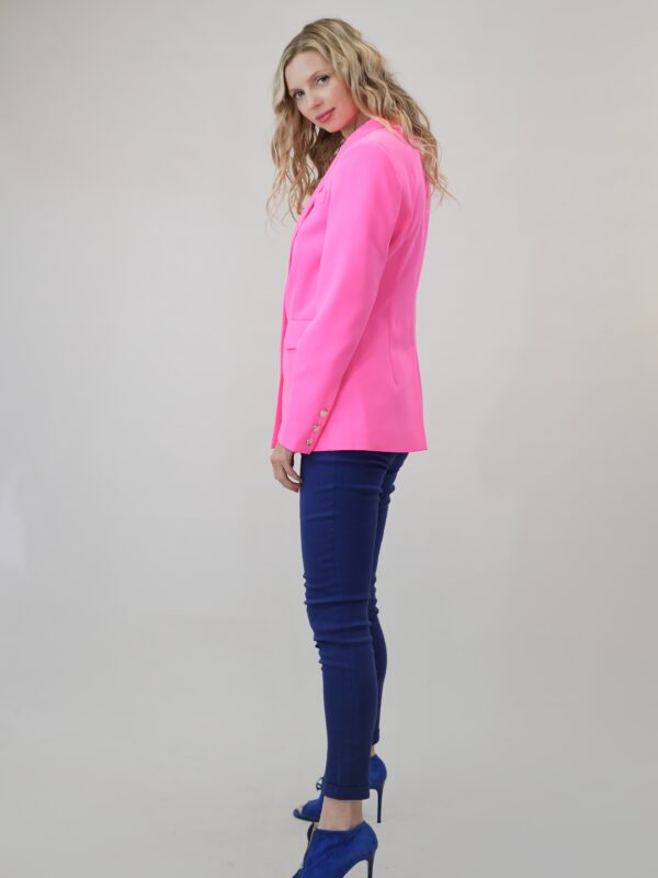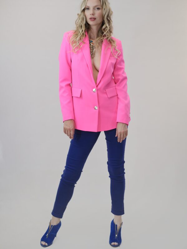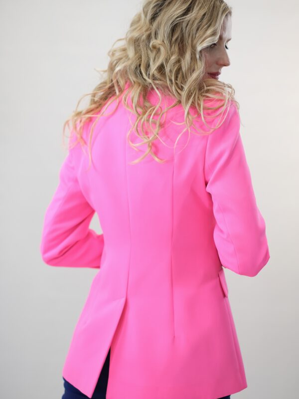 To je navrhnuté v jednoduchom rovnom strihu, ktorý sadne na každý typ postavy. Sako má predlžený golier s úzkou fazónou. Zaujímavým detailom na saku sú ozdobné strieborné gombíky. Sako je ušité vo výraznej rúžovej farbe, v ktorej vyniknete kdekoľvek. Sako ľahko skombinujete s tmavšími odtieňmi ružovej alebo modrej.