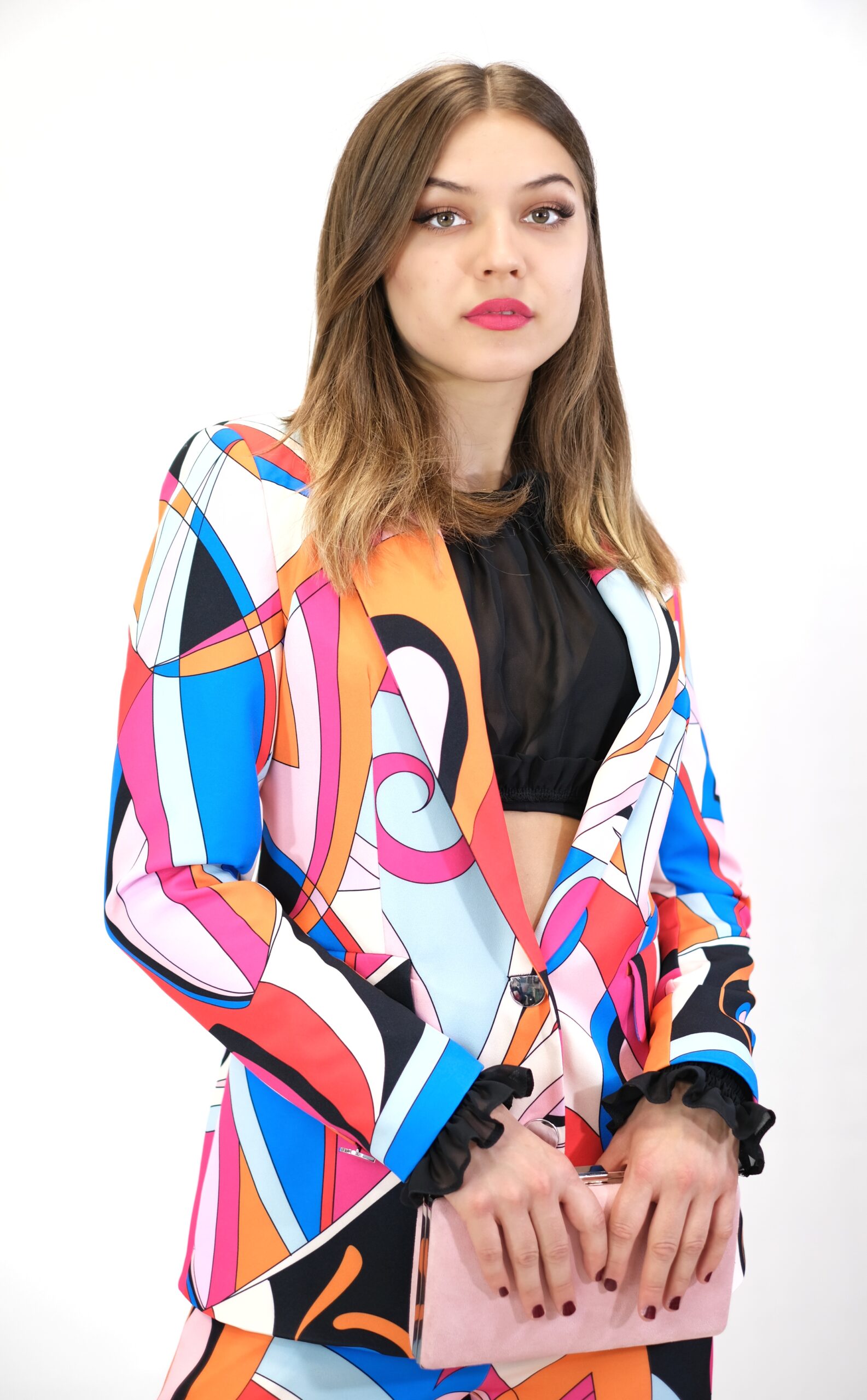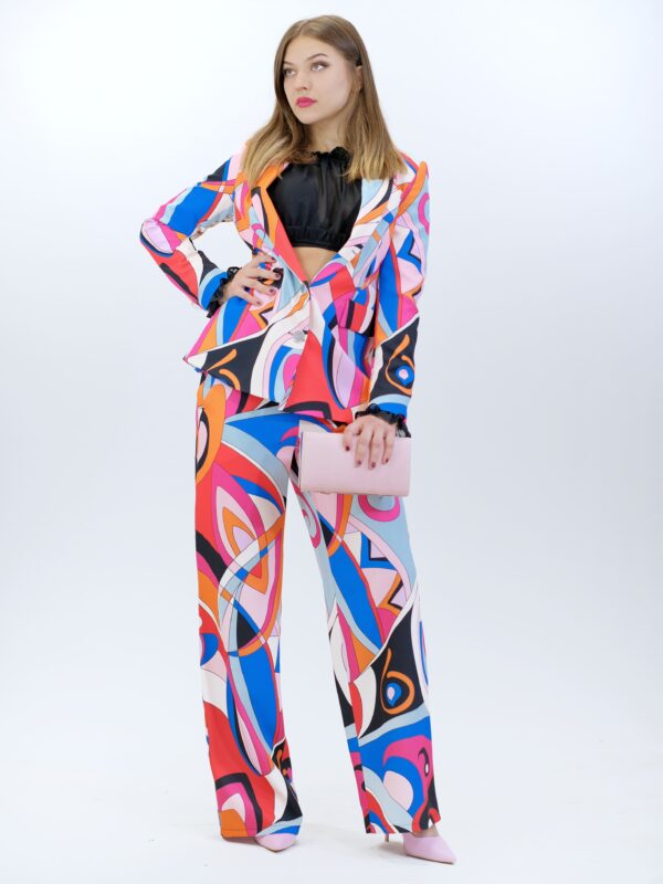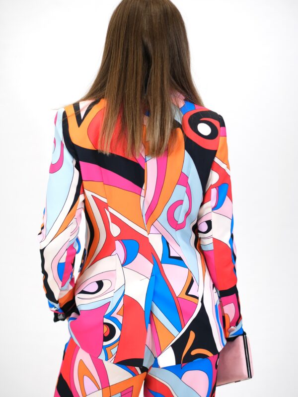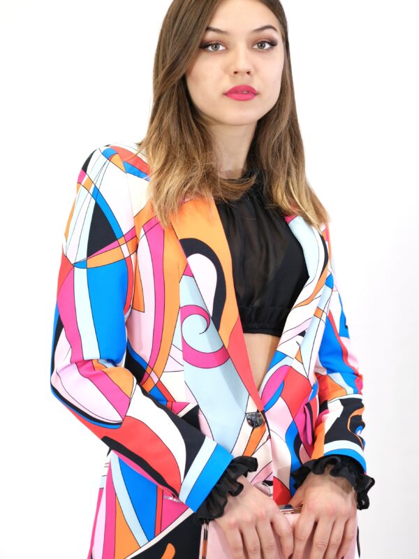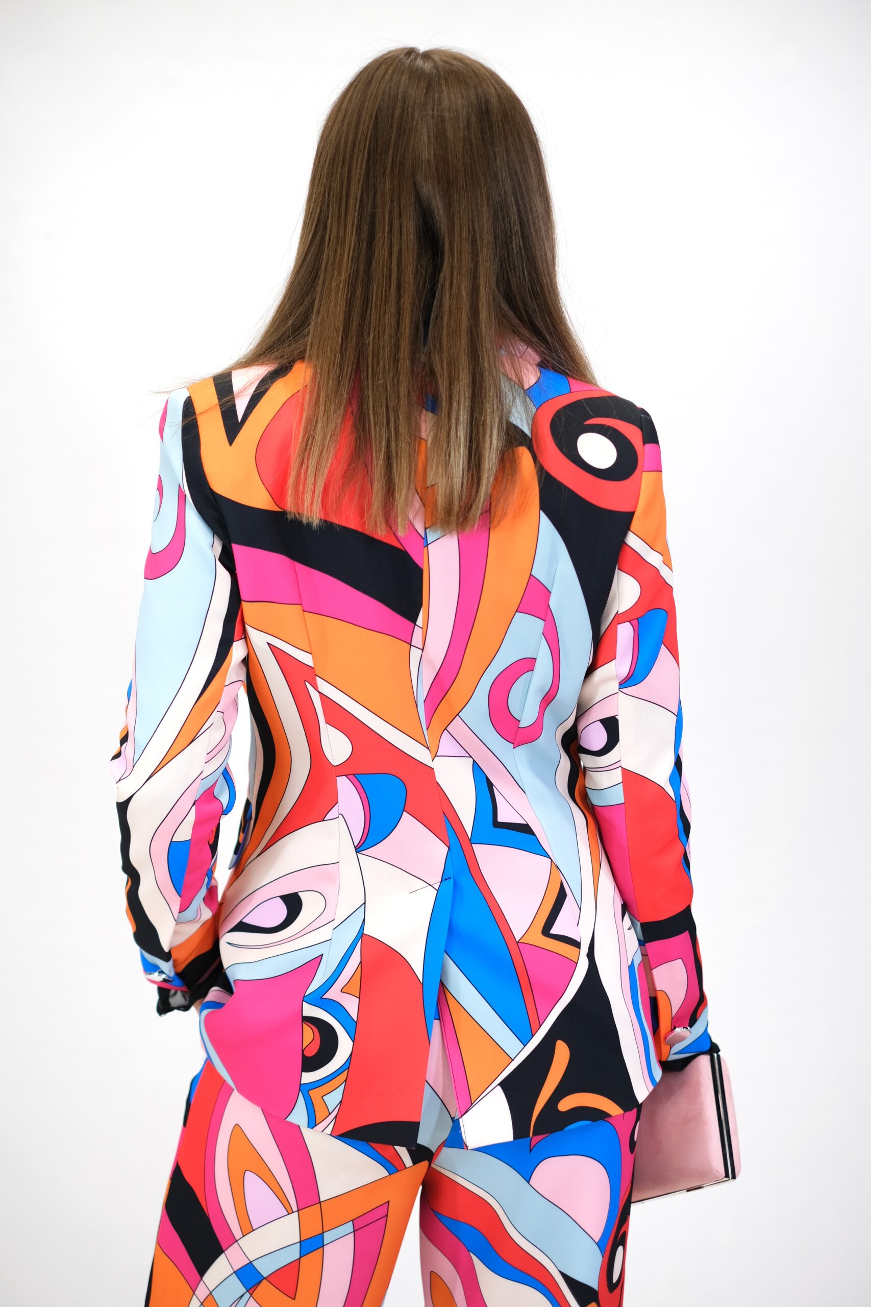 Sako je ušité v klasickom úzkom strihu, ktorý výborne sadne na postavu. Sako sa zapína na dva gombíky a jednoduchý strih necháva naplno vyniknúť divokému farebnému vzoru. Sako je samo osebe veľmi výrazné, a preto ho s kombinujte s jednoduchými doplnkami ako naša aranžérka. Pre kompletný hluk s kombinujte s nohavicami Decadence.