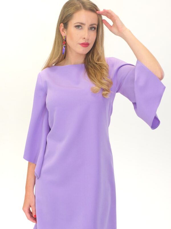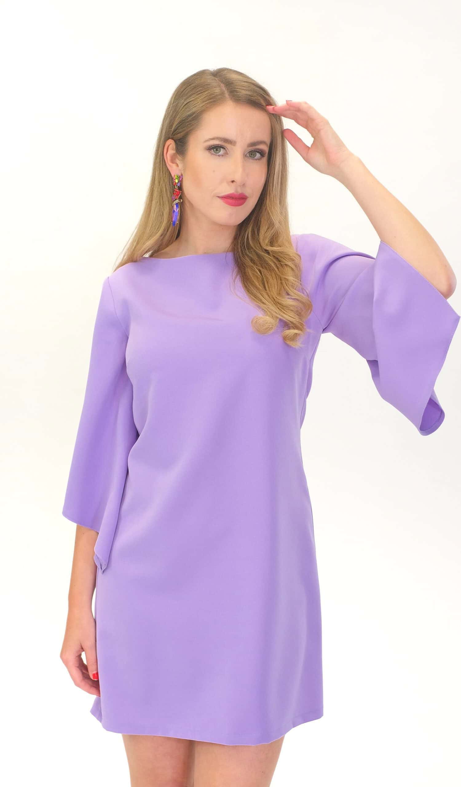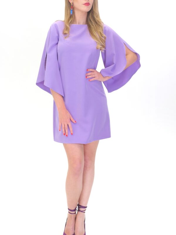 Šaty sú navrhnuté v jednoduchom áčkovom strihu, ktorý výborne sedí na každom type postavy. Šaty majú voľné prestrihnuté rukávy pripomínajúce zatvárajúce sa lupene kvetov. Šaty sú ušité v nádhernej pastelovo fialovej farbe, ktorá dýcha letom a skvele sa hodia na každú letnú oslavu, svadbu alebo spoločenskú udalosť. Šaty pre fresh look skombinujte s odtieňmi fialovej ako naša stylistka.