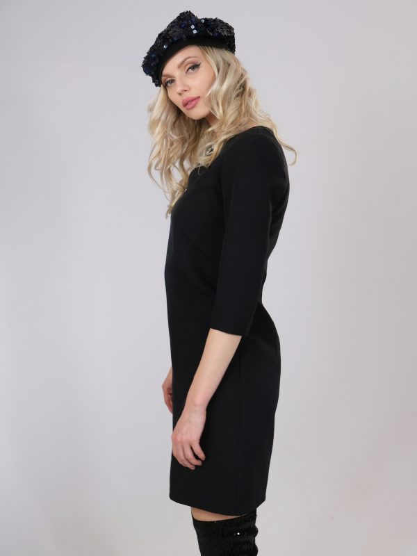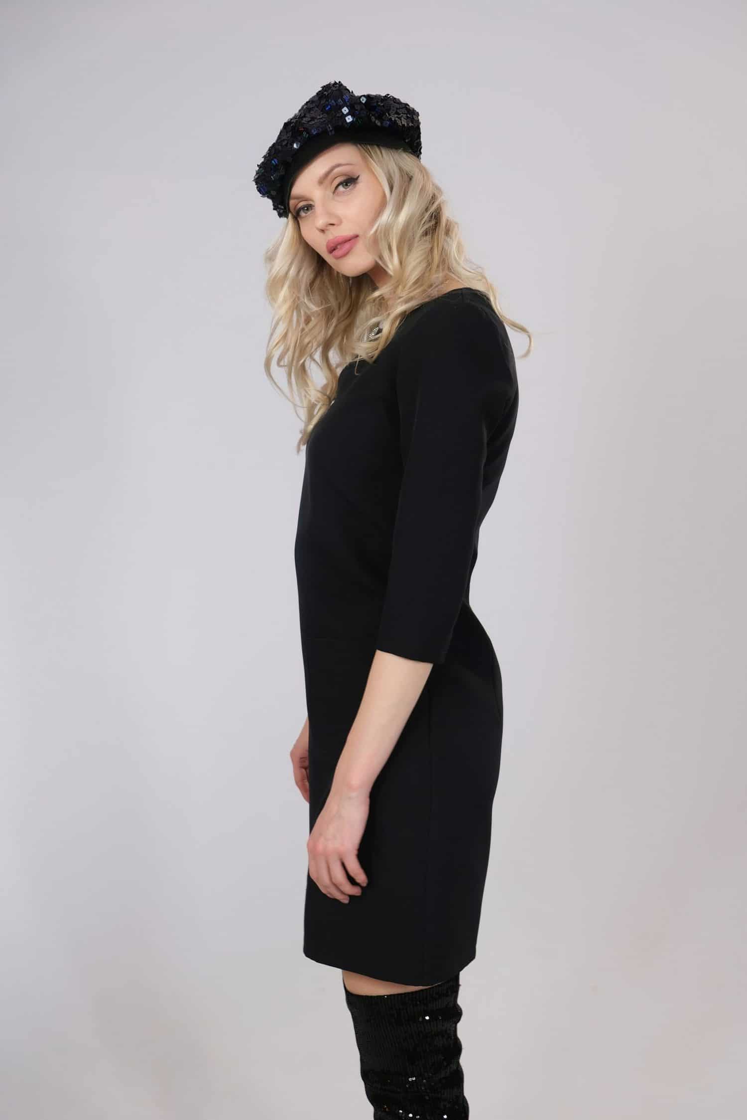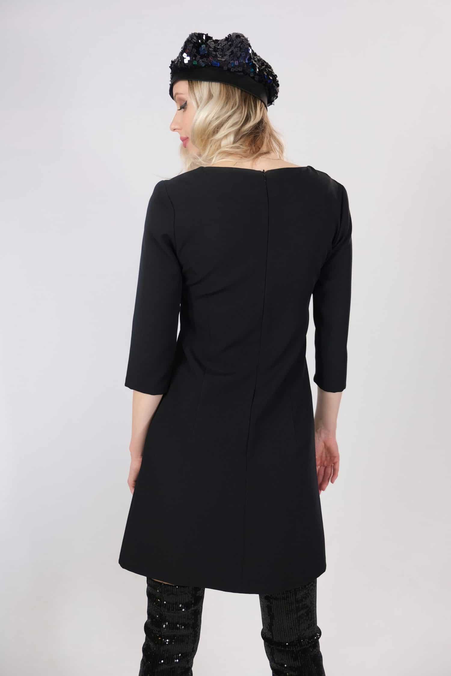 Šaty sú ušité v jednoduchom a pohodlnom áčkovom strihu. Šaty skvele sadnú na každý typ postavy a vďaka čiernemu prevedeniu sa dajú nosiť celoročne s každou farbou vo Vašom šatníku. Zaujímavým detailom je ozdobná strieborná spona.