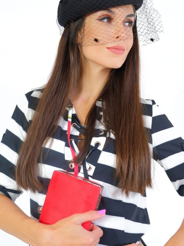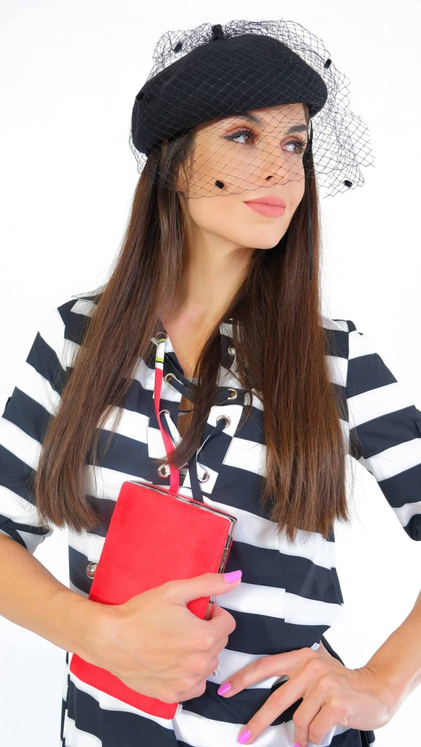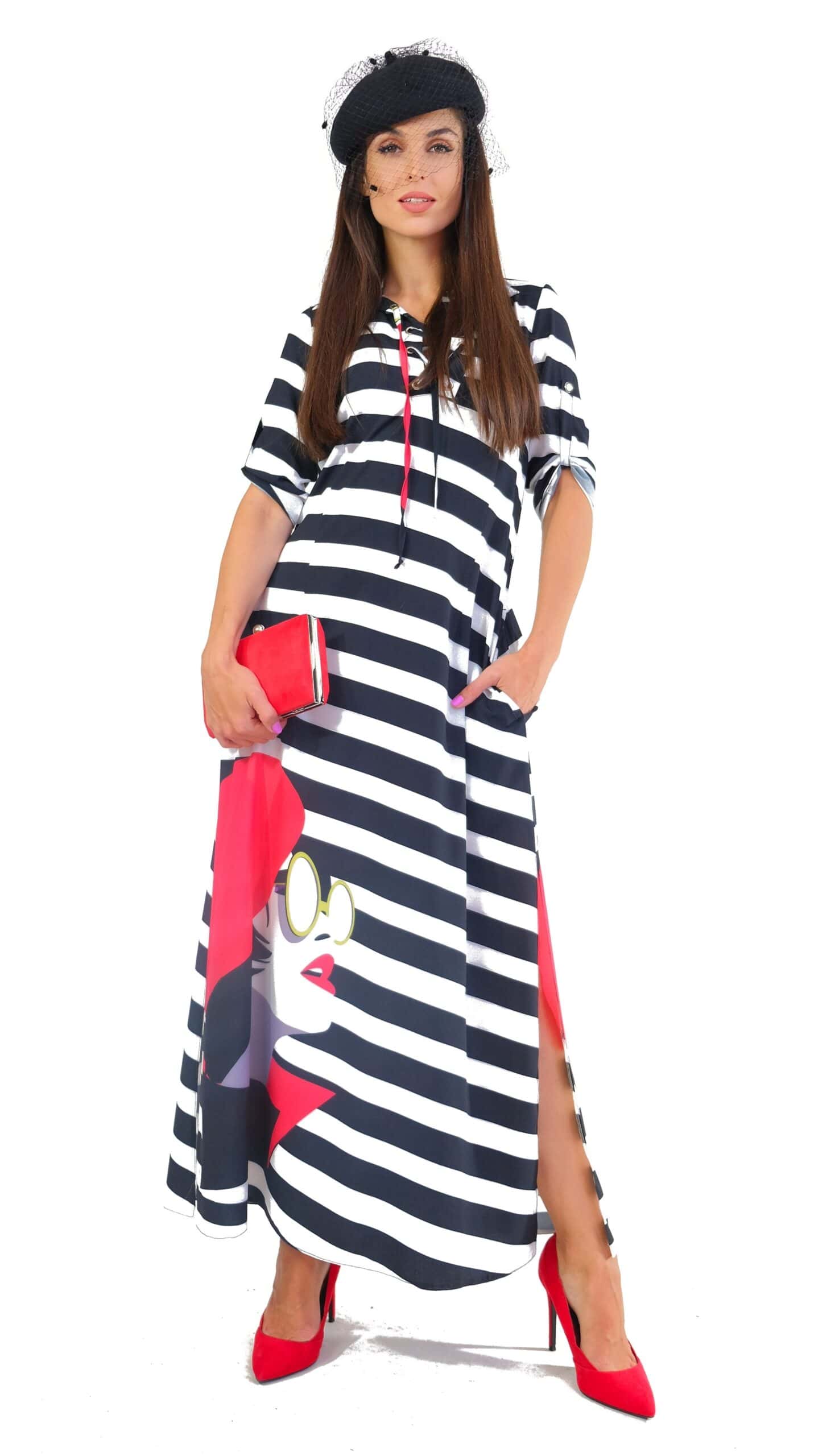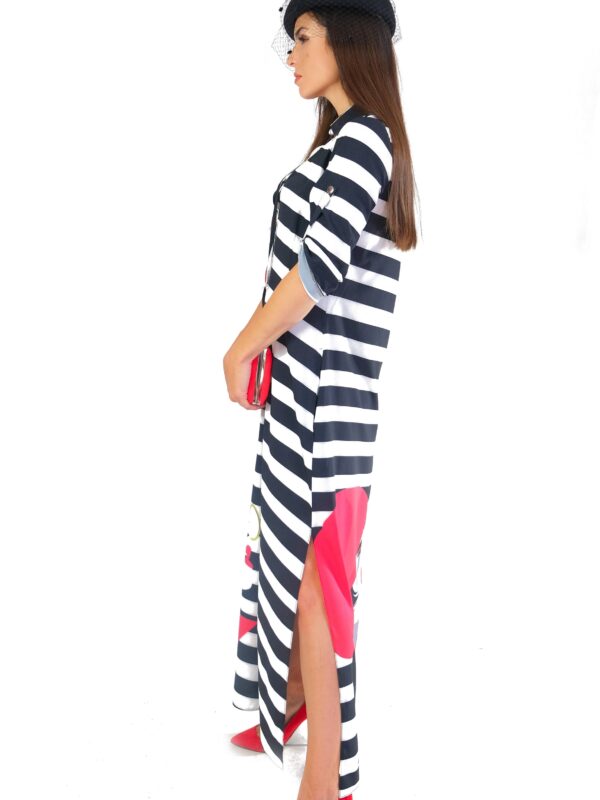 Šaty sú ušité v pohodlnom áčkovom strihu, ktorý výborne sadne na každý typ postavy. Šaty sa mierne rozširujú do áčko a po bokoch majú rozstrihy, ktoré im dodávajú na vzdušnosti. Šaty sú navrhnuté v prúžkovanom vzore, ktorý opticky zoštíhli Vašu postavu s výraznou grafikou tváre. Zaujímavým detailom sú funkčné vrecká na šatách.